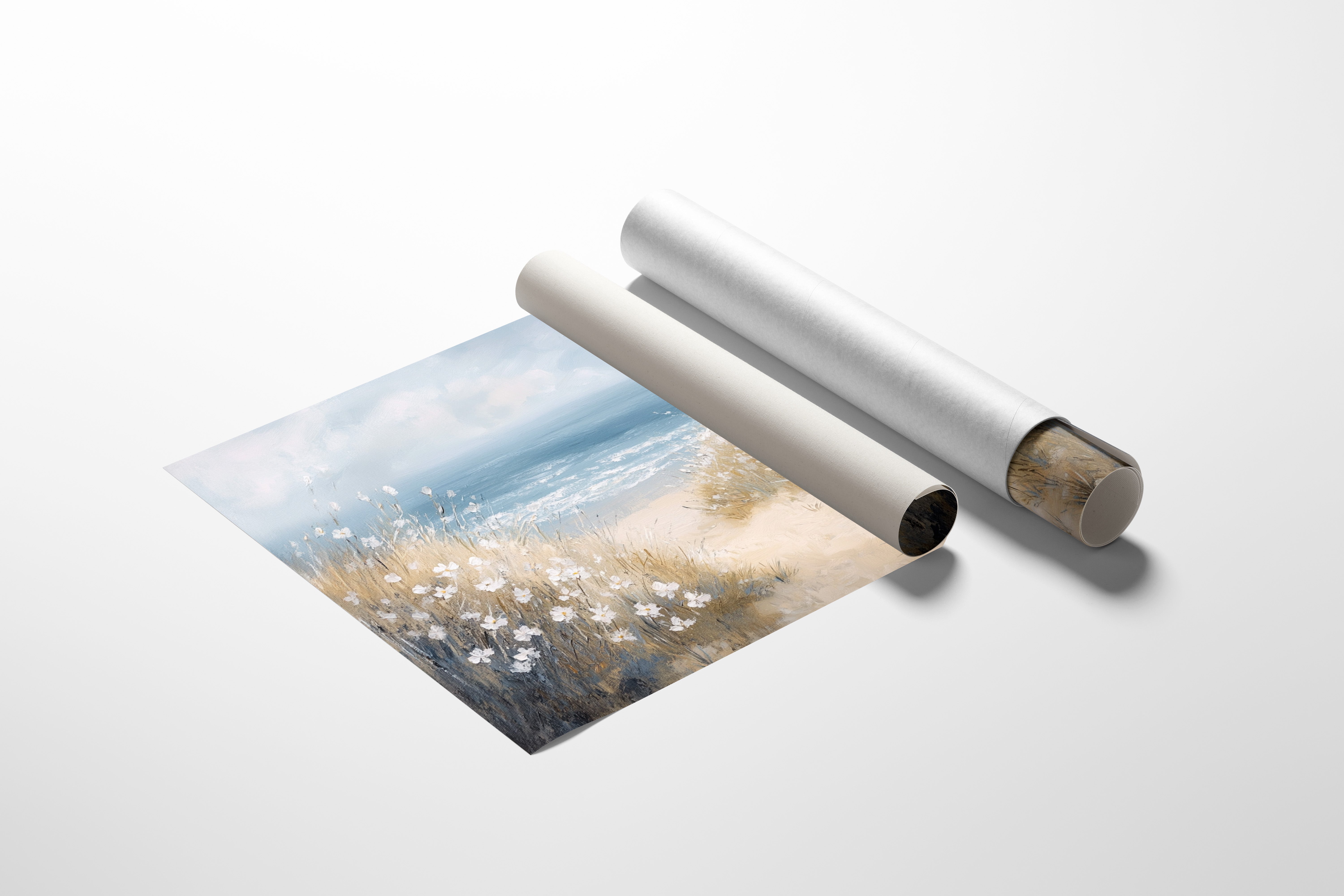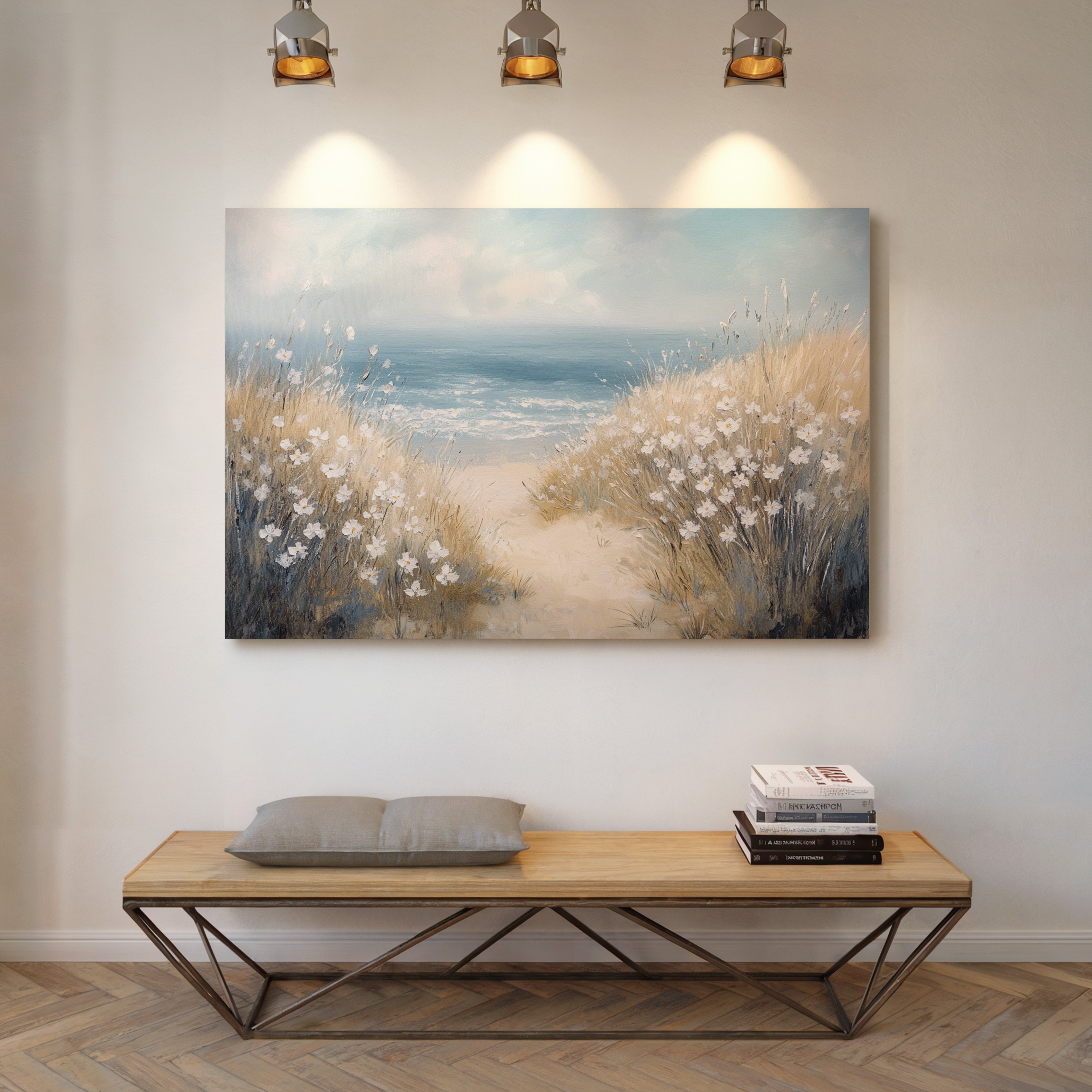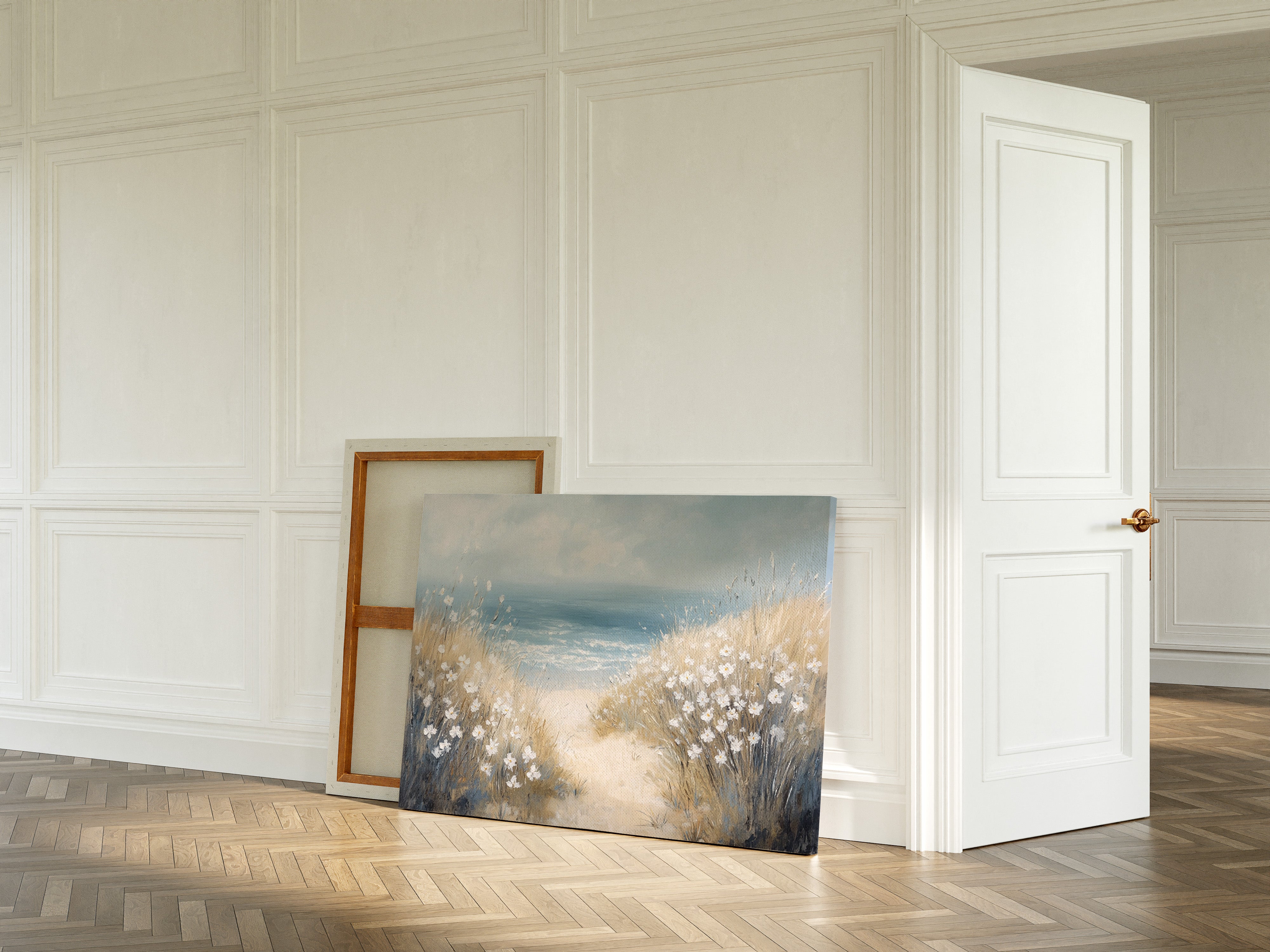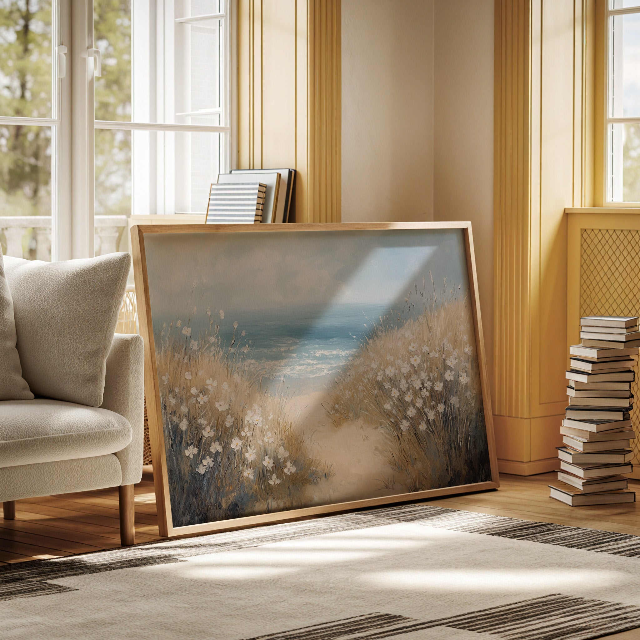 A gentle breeze carries the scent of salt and honey across sun-bleached dunes. White daisies dot the windswept grasses, their petals catching light like scattered pearls against golden stems. The coastal pathway winds between tufts of beach grass, leading to where azure waters meet the horizon in a soft blur of blues. Perfect for bringing seaside serenity into contemporary spaces, this piece creates a window to endless summer days where ocean meets shore.