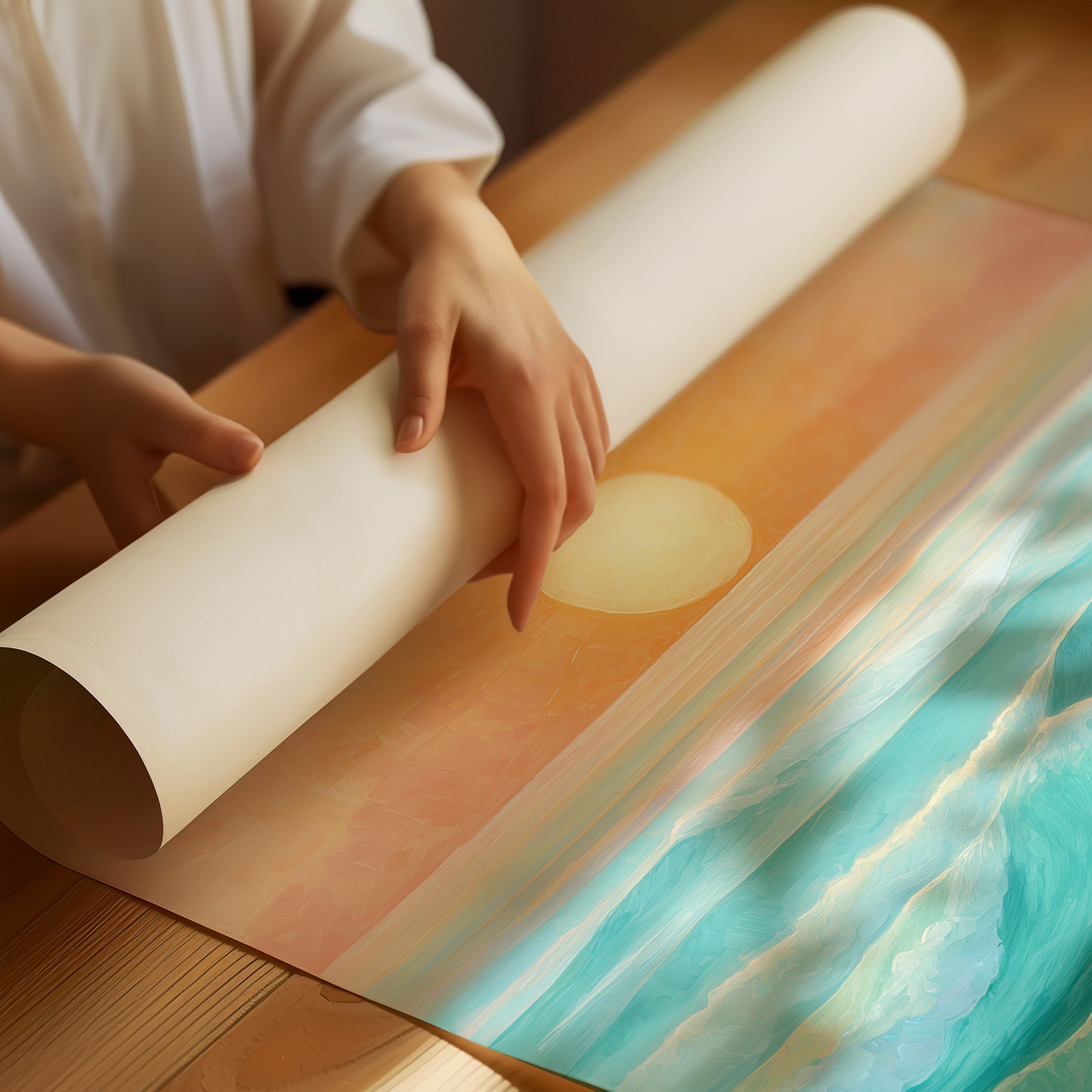 Sunlight spills across turquoise waters, creating a moment of perfect serenity where day begins. The gentle gradient from coral sky to azure waves captures that fleeting morning magic when the world feels new again. Warm wooden framing complements the peaceful coastal scene, enhancing its dreamy quality while grounding it in natural elements.