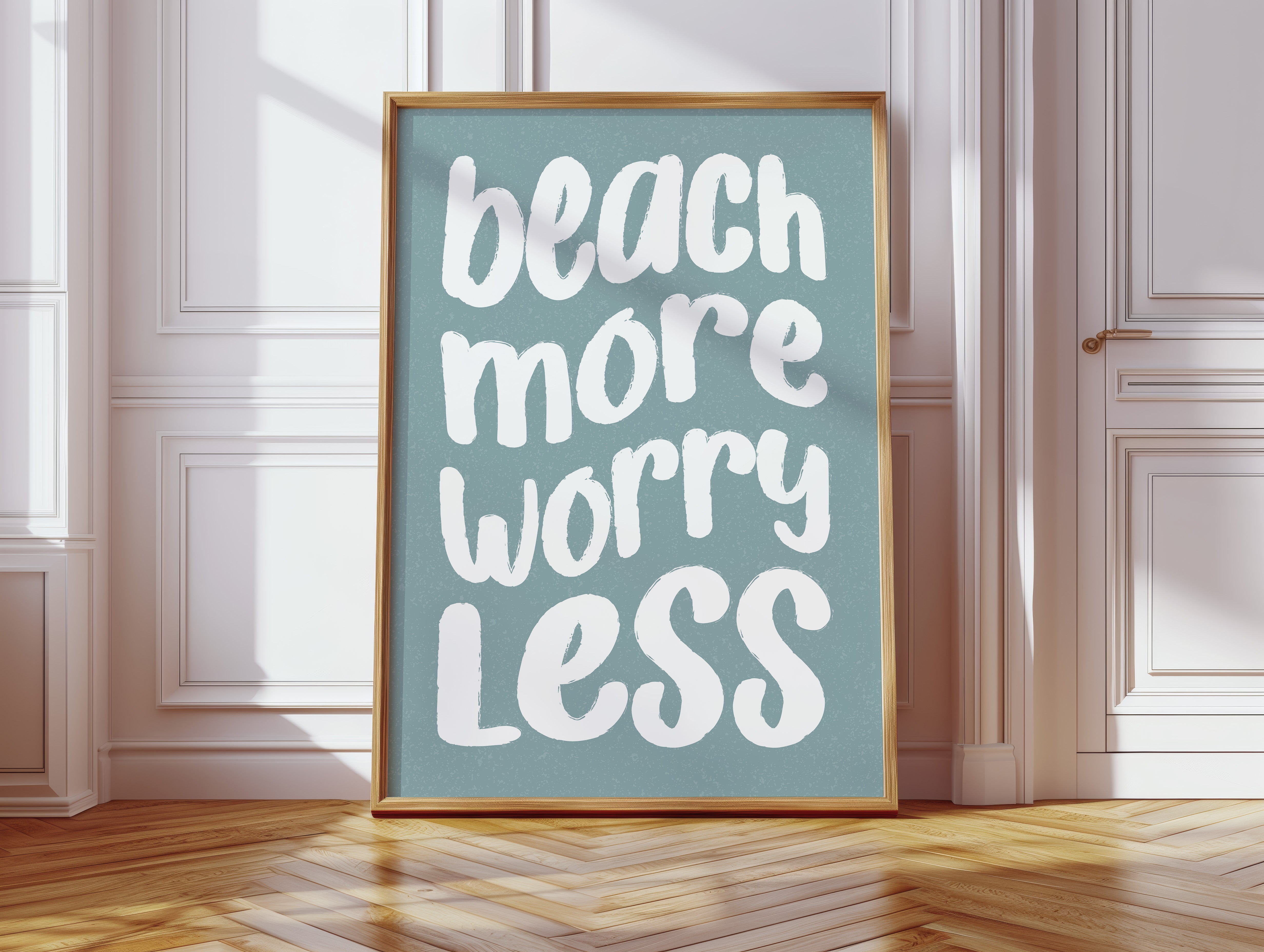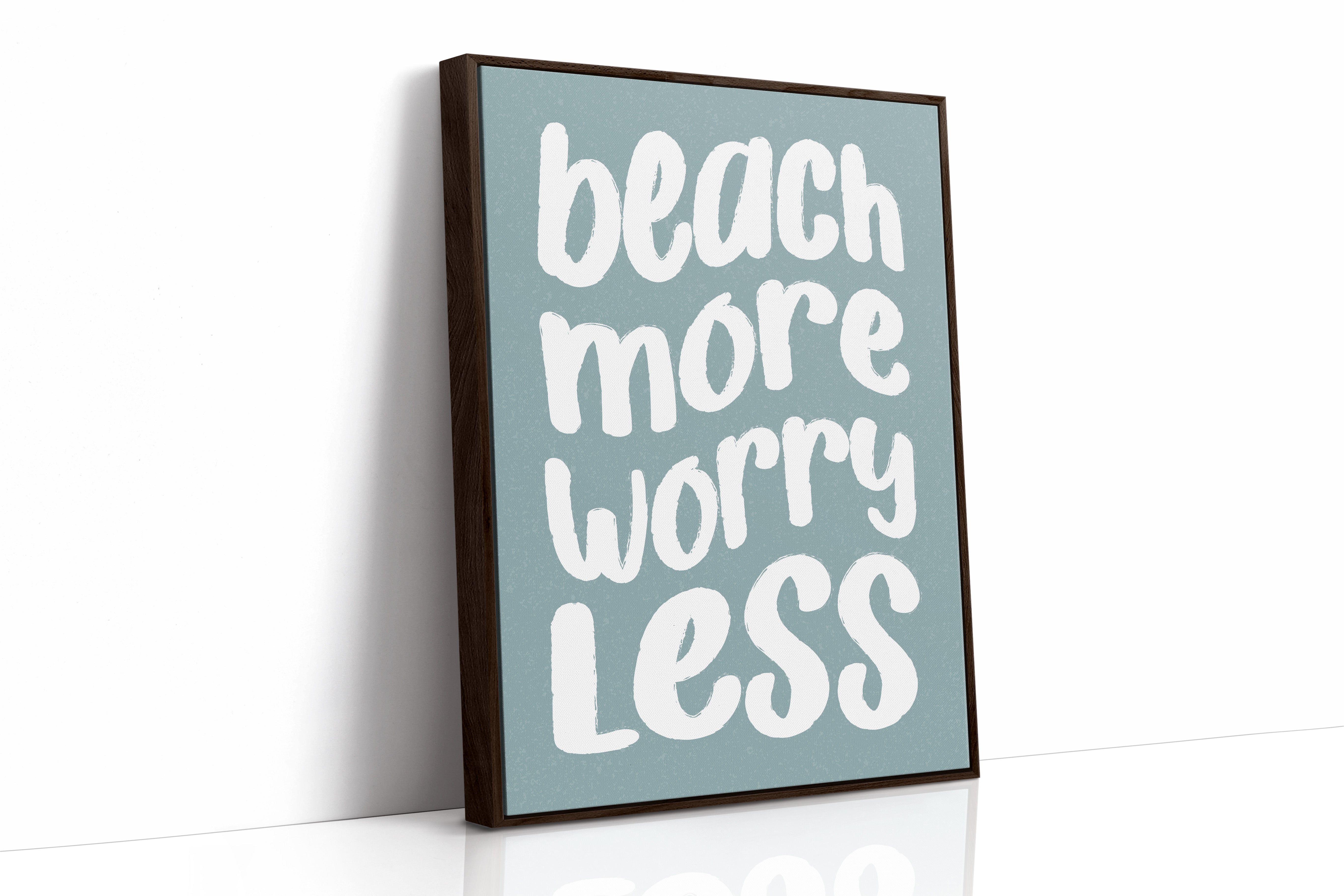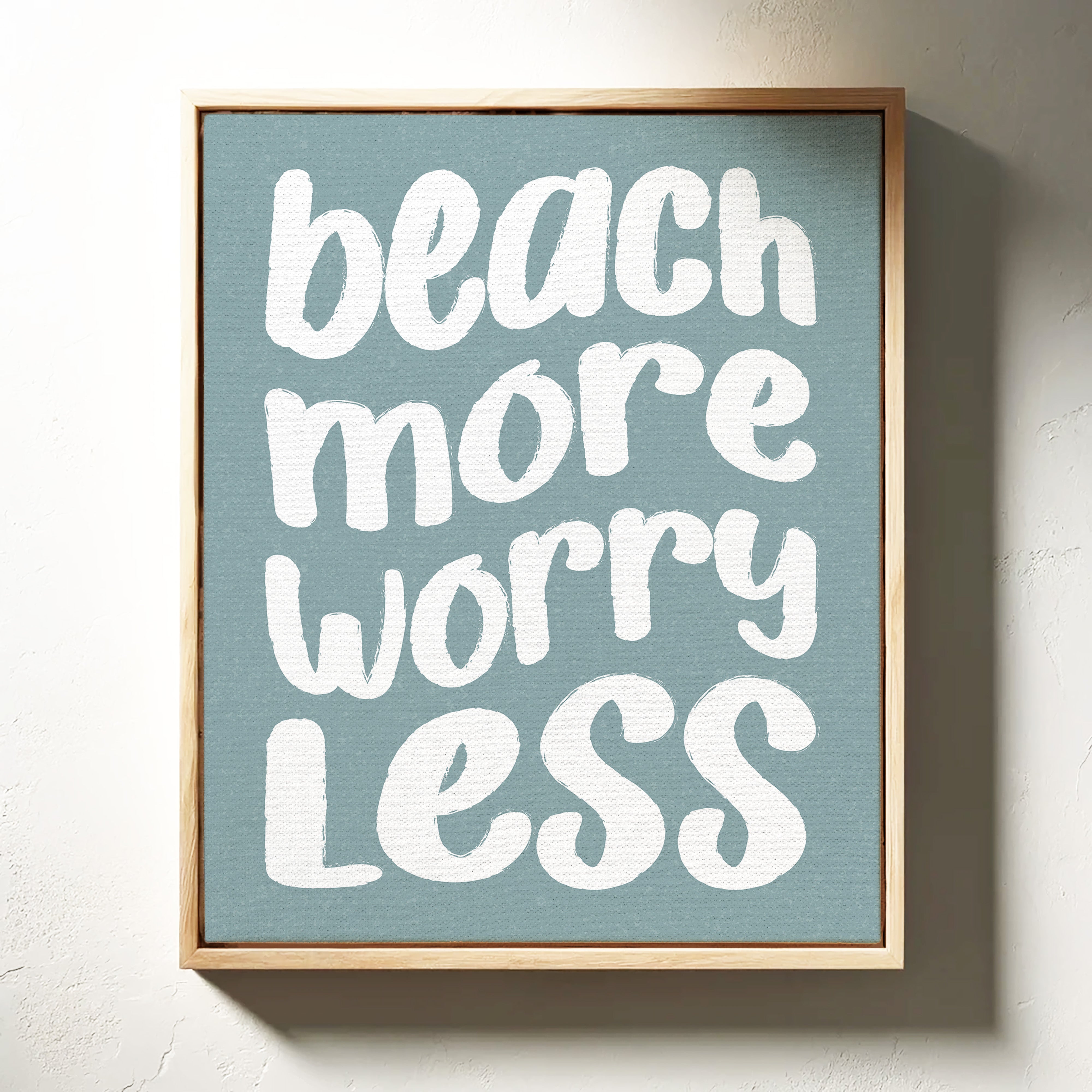 Like waves washing away footprints in the sand, this piece speaks to the liberating spirit of coastal living. Part of our Contemporary Typography collection, it pairs modern design with laid-back beach philosophy. Bold white brushstrokes dance against a serene sage-blue background, creating a statement that's both playful and profound in its simplicity. The generous scale and casual elegance of the lettering captures the essence of seaside wisdom. Perfect for bringing a breath of fresh air to living rooms, beach houses, or any space that needs a reminder to slow down and savor life's simple pleasures. Each glance serves as a gentle reminder to choose joy over worry, beach over burden.