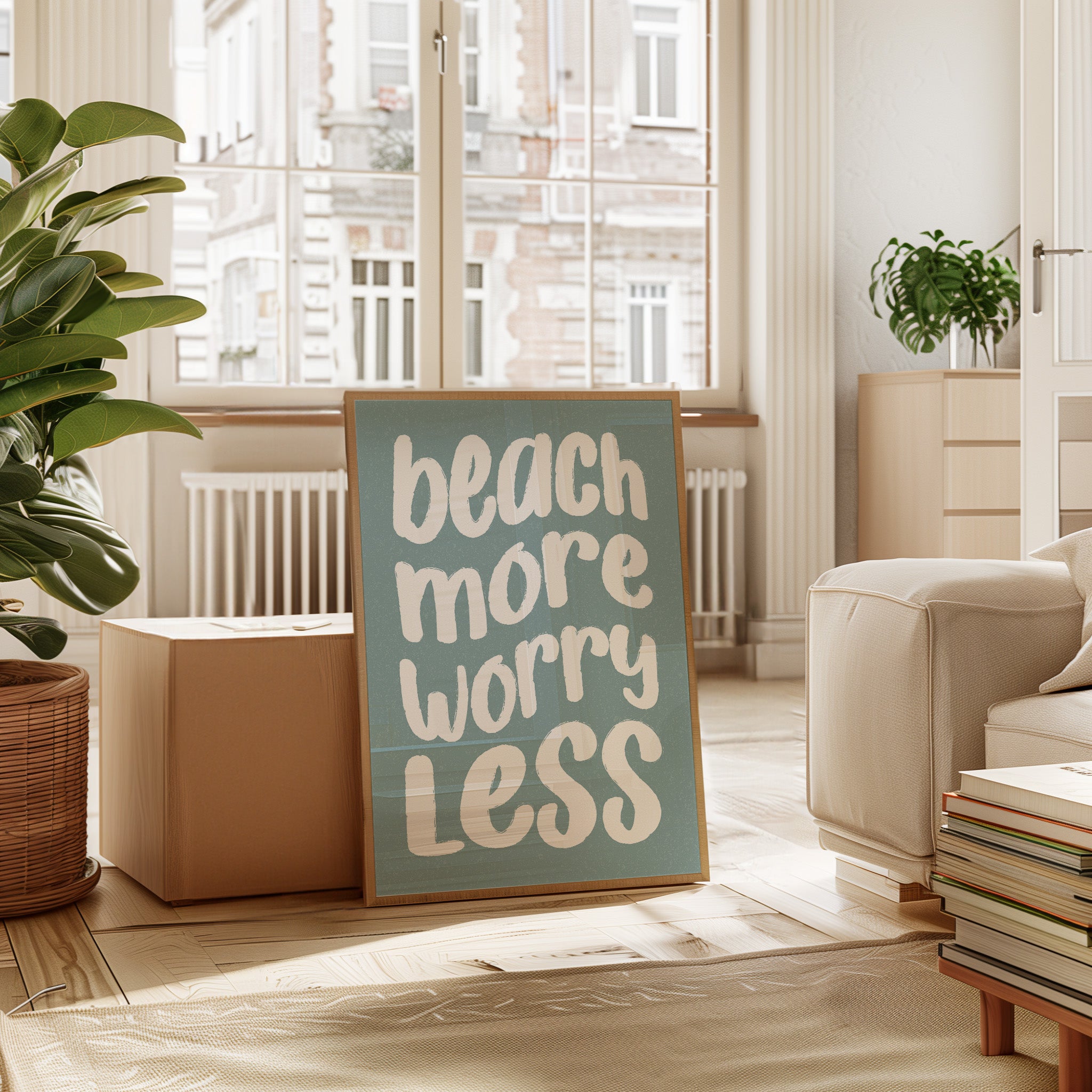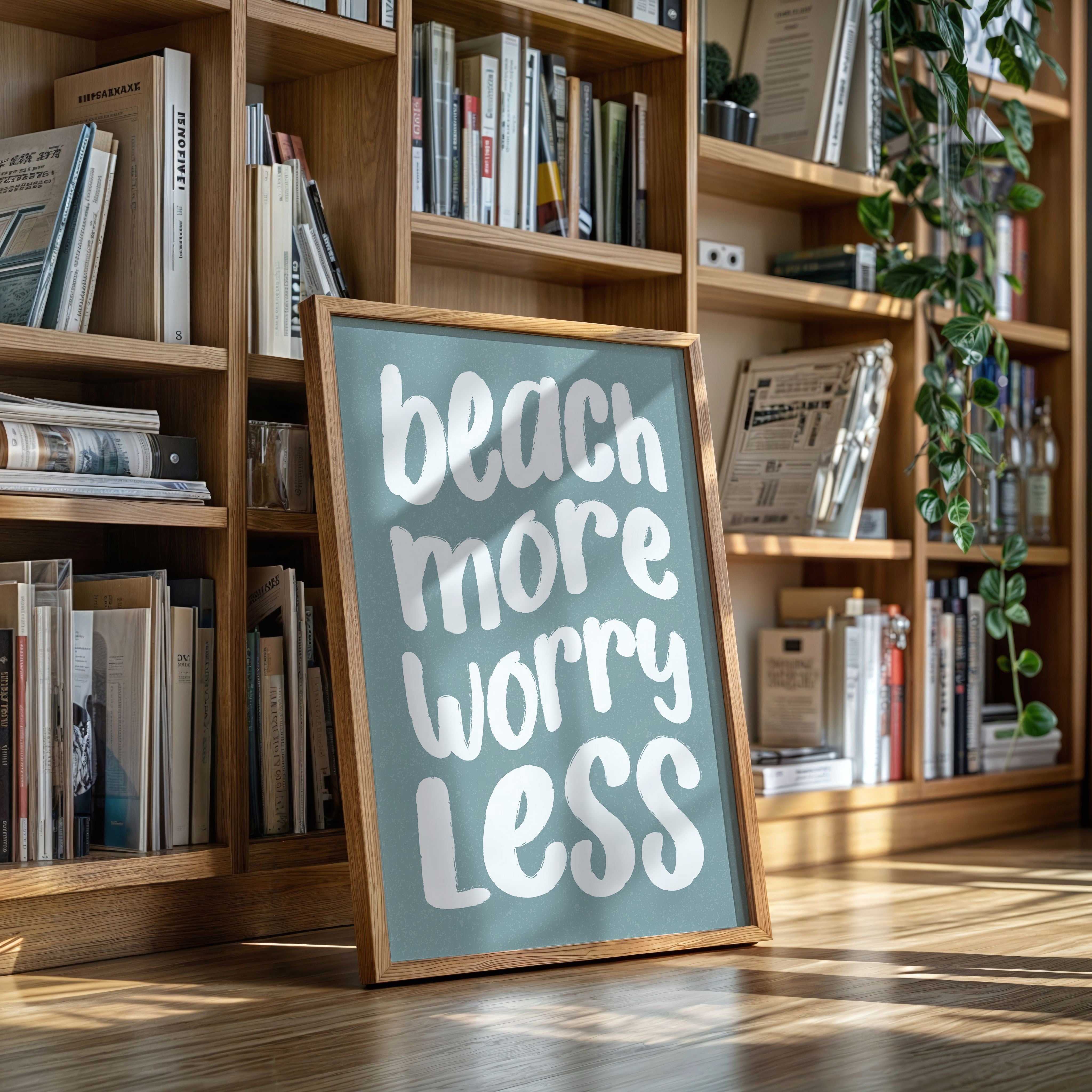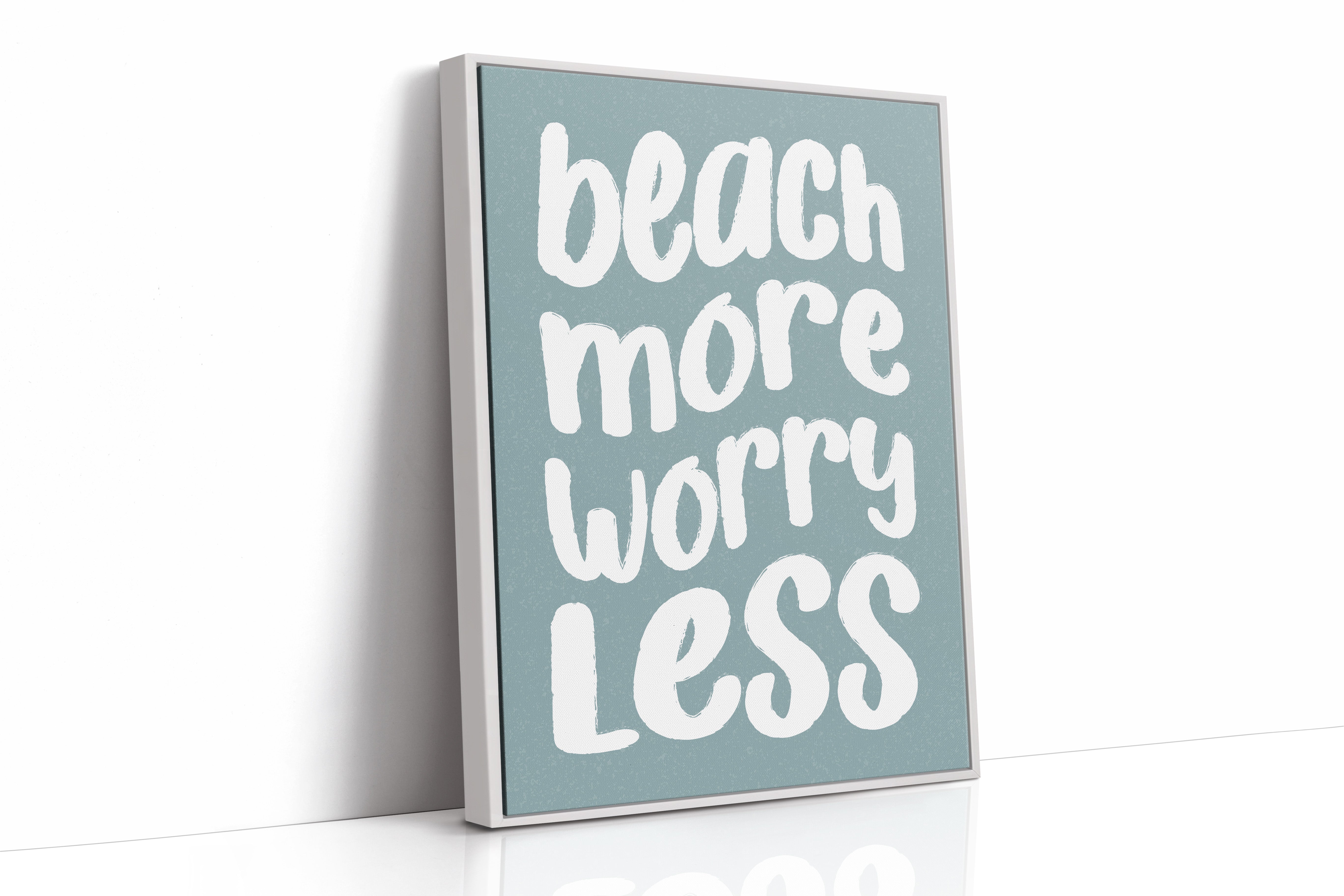Like waves washing away footprints in the sand, this piece speaks to the liberating spirit of coastal living. Part of our Contemporary Typography collection, it pairs modern design with laid-back beach philosophy. Bold white brushstrokes dance against a serene sage-blue background, creating a statement that's both playful and profound in its simplicity. The generous scale and casual elegance of the lettering captures the essence of seaside wisdom. Perfect for bringing a breath of fresh air to living rooms, beach houses, or any space that needs a reminder to slow down and savor life's simple pleasures. Each glance serves as a gentle reminder to choose joy over worry, beach over burden.