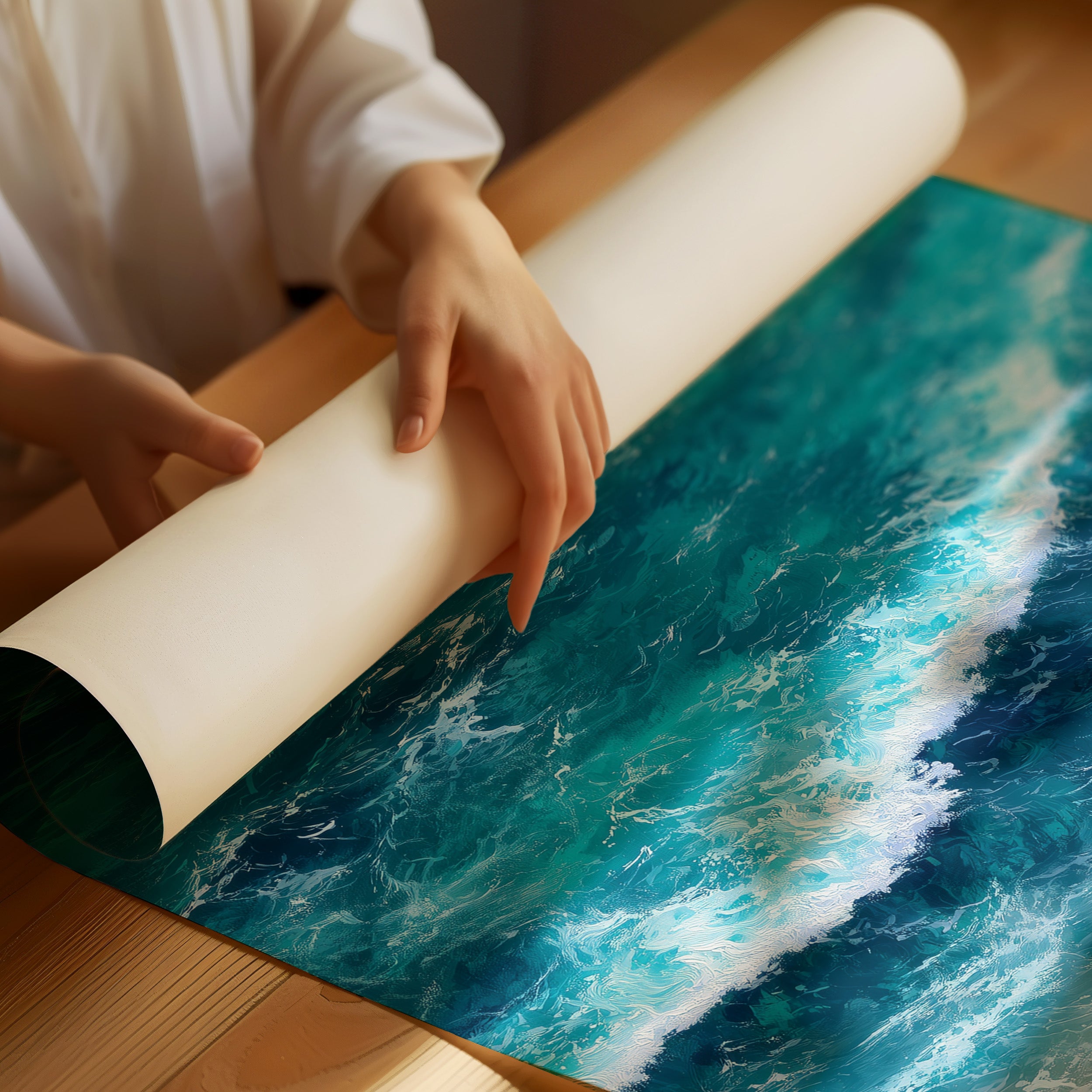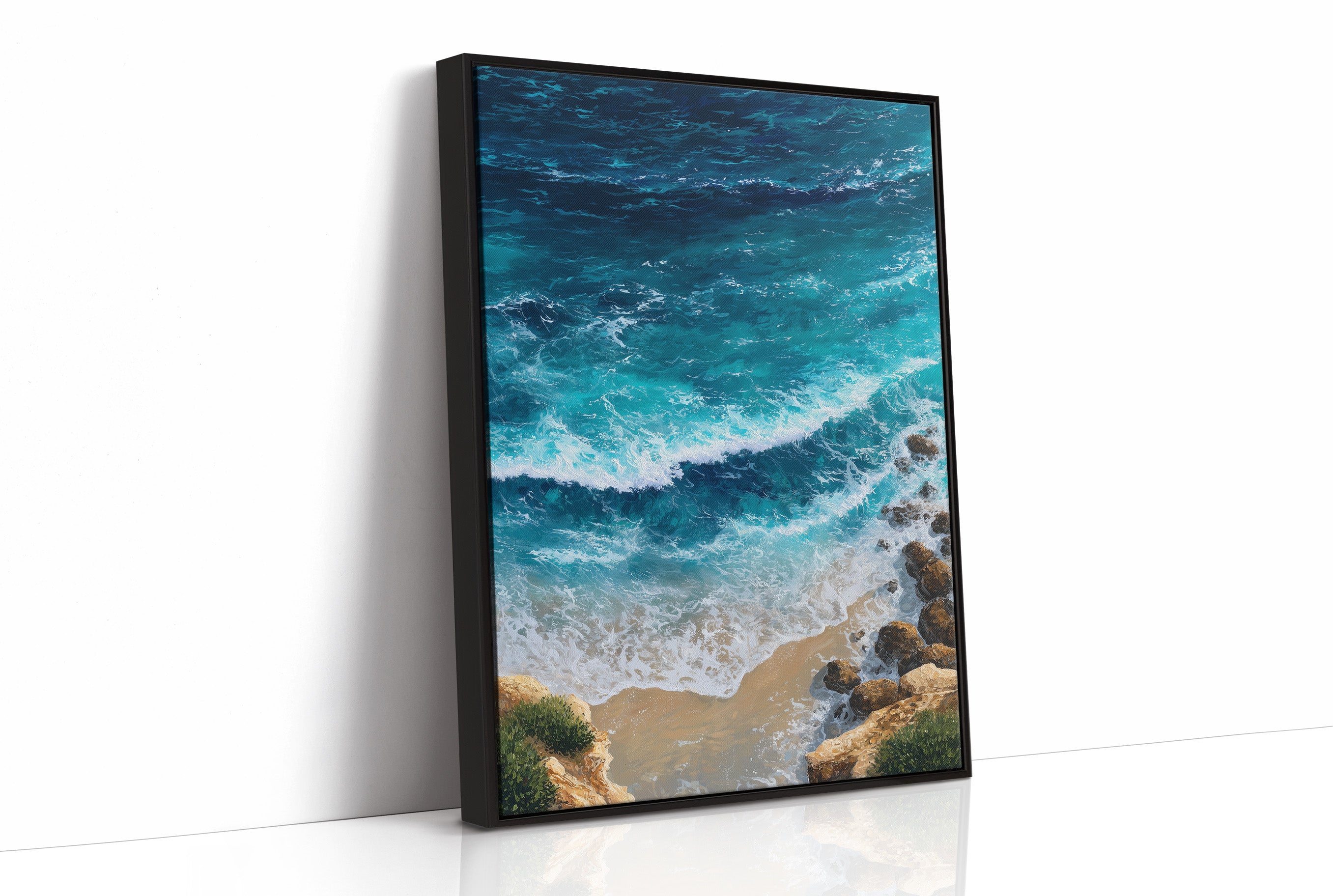 Sunlight spills across hardwood floors, illuminating a framed aerial seascape that leans casually against a sleek side table. The vivid turquoise waves crash against sandy shores, creating a striking contrast to the sophisticated modern interior. The leather armchair, ceramic lamp, and geometric side table create a harmonious blend of natural elements and contemporary design, inviting quiet contemplation.