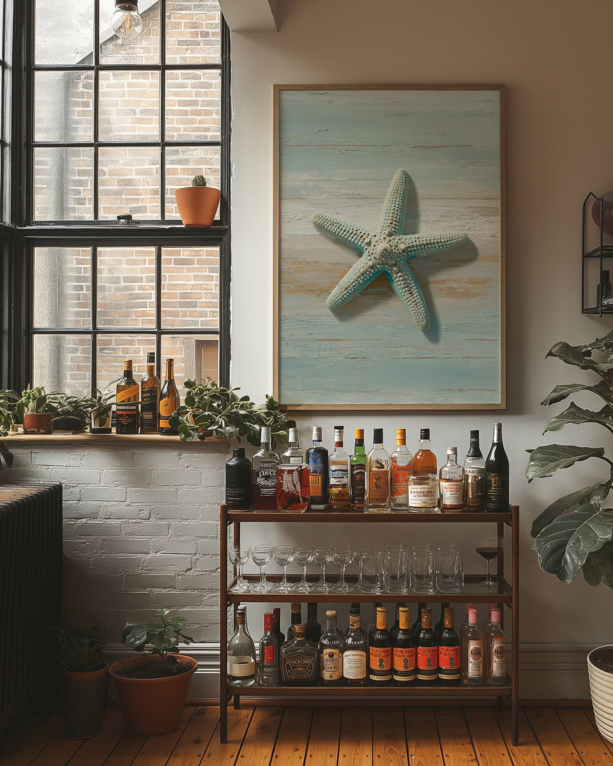 Morning light streams across the polished hardwood, illuminating a delicate starfish preserved in a wooden frame. The soft aqua tones of the artwork create a moment of seaside tranquility against the textured backdrop. Rich leather and warm wood elements surround this oceanic treasure, offering a sophisticated contrast to its beachy simplicity. This piece brings subtle coastal charm to a modern living space without overwhelming the design aesthetic.