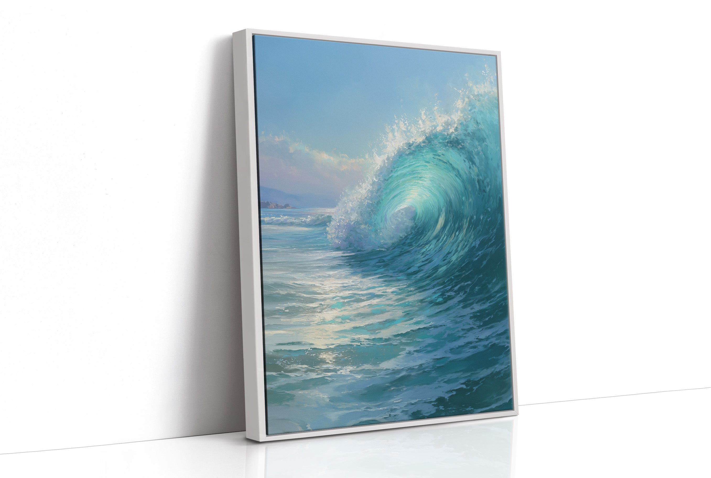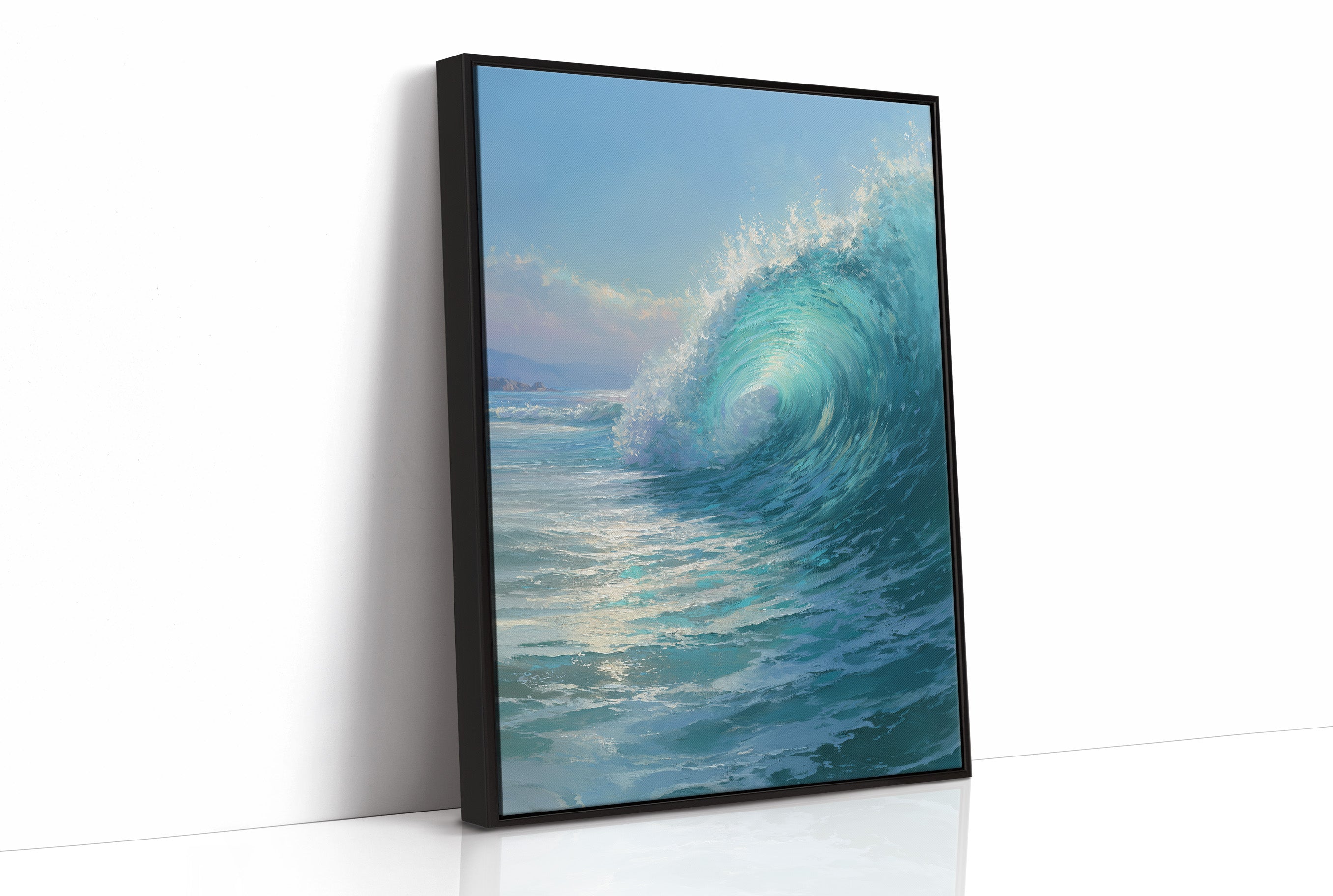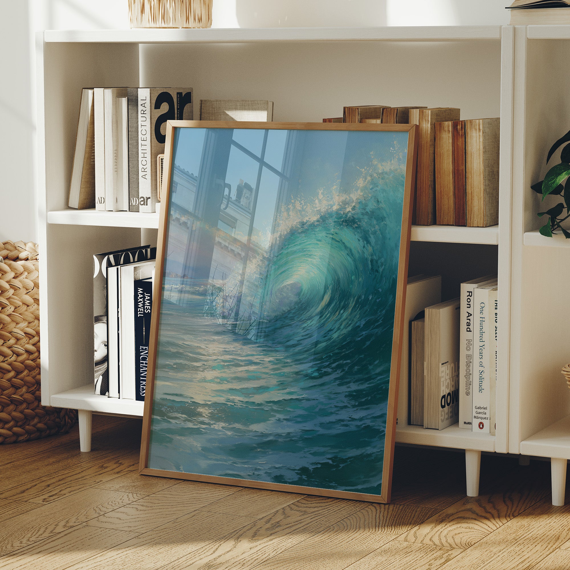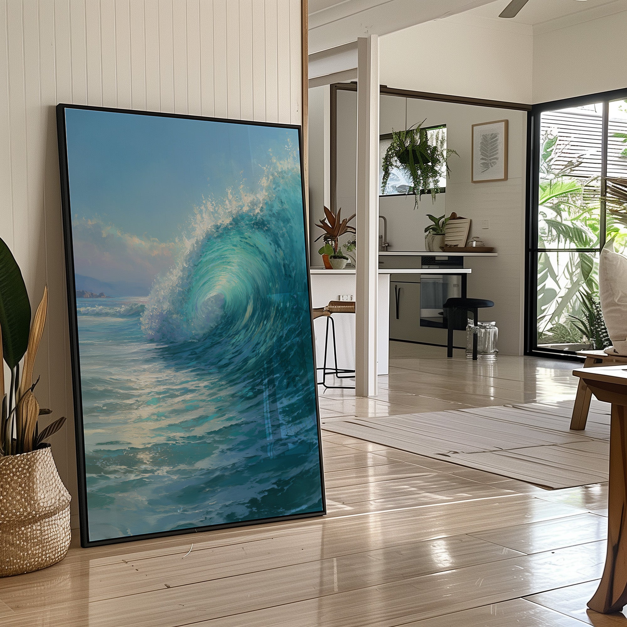 Sunlight dances across the perfect curl of an aquamarine wave, frozen in time against the warm wooden frame. The photograph captures that fleeting moment when water becomes sculptureturquoise depths rising to meet foamy white crests. This oceanic portrait leans casually against sleek black leather, creating a striking contrast between the wild energy of nature and the refined comfort of modern design.