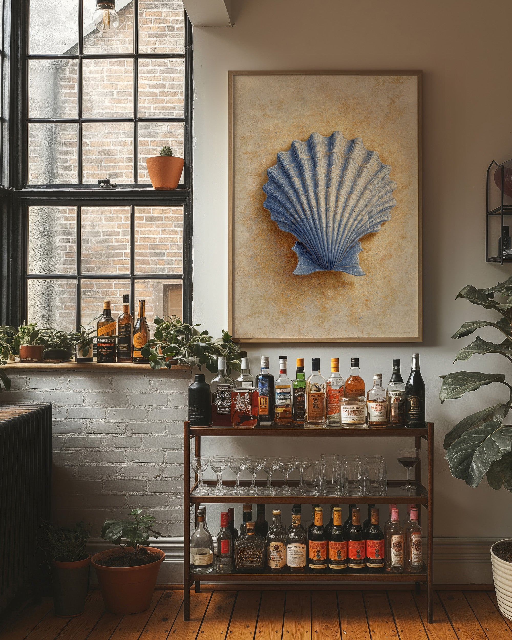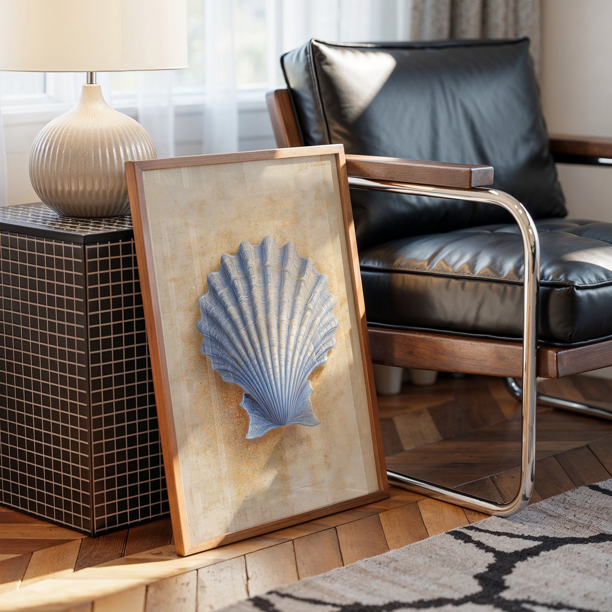 Morning light spills across the wooden floor, illuminating a delicate blue scallop shell set against a warm sandy backdrop. The textured relief catches shadows in its ridges, creating a sense of depth that mimics the shell's natural ocean home. This elegant coastal piece brings a sophisticated nautical element to the modern leather and wood furnishings surrounding it, balancing organic forms with clean lines.