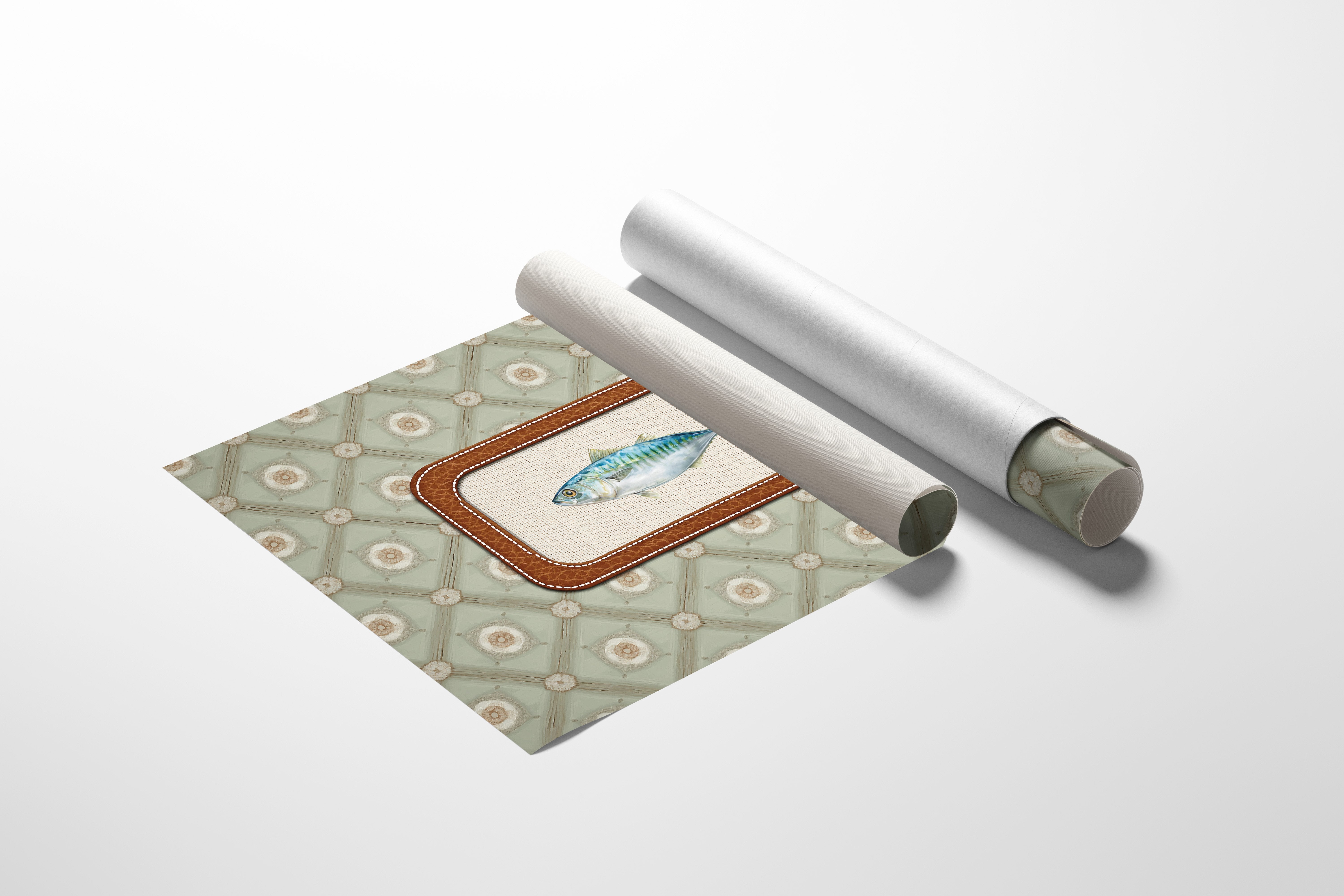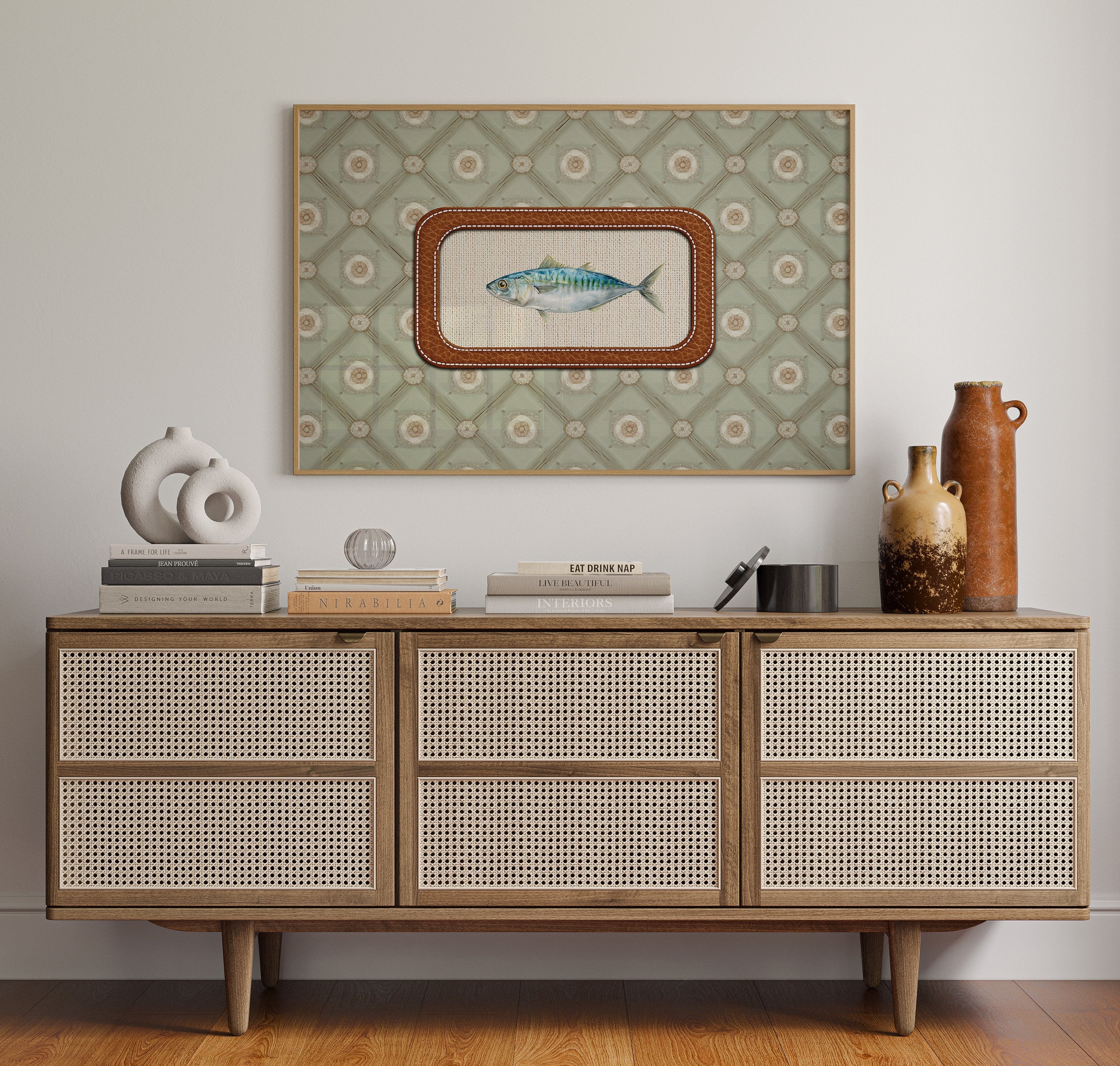 A single mackerel swims eternally in its leather-bound sanctuary, suspended against a backdrop of sage green geometric patterns. The delicate brushstrokes capture the fish's iridescent blue-green scales and silver belly, creating a nostalgic nod to maritime traditions within a refined contemporary setting. This piece brings understated coastal charm to sophisticated interiors.
