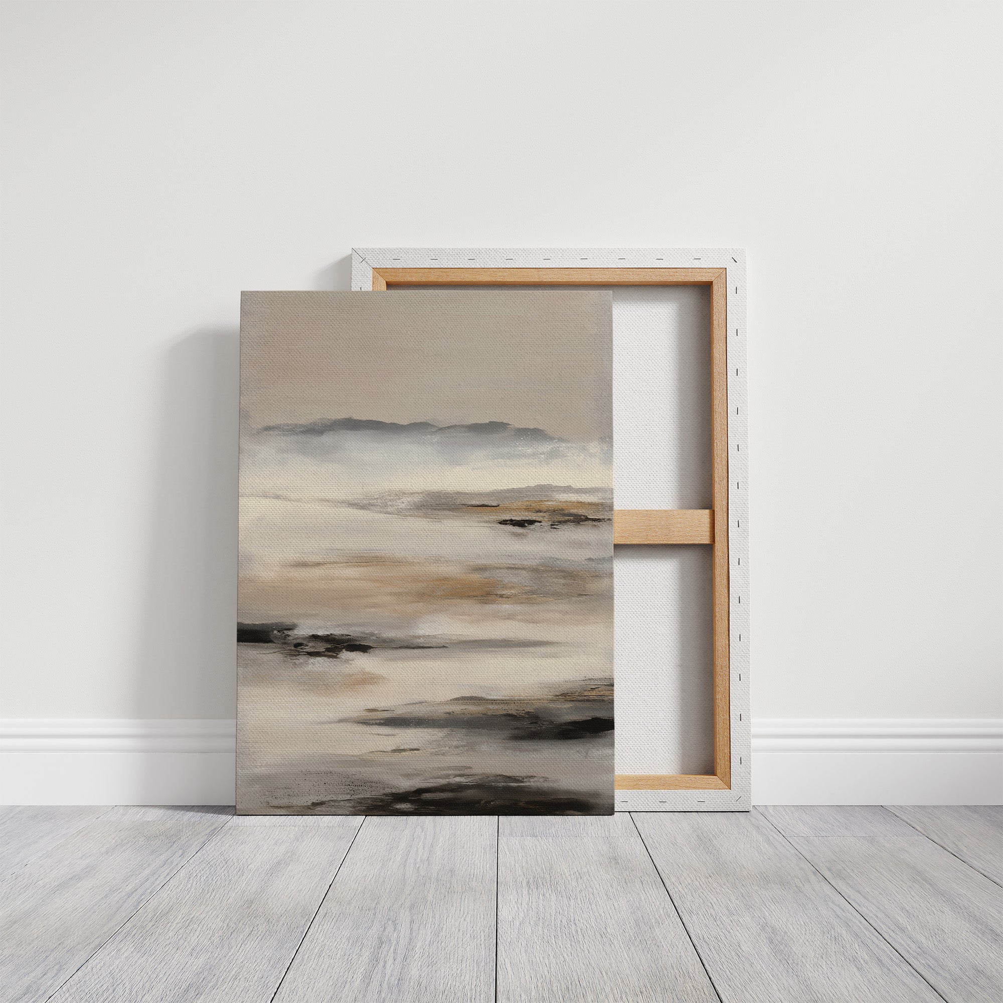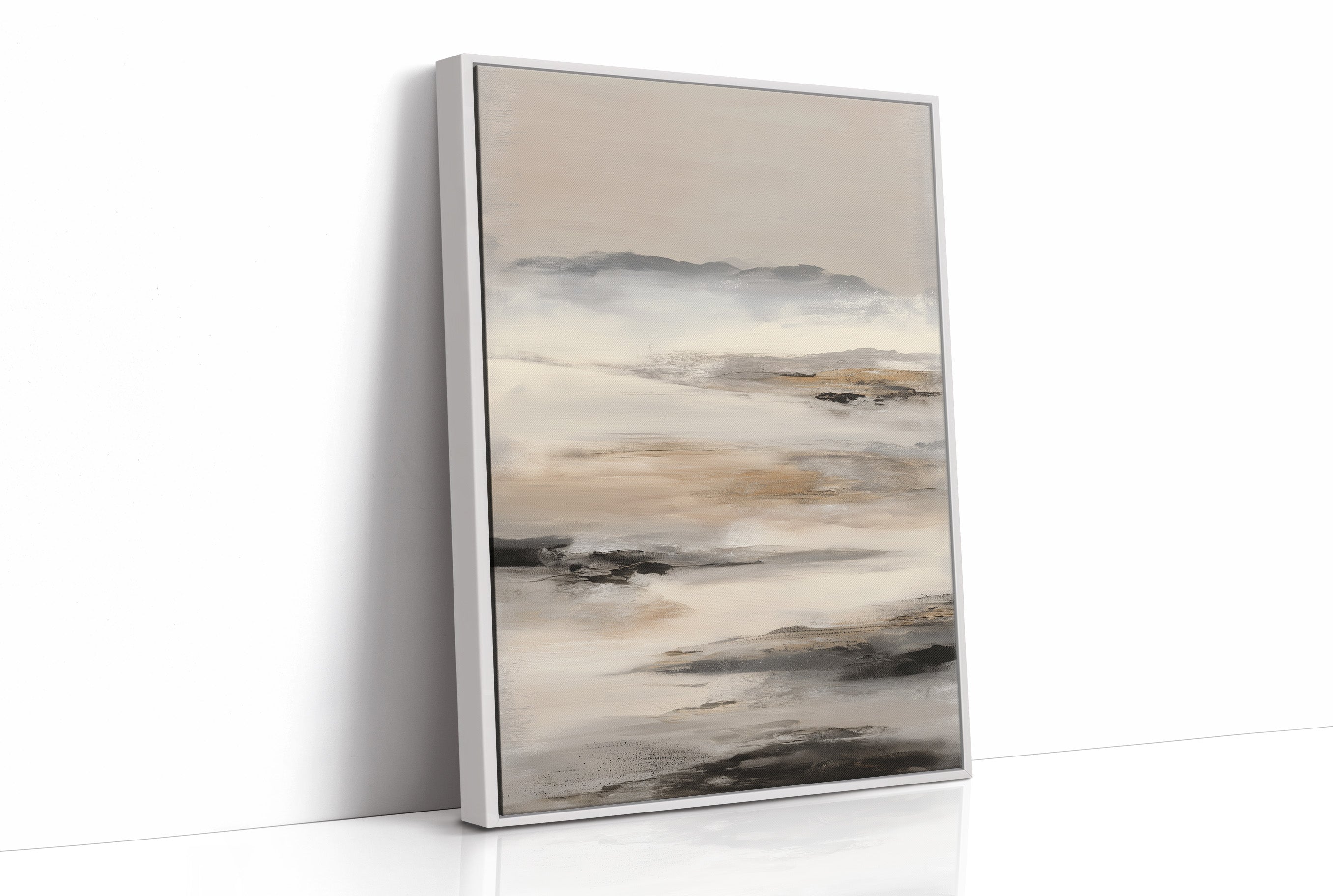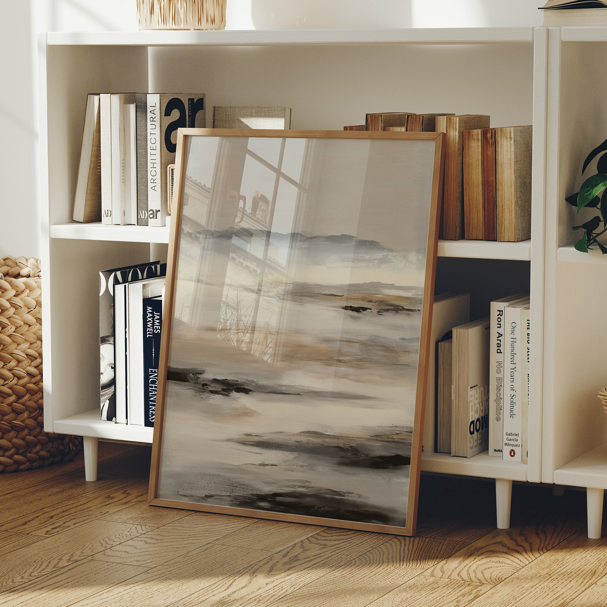 Soft morning light filters through windows, casting gentle shadows across a serene abstract landscape in muted grays and browns. The artwork's misty coastal essence creates a contemplative dialogue with its surroundings, nestled among carefully curated books and natural textures. This piece brings the calming presence of a foggy shoreline into an intimate reading space, perfectly balanced against the warm wooden frame and clean white shelving.