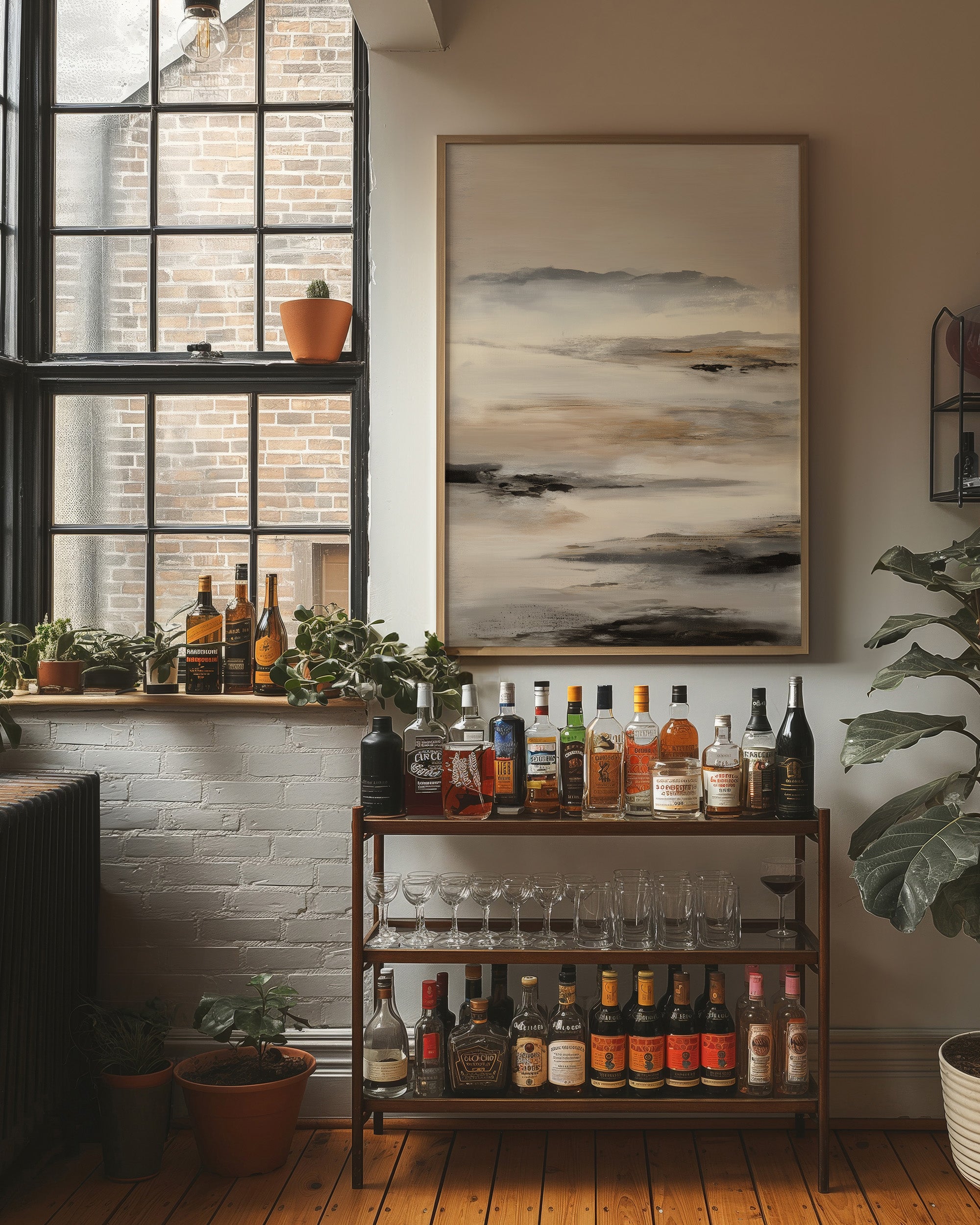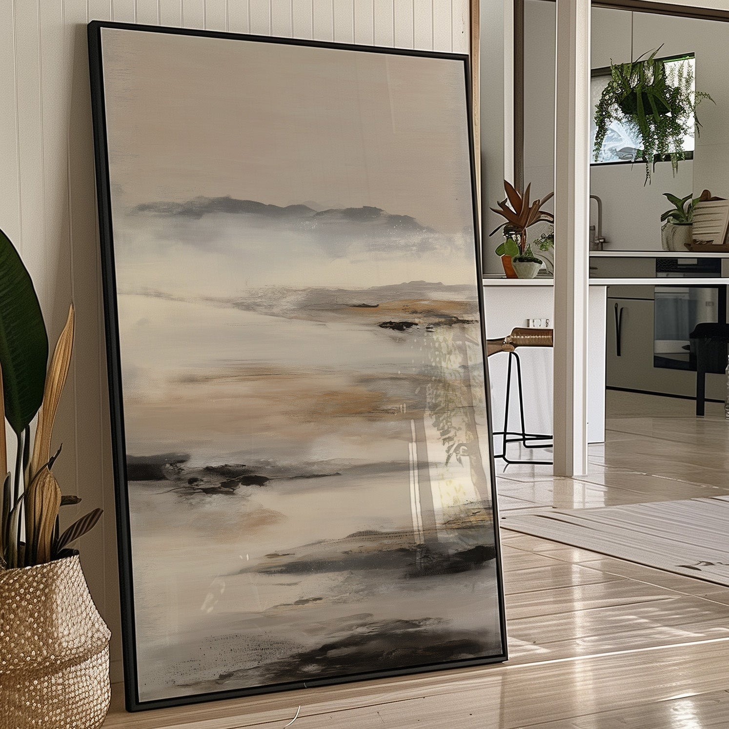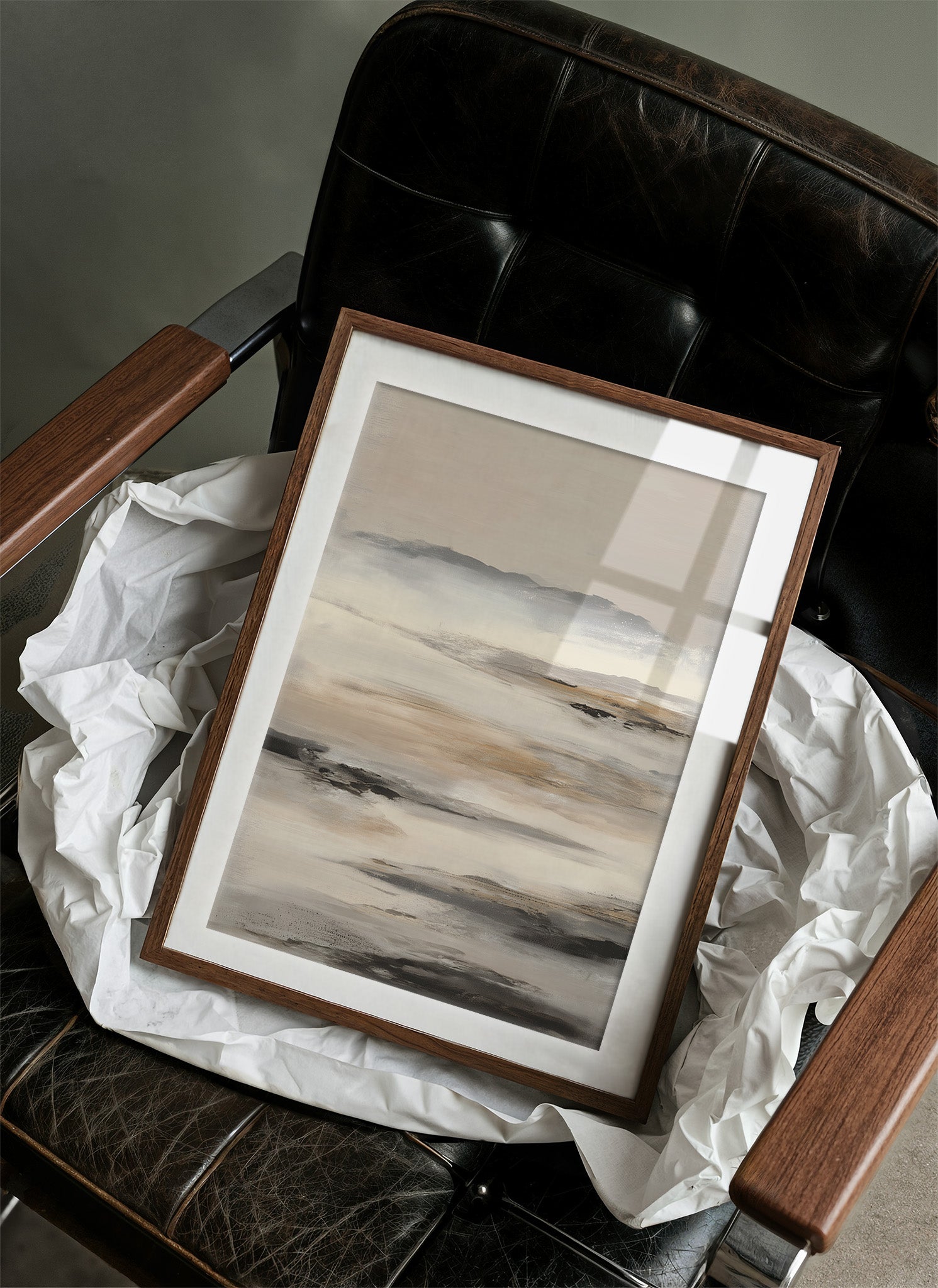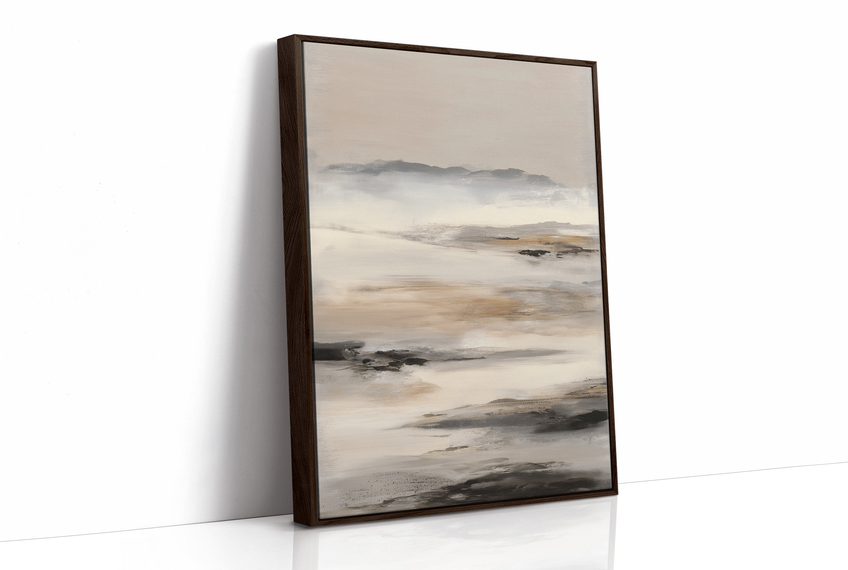 Soft morning light filters through windows, casting gentle shadows across a serene abstract landscape in muted grays and browns. The artwork's misty coastal essence creates a contemplative dialogue with its surroundings, nestled among carefully curated books and natural textures. This piece brings the calming presence of a foggy shoreline into an intimate reading space, perfectly balanced against the warm wooden frame and clean white shelving.