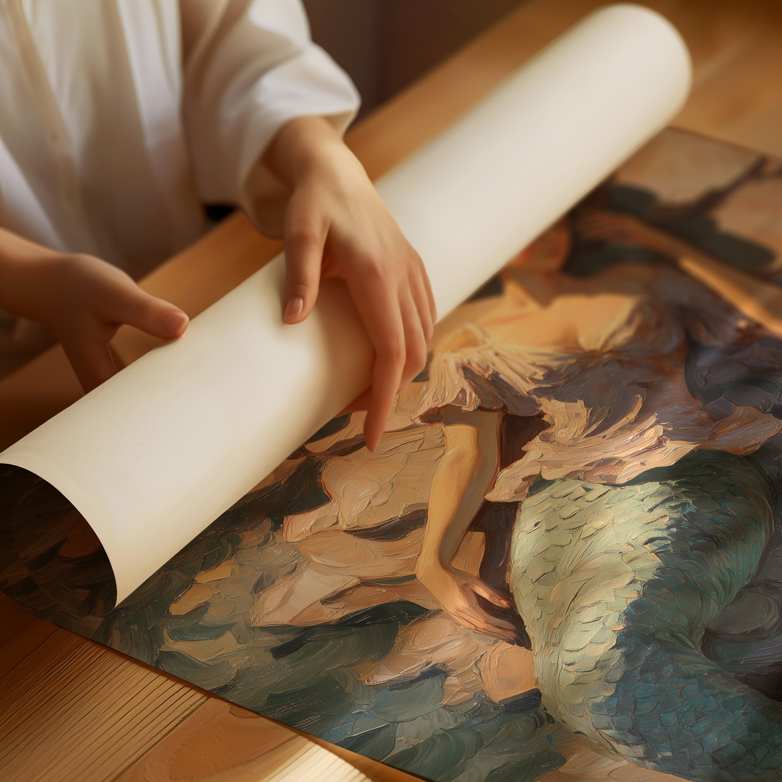 Warm golden tones contrasted with cool teals, the painterly style features expressive brushwork and a dreamlike quality, capturing the essence of fantasy and folklore. The interplay between the completed painting and its exposed framework creates an interesting meta-commentary on the art creation process.