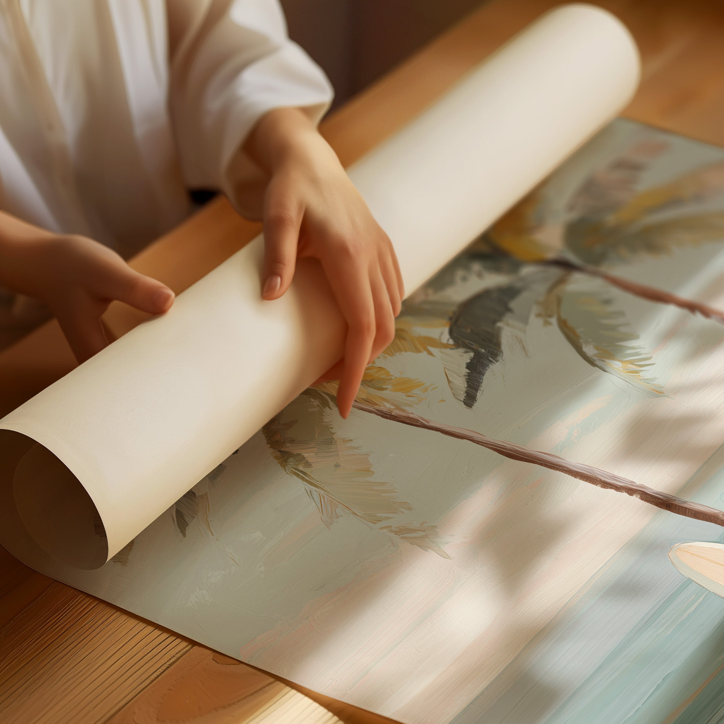 The artwork depicts two elegant palm trees swaying gently above a row of surfboards white and honey-toned standing upright in the sand. Soft pastel hues capture the tranquil ocean meeting a hazy horizon, creating a dreamy coastal atmosphere.