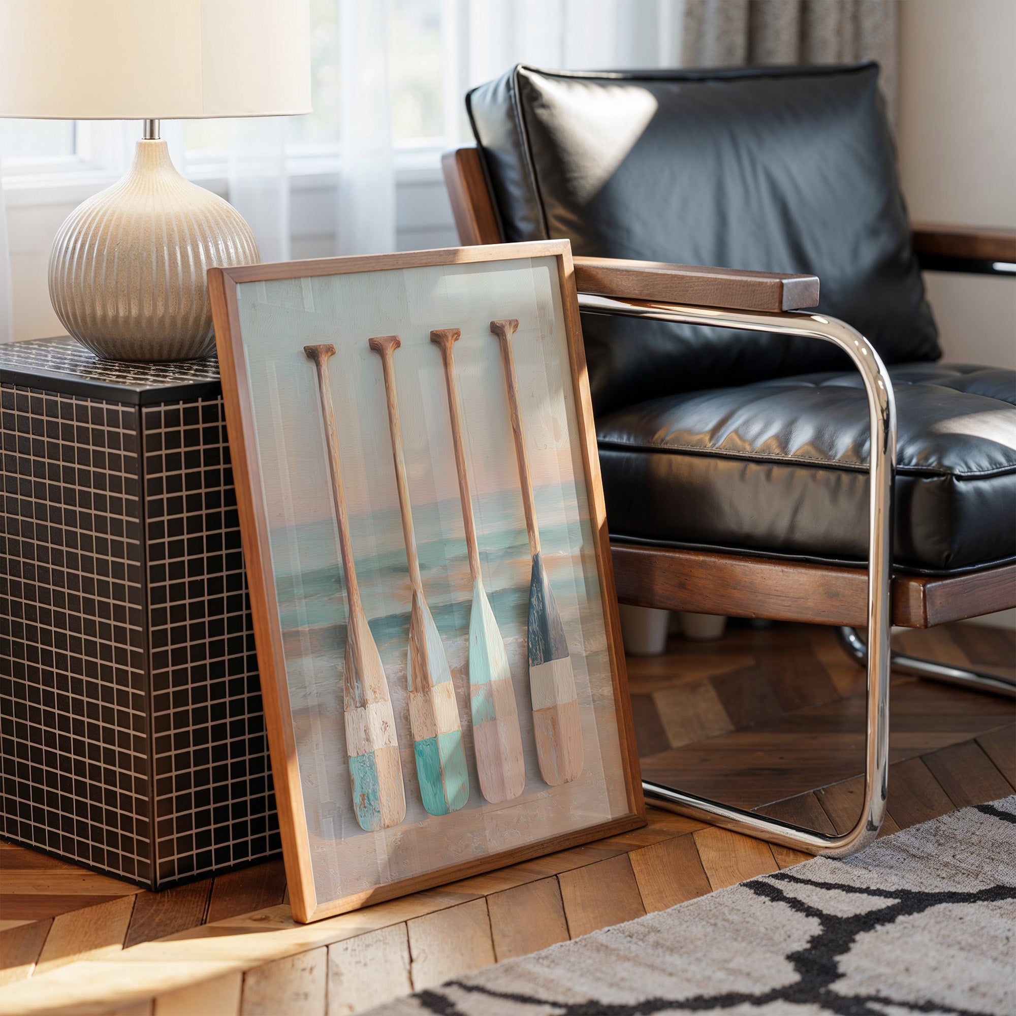 Sunlight spills across weathered wooden oars, their sea-kissed tips bearing the gentle palette of shoreline memories. The artful display captures the essence of maritime nostalgia, with soft aqua and cream hues telling stories of countless journeys across calm waters. This sophisticated coastal piece brings understated elegance to a modern living space, perfectly complementing the clean lines of contemporary furniture while adding warmth through its natural materials.