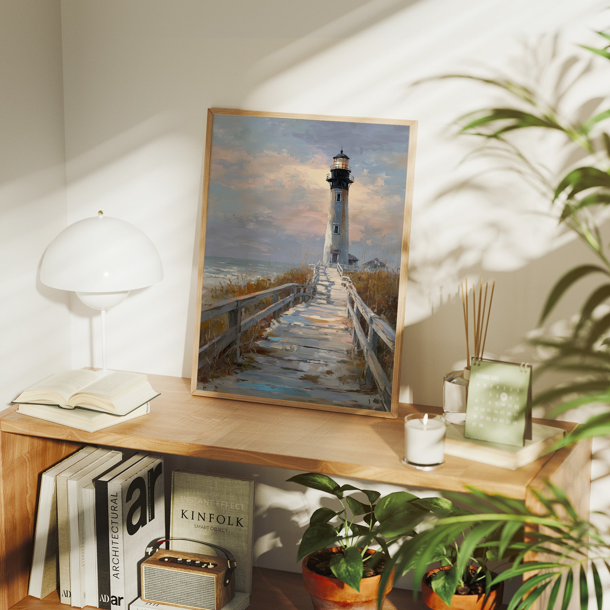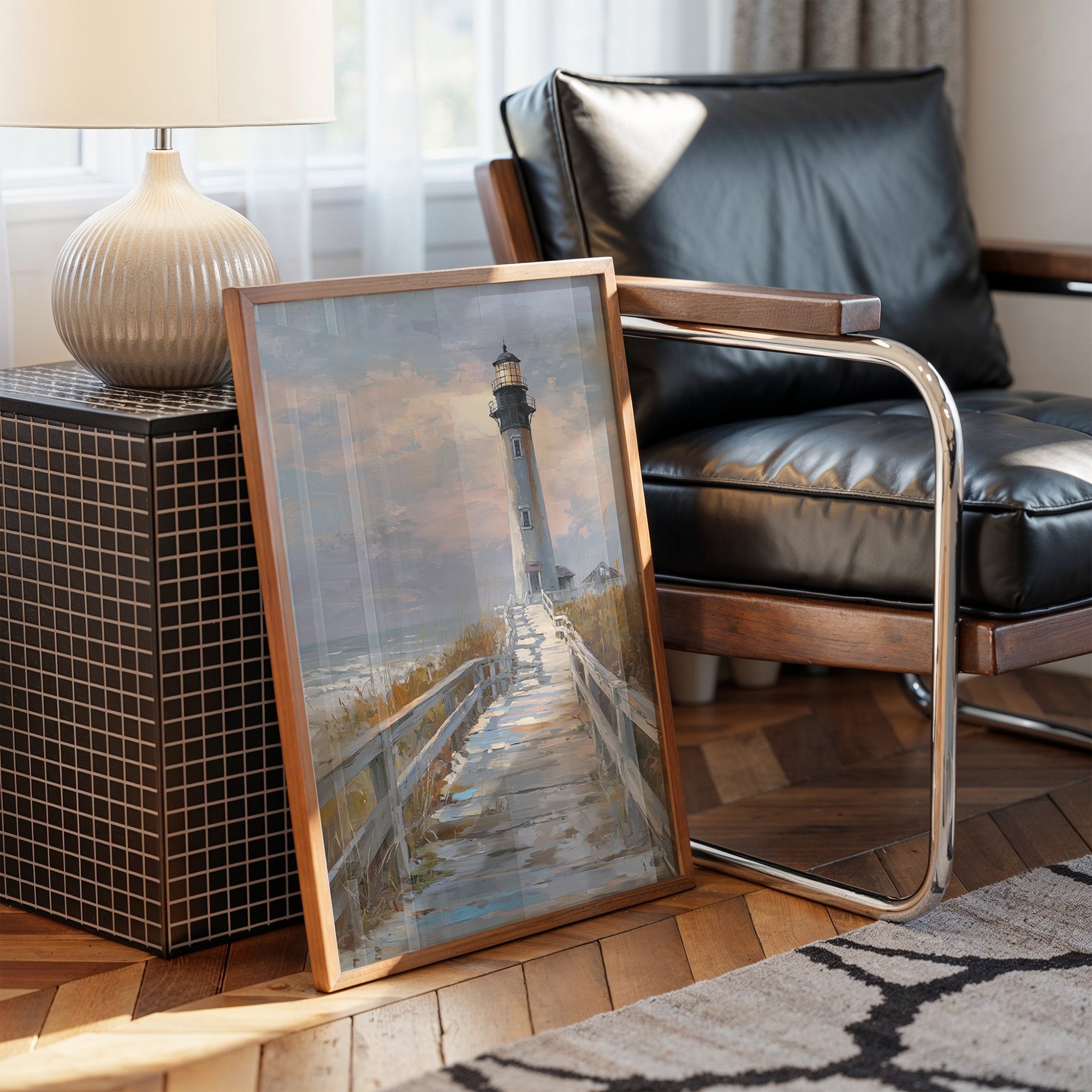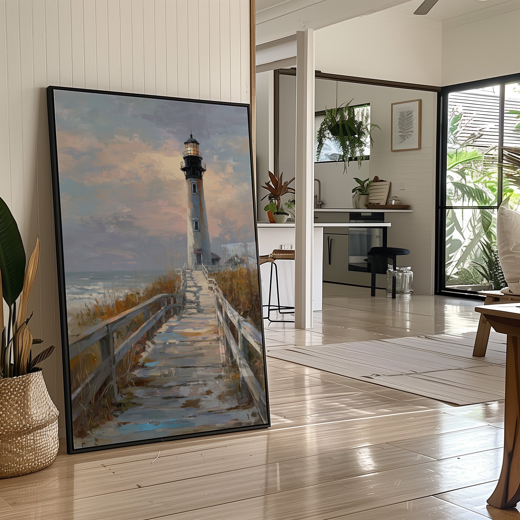 Sunlight catches on weathered wooden planks, guiding the eye toward a solitary lighthouse standing tall against a sky of gathering clouds. The painting captures that perfect tension between serenity and anticipation, where coastal grasses bend in the unseen breeze and sea spray hangs in the air. The warm wooden frame complements the natural palette of sand, stone, and sky, creating a window to a peaceful shoreline moment. This coastal scene brings a touch of maritime nostalgia to living rooms or home offices seeking connection to distant shores.