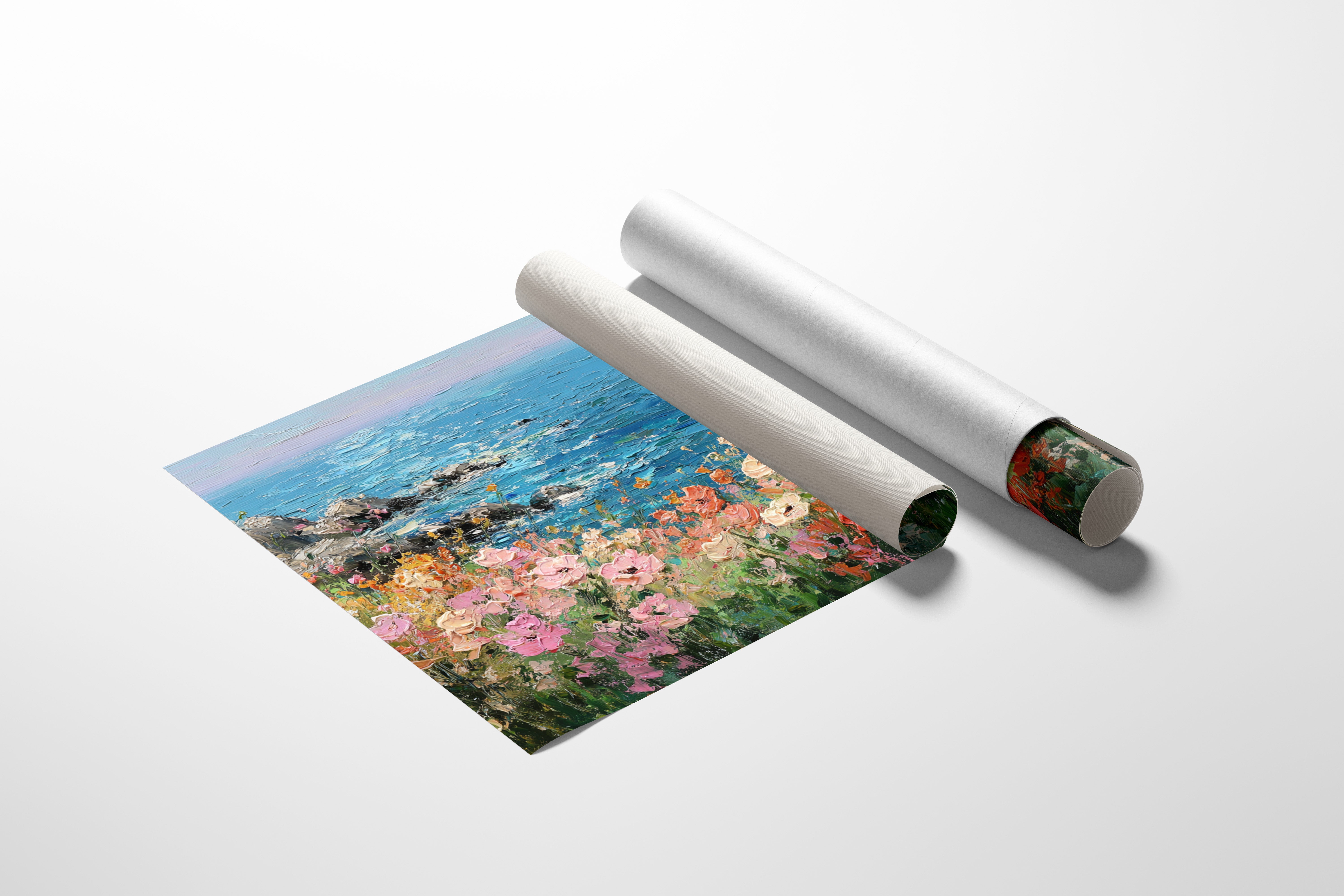 Delicate petals catch the sea breeze, creating a symphony of coral, pink, and cream against the deep blue horizon. Textured brushstrokes capture the dynamic energy of wildflowers swaying along rugged coastal cliffs, where ocean spray meets fertile earth. The palette knife technique brings dimensional depth to each bloom, while the cerulean waters below create a stunning contrast with their rolling waves and distant rocky outcrops. This piece radiates Mediterranean charm and seaside serenity, perfect for bringing natural vibrancy to a sun-filled breakfast nook or coastal-inspired living space.