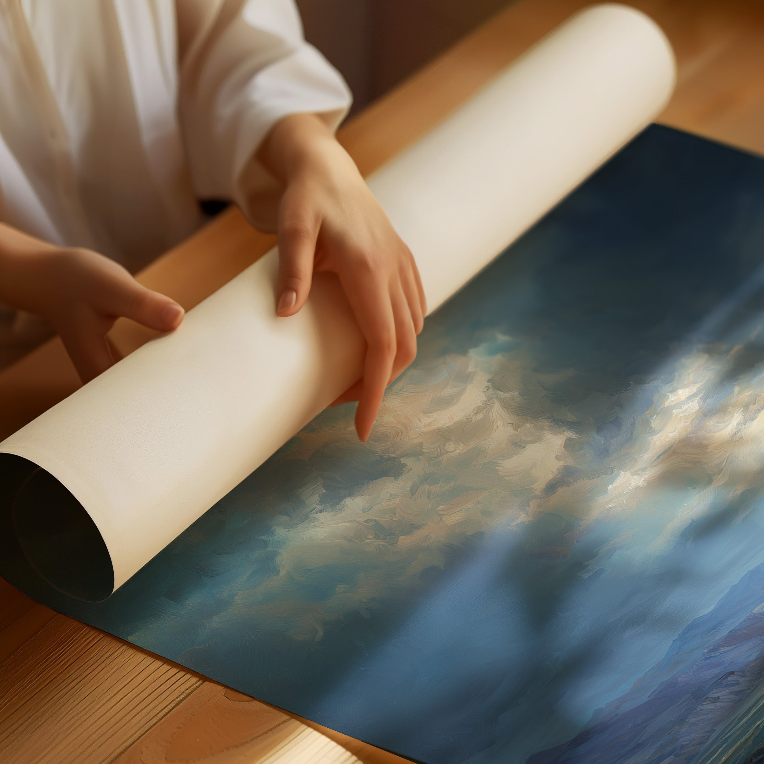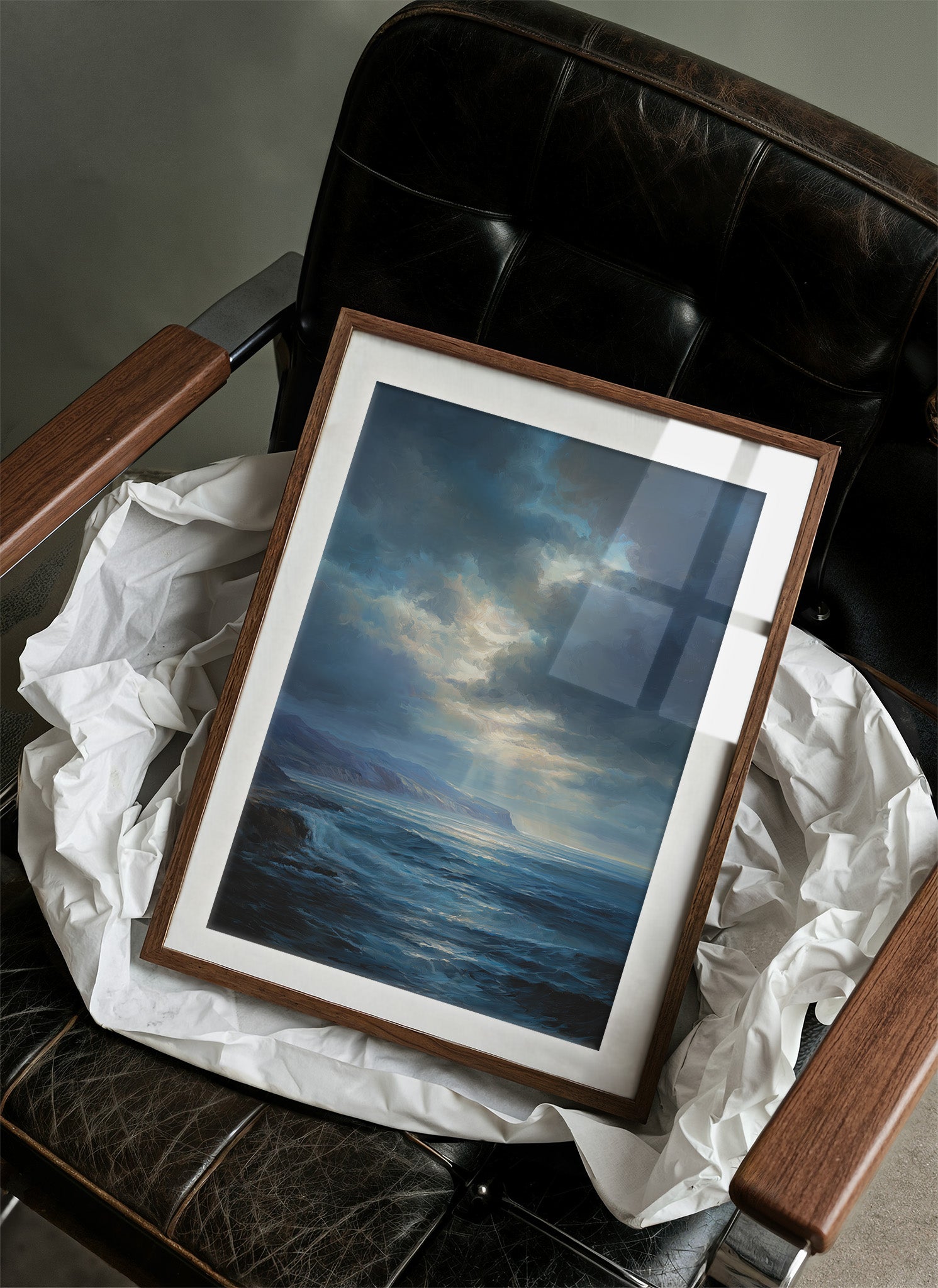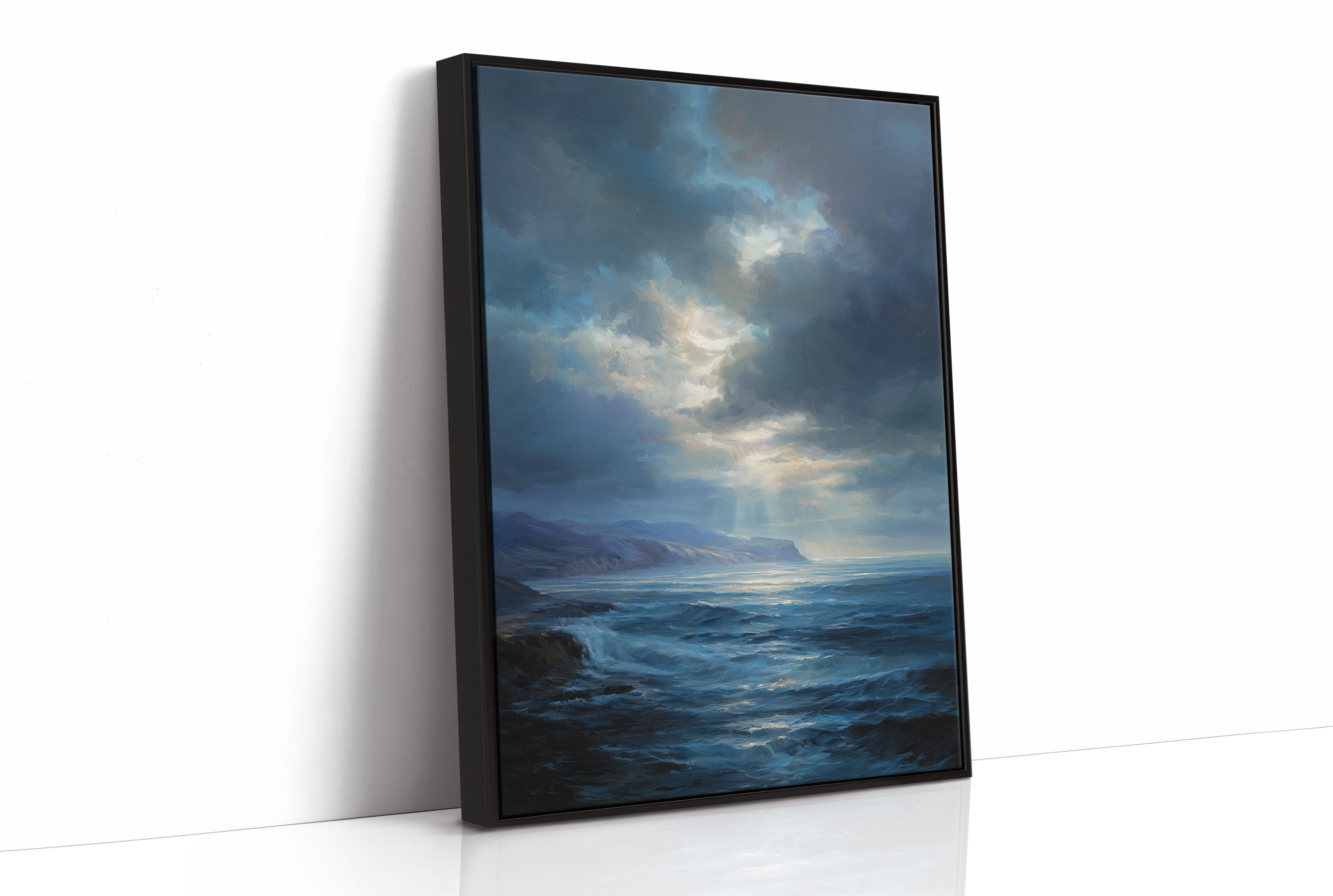 Sunlight pierces through brooding clouds, casting ethereal beams across turbulent waters. The seascape captures that magical moment when darkness gives way to light, with deep blues and silvery highlights dancing across waves that crash against distant cliffs. This contemplative piece brings the drama and serenity of nature's most powerful elements into perfect balance.