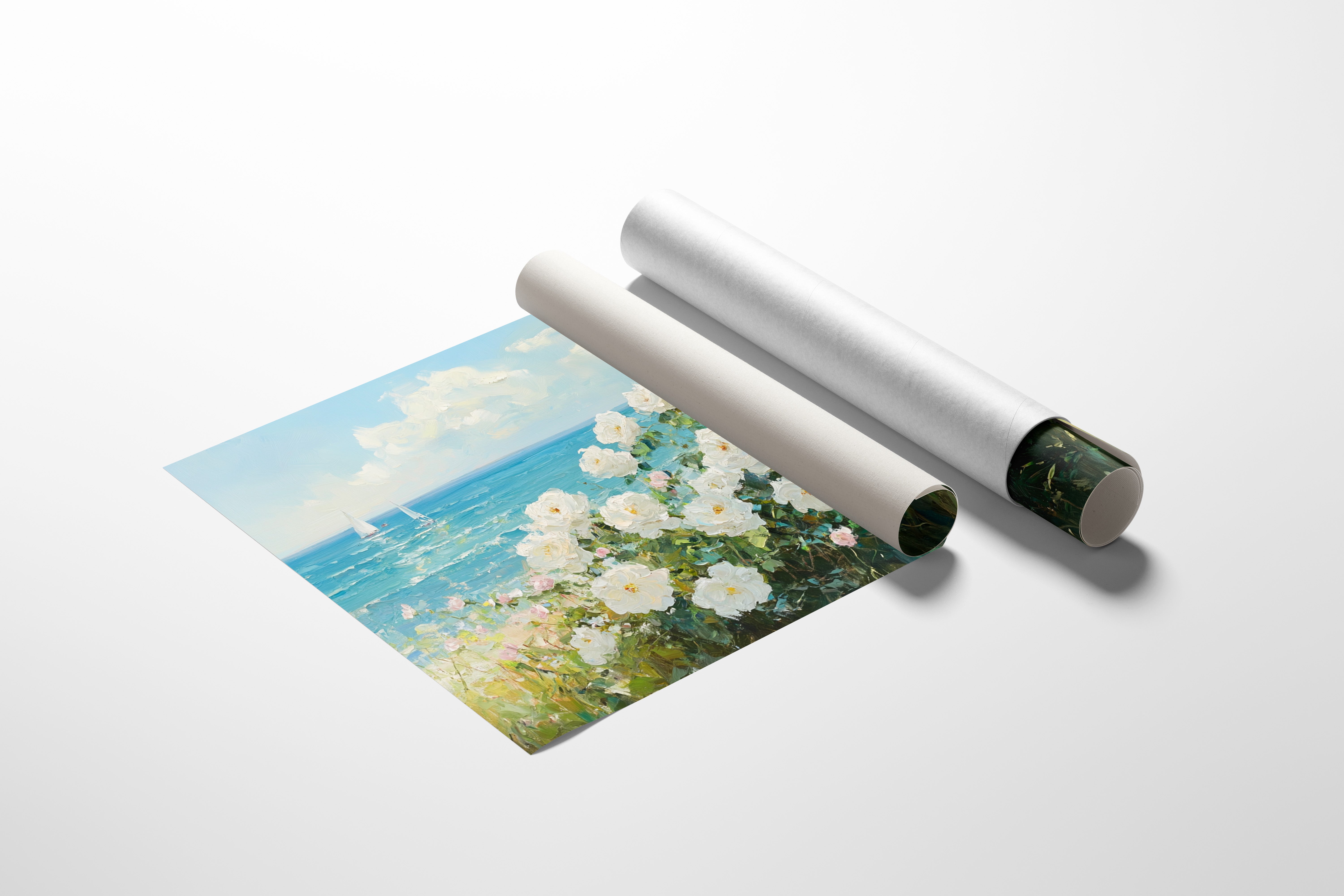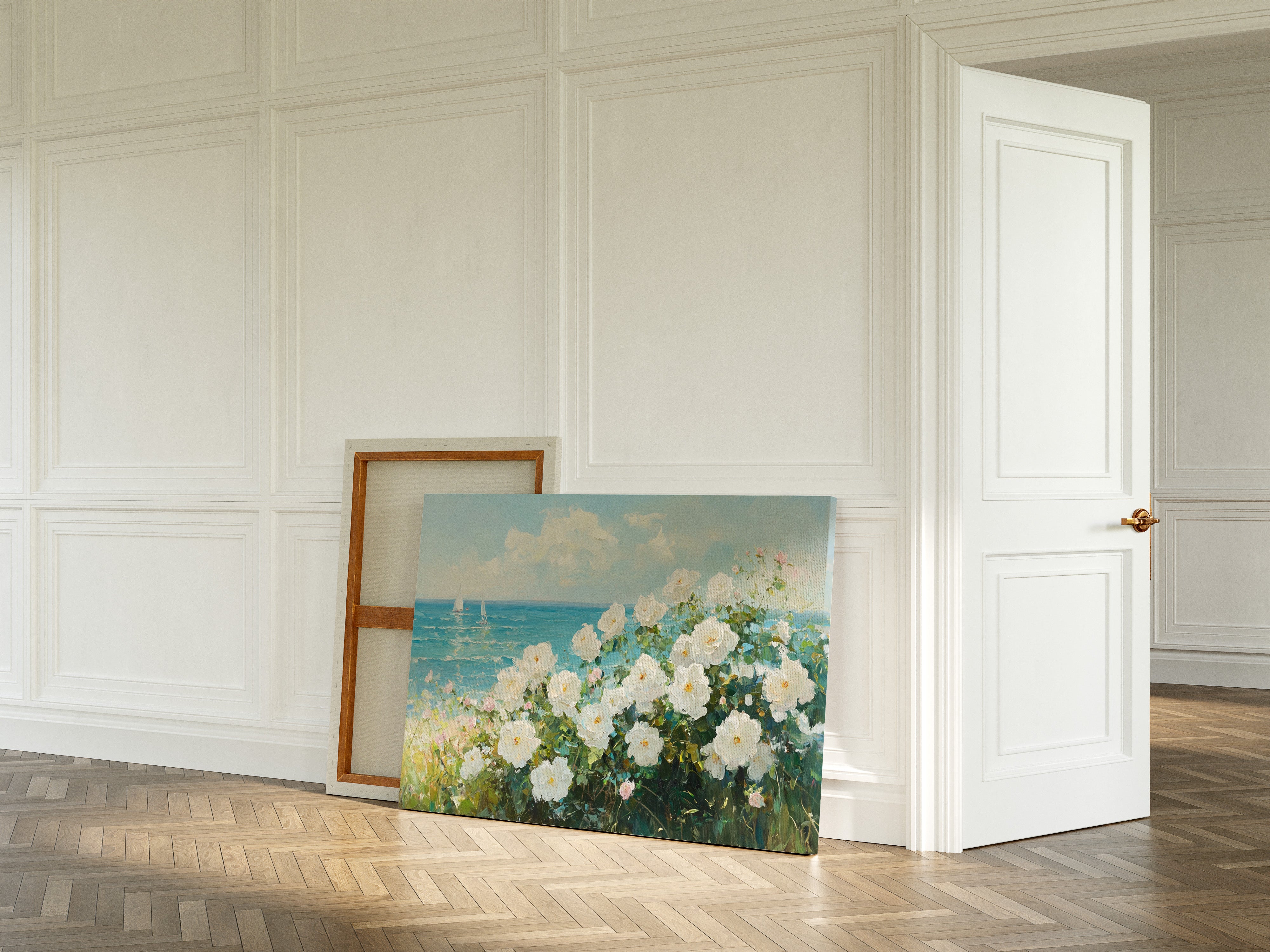 White roses cascade along the shoreline, their petals catching the same brilliant light that sparkles across the turquoise waters beyond. The blooms appear to sway in conversation with distant sailboats, their pristine petals echoing the white sails on the horizon. Rich impasto brushstrokes capture the texture of both the delicate flowers and the dynamic ocean waves, while soft clouds drift lazily across the azure sky. This piece radiates the essence of a perfect summer day by the sea, where nature's elements harmonize in a gentle ballet of color and movement. Perfect for bringing a sense of seaside serenity to a sun-filled breakfast nook or adding coastal charm to a master bedroom retreat.