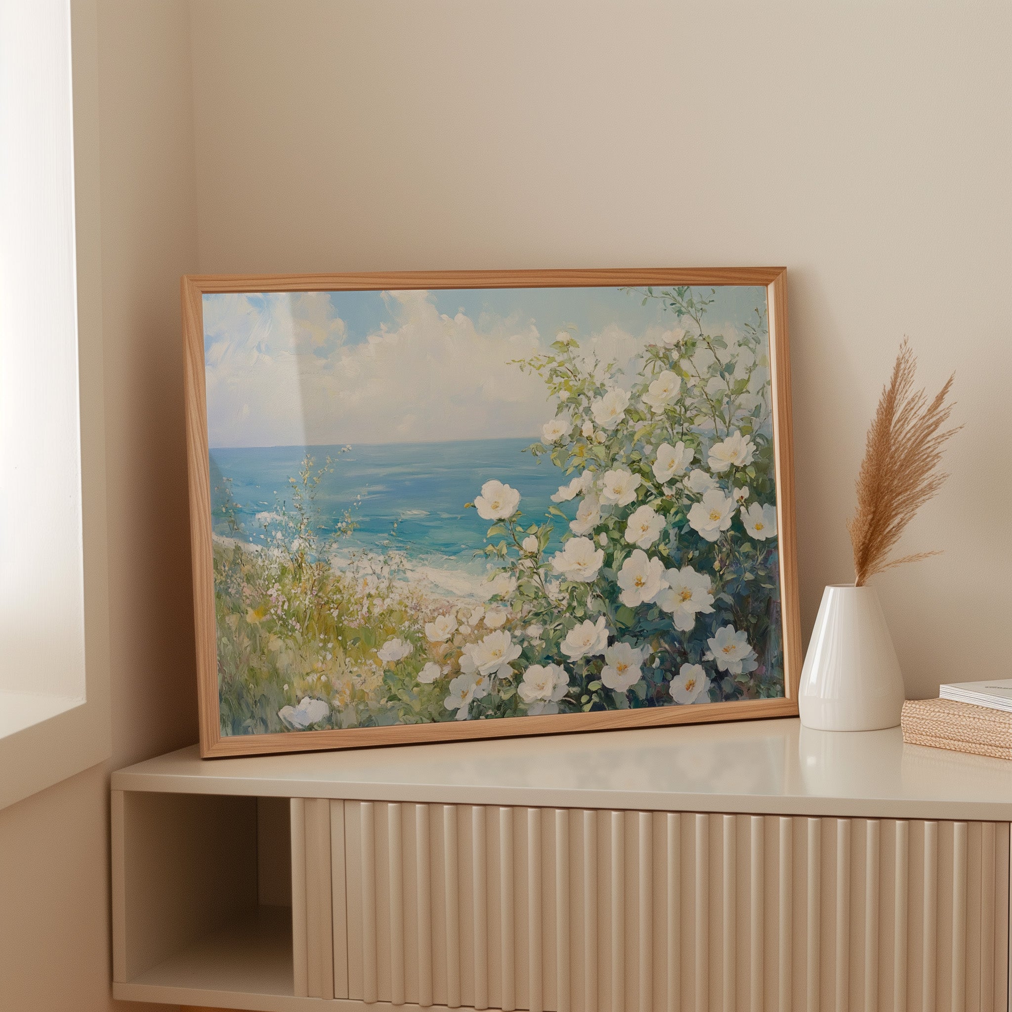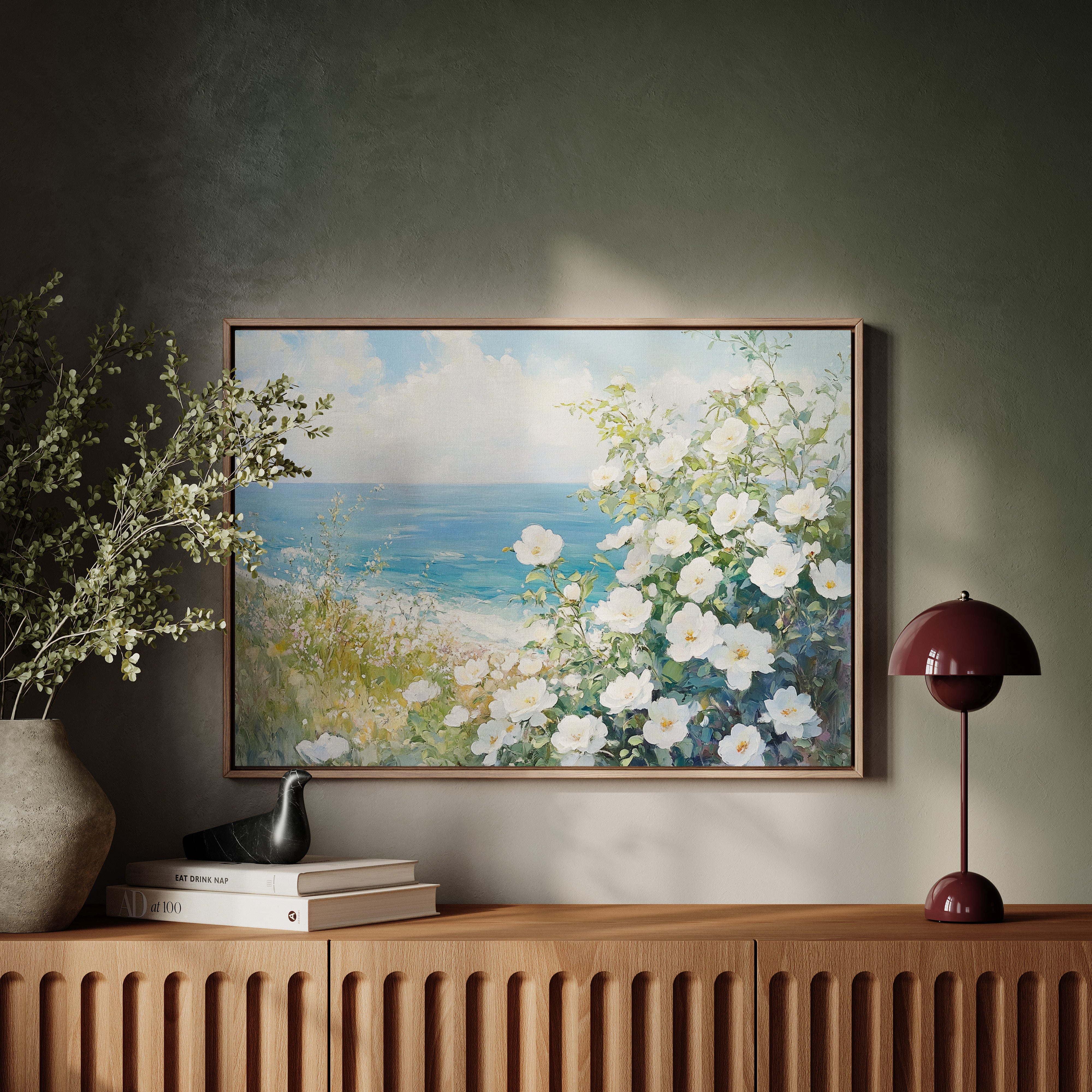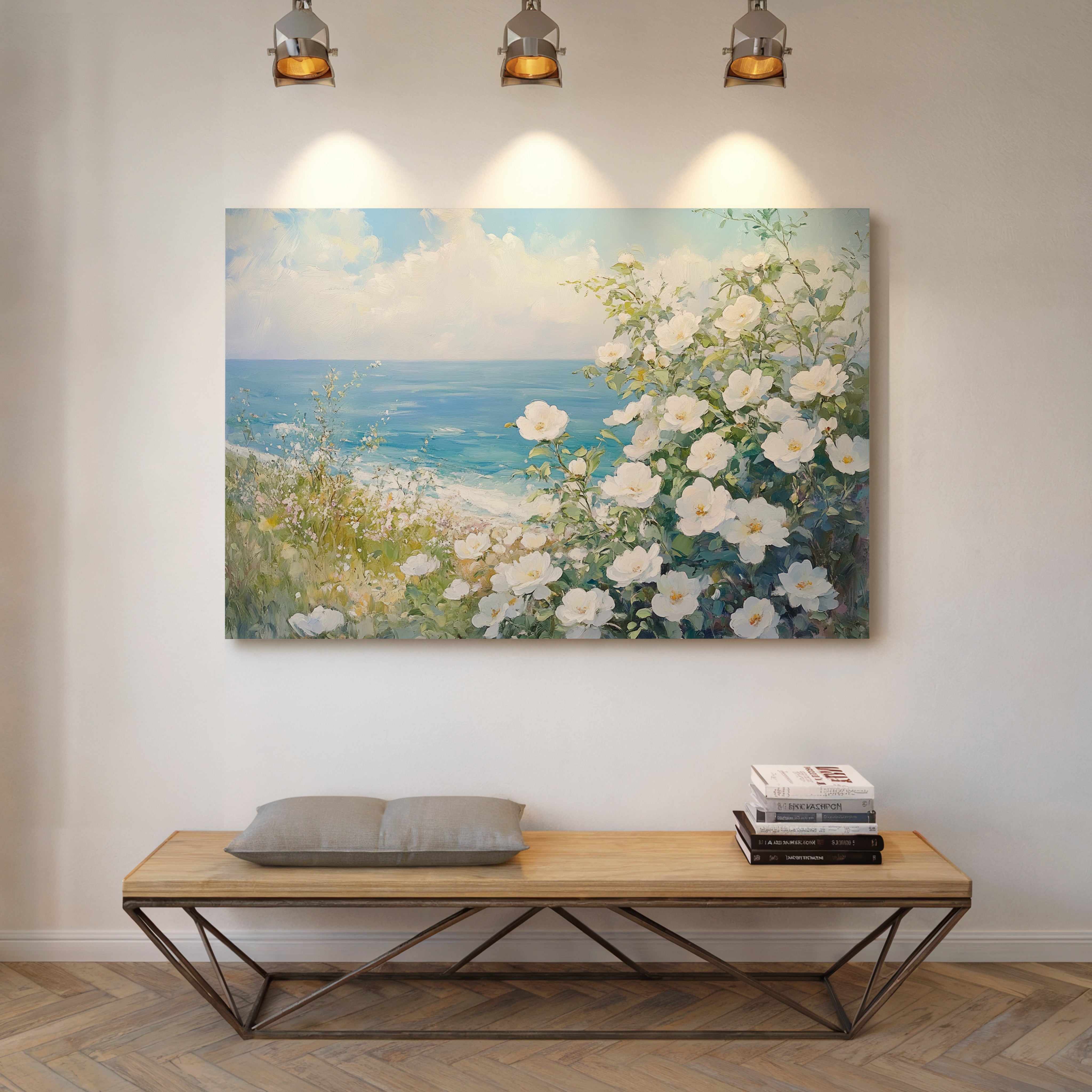 White roses cascade down a seaside cliff, their delicate petals catching the salt-kissed breeze. The scene captures a perfect summer morning where wild blooms meet endless azure waters. Impressionist brushstrokes blend the soft whites of beach roses with sage green foliage, while the cerulean ocean stretches to meet billowing clouds on the horizon. The composition creates a natural harmony between the structured beauty of the flowers and the wild freedom of the coastline. This piece brings a breath of fresh coastal air to bedrooms, living spaces, or any room seeking the gentle romance of a seaside garden.