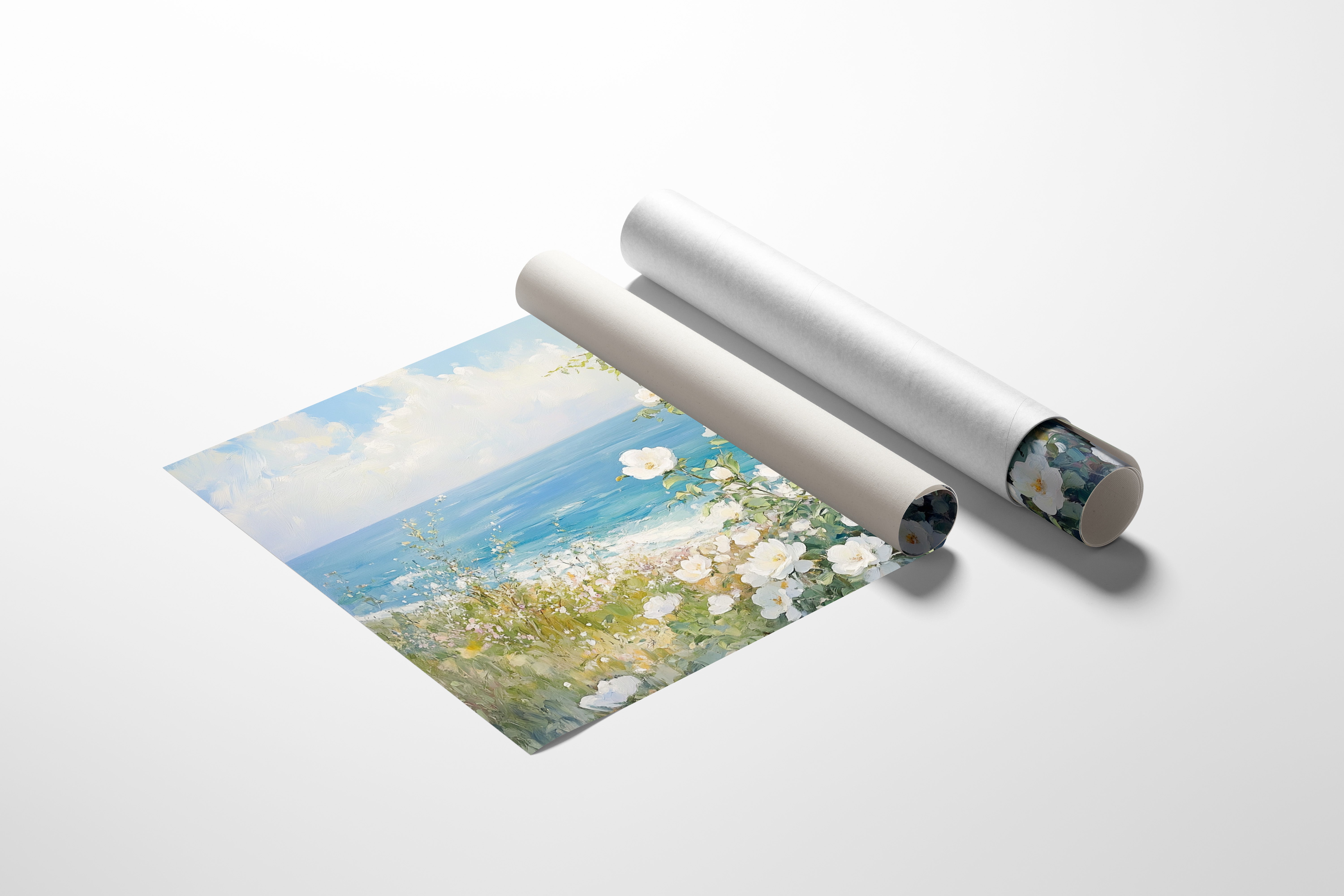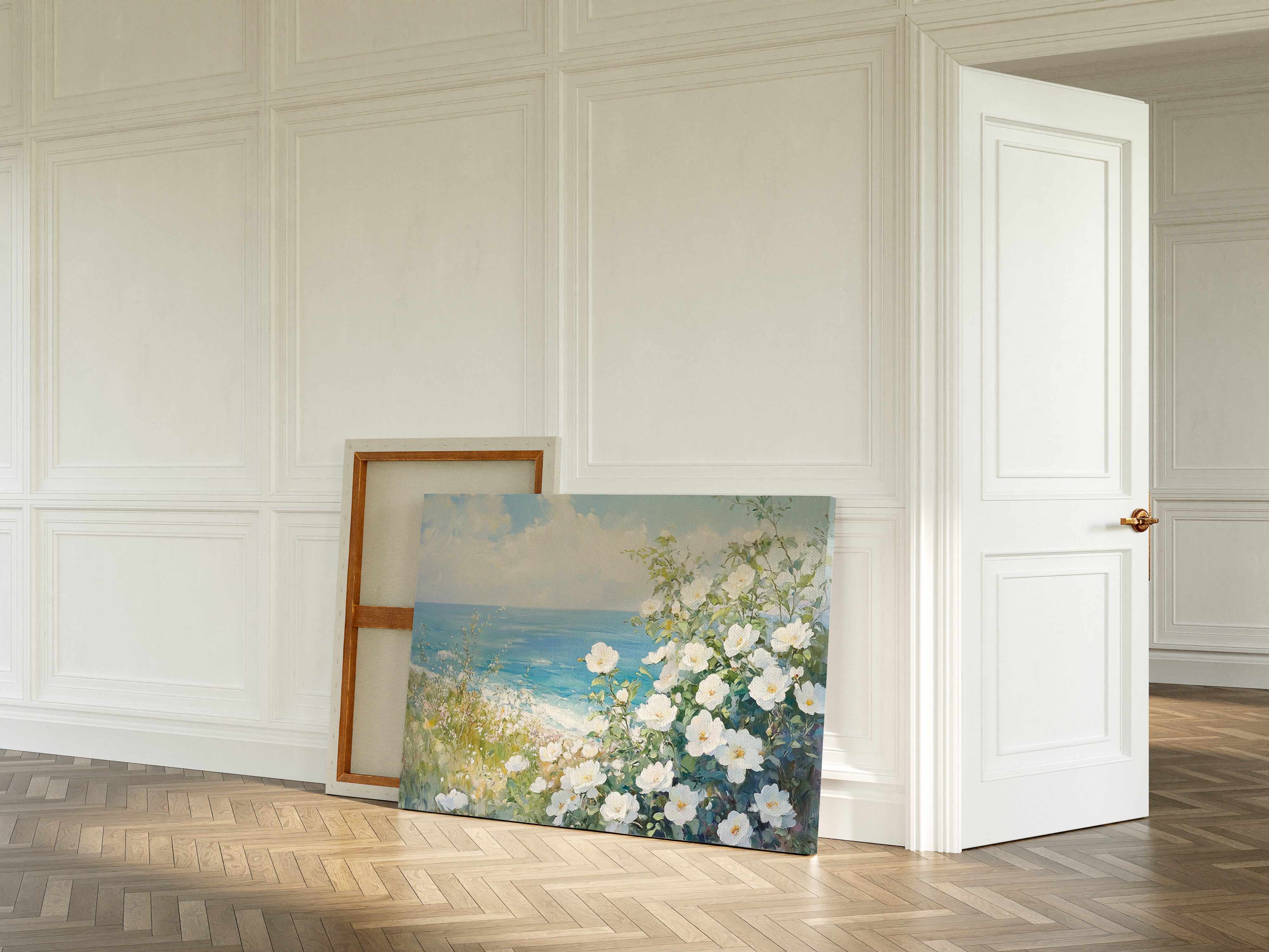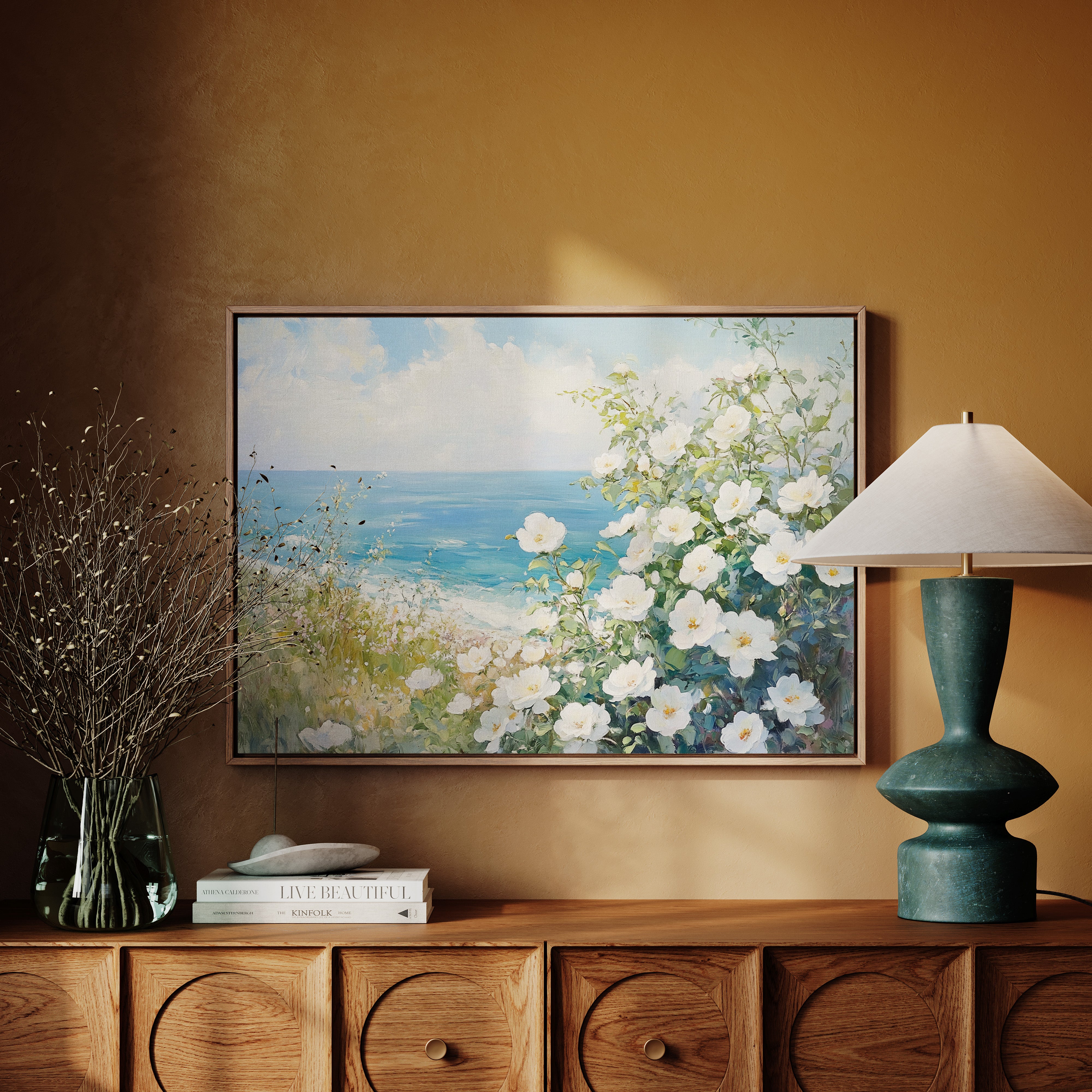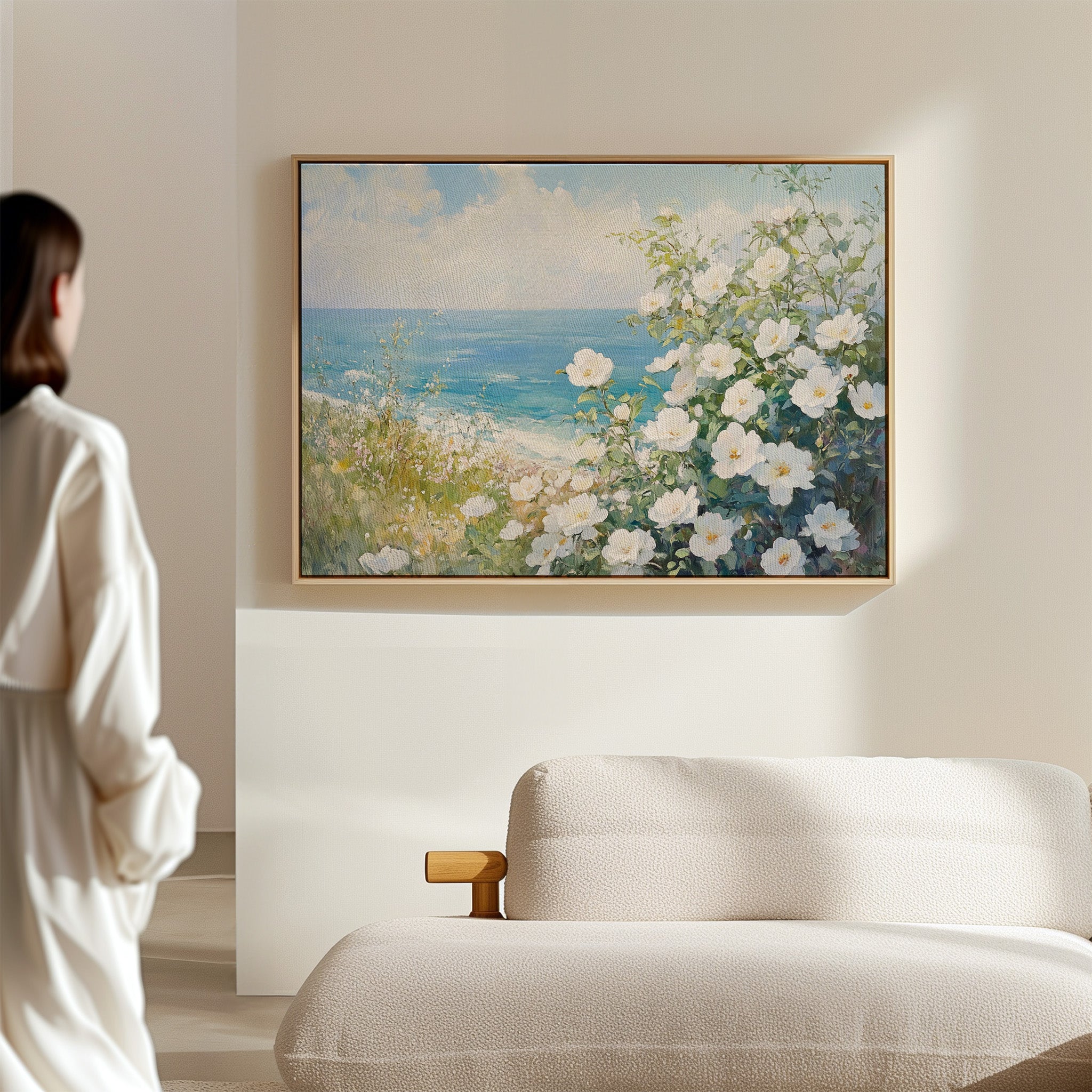 White roses cascade down a seaside cliff, their delicate petals catching the salt-kissed breeze. The scene captures a perfect summer morning where wild blooms meet endless azure waters. Impressionist brushstrokes blend the soft whites of beach roses with sage green foliage, while the cerulean ocean stretches to meet billowing clouds on the horizon. The composition creates a natural harmony between the structured beauty of the flowers and the wild freedom of the coastline. This piece brings a breath of fresh coastal air to bedrooms, living spaces, or any room seeking the gentle romance of a seaside garden.