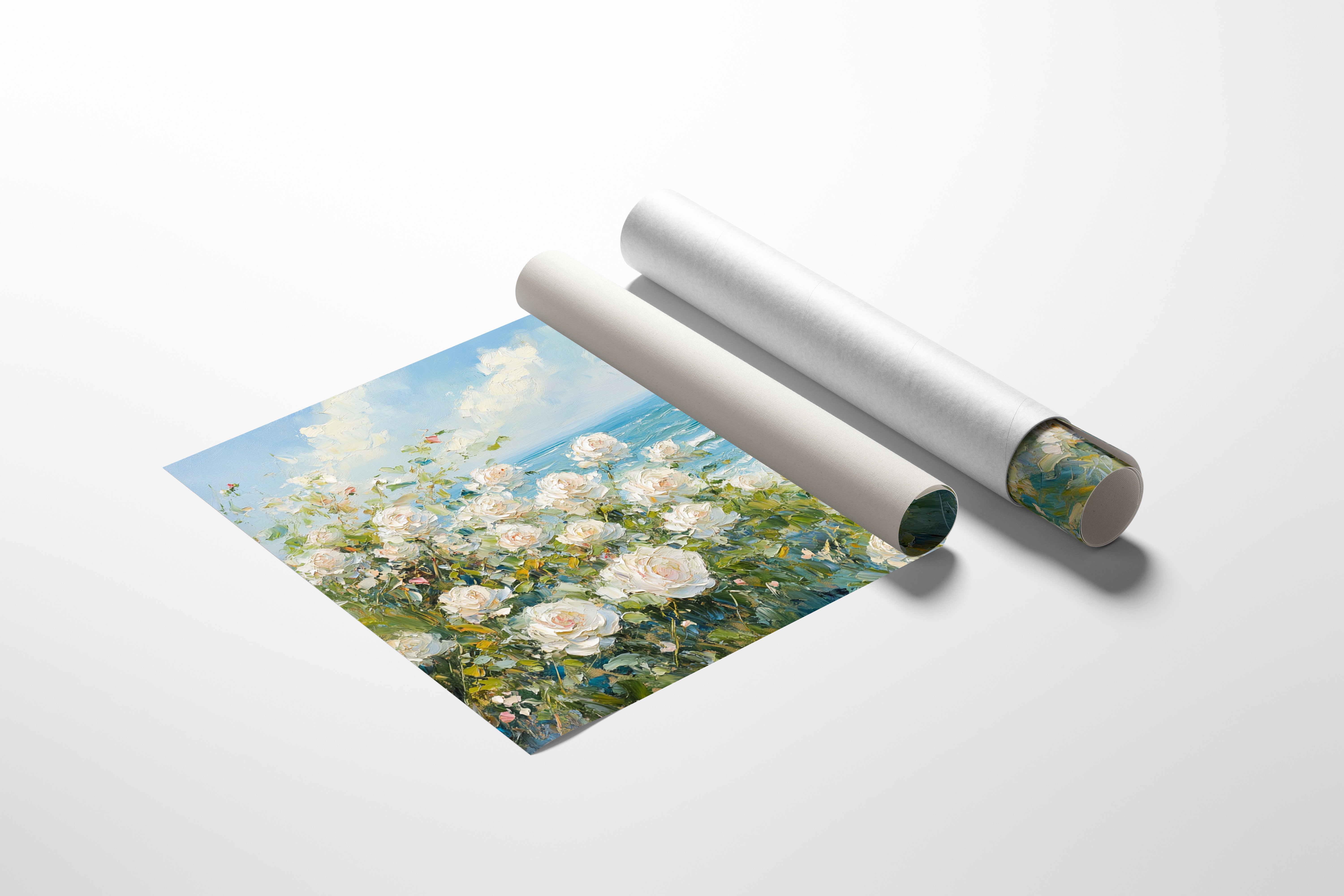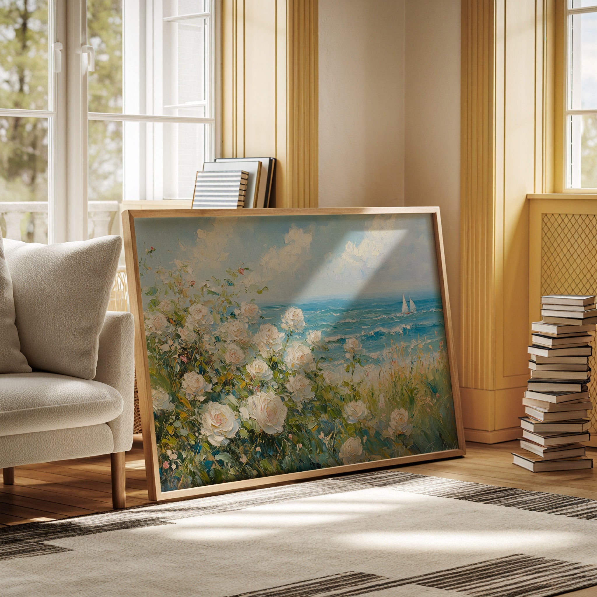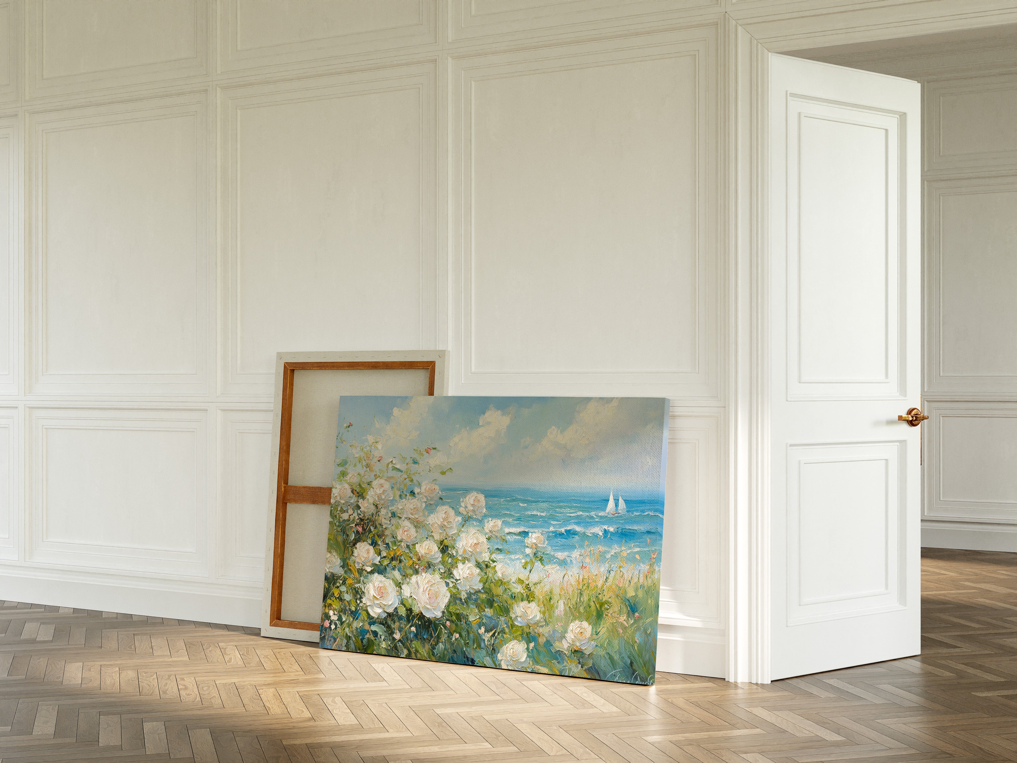 White roses dance along the coastal cliffs, their delicate petals catching the summer breeze as distant sails glide across turquoise waters. The thick, impasto brushstrokes create a textured garden where cream-colored blooms emerge from verdant foliage, their faces turned toward the azure horizon. Rolling waves meet a powder-blue sky dotted with cotton clouds, while two graceful sailboats navigate the endless expanse of ocean beyond the wild rose garden. Perfect for bringing a sense of seaside serenity to living spaces, this piece captures the essence of a perfect summer day where garden meets sea.