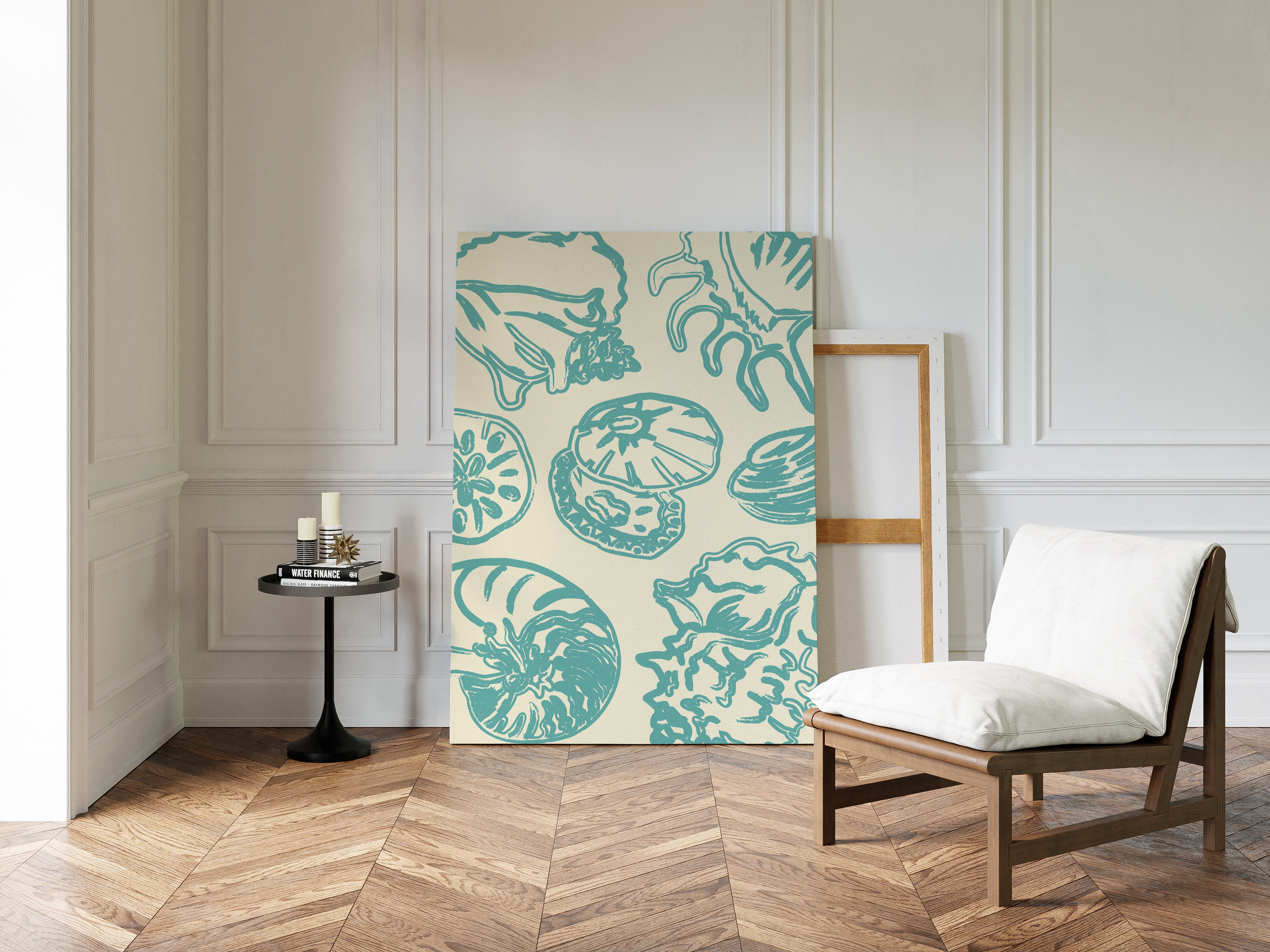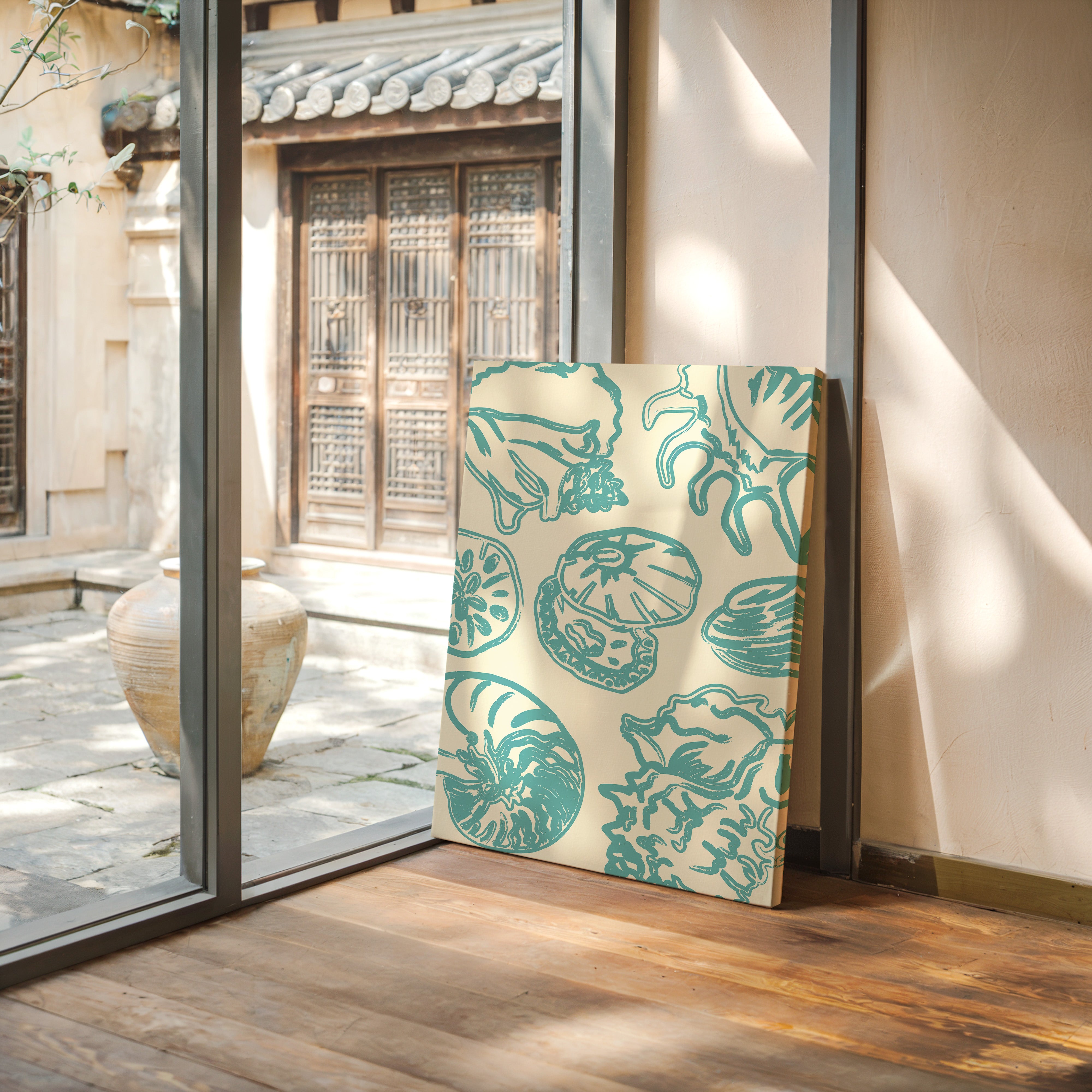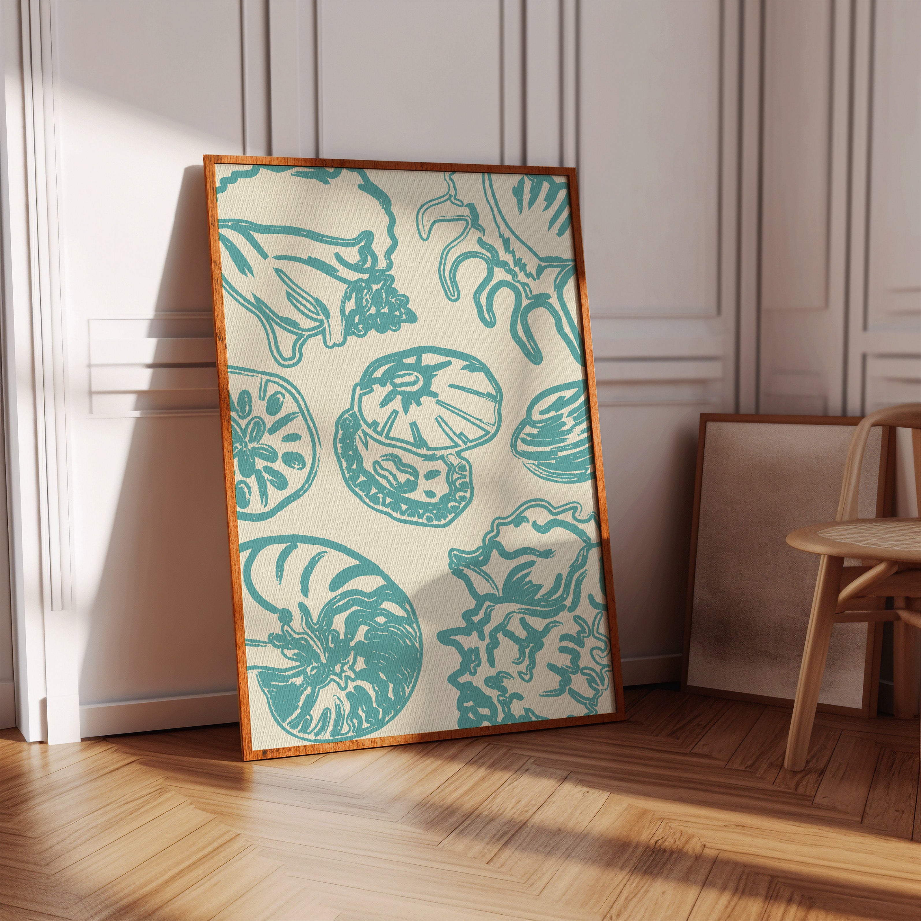 Turquoise brushstrokes dance across cream canvas, capturing the essence of sun-bleached shells and ocean memories. This contemporary coastal piece brings modern minimalism to traditional seaside motifs. The bold, flowing lines trace natural forms with confidence, while negative space creates rhythm and movement throughout the composition. Soft aqua tones against warm ivory evoke the gentle wash of tides on sandy shores. Perfect for bringing a sophisticated coastal energy to modern living spaces, especially in rooms that blend natural materials with clean lines.