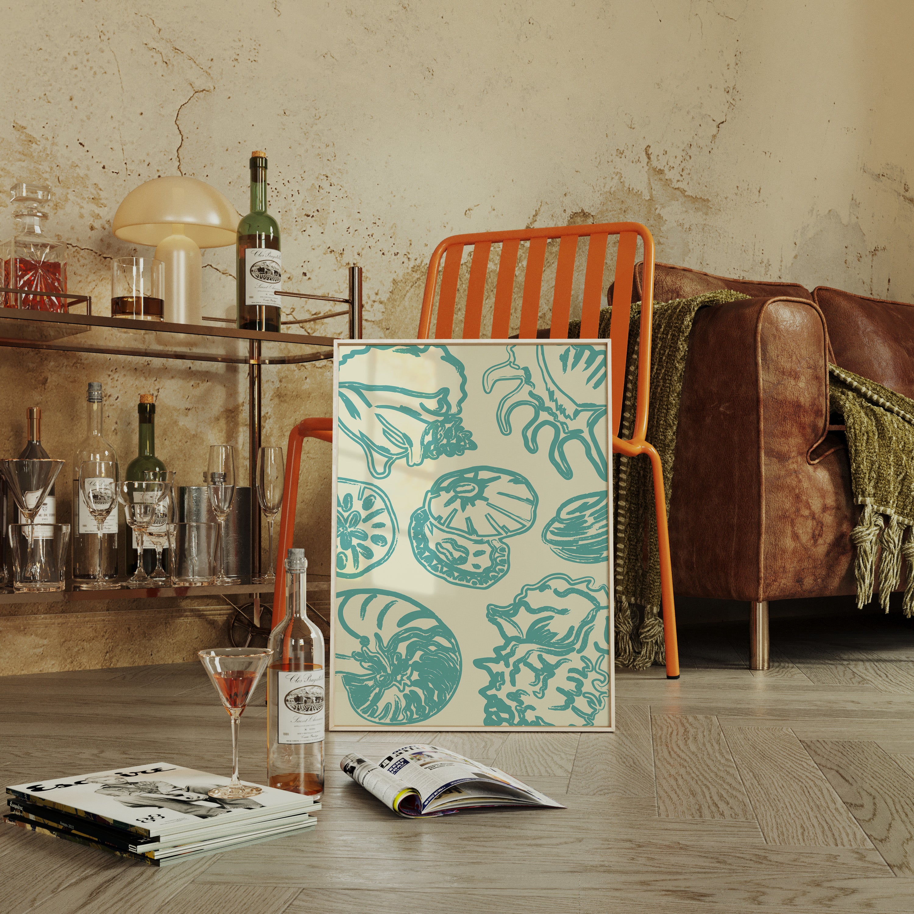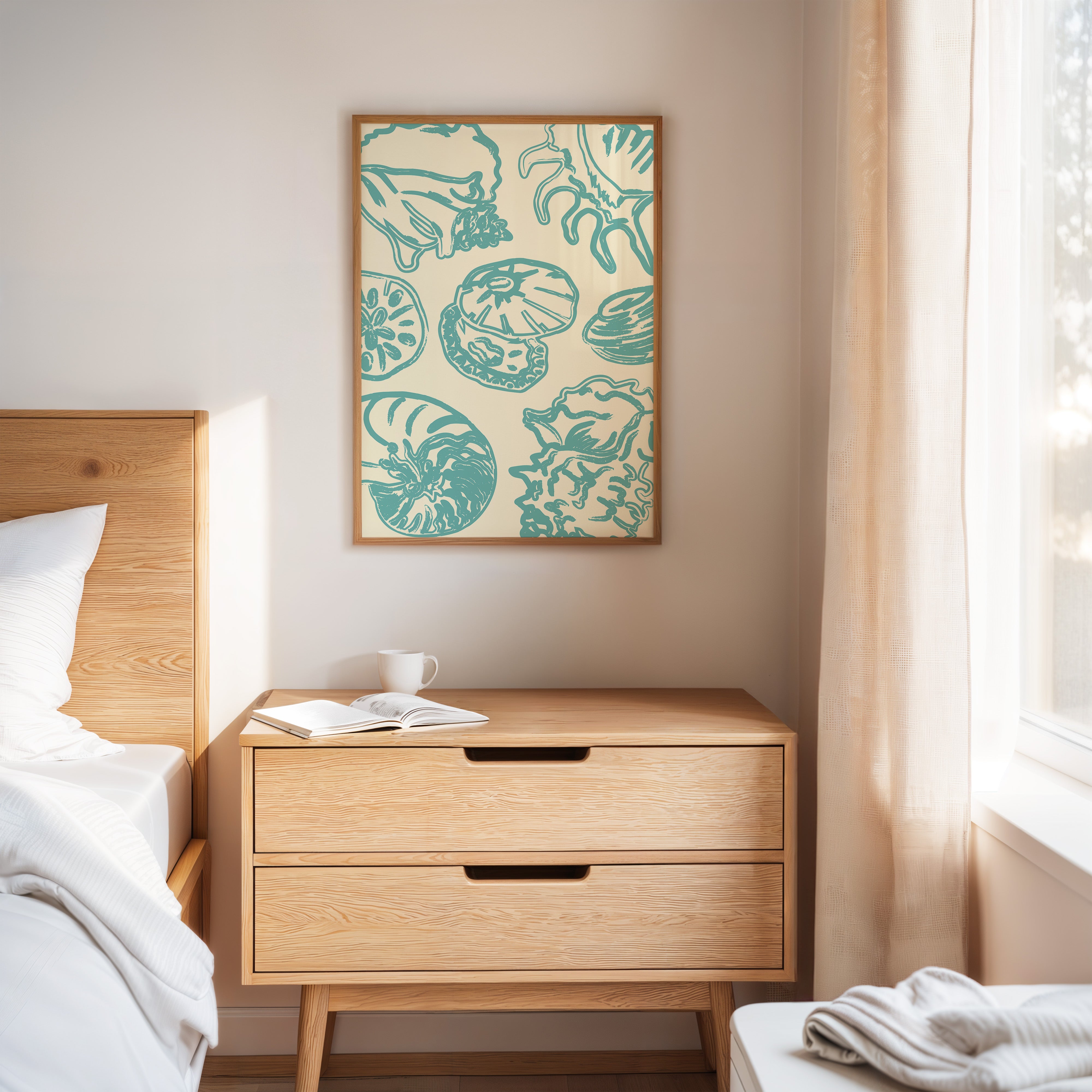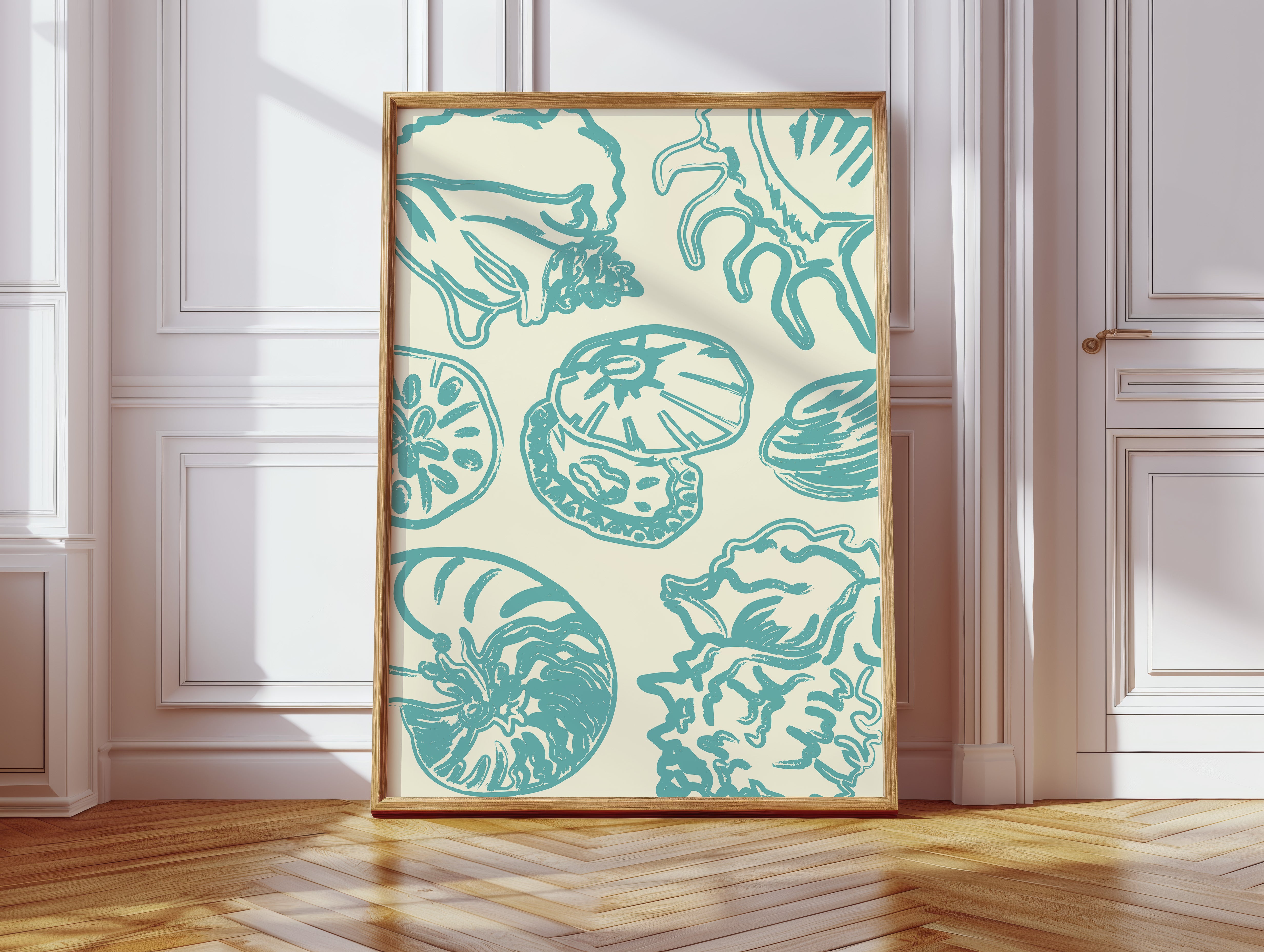 Turquoise brushstrokes dance across cream canvas, capturing the essence of sun-bleached shells and ocean memories. This contemporary coastal piece brings modern minimalism to traditional seaside motifs. The bold, flowing lines trace natural forms with confidence, while negative space creates rhythm and movement throughout the composition. Soft aqua tones against warm ivory evoke the gentle wash of tides on sandy shores. Perfect for bringing a sophisticated coastal energy to modern living spaces, especially in rooms that blend natural materials with clean lines.