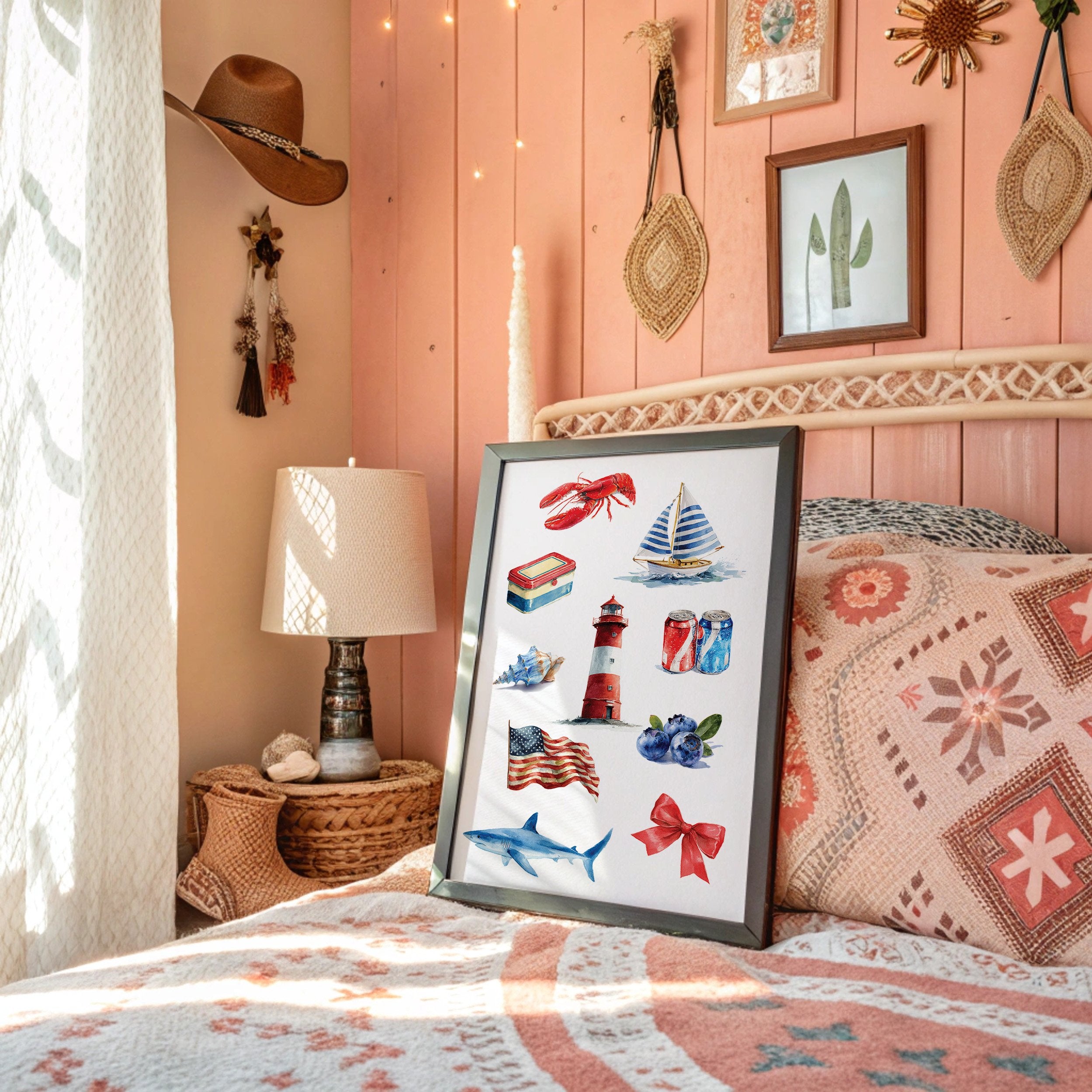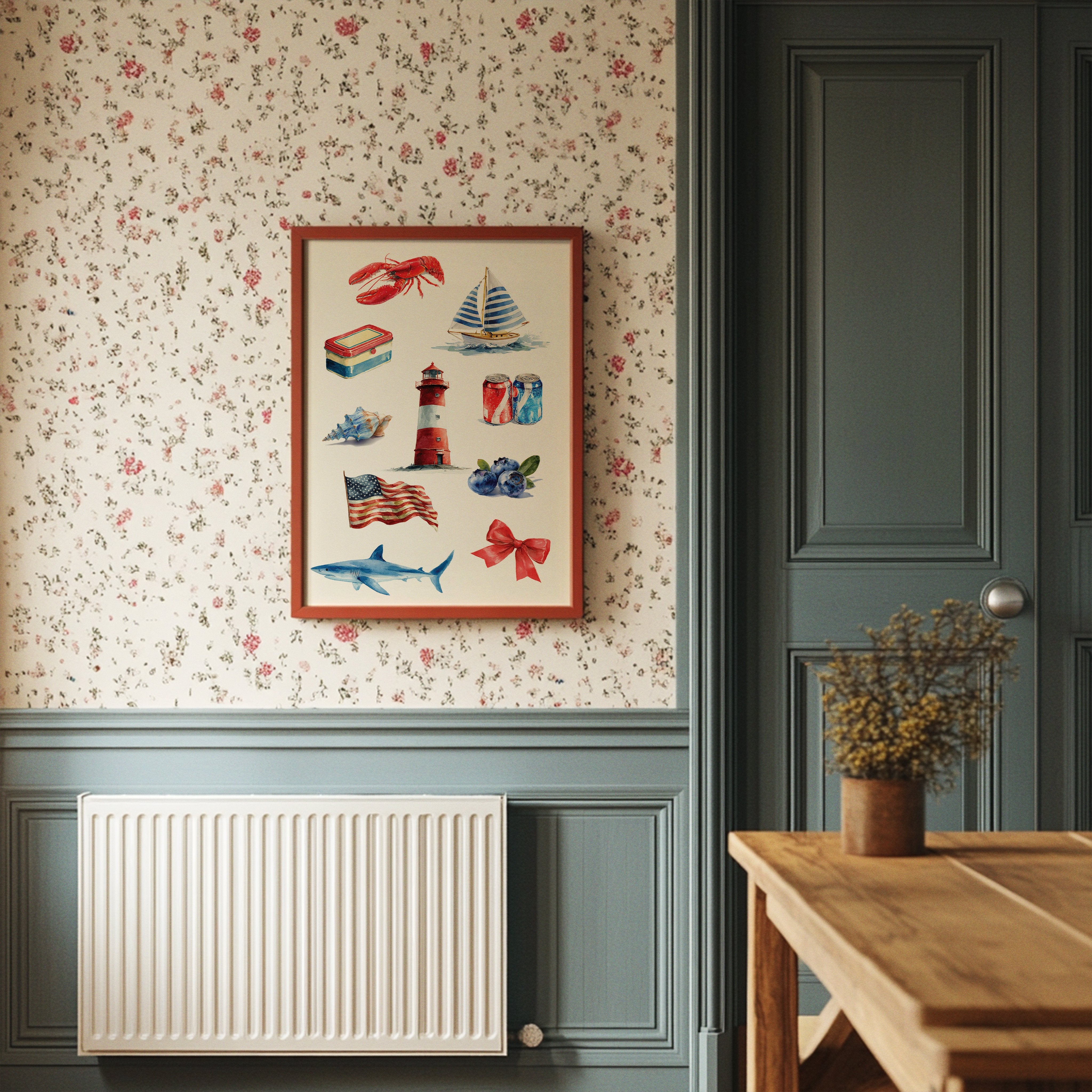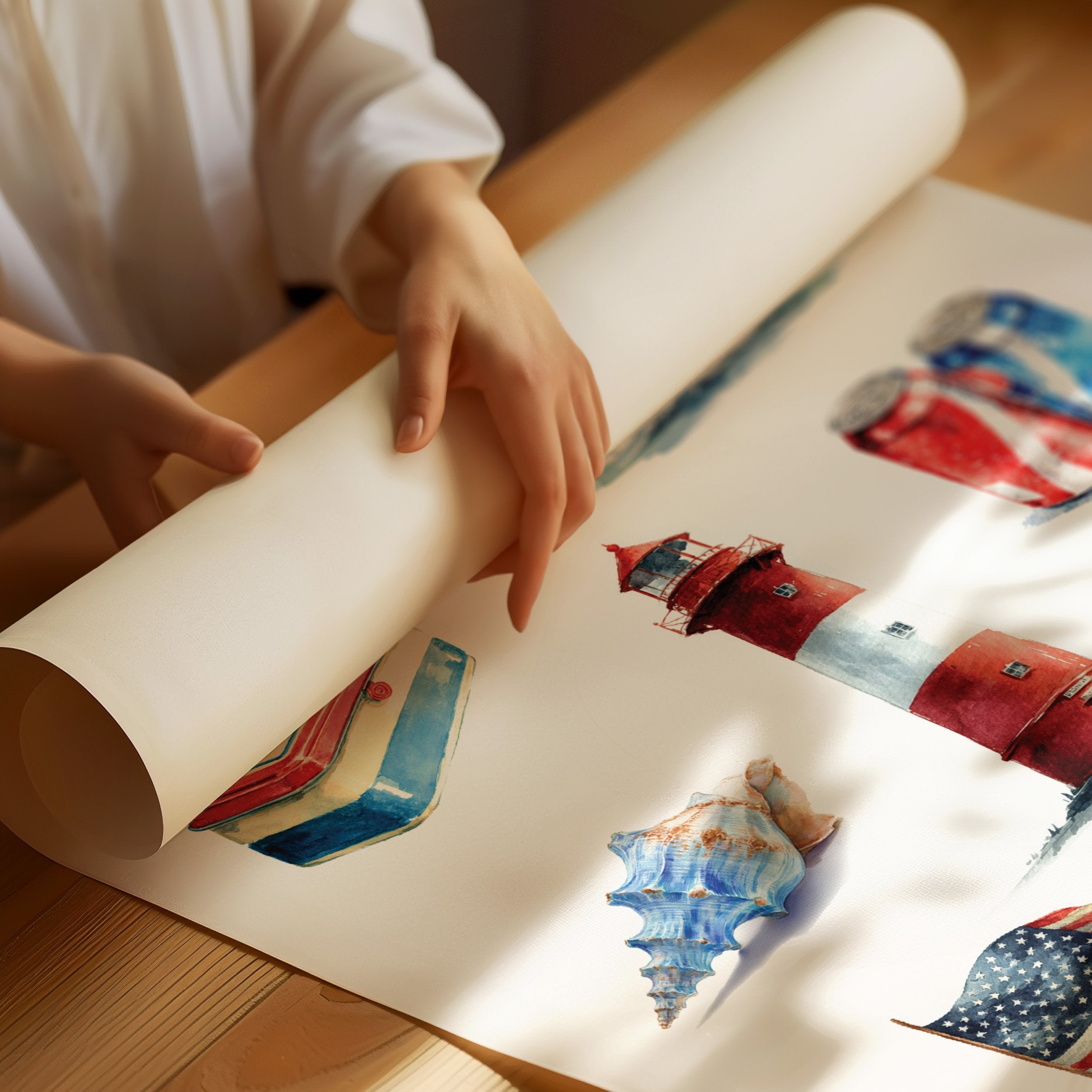 Sunlight catches on the weathered red and white stripes of a lighthouse standing sentinel against an imagined horizon. This watercolor collection captures the essence of seaside Americana, where sailboats with blue-striped sails drift alongside vibrant lobsters and delicate shells. The careful rendering of each coastal element from the vintage tin box to the fresh blue berries evokes memories of salt-kissed holidays and barefoot afternoons.
