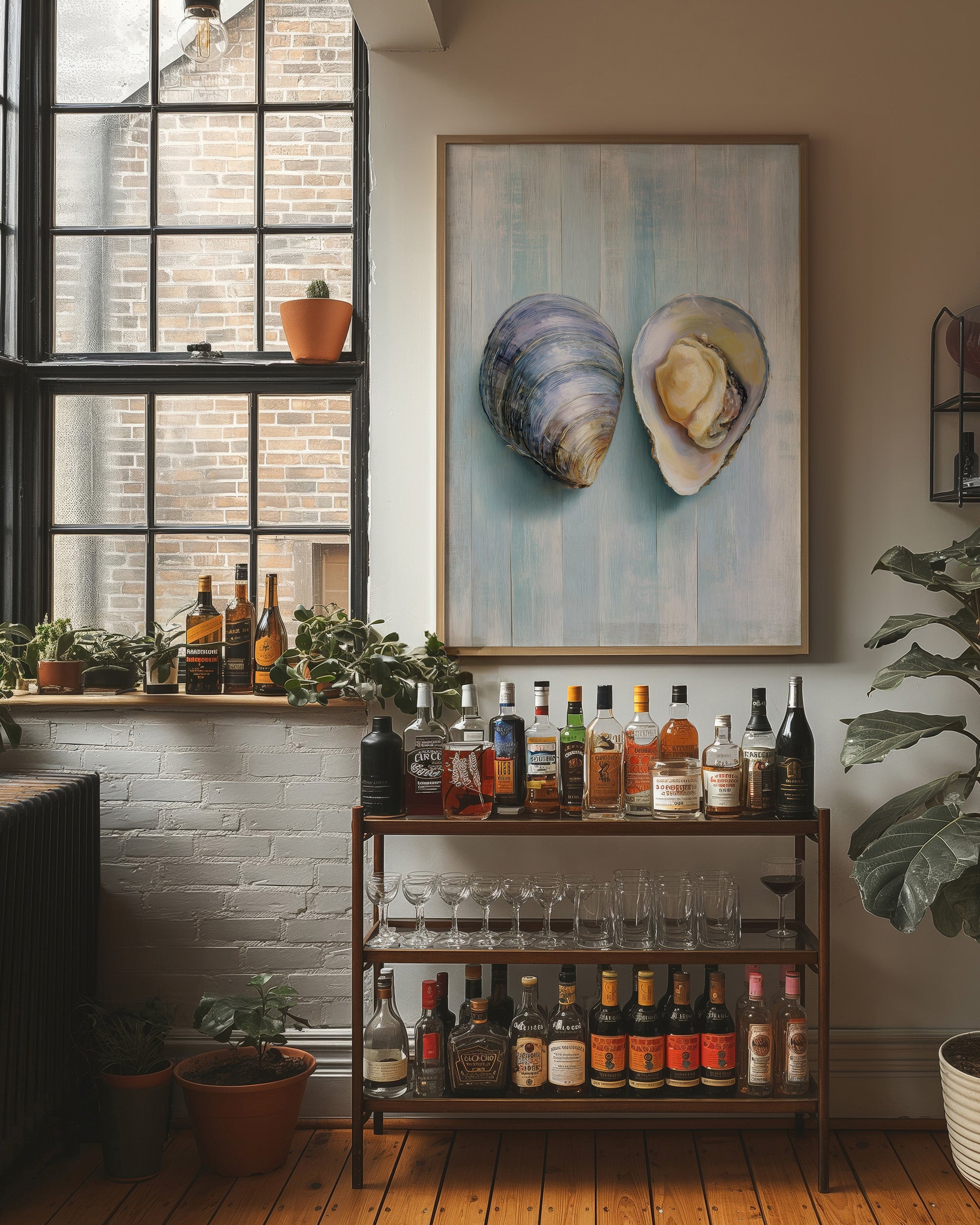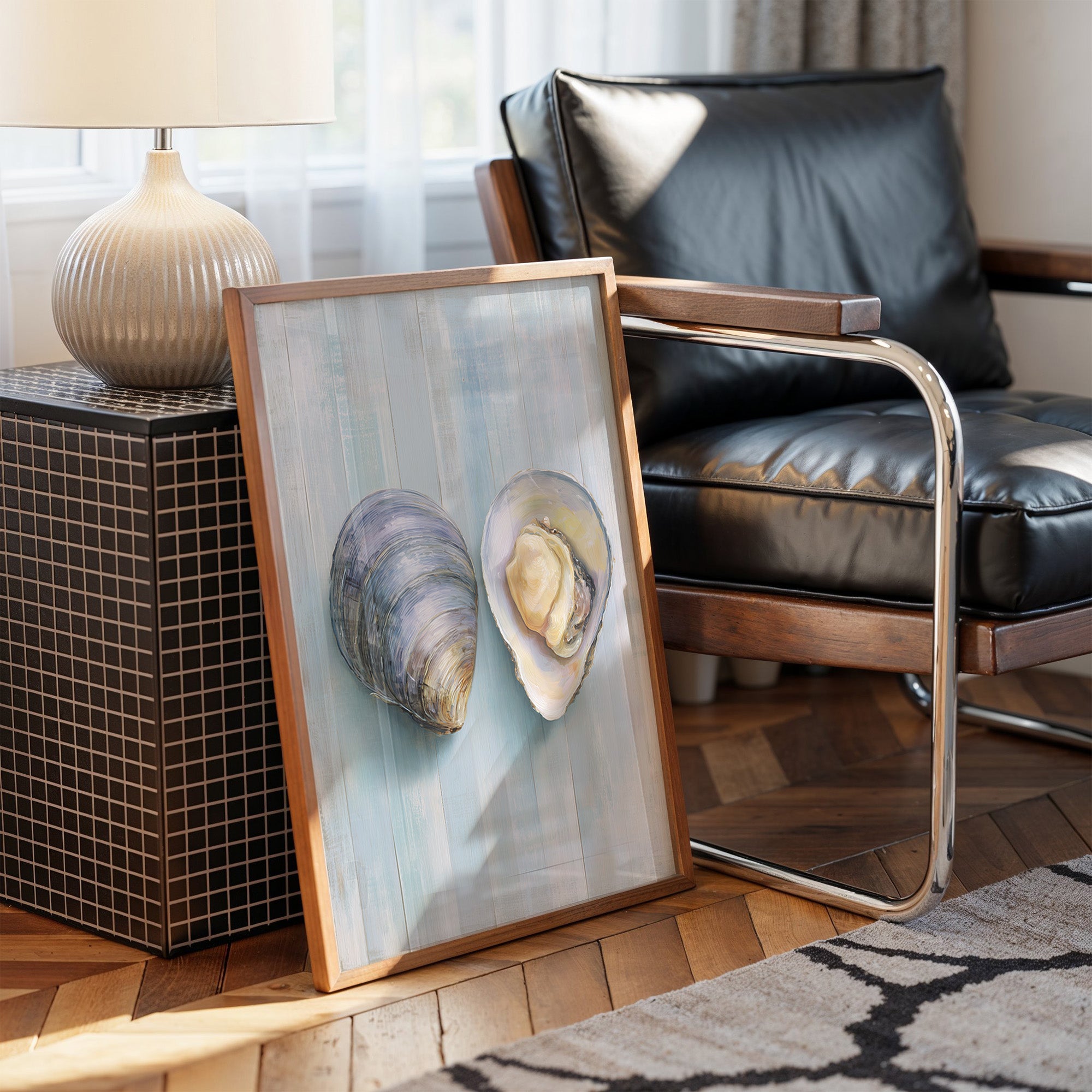 A delicate painting of two oyster shells against its wooden pale blue background with subtle vertical striations, the painting captures the natural elegance of these oceanic specimens. The unfinished edges of the canvas and visible emphasizing the transition between creation and presentation.