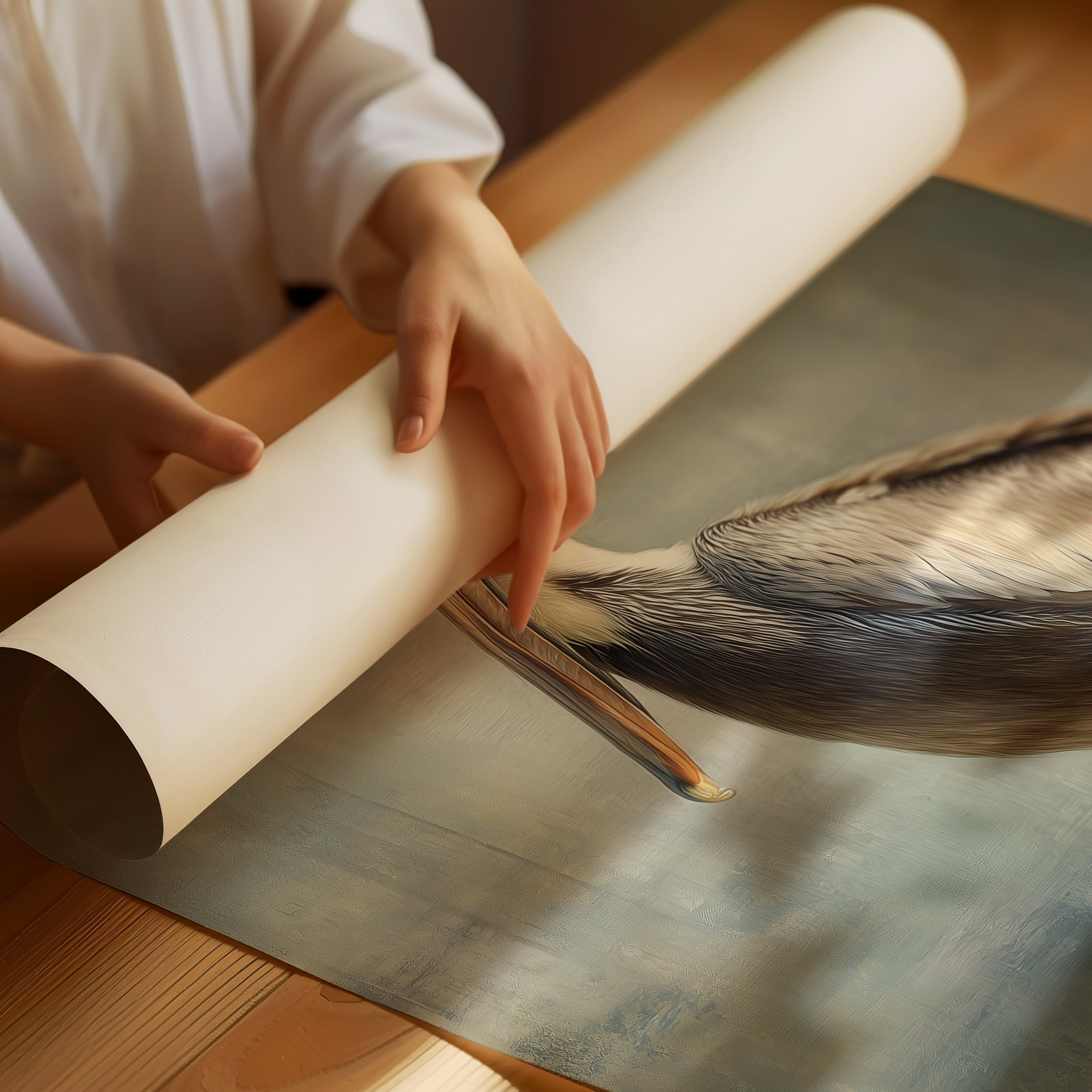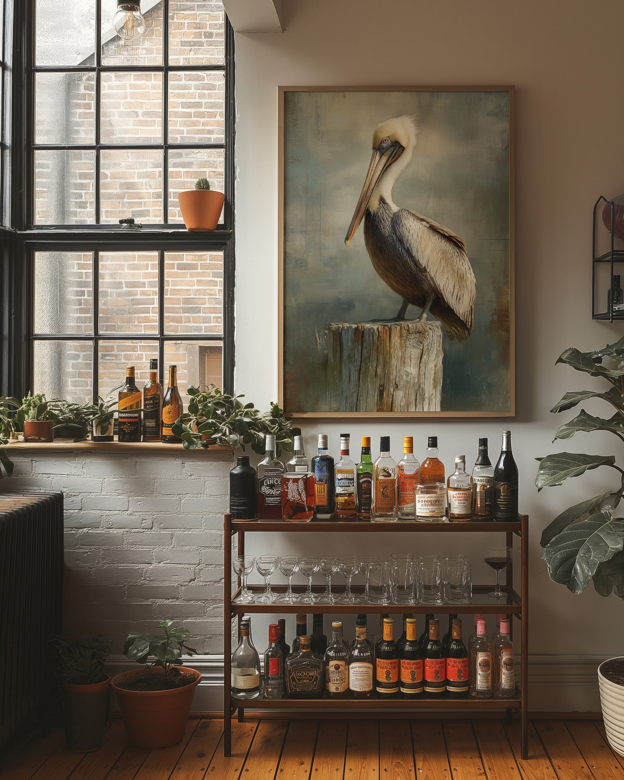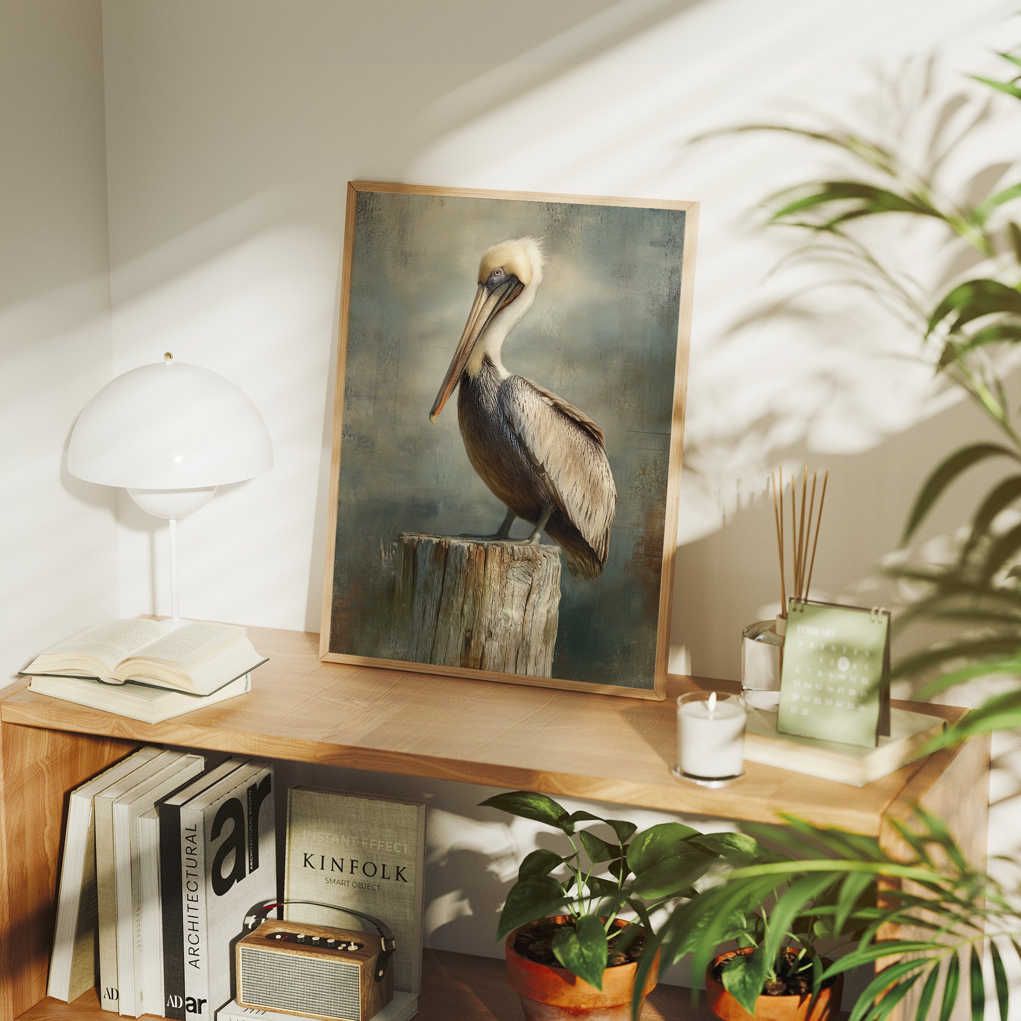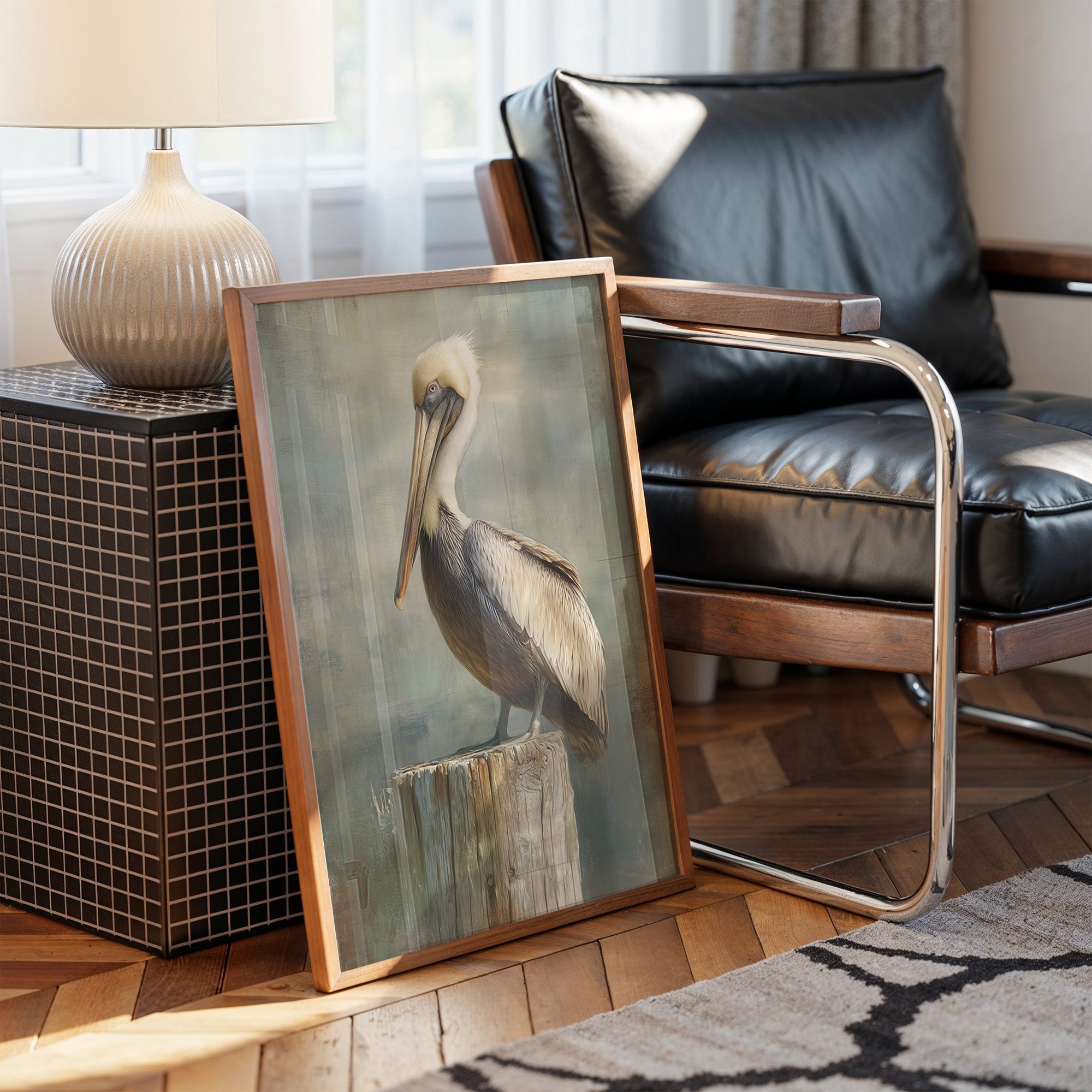 Sunlight filters across the scene, highlighting the quiet dignity of a pelican poised on a worn wooden post. The soft sage background creates a misty coastal atmosphere, enhancing the bird's cream-colored plumage and thoughtful stance. This portrait captures both the tranquility and watchful nature of shoreline life, with delicate brushwork revealing each textured feather against the weathered dock. Perfect for adding a touch of serene coastal charm to a study, living room, or any space that celebrates natural elegance.