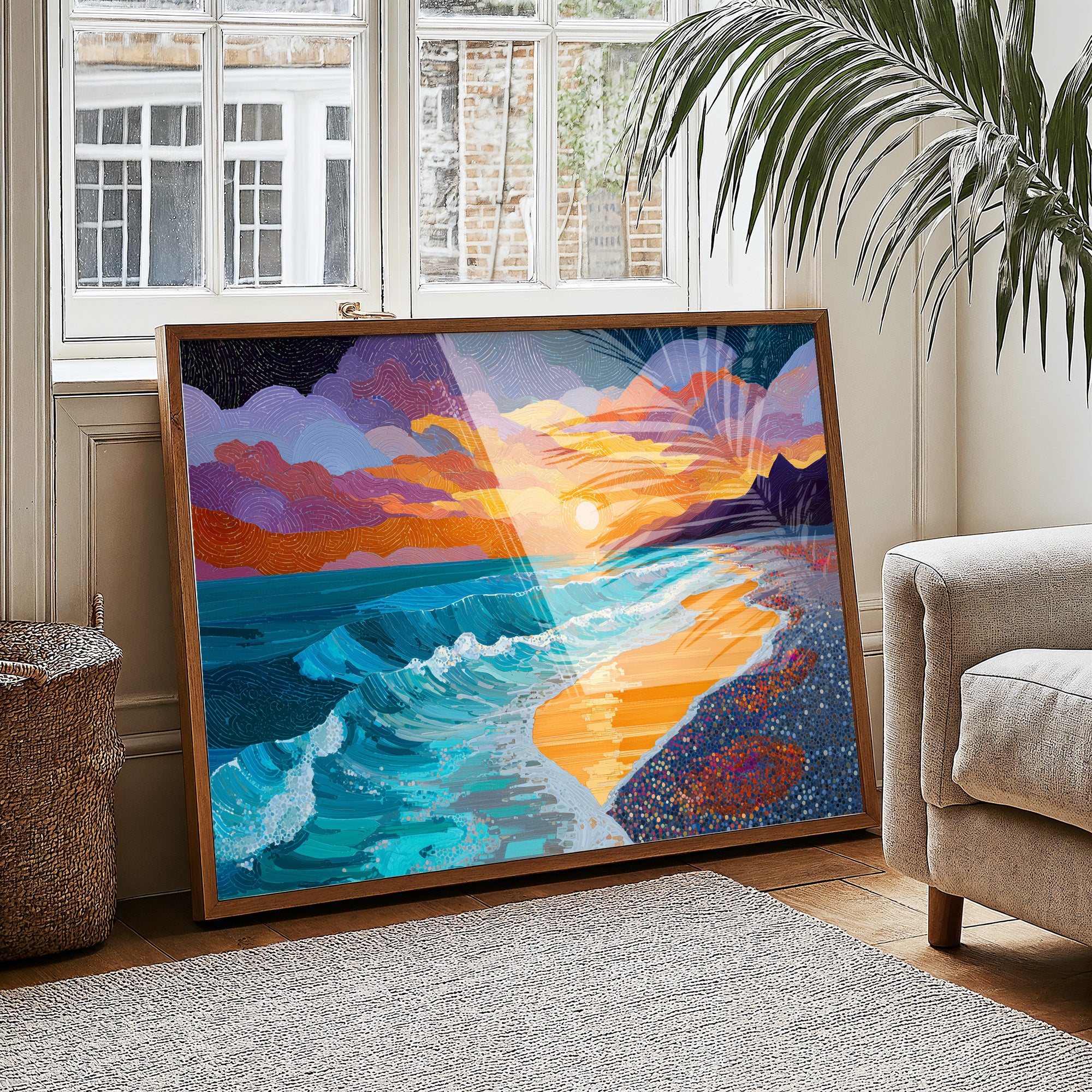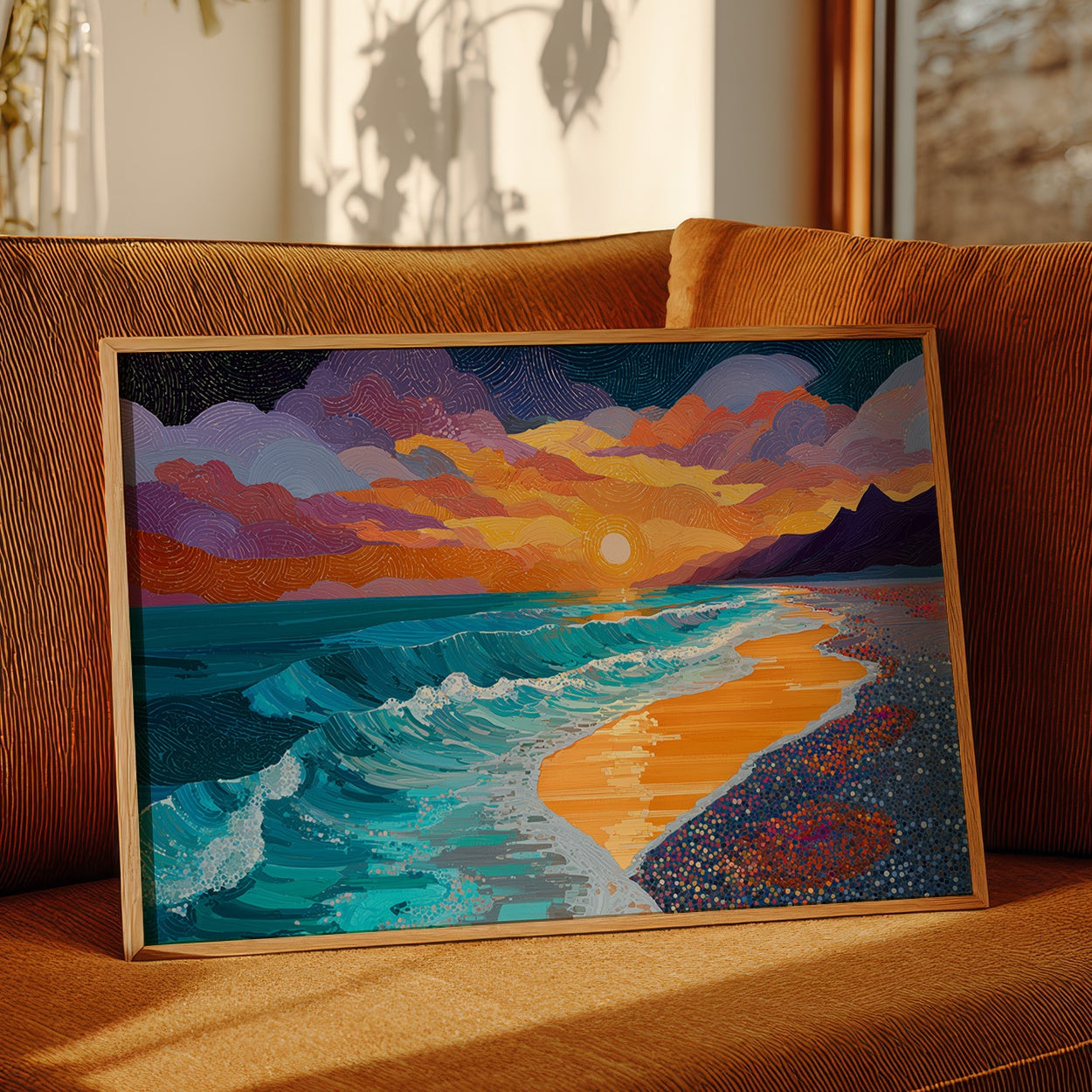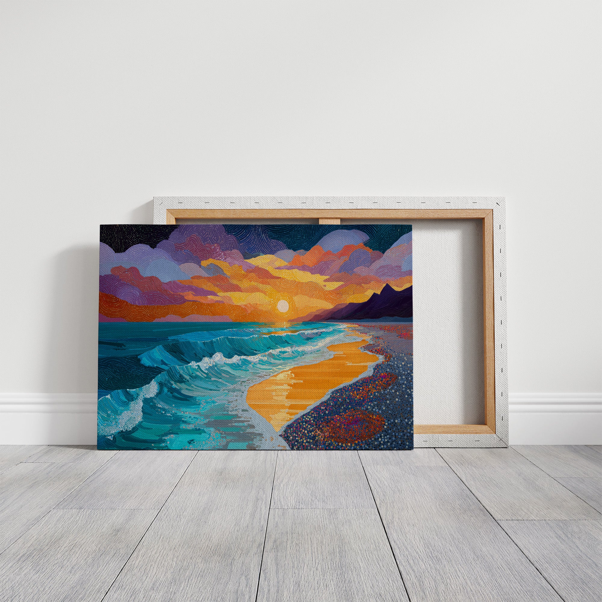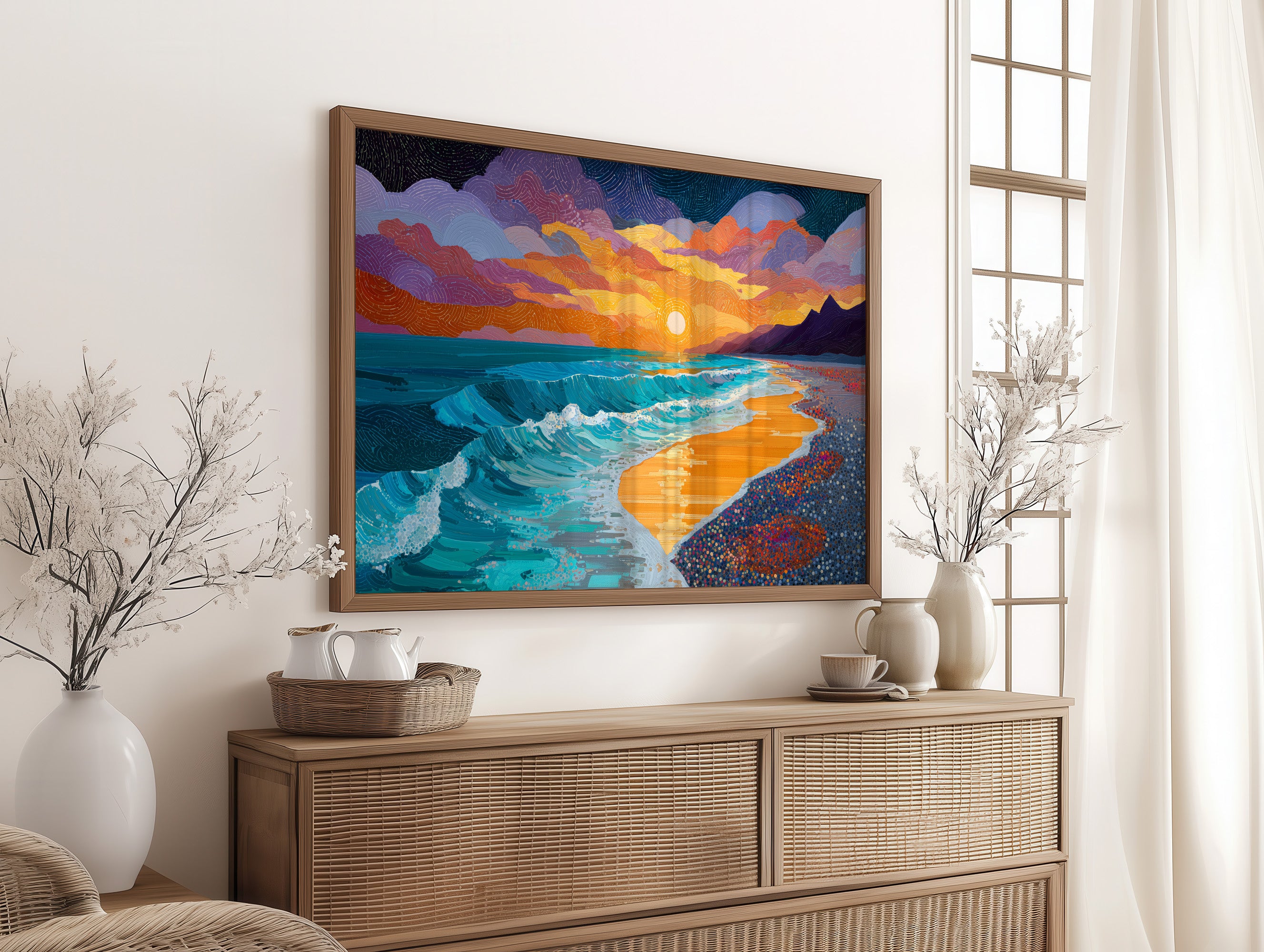 Turquoise waves crash against a golden shore where wildflowers dance in vibrant patches of purple and red. The sky erupts in a spectacular display of orange and lavender clouds, wrapping around mountain silhouettes as the sun hangs like a brilliant pearl above the horizon. Rich textures and bold brushstrokes bring movement to the seascape, creating a dynamic interplay between the ocean's power and nature's delicate beauty. This statement piece brings the drama and serenity of a coastal sunset into your space, perfect for creating a focal point in a living room or master bedroom where its vivid colors can inspire and energize.