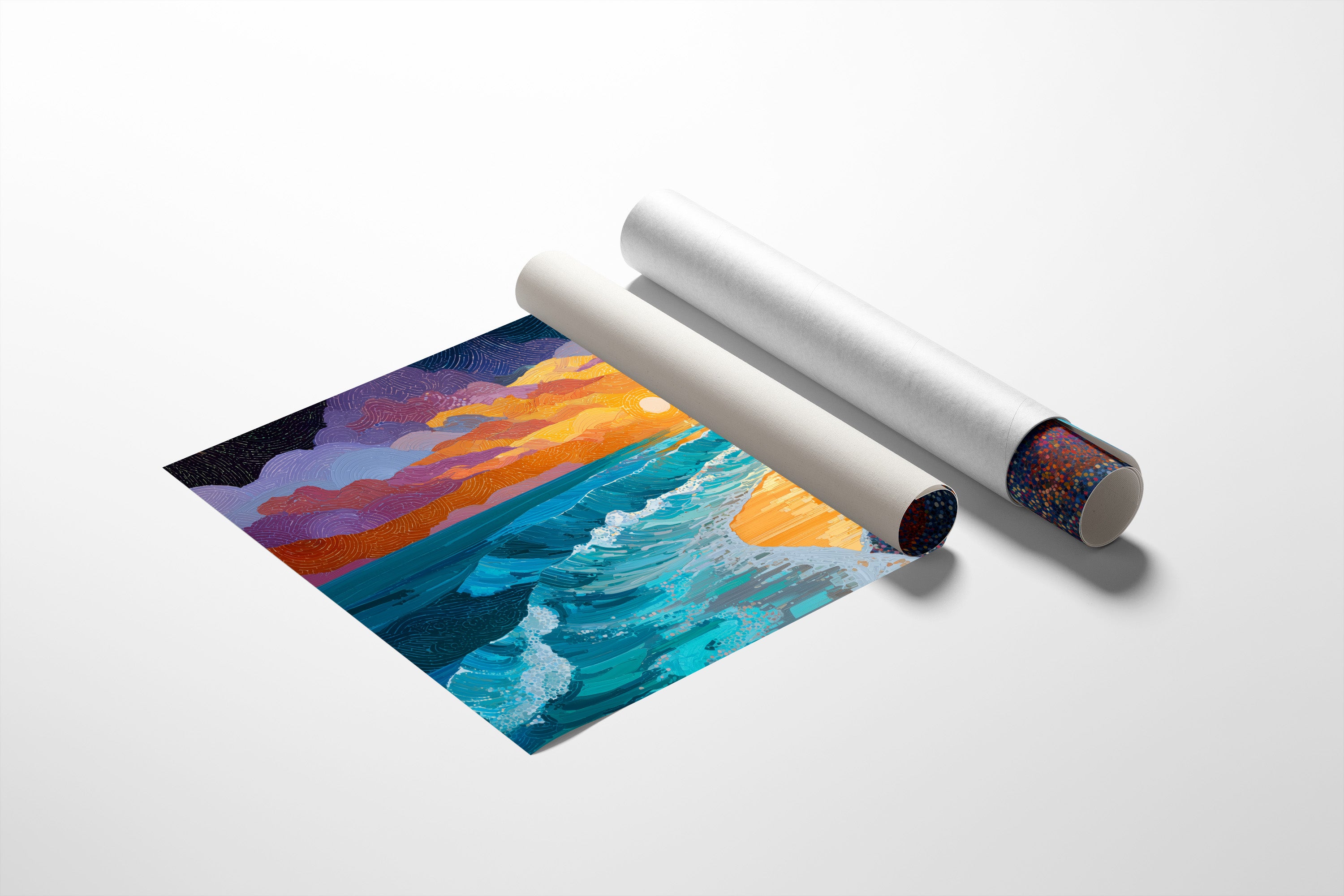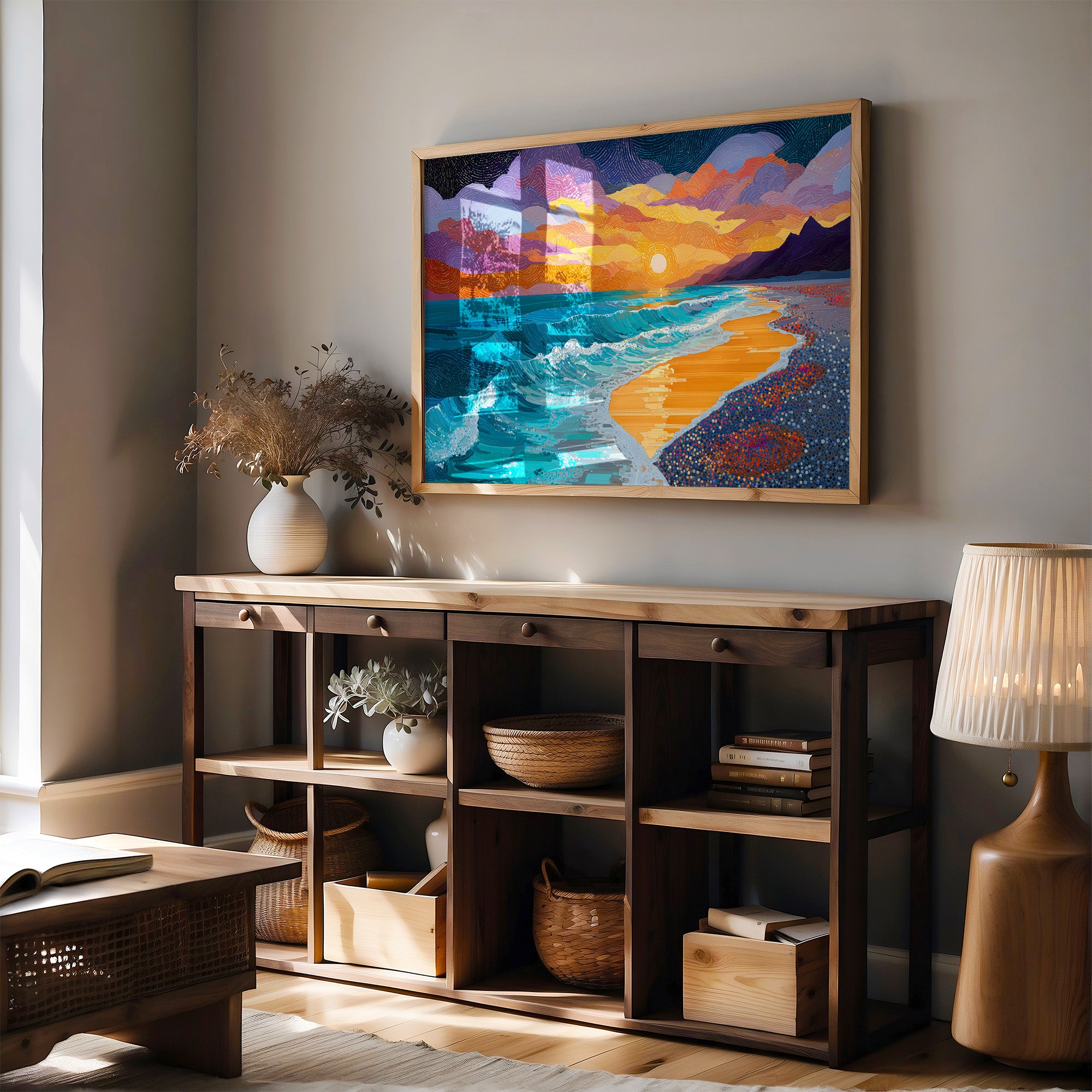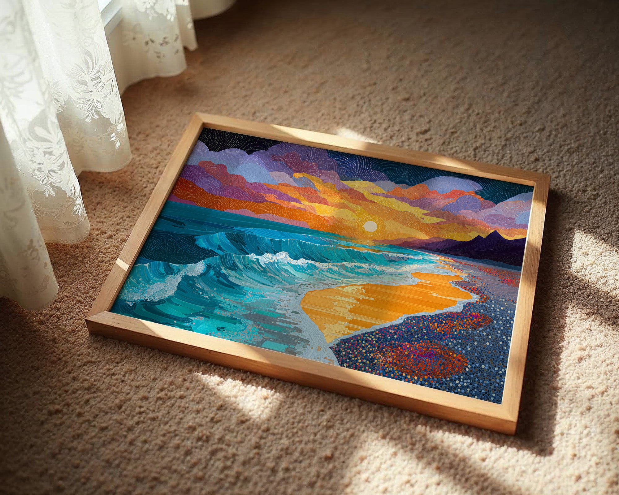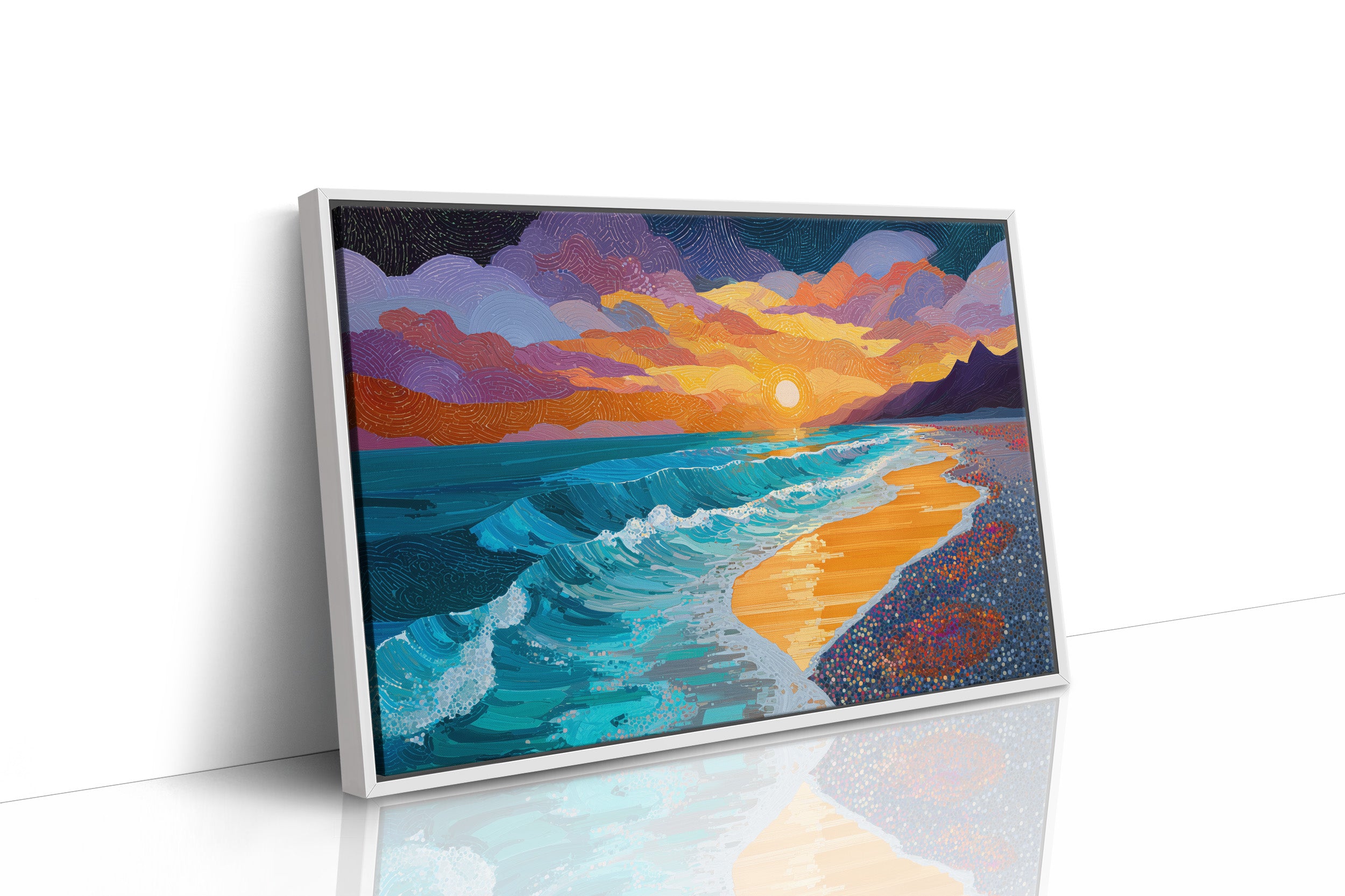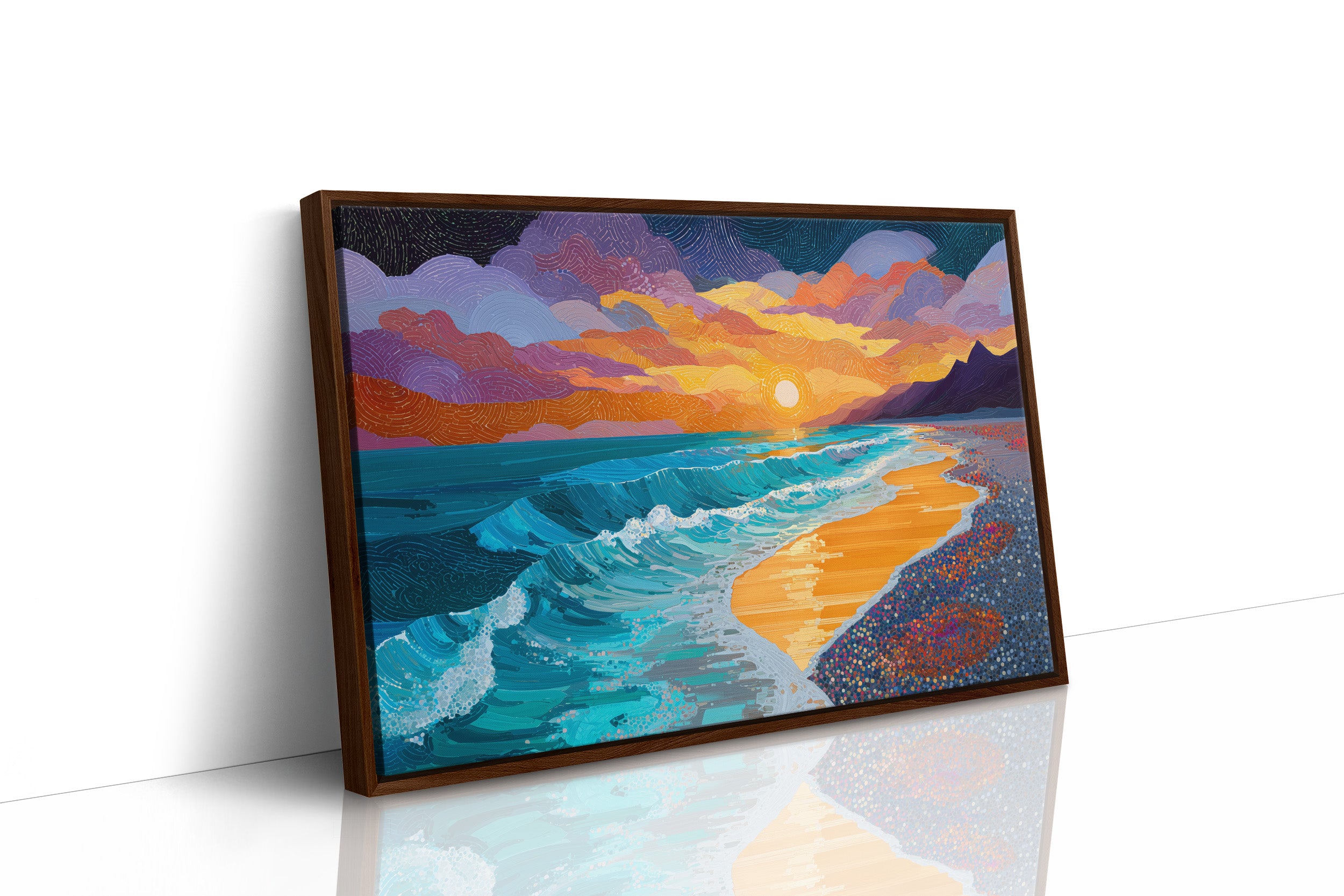 Turquoise waves crash against a golden shore where wildflowers dance in vibrant patches of purple and red. The sky erupts in a spectacular display of orange and lavender clouds, wrapping around mountain silhouettes as the sun hangs like a brilliant pearl above the horizon. Rich textures and bold brushstrokes bring movement to the seascape, creating a dynamic interplay between the ocean's power and nature's delicate beauty. This statement piece brings the drama and serenity of a coastal sunset into your space, perfect for creating a focal point in a living room or master bedroom where its vivid colors can inspire and energize.