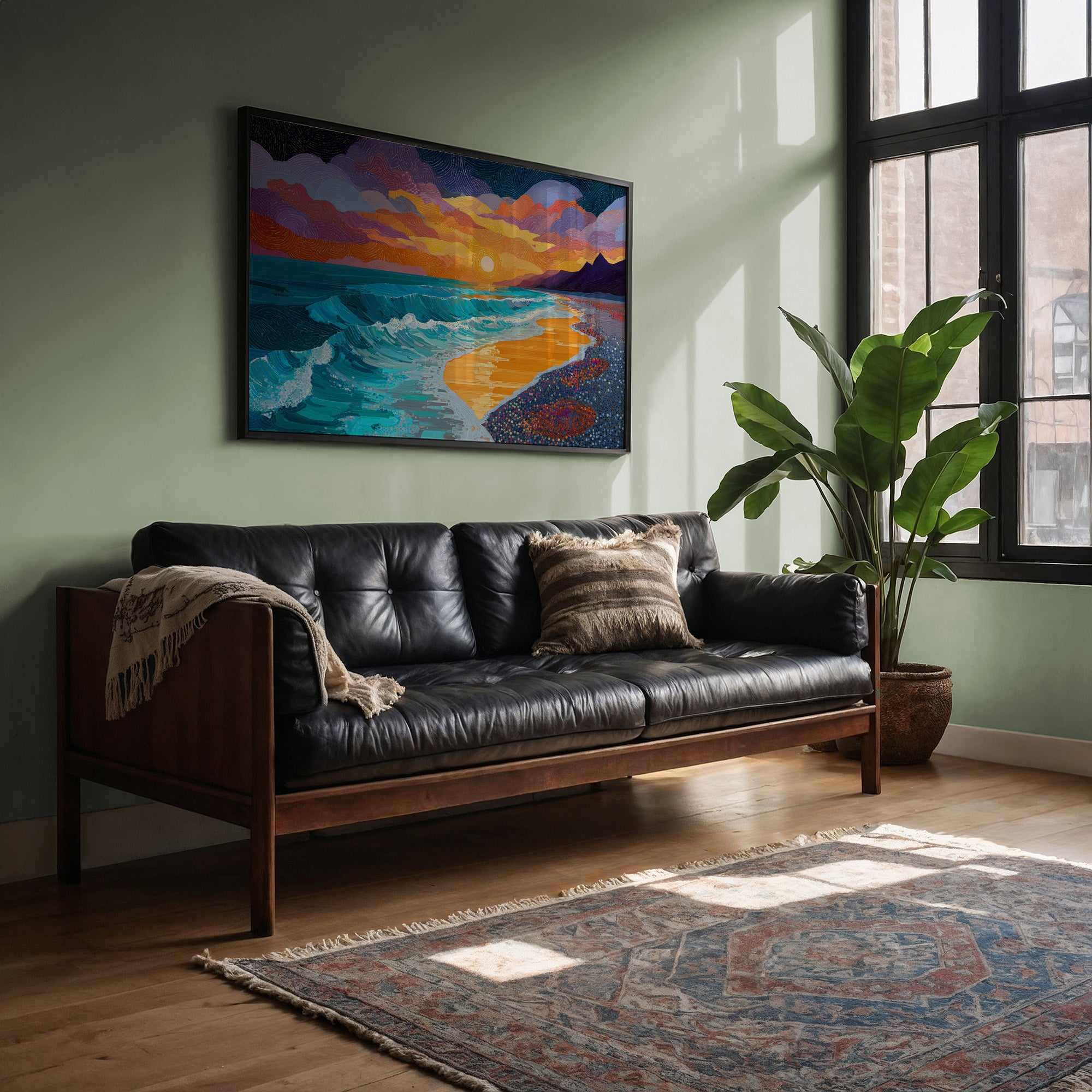 Your artwork should take up 60-75% of wall space above furniture. For standard sofas, choose 24"x36" or larger. When in doubt, go slightly bigger.