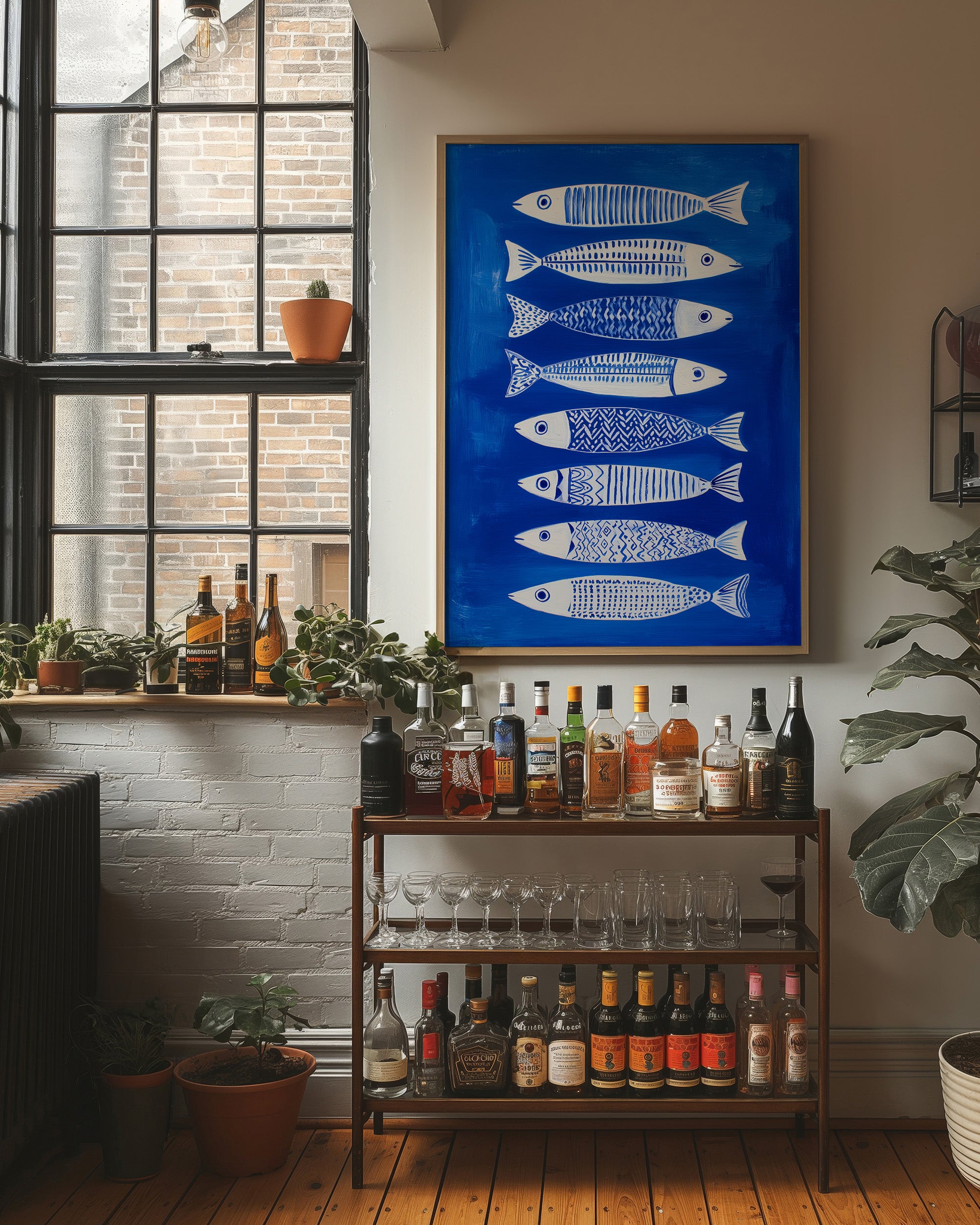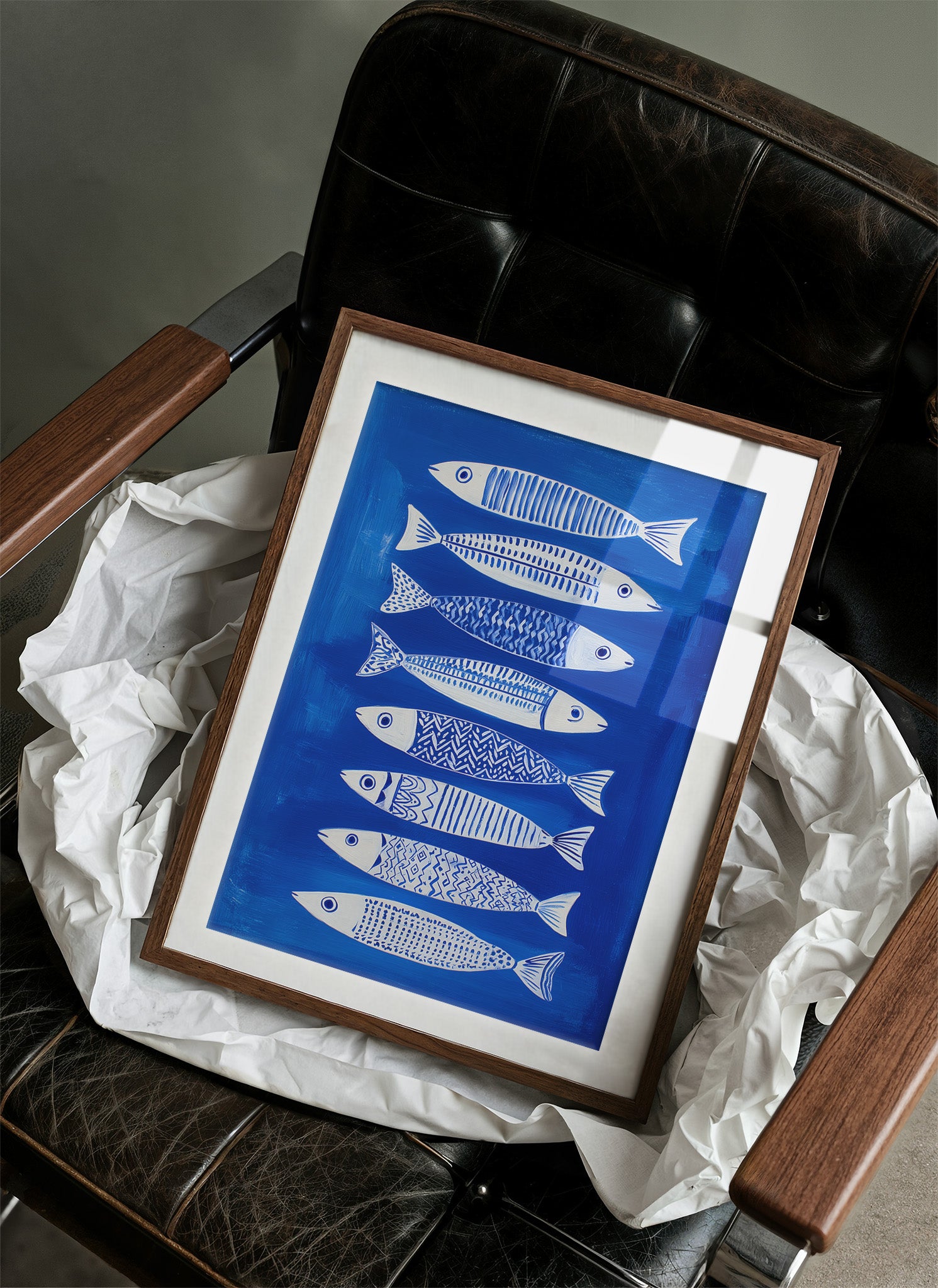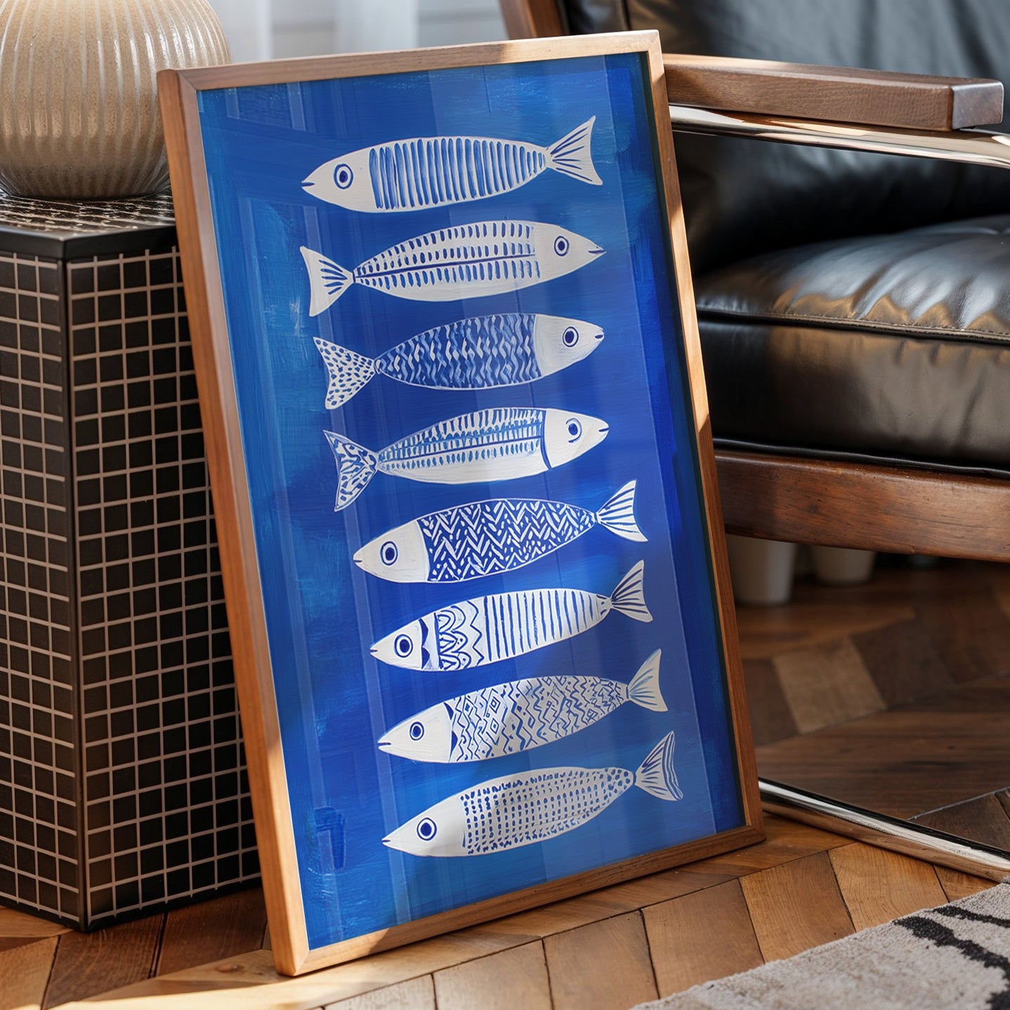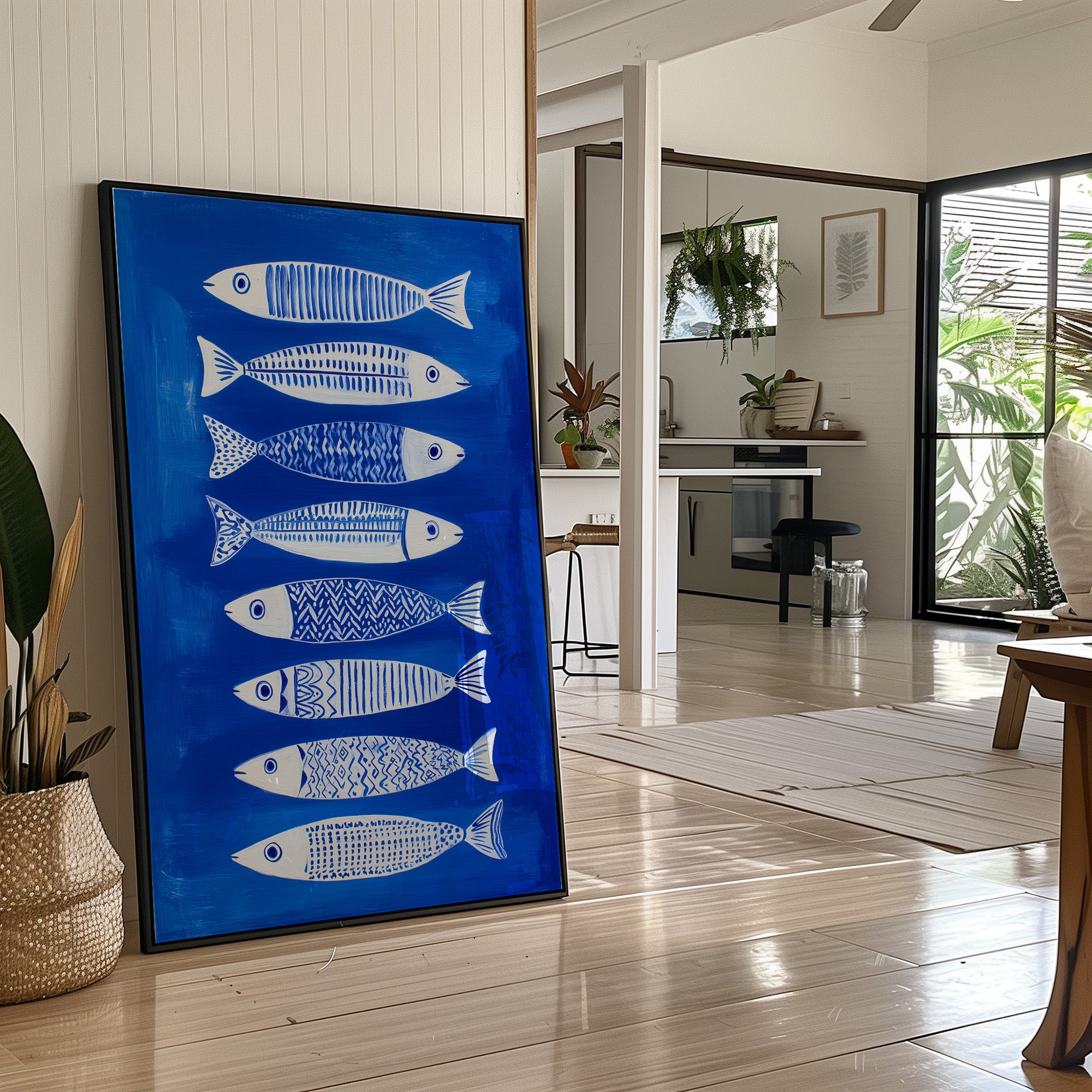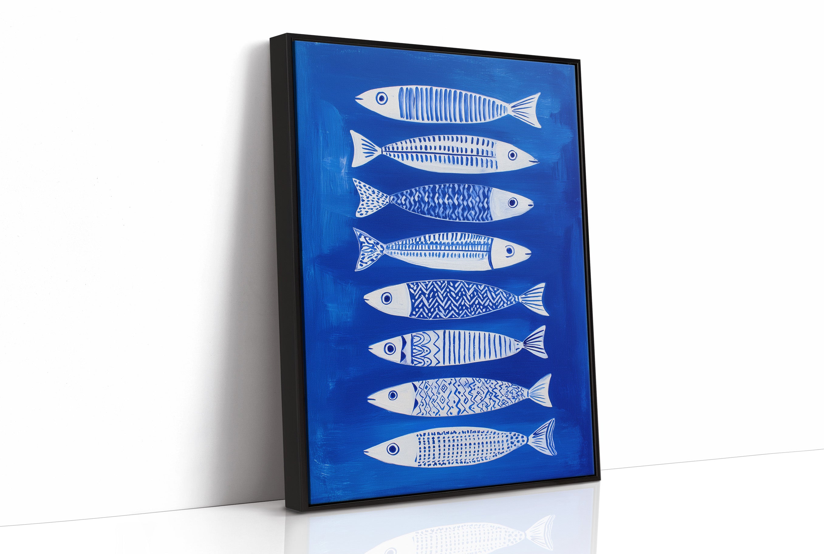 A striking contemporary artwork featuring eight stylized white fish arranged vertically against a vibrant cobalt blue background. Each fish displays unique patterning from geometric scales to simple stripes and crosshatches creating visual rhythm through repetition.