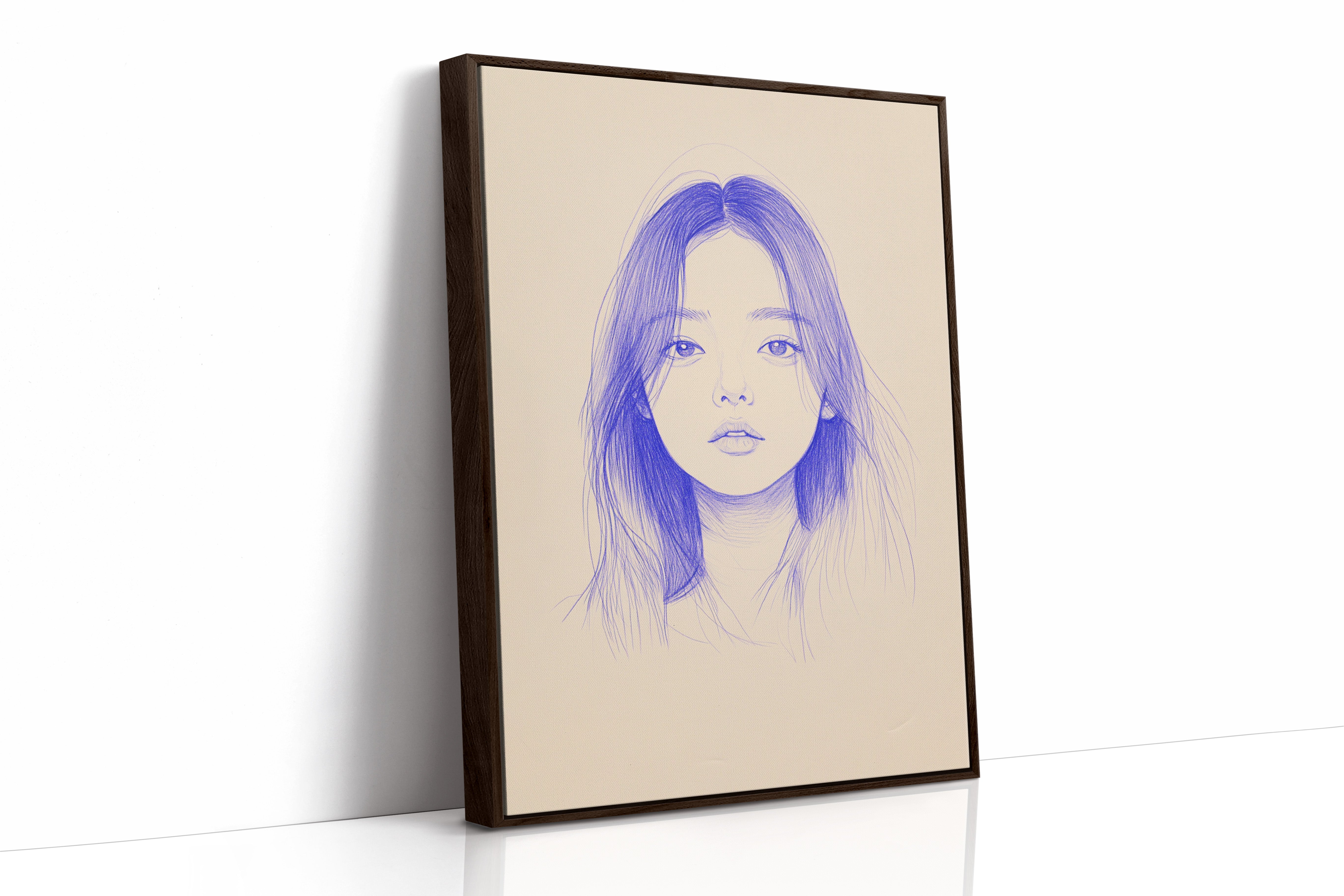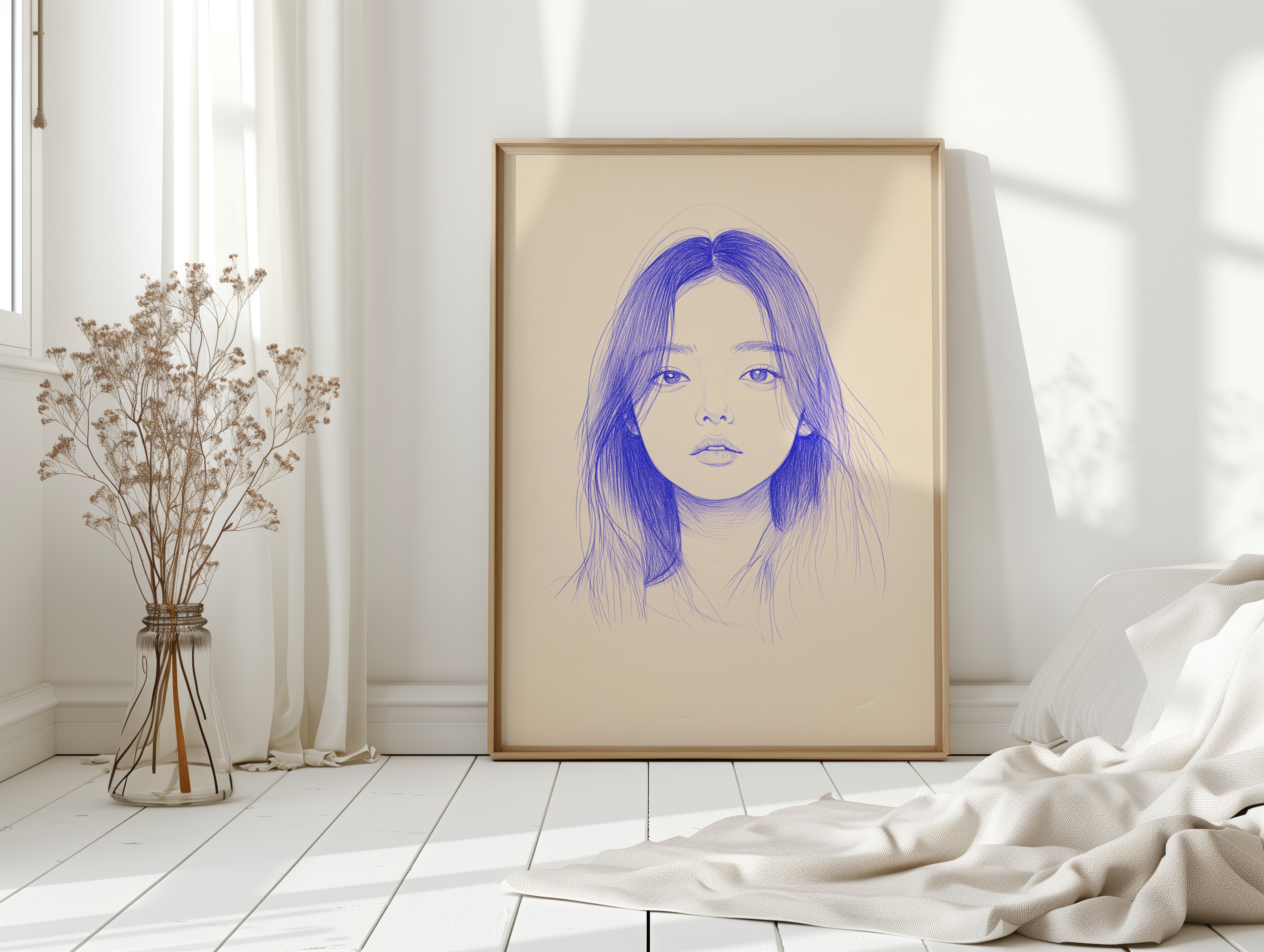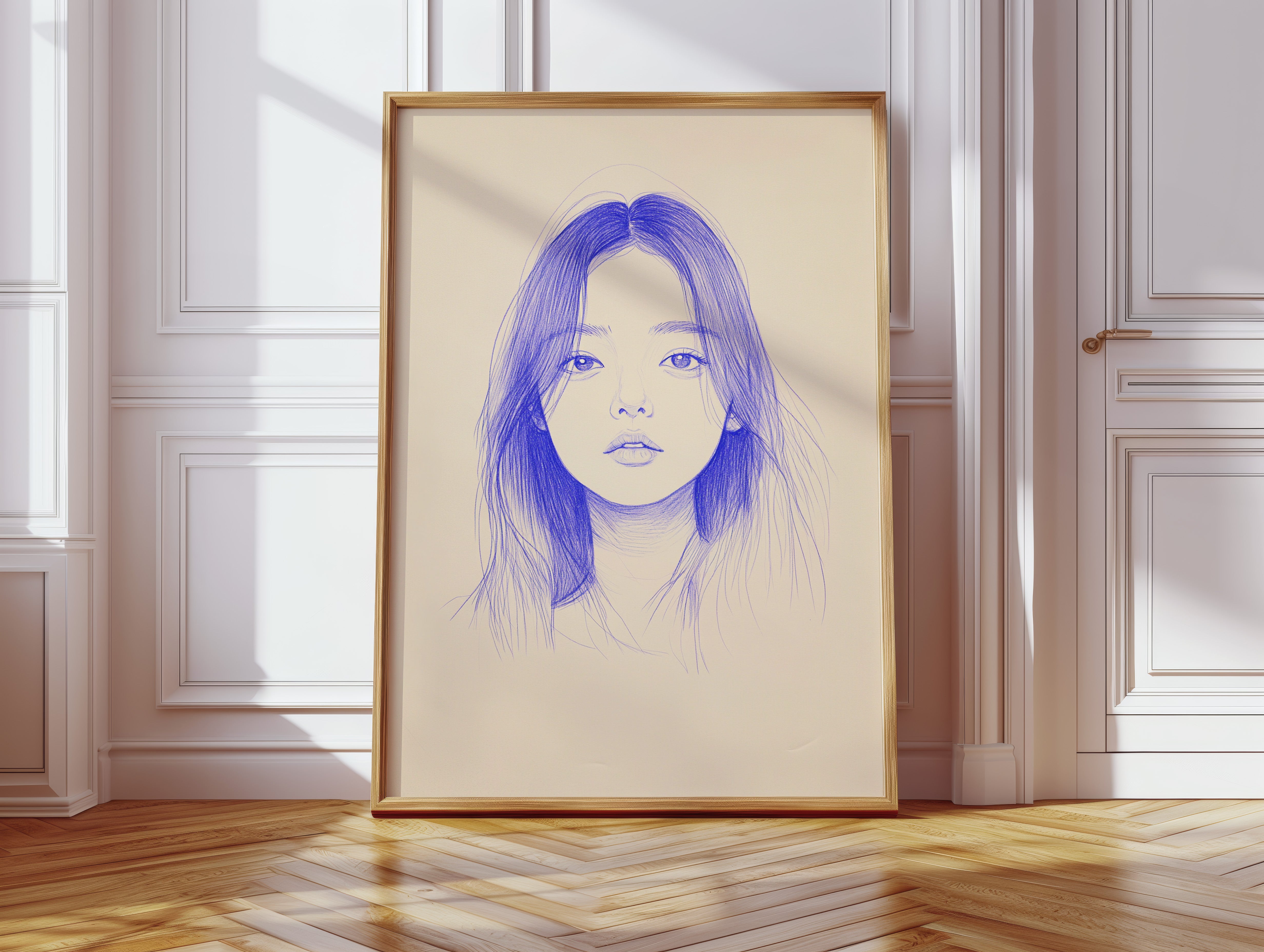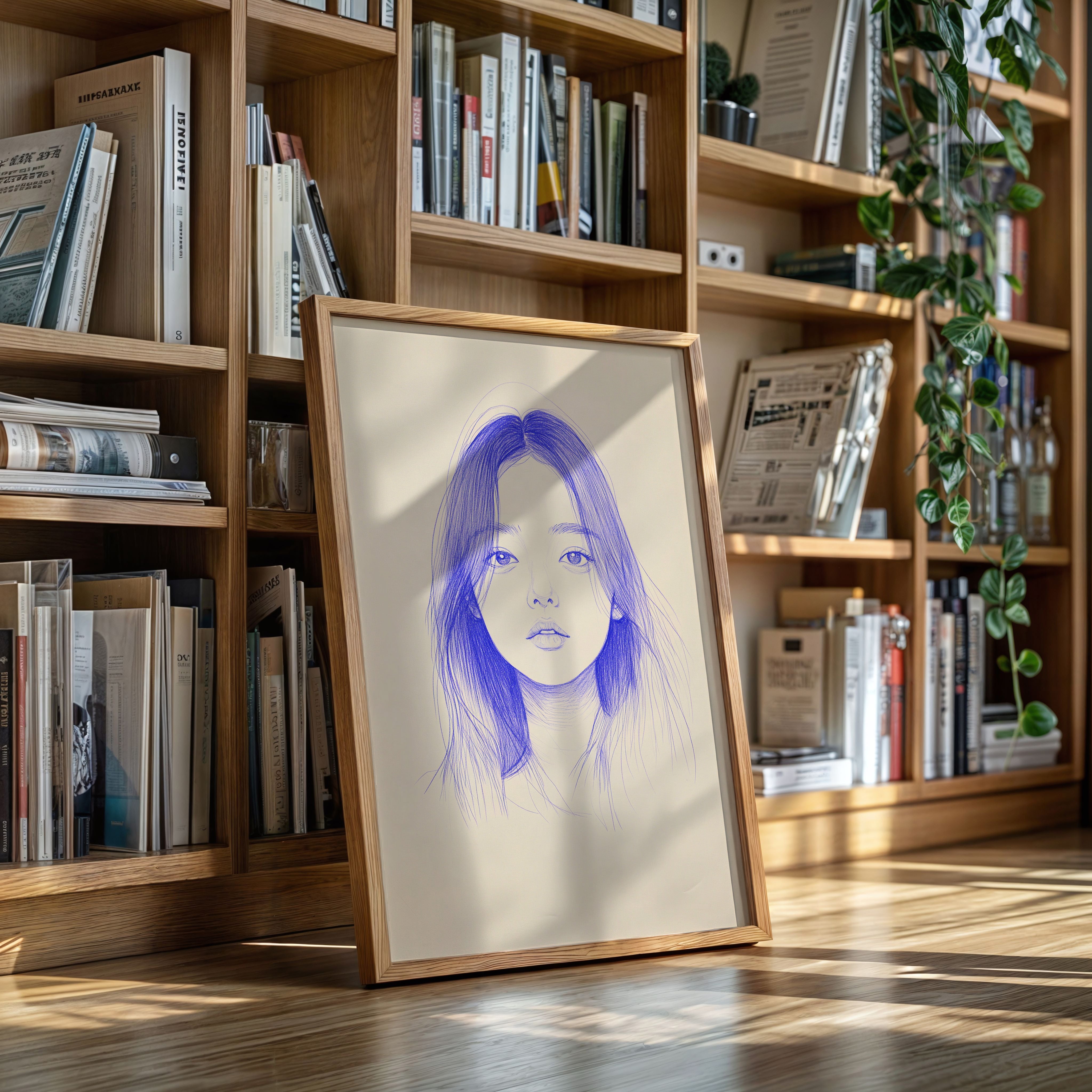 Delicate strokes of blue ink flow across cream-colored paper, creating an ethereal portrait that seems to float between reality and imagination. The minimalist line work captures a striking composition, with each mark deliberately placed to build depth and emotion. The interplay between negative space and varying pressures of the pen creates a contemporary meditation on form and expression. This piece would bring a sophisticated artistic presence to a modern home office or creative studio, where its contemplative nature can inspire deep thought and creativity.