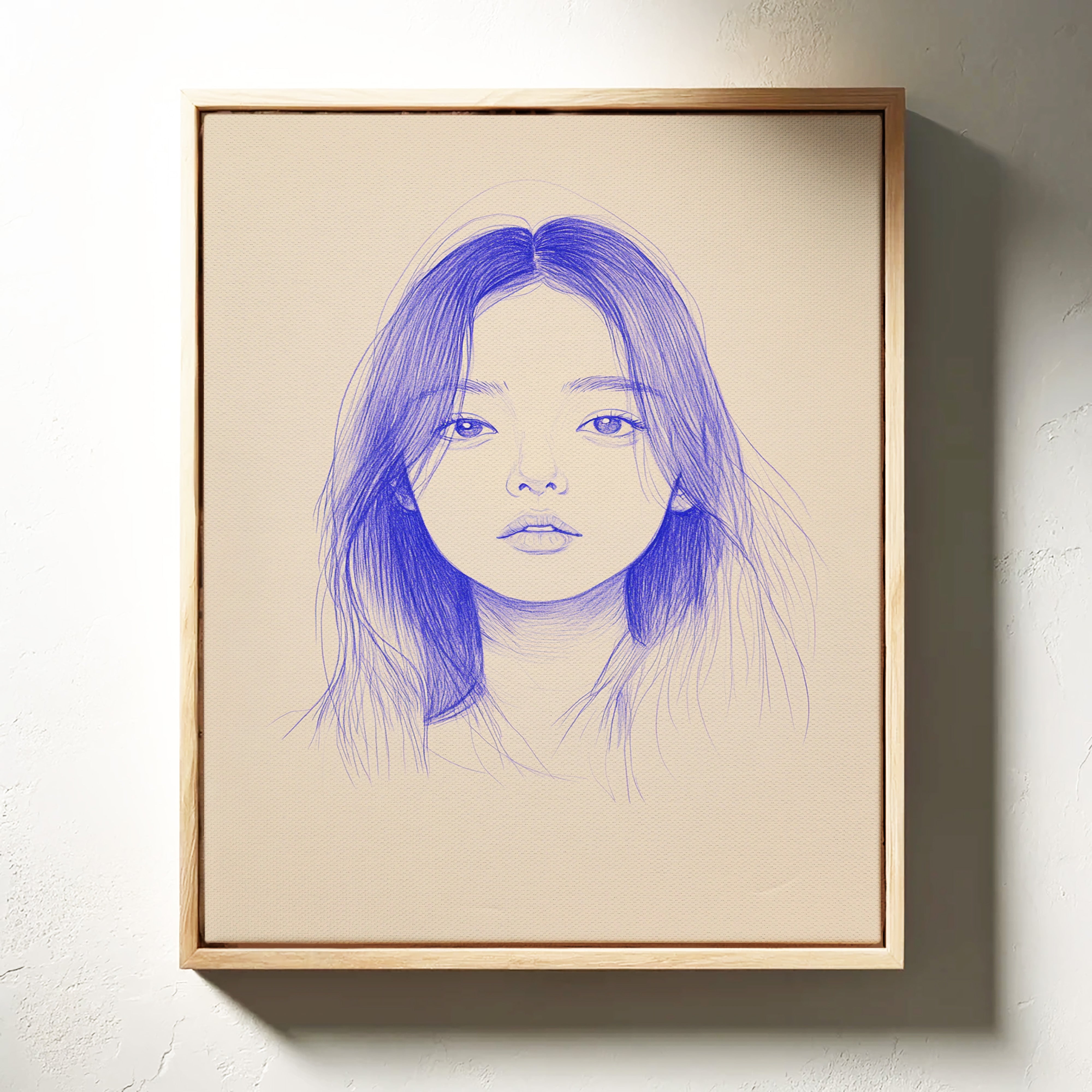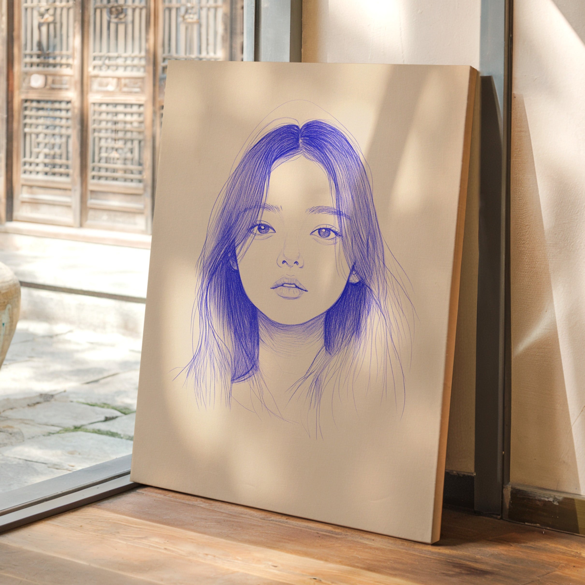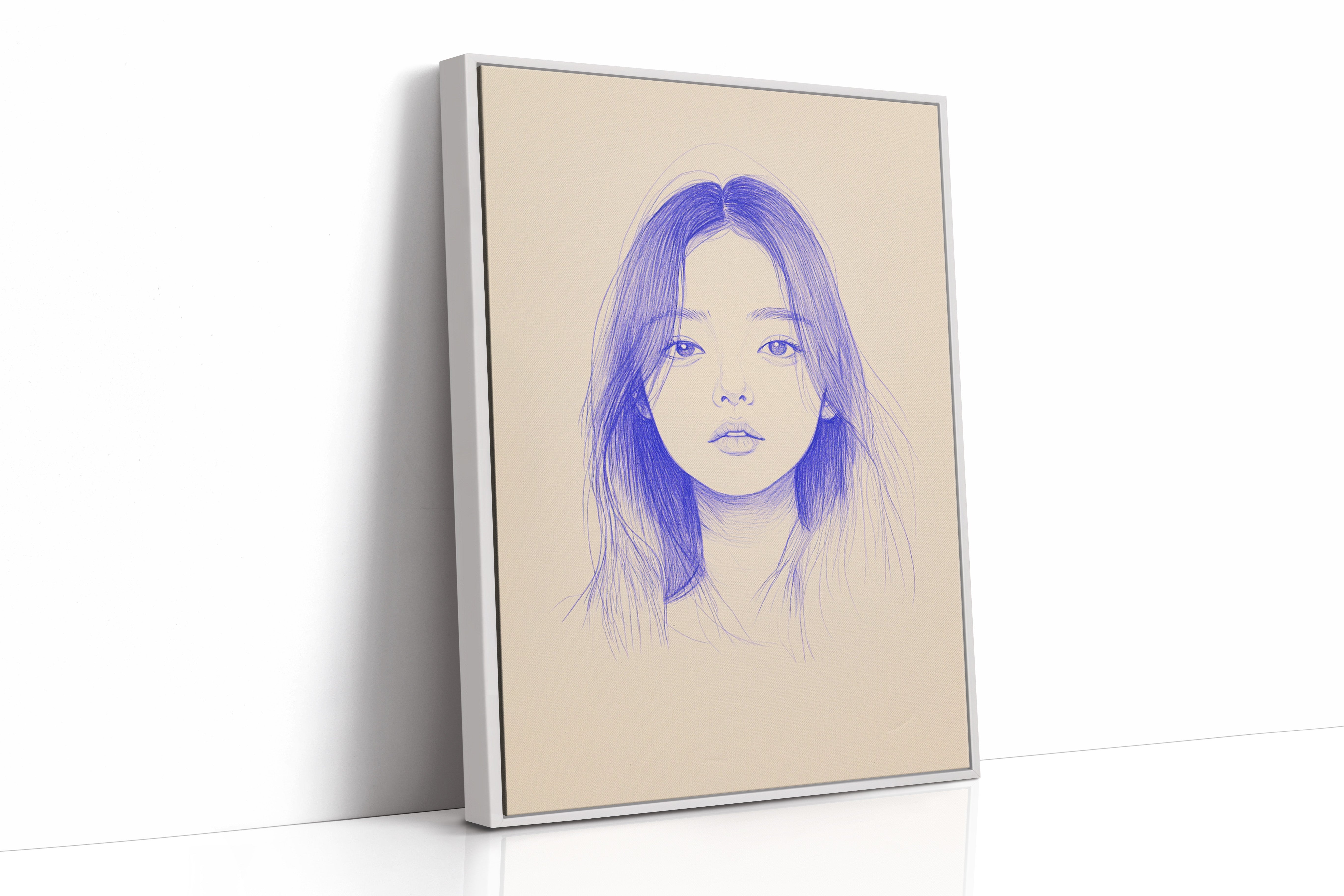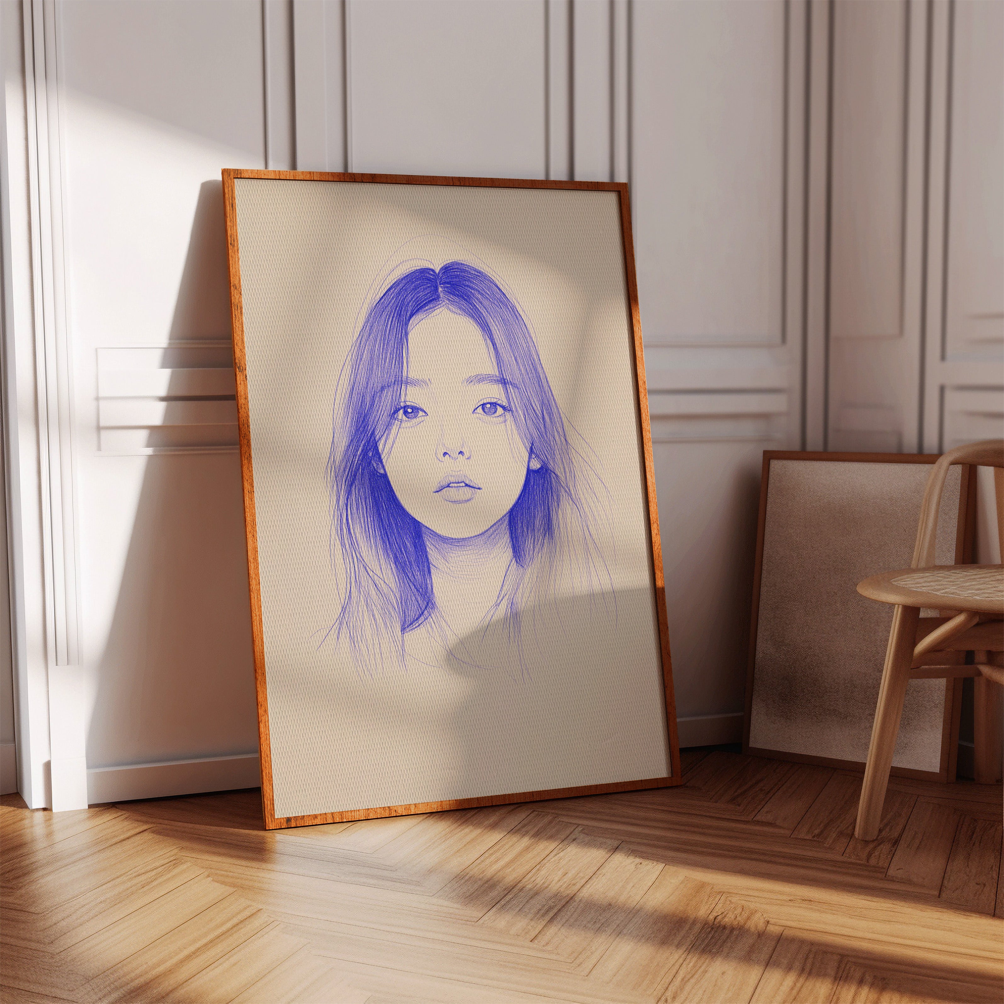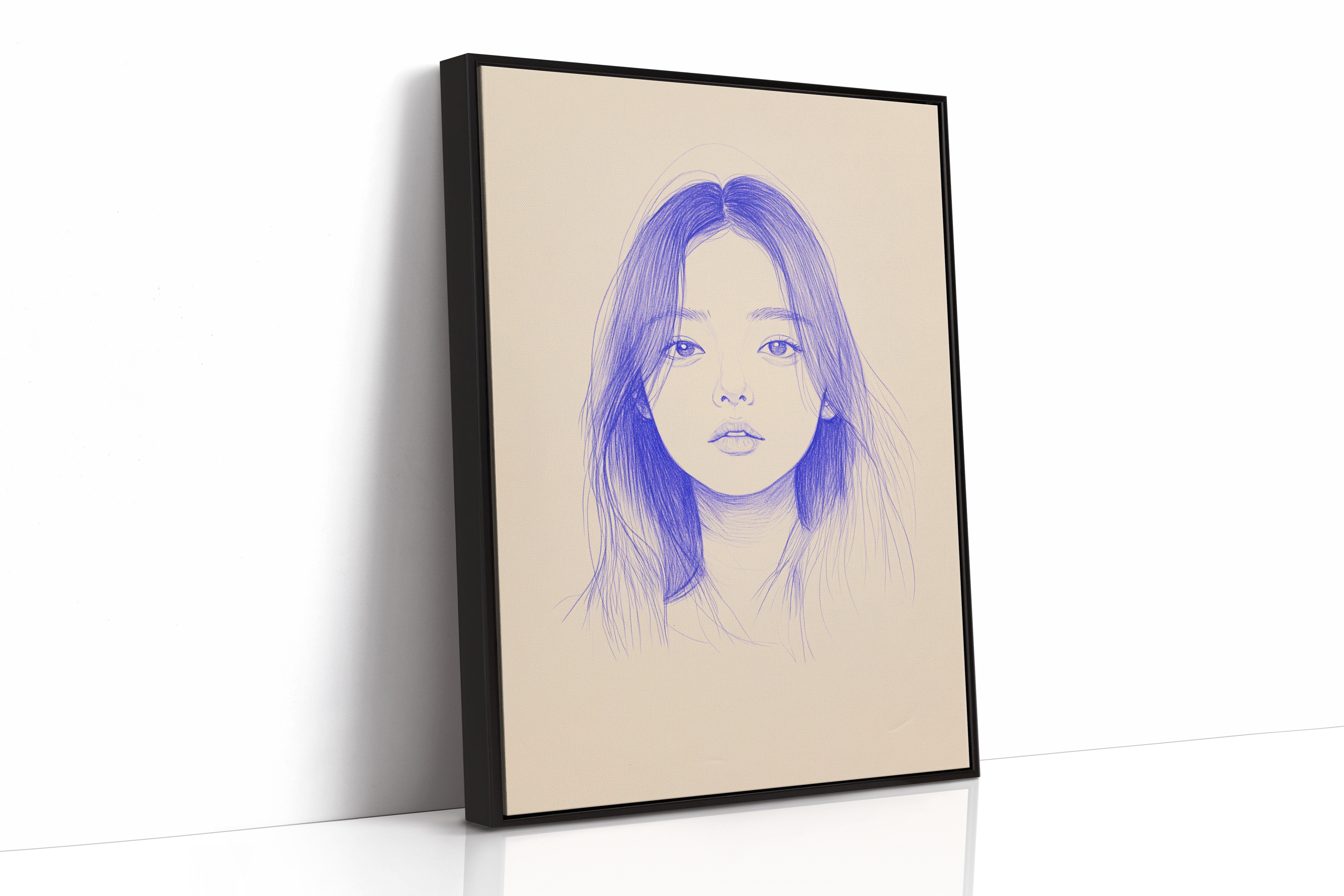 Delicate strokes of blue ink flow across cream-colored paper, creating an ethereal portrait that seems to float between reality and imagination. The minimalist line work captures a striking composition, with each mark deliberately placed to build depth and emotion. The interplay between negative space and varying pressures of the pen creates a contemporary meditation on form and expression. This piece would bring a sophisticated artistic presence to a modern home office or creative studio, where its contemplative nature can inspire deep thought and creativity.