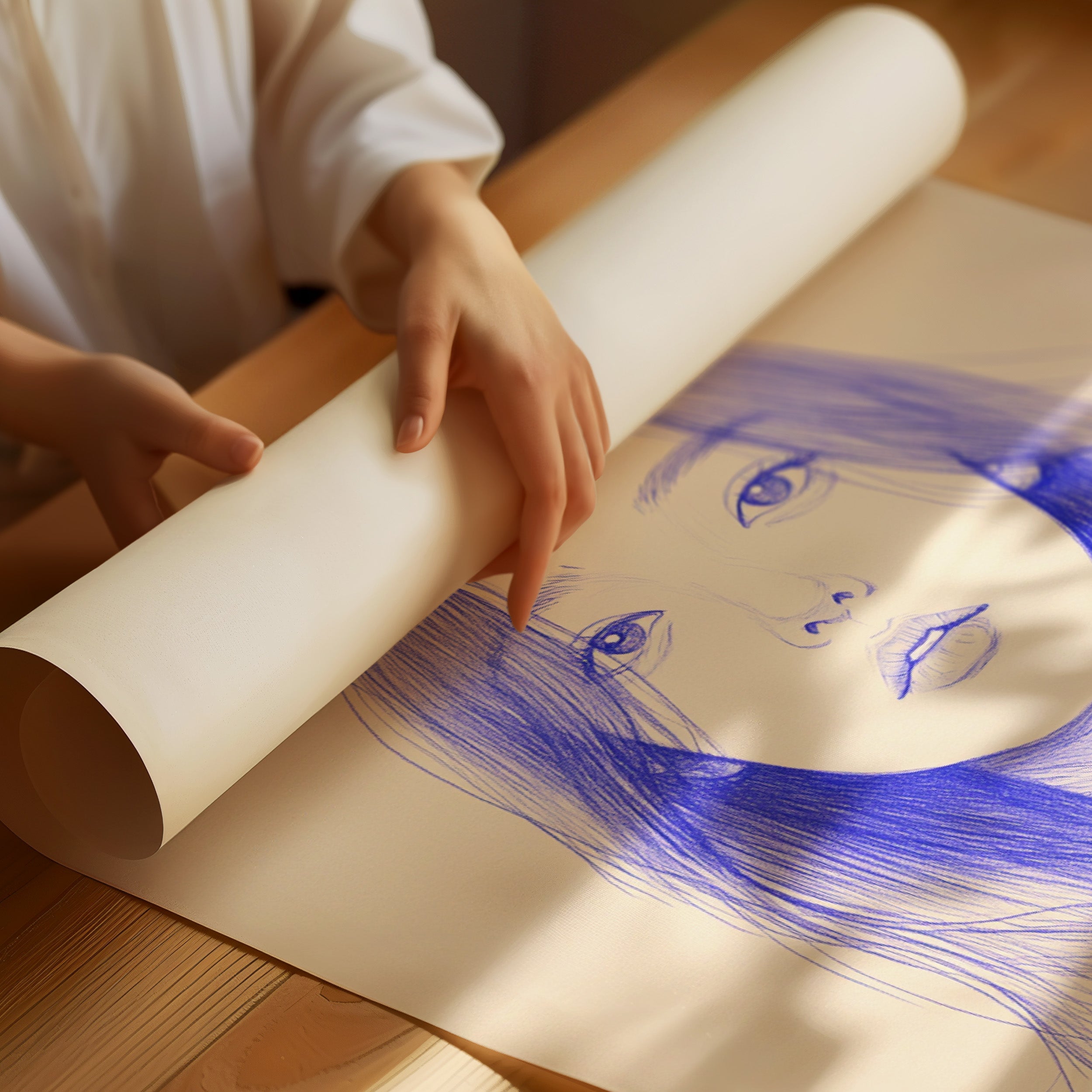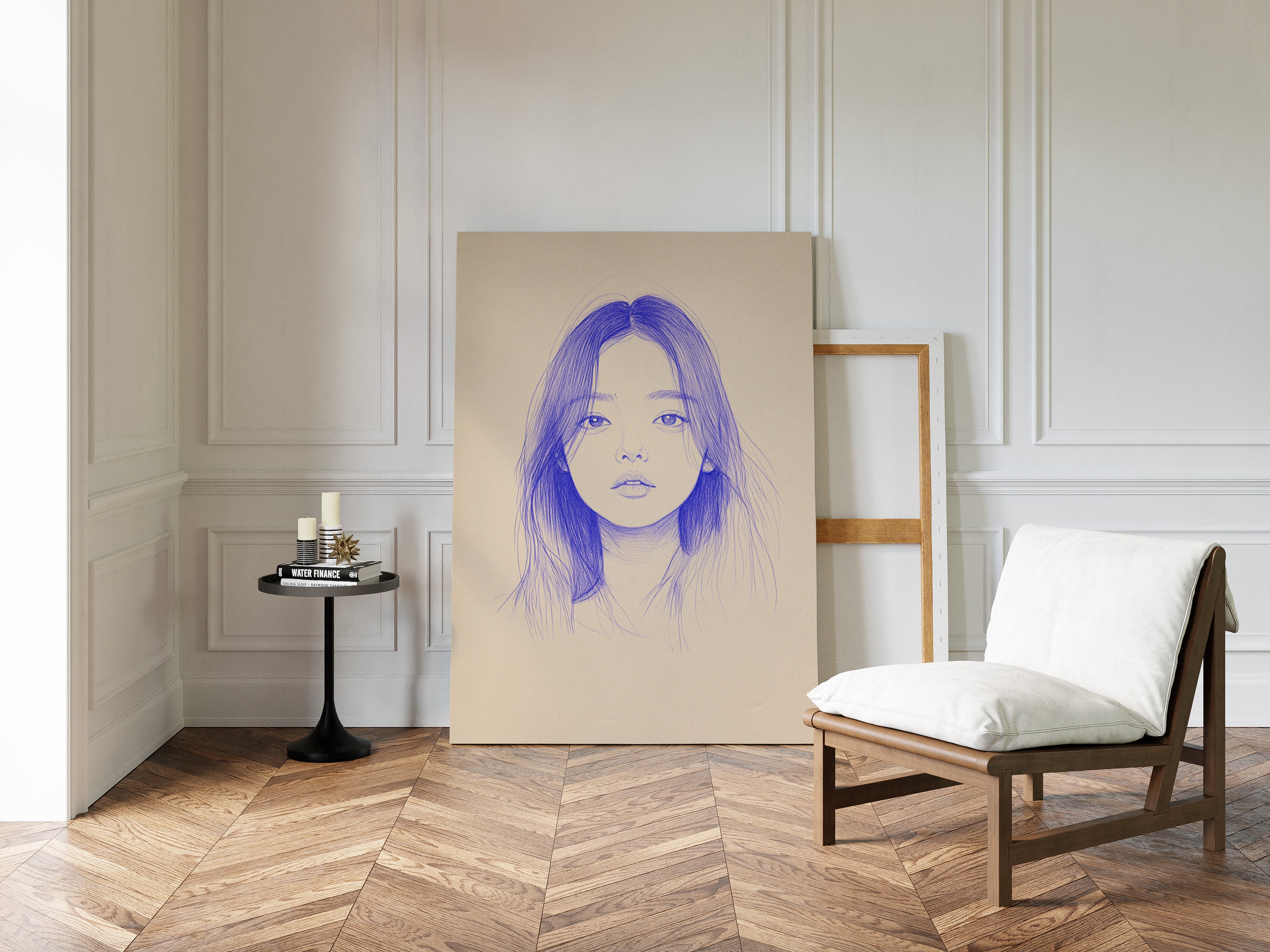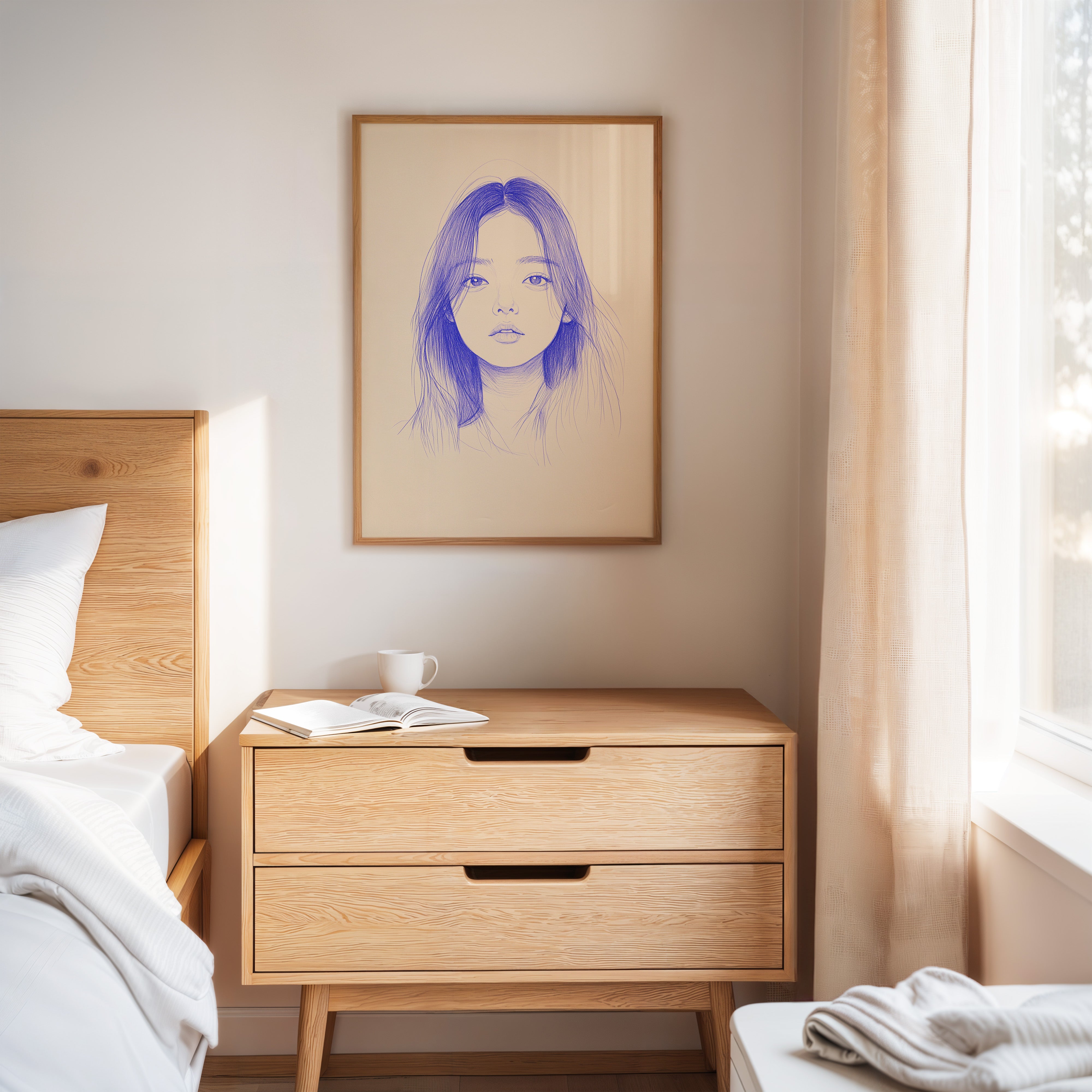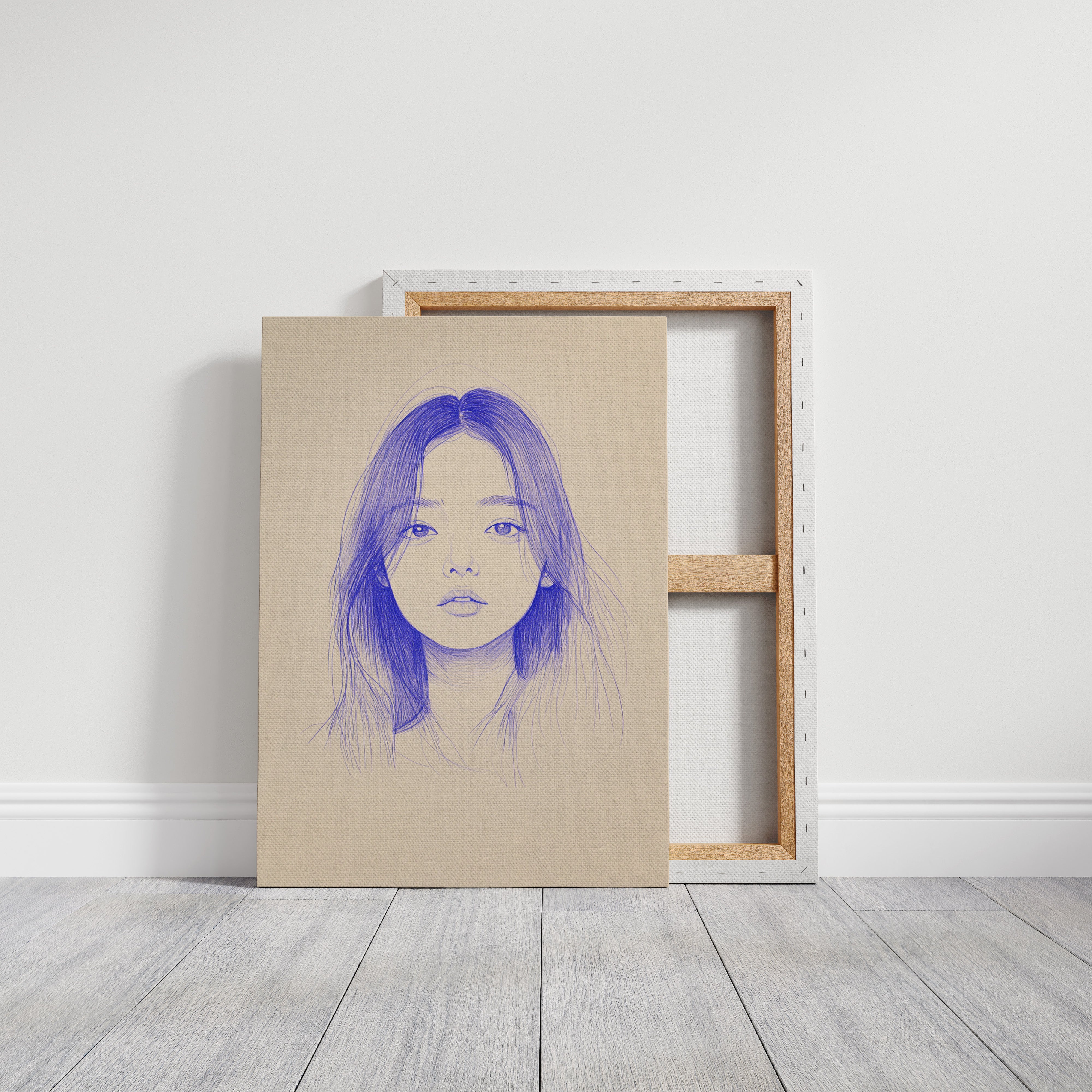 Delicate strokes of blue ink flow across cream-colored paper, creating an ethereal portrait that seems to float between reality and imagination. The minimalist line work captures a striking composition, with each mark deliberately placed to build depth and emotion. The interplay between negative space and varying pressures of the pen creates a contemporary meditation on form and expression. This piece would bring a sophisticated artistic presence to a modern home office or creative studio, where its contemplative nature can inspire deep thought and creativity.