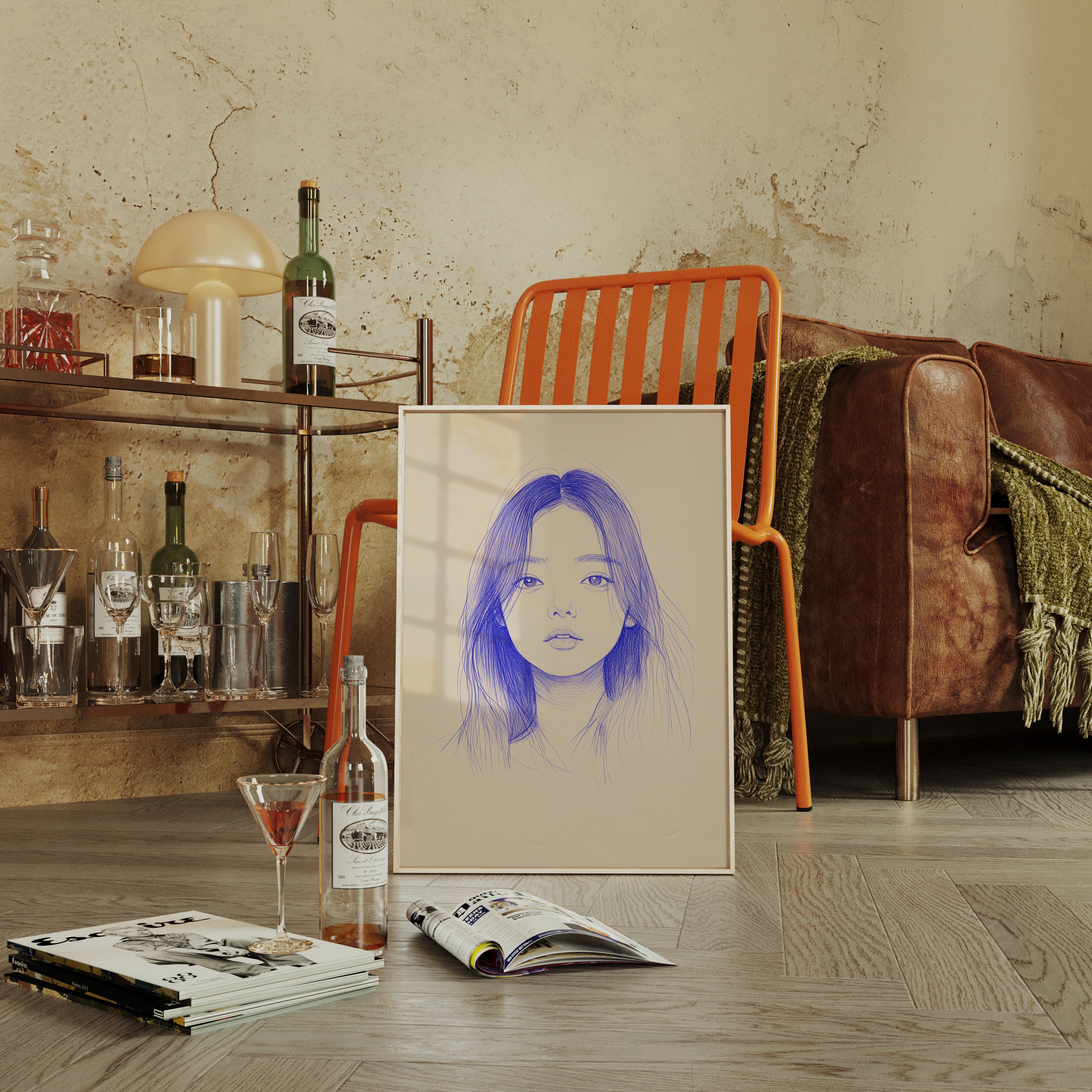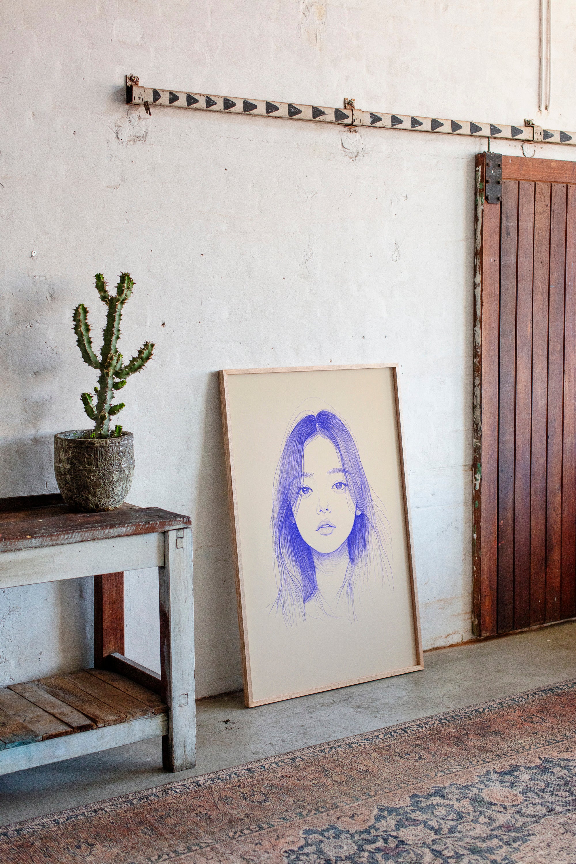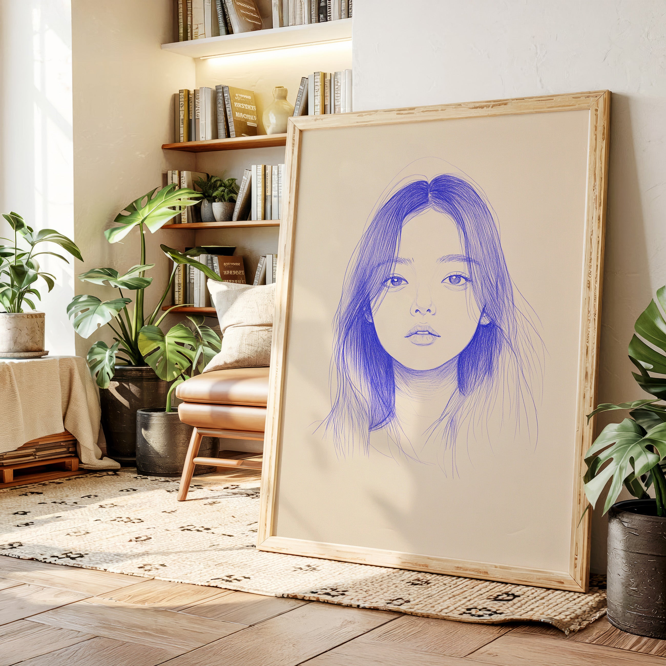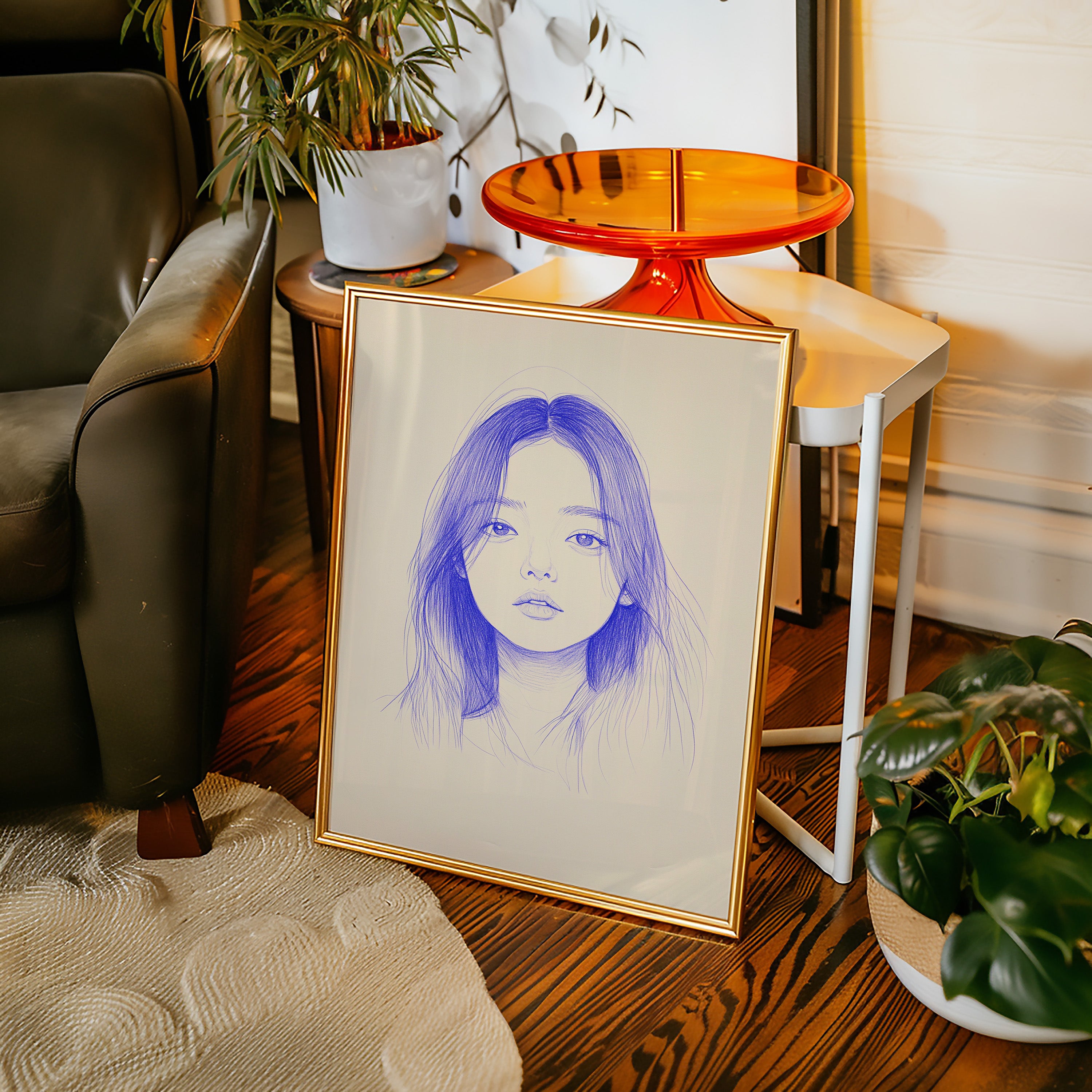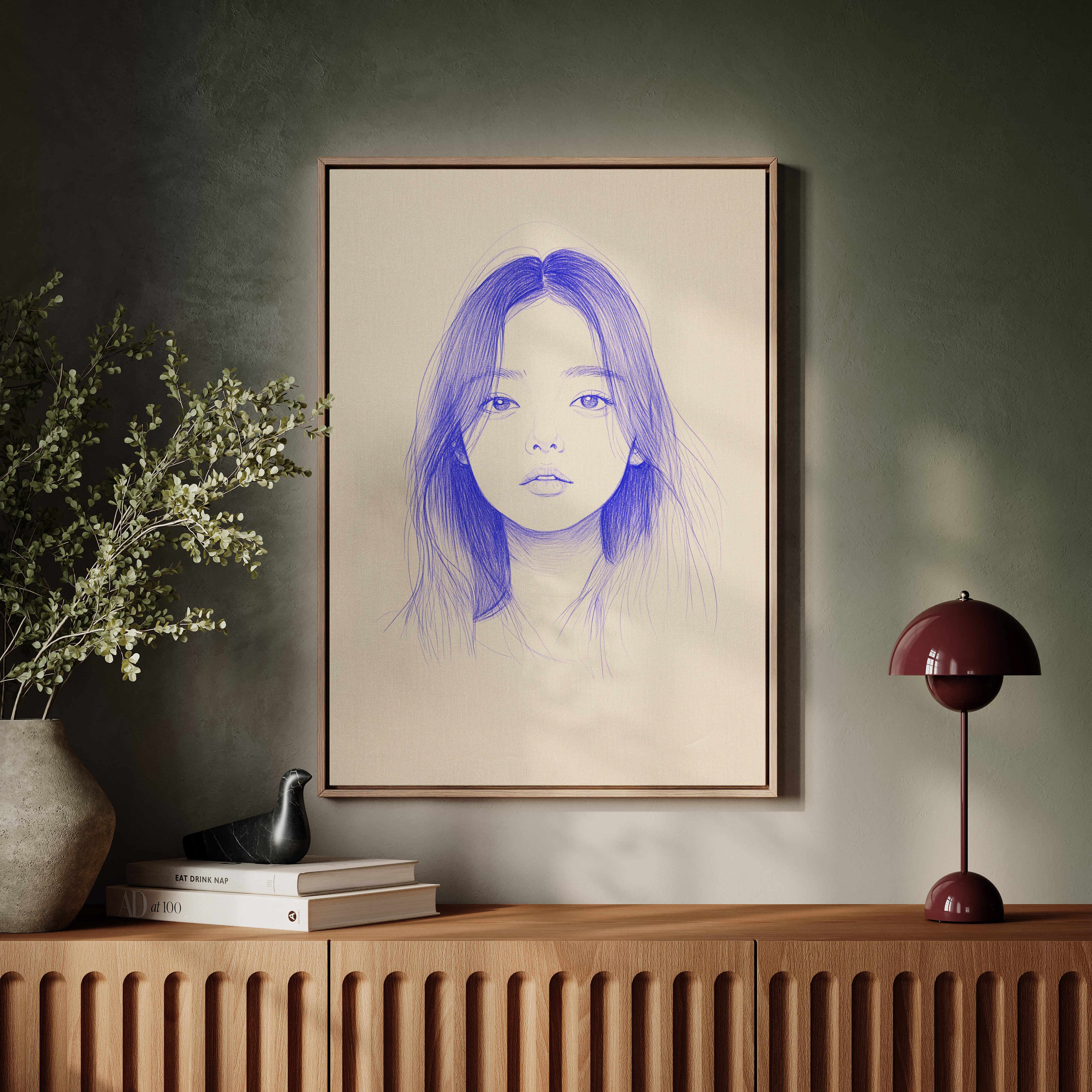 Delicate strokes of blue ink flow across cream-colored paper, creating an ethereal portrait that seems to float between reality and imagination. The minimalist line work captures a striking composition, with each mark deliberately placed to build depth and emotion. The interplay between negative space and varying pressures of the pen creates a contemporary meditation on form and expression. This piece would bring a sophisticated artistic presence to a modern home office or creative studio, where its contemplative nature can inspire deep thought and creativity.