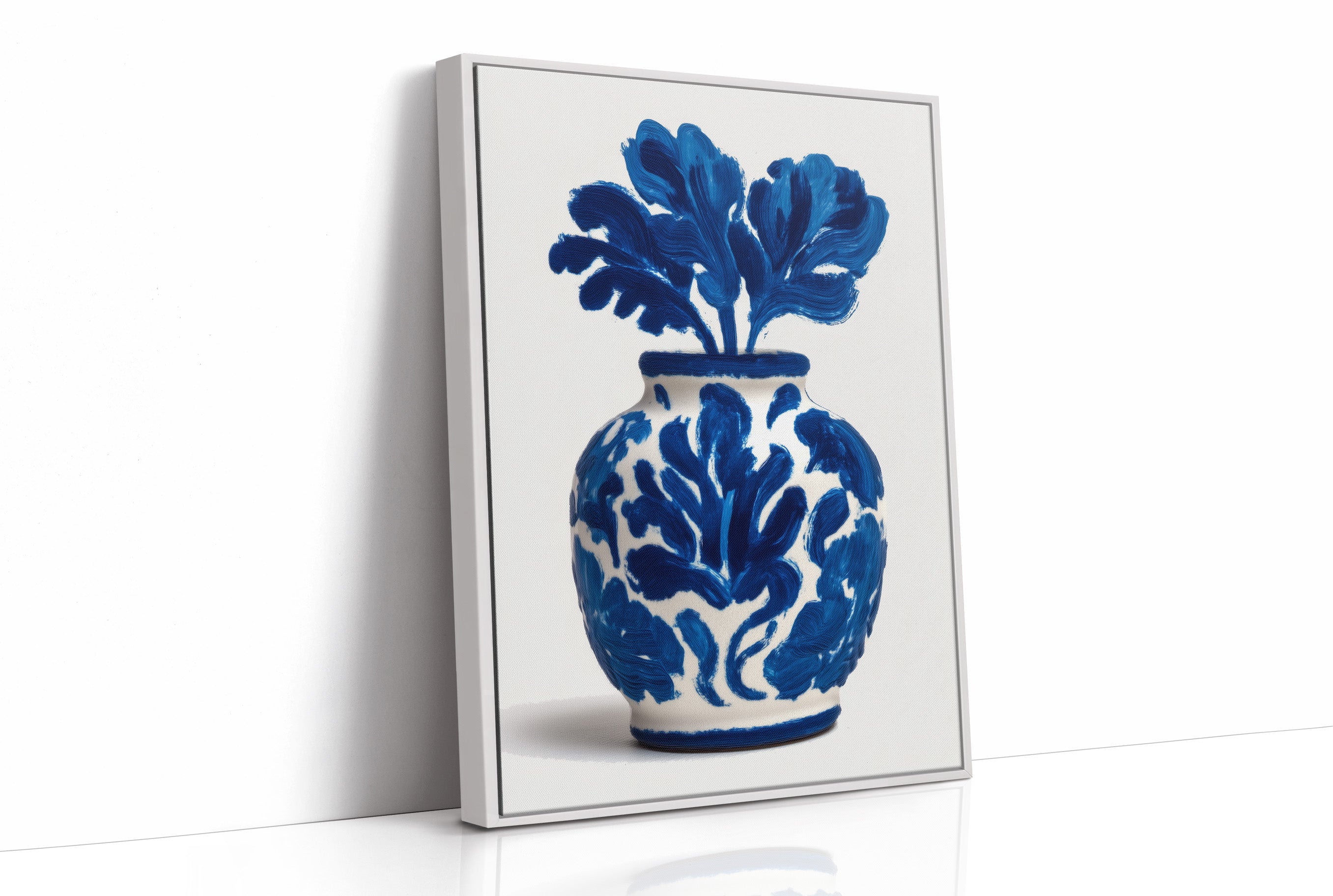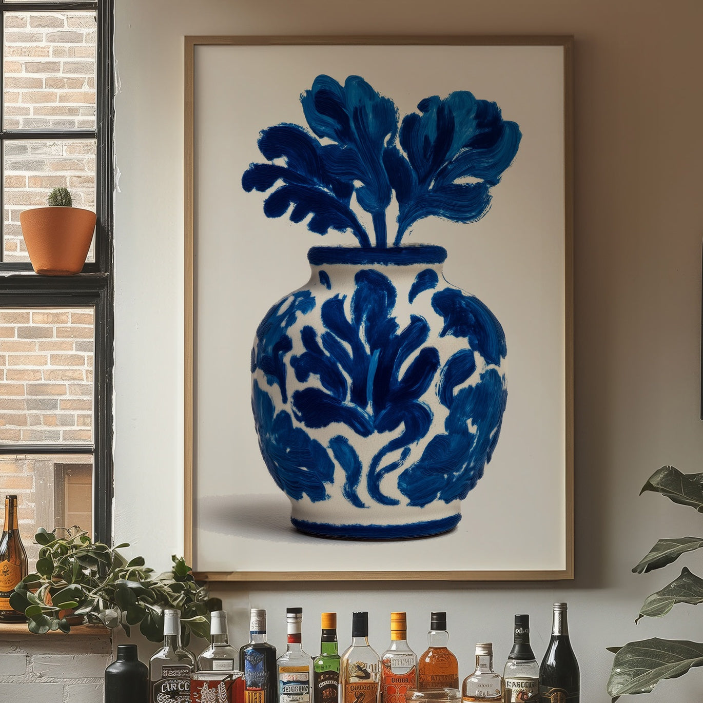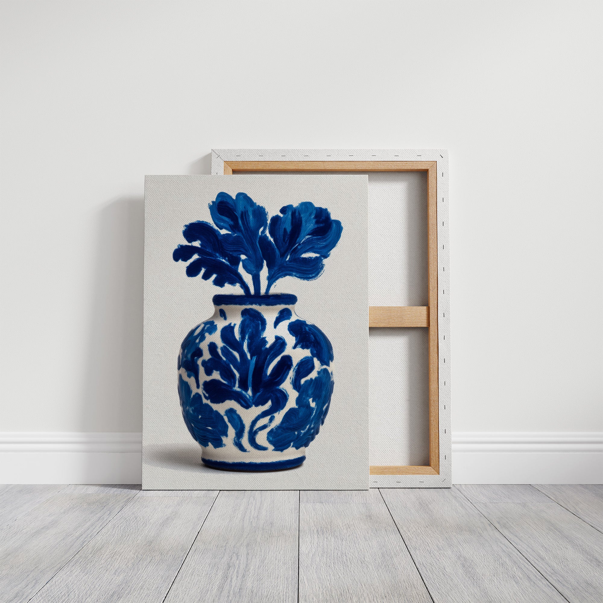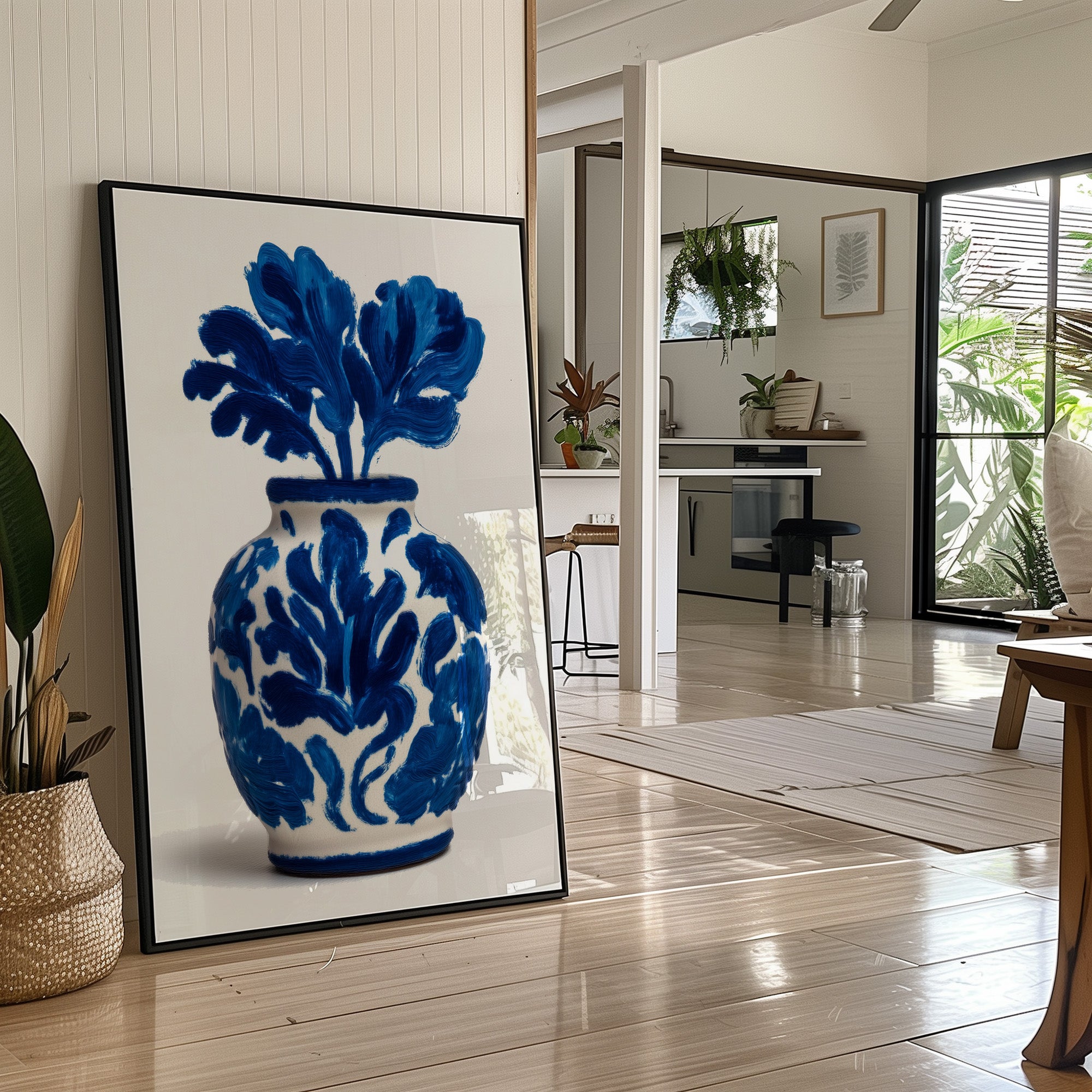 Brushstrokes of deep cobalt blue sweep across pristine white, creating a bold yet graceful botanical study. The contemporary interpretation of a classic vase arrangement captures movement and fluidity, with each petal seeming to float and twirl in an ethereal dance. The minimalist composition, rendered in confident strokes of indigo against crisp negative space, speaks to both traditional chinoiserie and modern abstract sensibilities. This piece would bring sophisticated serenity to a reading nook, home office, or any space seeking a touch of artistic refinement.