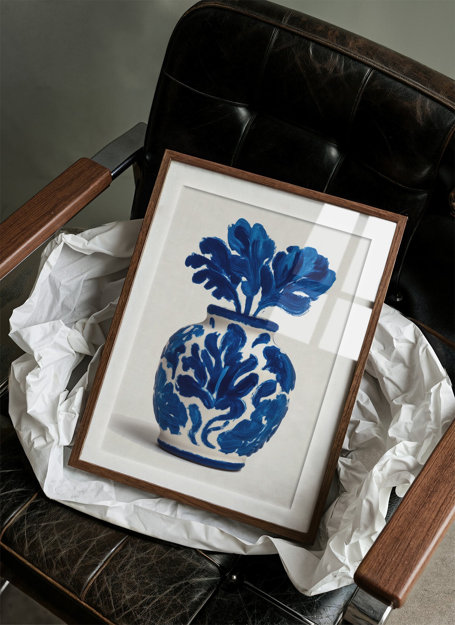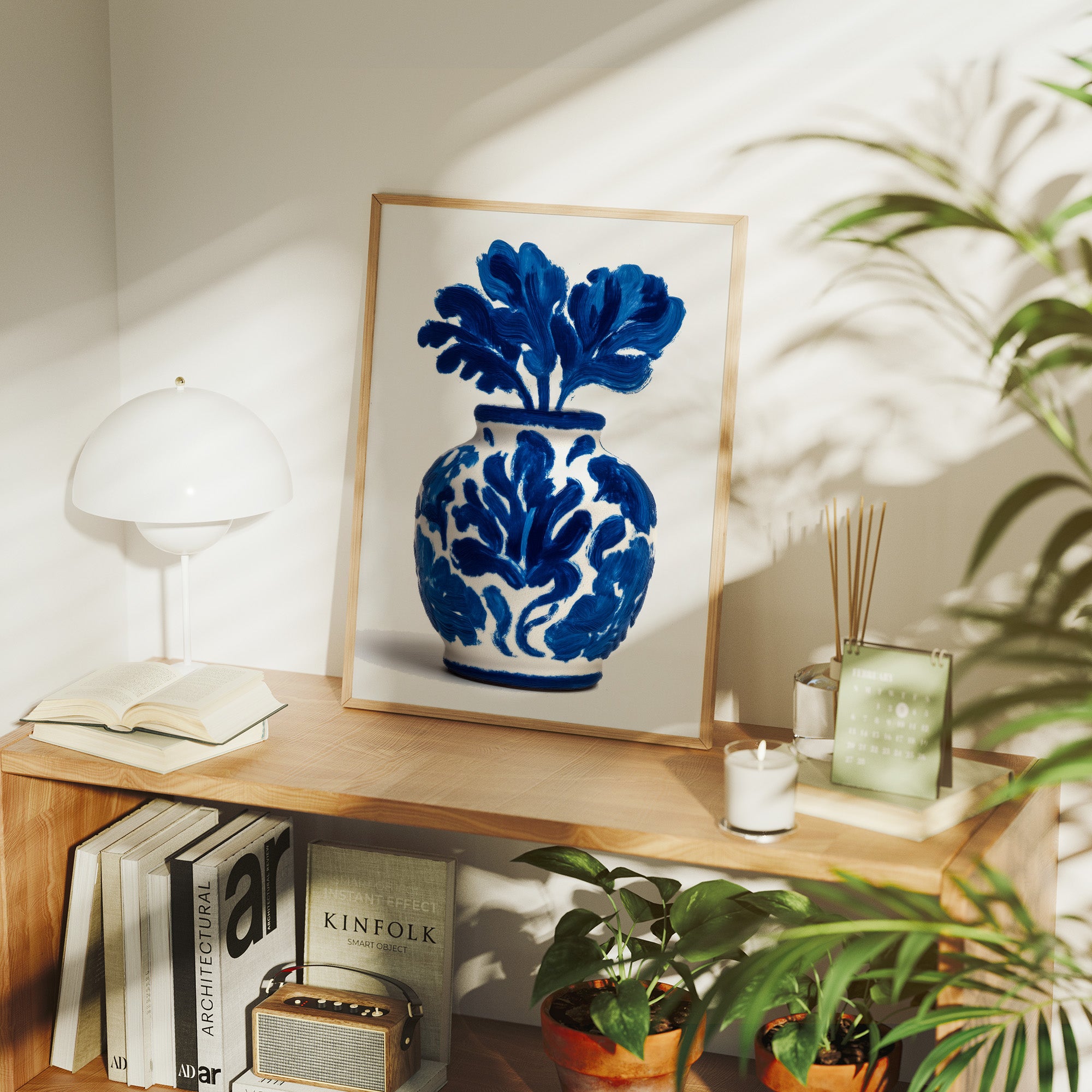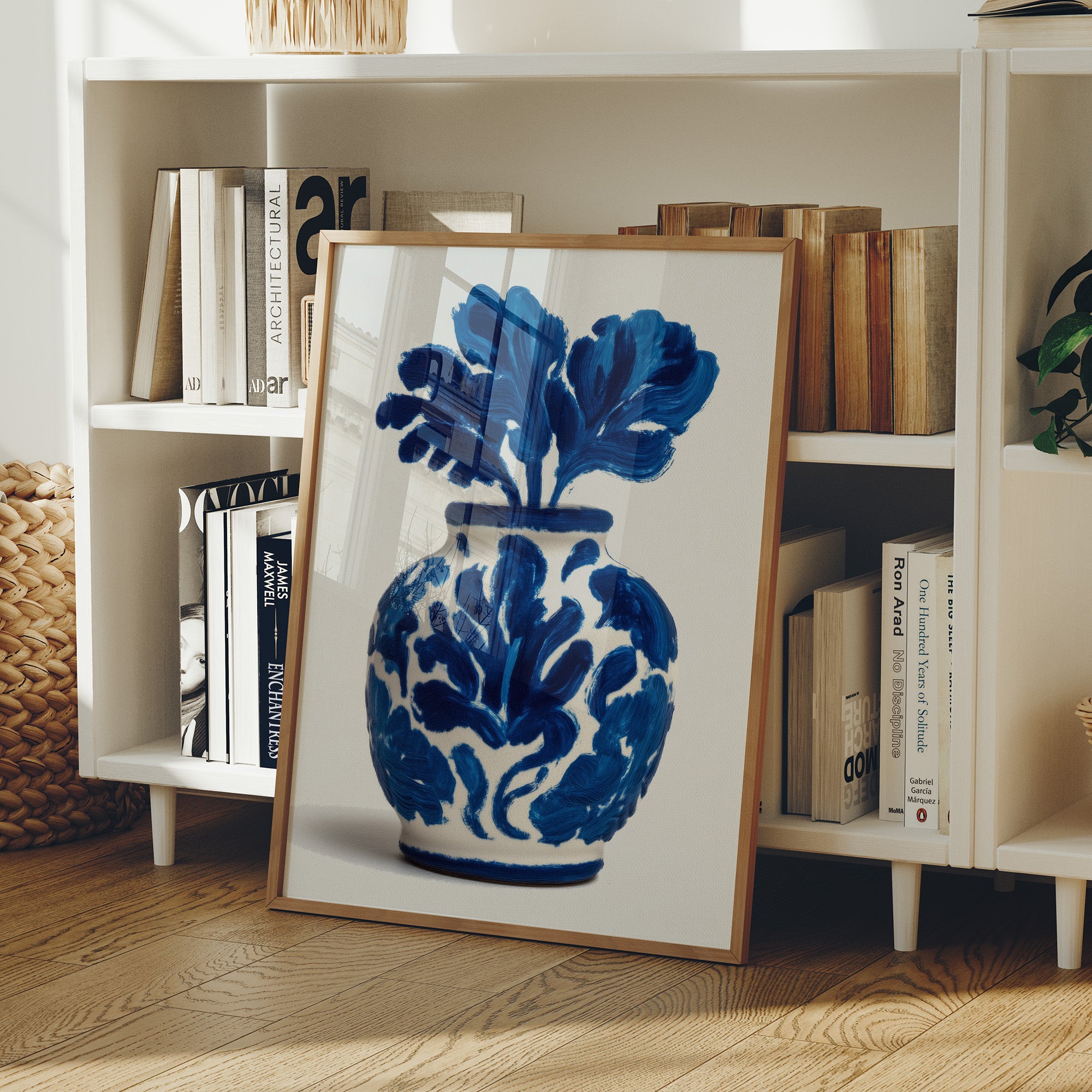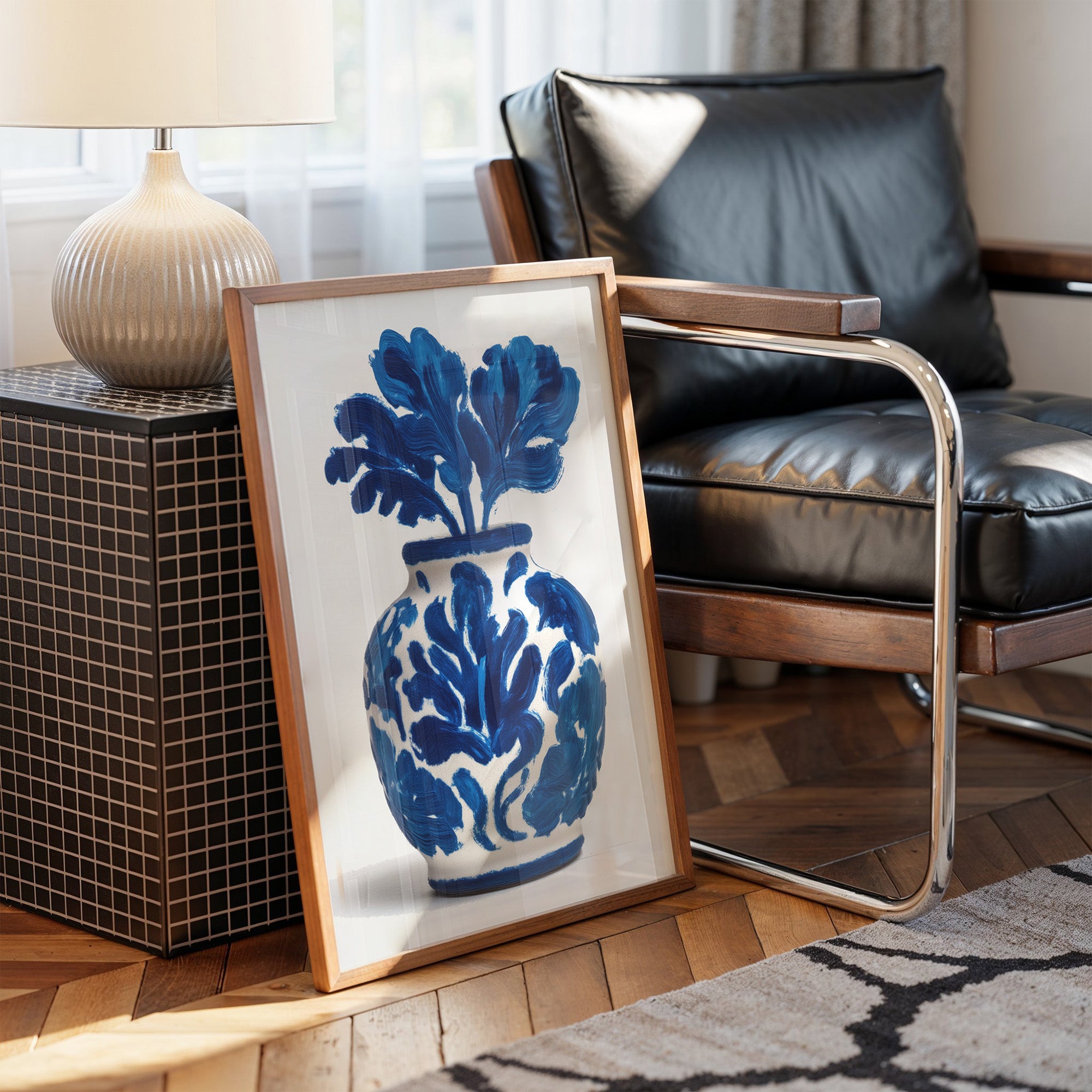 Brushstrokes of deep cobalt blue sweep across pristine white, creating a bold yet graceful botanical study. The contemporary interpretation of a classic vase arrangement captures movement and fluidity, with each petal seeming to float and twirl in an ethereal dance. The minimalist composition, rendered in confident strokes of indigo against crisp negative space, speaks to both traditional chinoiserie and modern abstract sensibilities. This piece would bring sophisticated serenity to a reading nook, home office, or any space seeking a touch of artistic refinement.