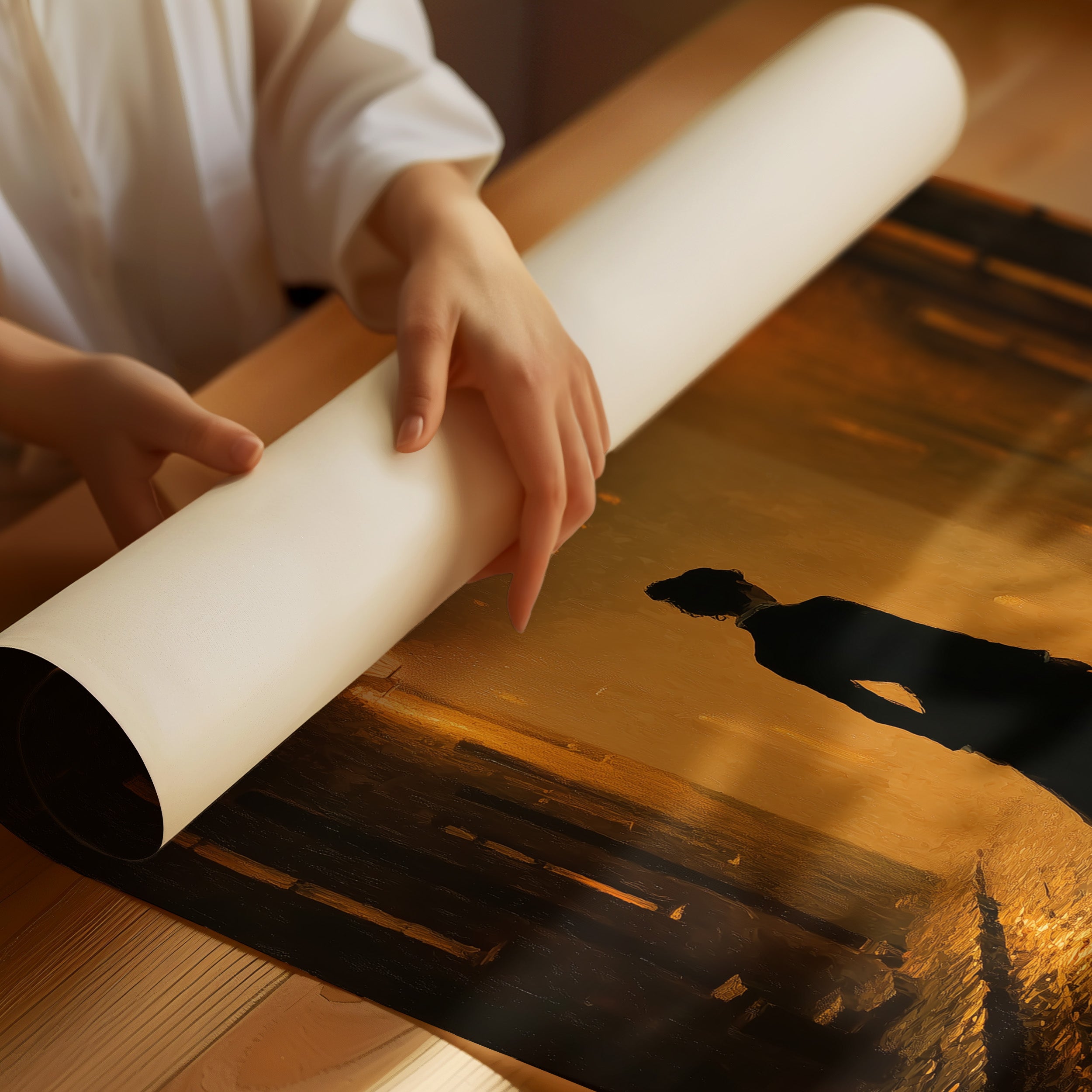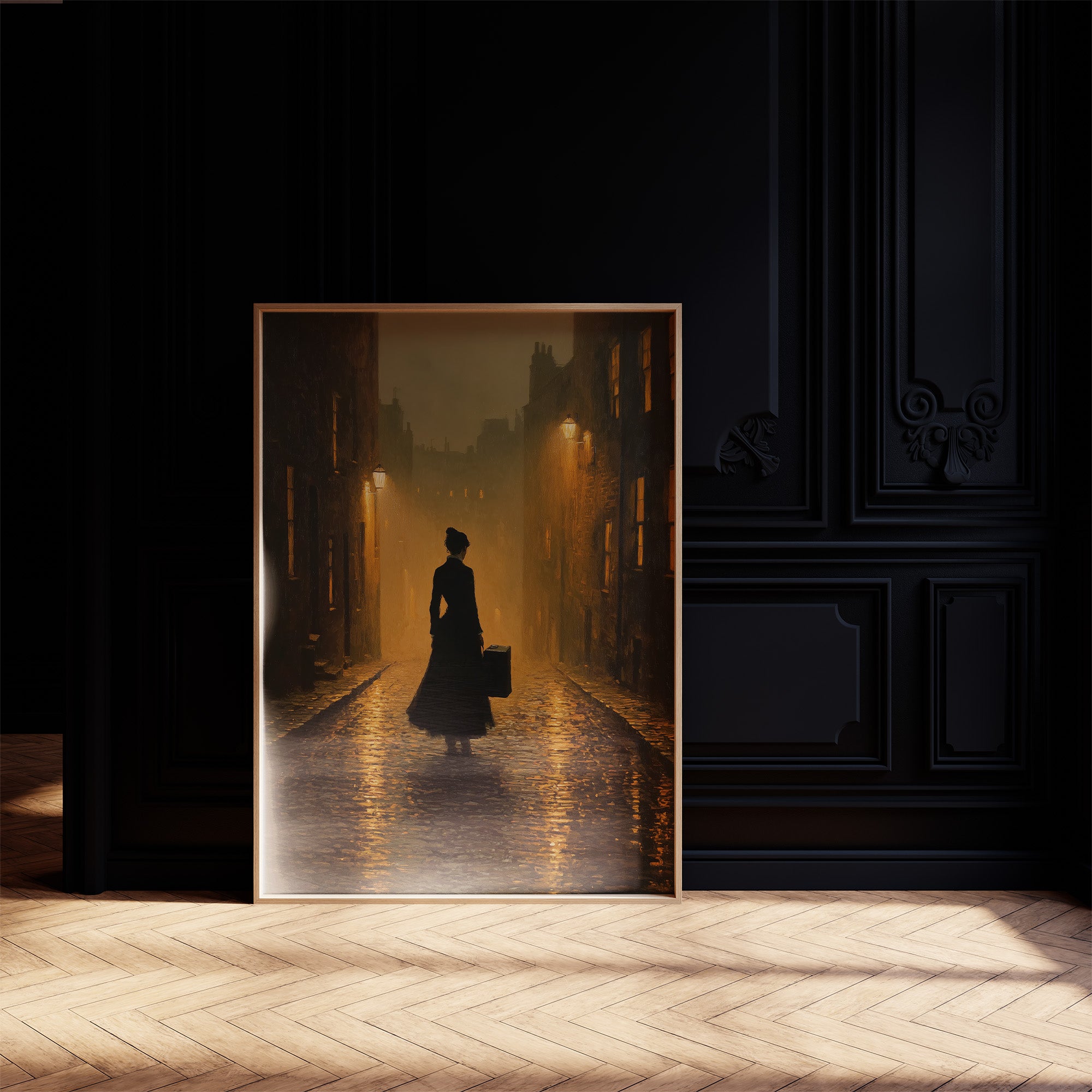 Amber light pools against wet stone, creating an atmosphere of anticipation and mystery. A solitary figure stands poised between worlds, silhouetted against the golden haze of Victorian street lamps that punctuate the foggy alleyway. The rich sepia tones and dramatic shadows evoke a sense of narrative suspended in time, where every cobblestone seems to hold secrets of the past. This contemplative piece brings sophisticated drama to a study, library, or hallway where its atmospheric depth can be fully appreciated.