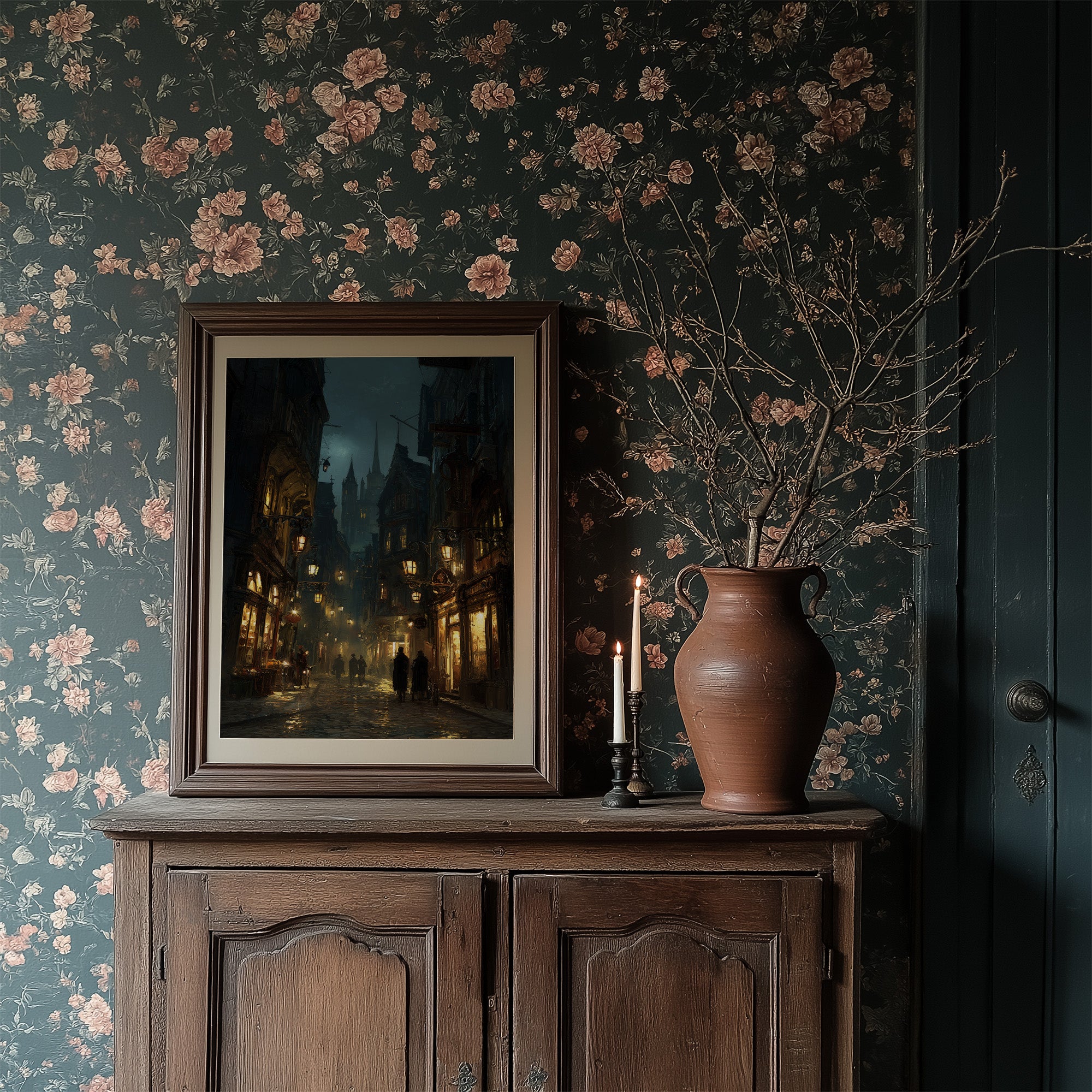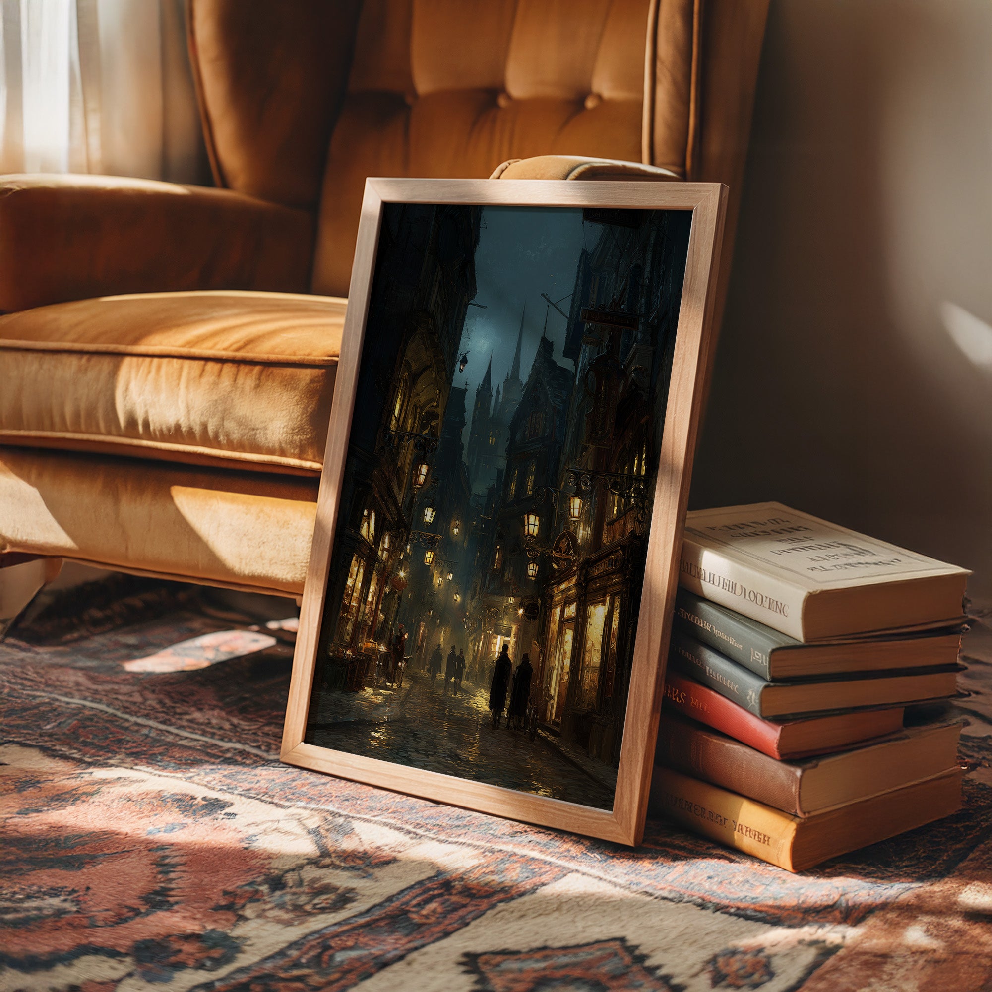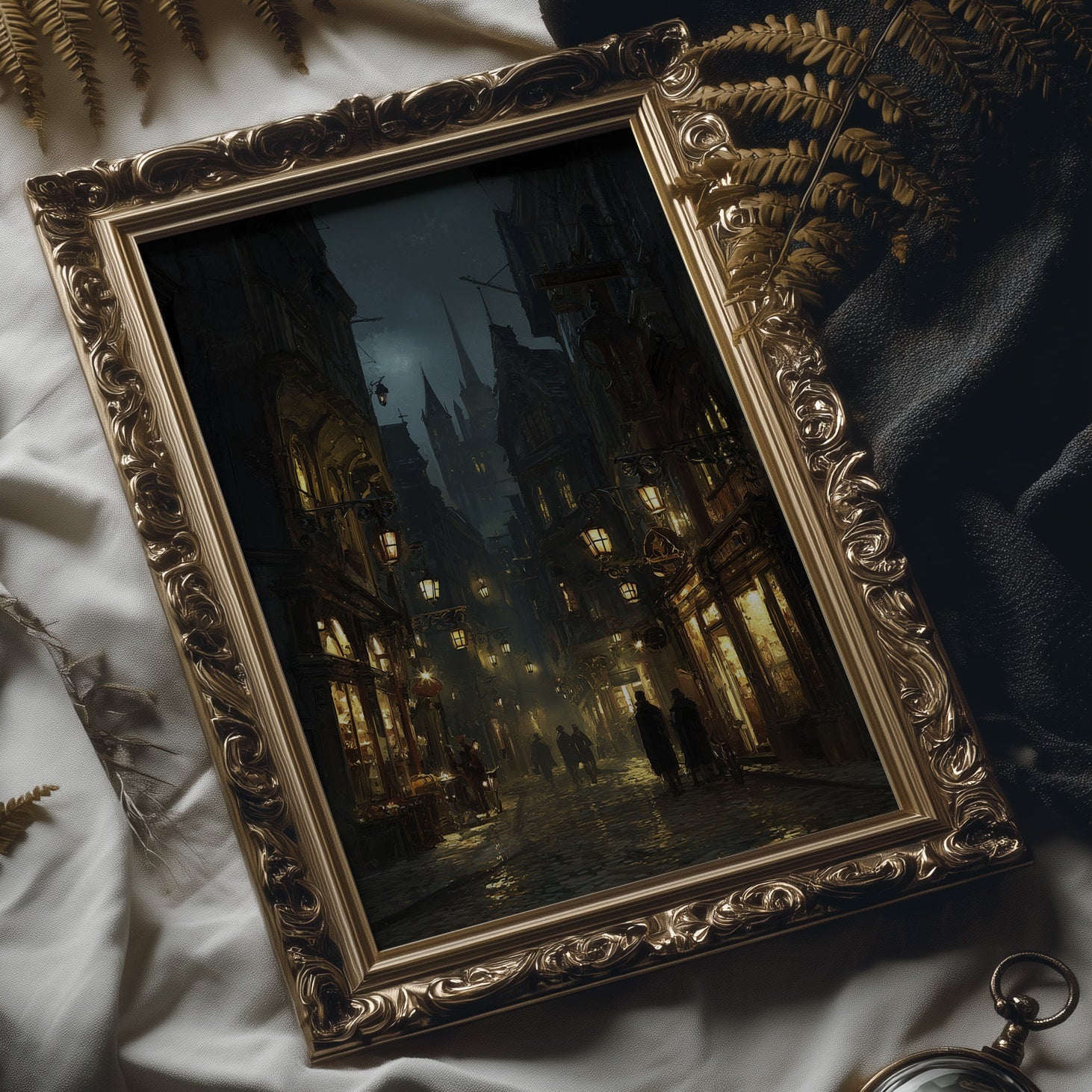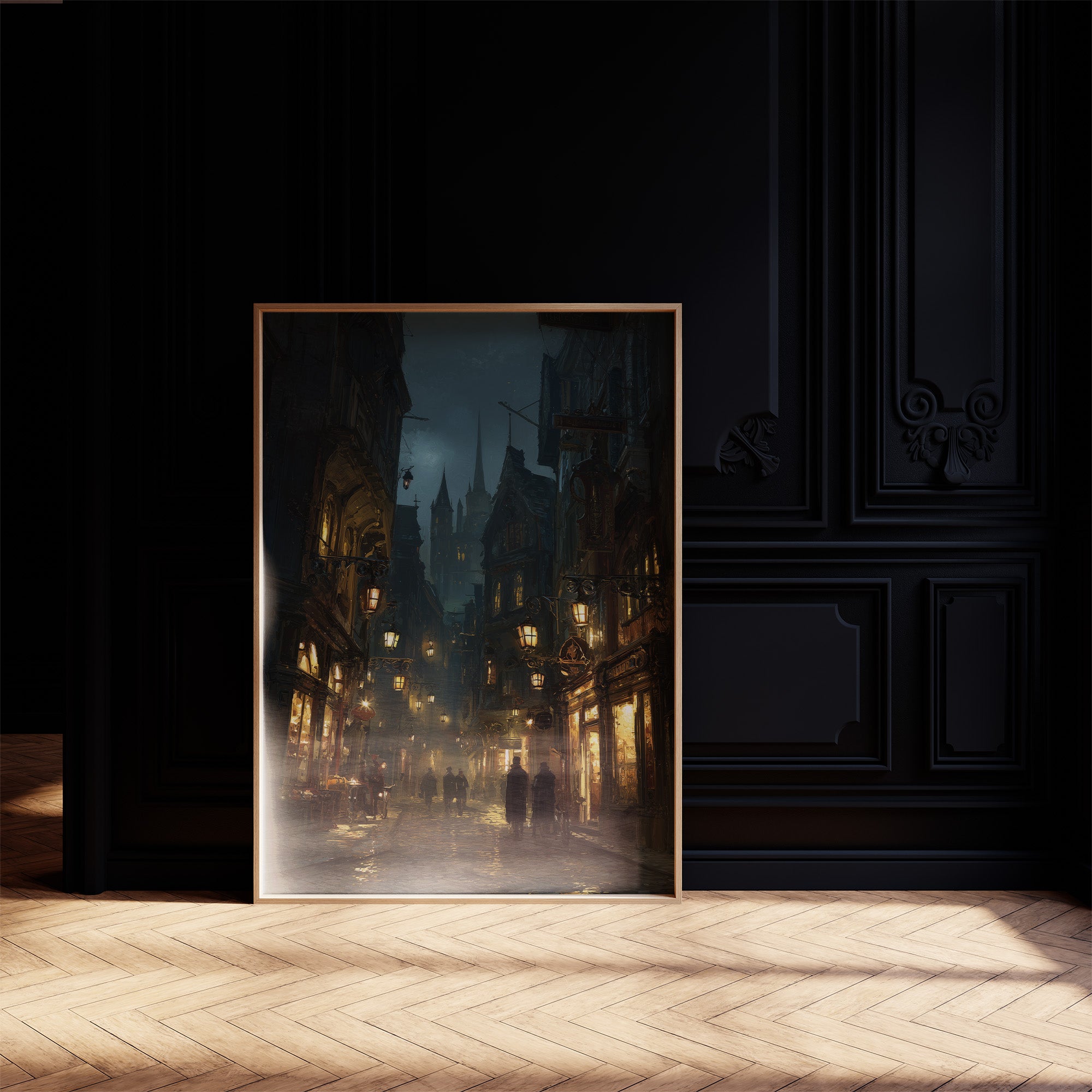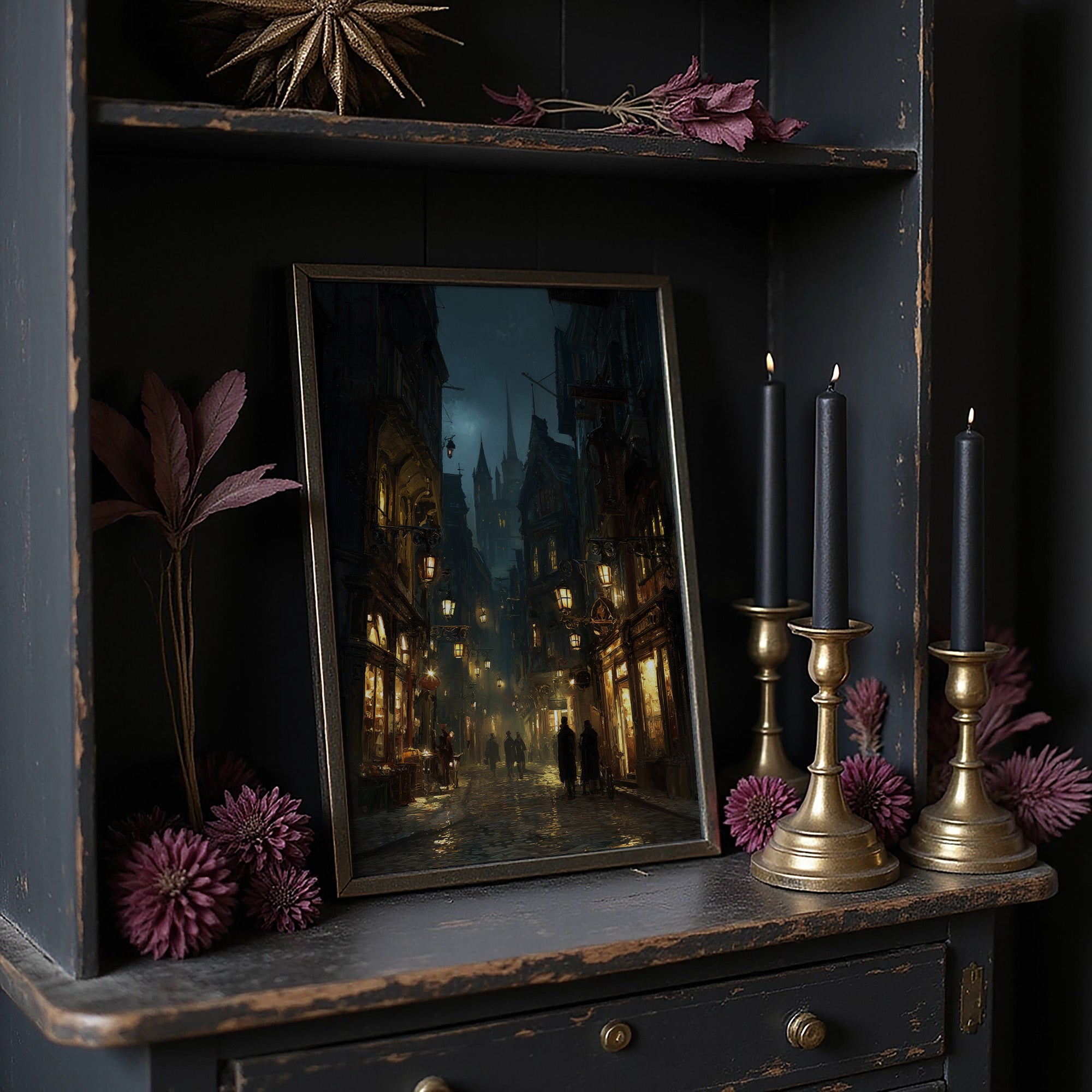 Lantern light spills across rain-slicked cobblestones, creating pools of amber warmth against the velvet night. Silhouetted figures move through the narrow medieval street, their stories untold as they navigate between timber-framed shops and taverns beneath a cathedral's watchful spires. The atmospheric painting captures that liminal moment between day and night when the city transforms into a realm of mystery and possibility.