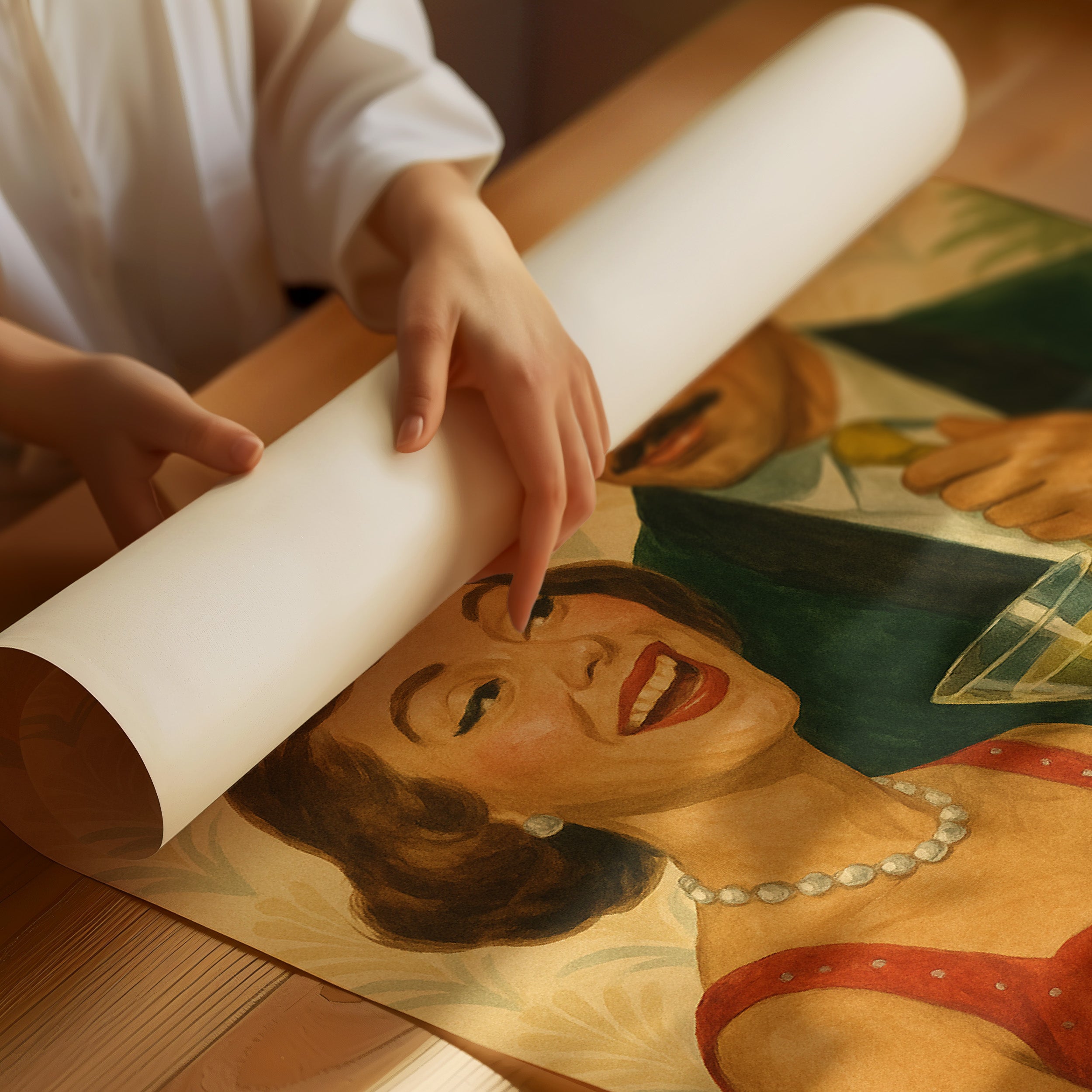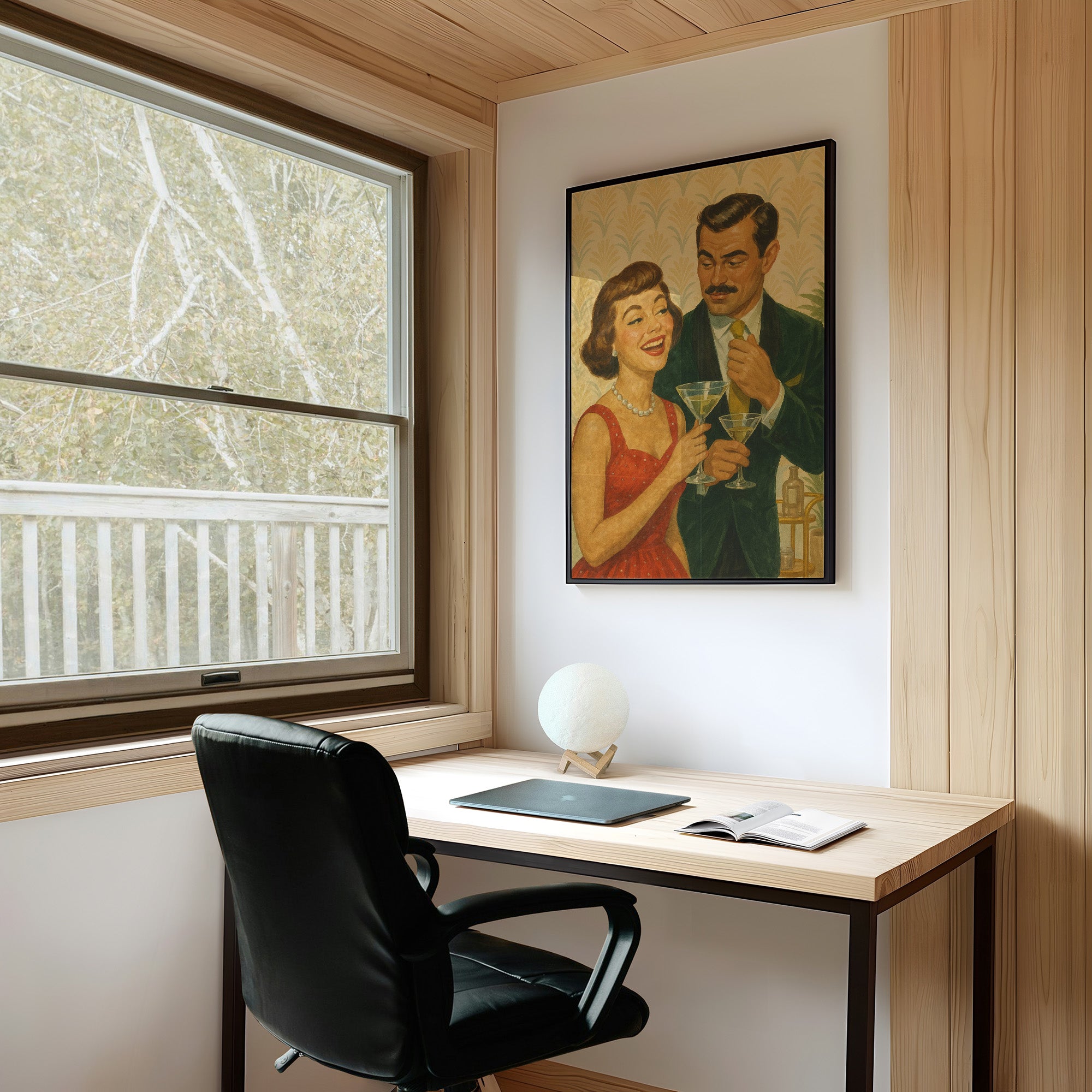 This vintage-style illustration captures the essence of mid-century social elegance. Two figures share martinis against a backdrop of art deco-inspired golden wallpaper with subtle green accents. The composition features a red dress adorned with pearl necklace juxtaposed against a formal dark green suit with yellow tie. The warm color palette and nostalgic painting style evoke the sophisticated cocktail parties of the 1950s, where martini glasses clinked and conversations flowed. The illustration's retro charm is heightened by the careful attention to period-specific fashion details and the warm, golden atmosphere created by the decorative wallpaper pattern.