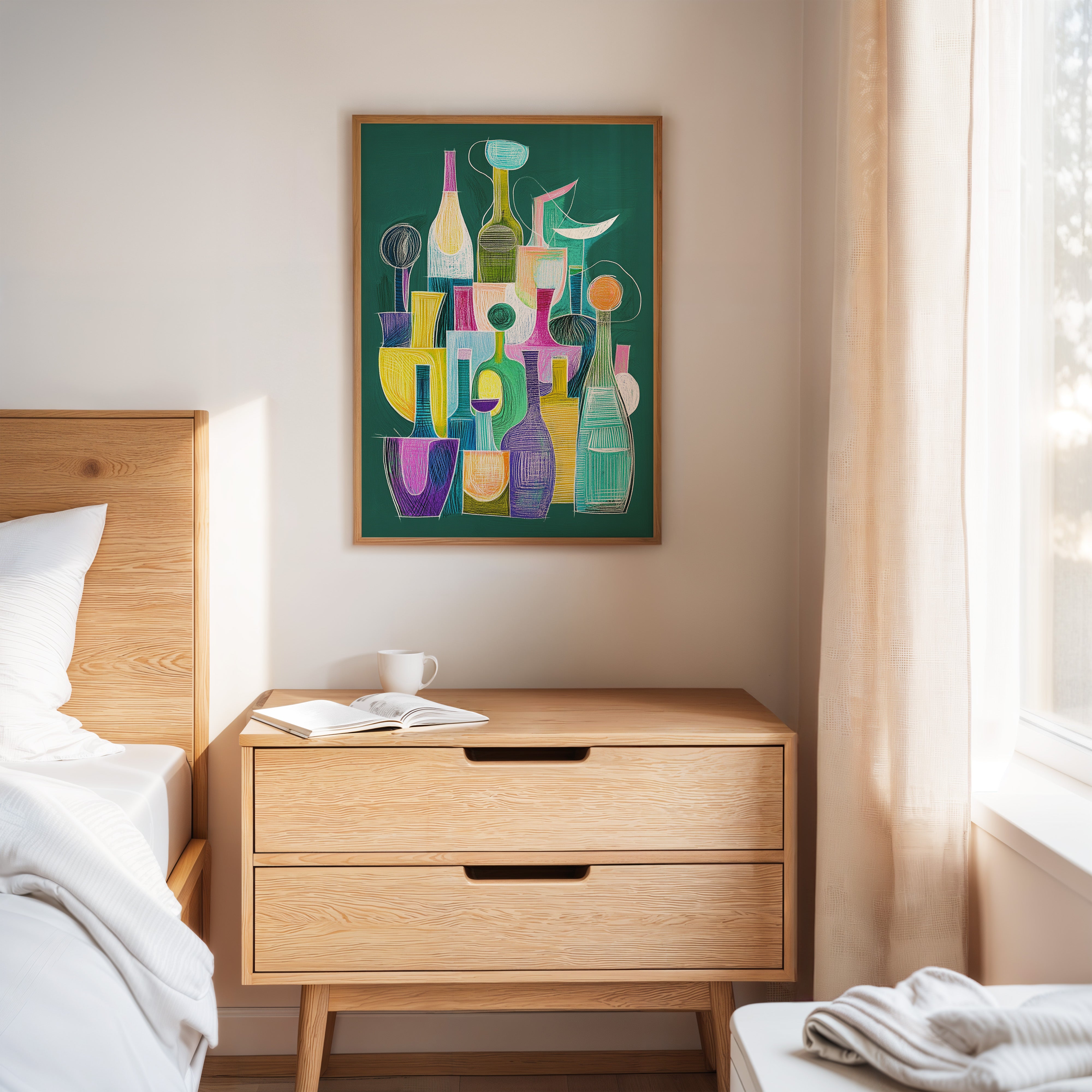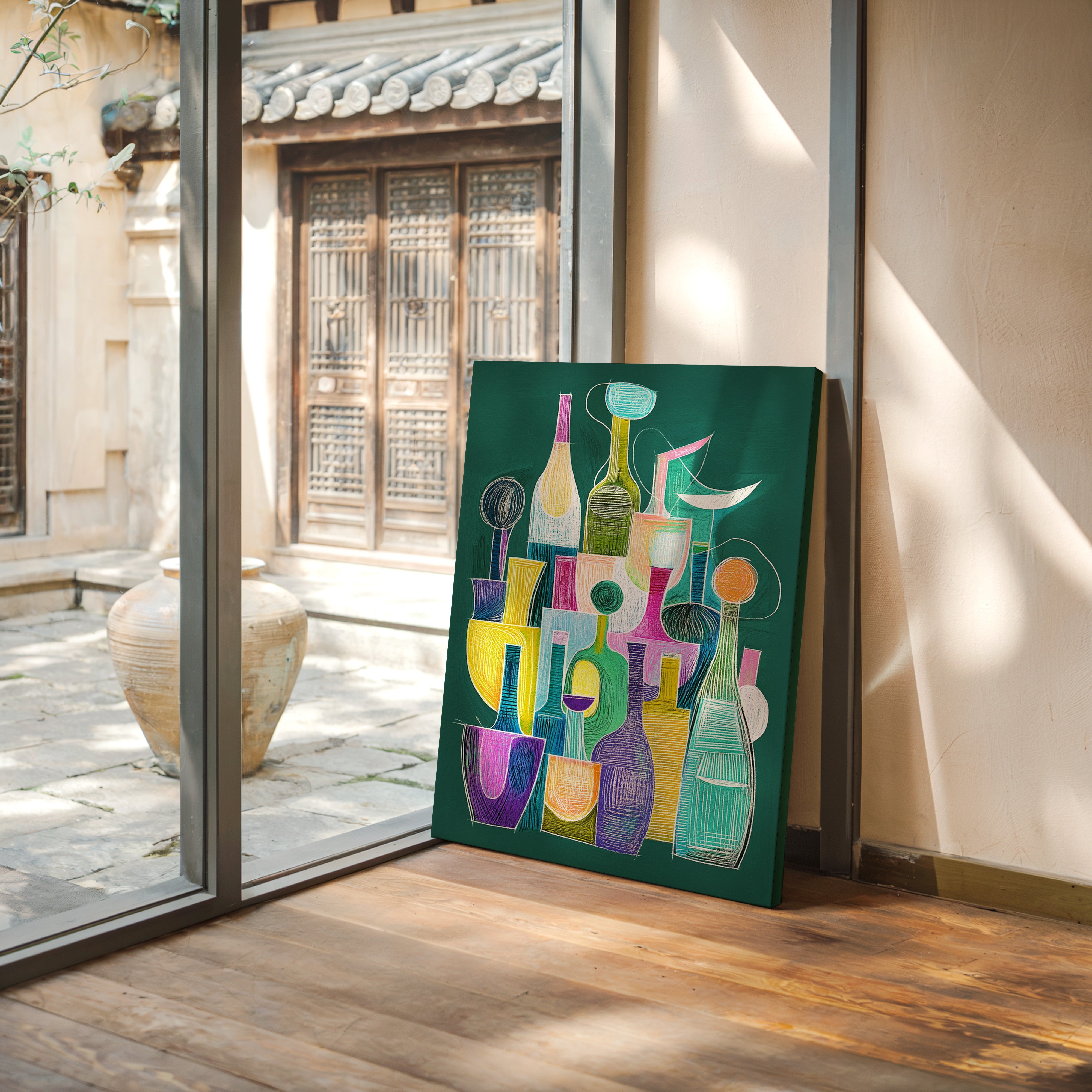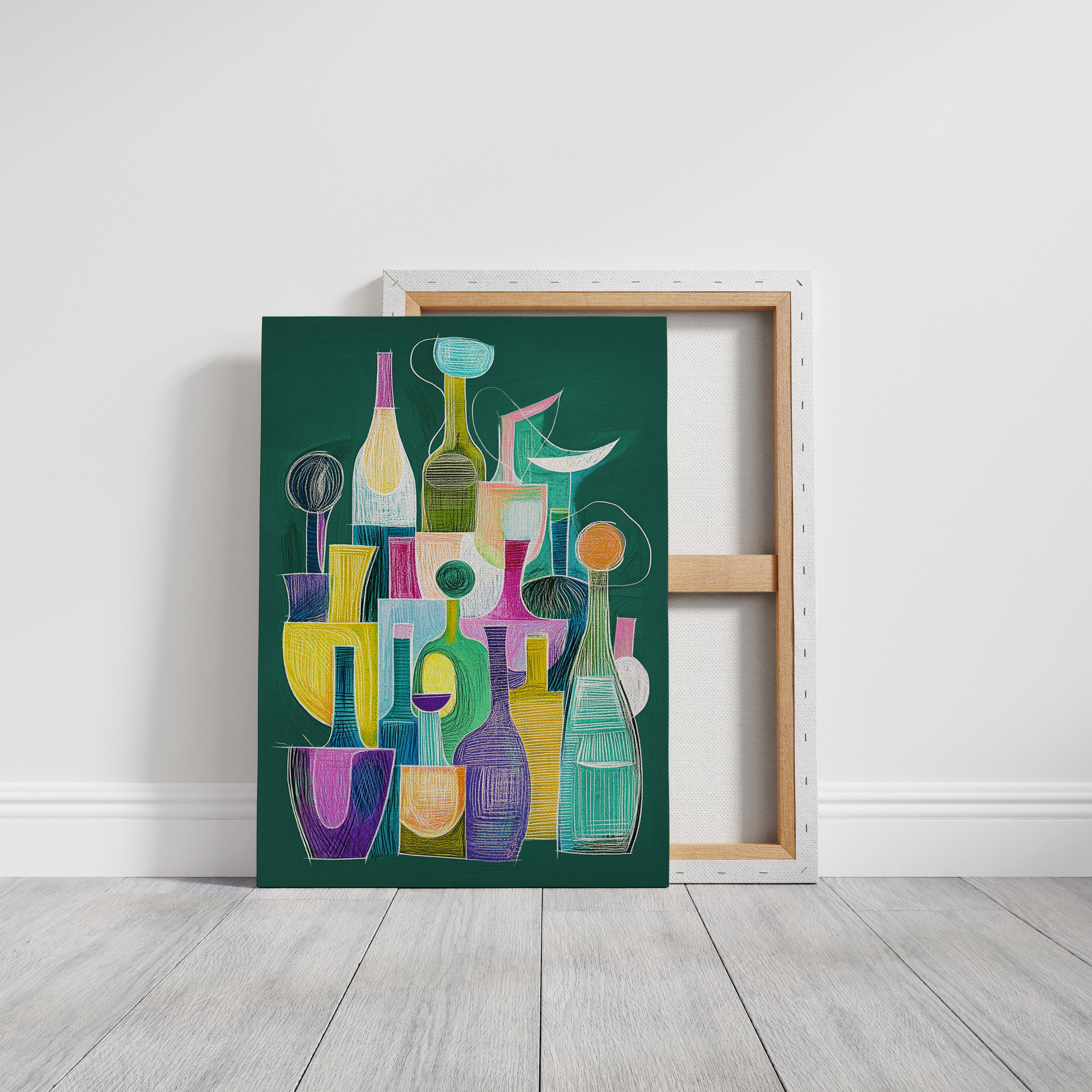A playful dance of bottles and glasses emerges through vibrant chalk-like strokes on an emerald backdrop. The composition weaves together a collection of vessels in whimsical shapes, each one singing with its own personality through bold yellows, dreamy turquoise, passionate purples, and soft pinks. The linear elements and geometric forms create a modern jazz of shapes, suggesting both movement and stillness in their careful arrangement. This piece would bring a sophisticated pop of color and conversation to a contemporary dining room or add artistic flair to a modern kitchen space.
