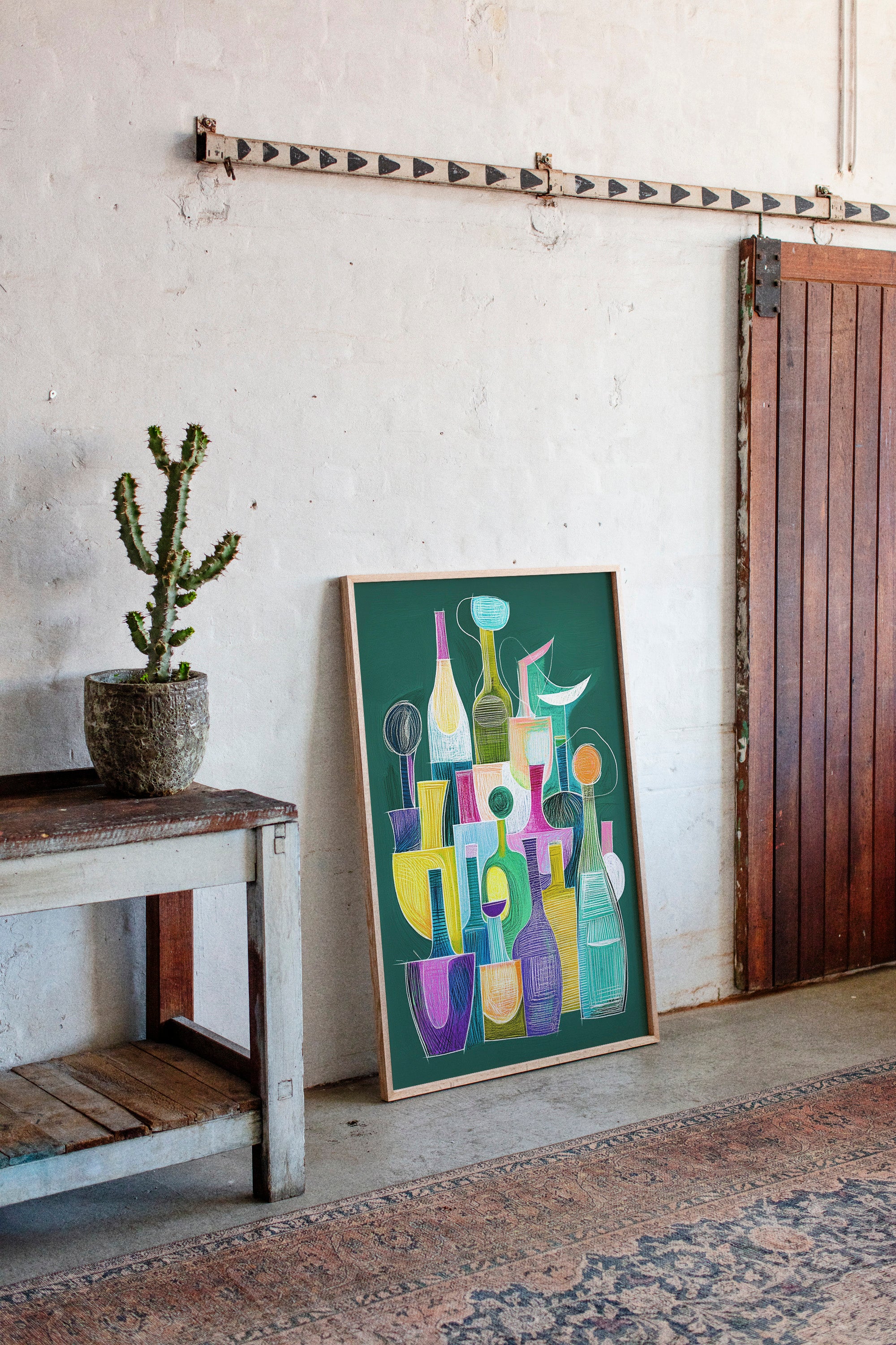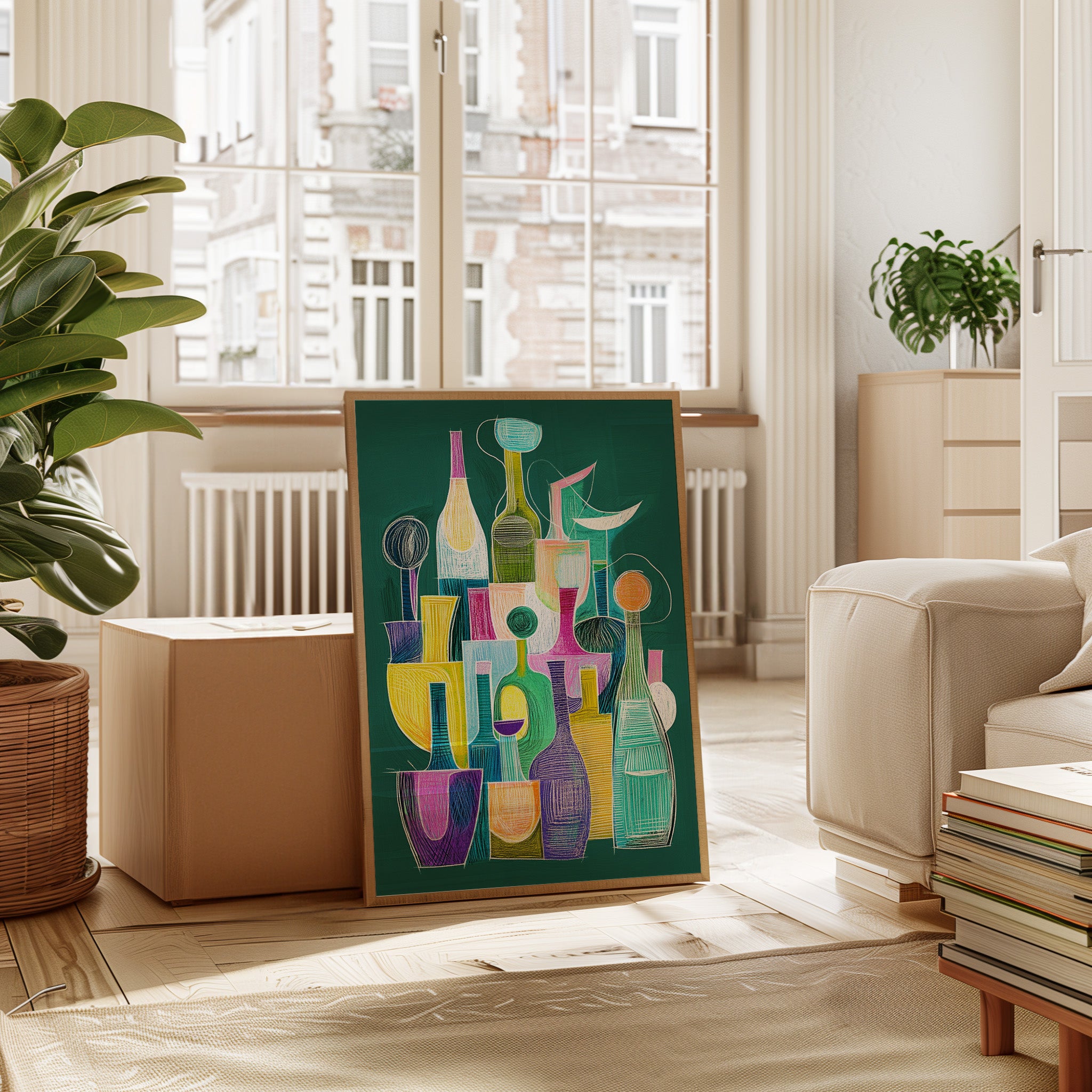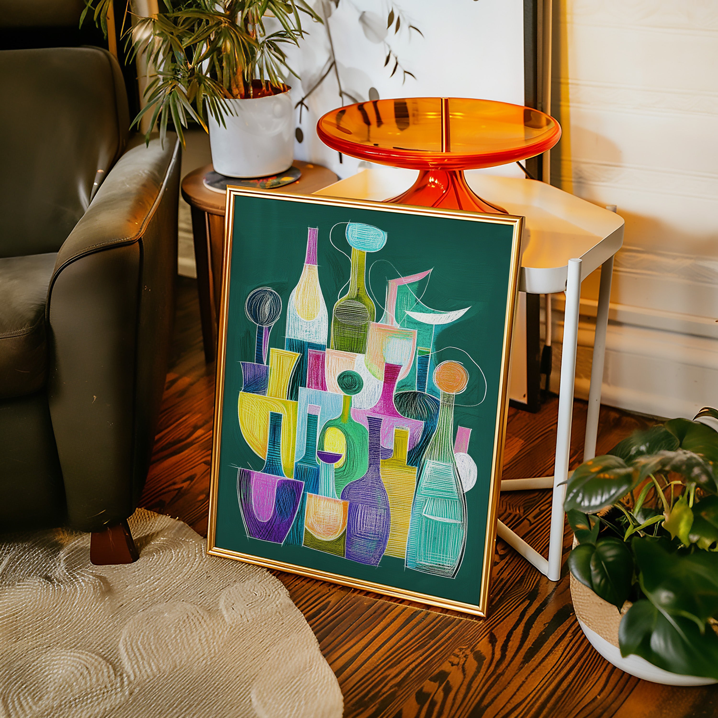 A playful dance of bottles and glasses emerges through vibrant chalk-like strokes on an emerald backdrop. The composition weaves together a collection of vessels in whimsical shapes, each one singing with its own personality through bold yellows, dreamy turquoise, passionate purples, and soft pinks. The linear elements and geometric forms create a modern jazz of shapes, suggesting both movement and stillness in their careful arrangement. This piece would bring a sophisticated pop of color and conversation to a contemporary dining room or add artistic flair to a modern kitchen space.