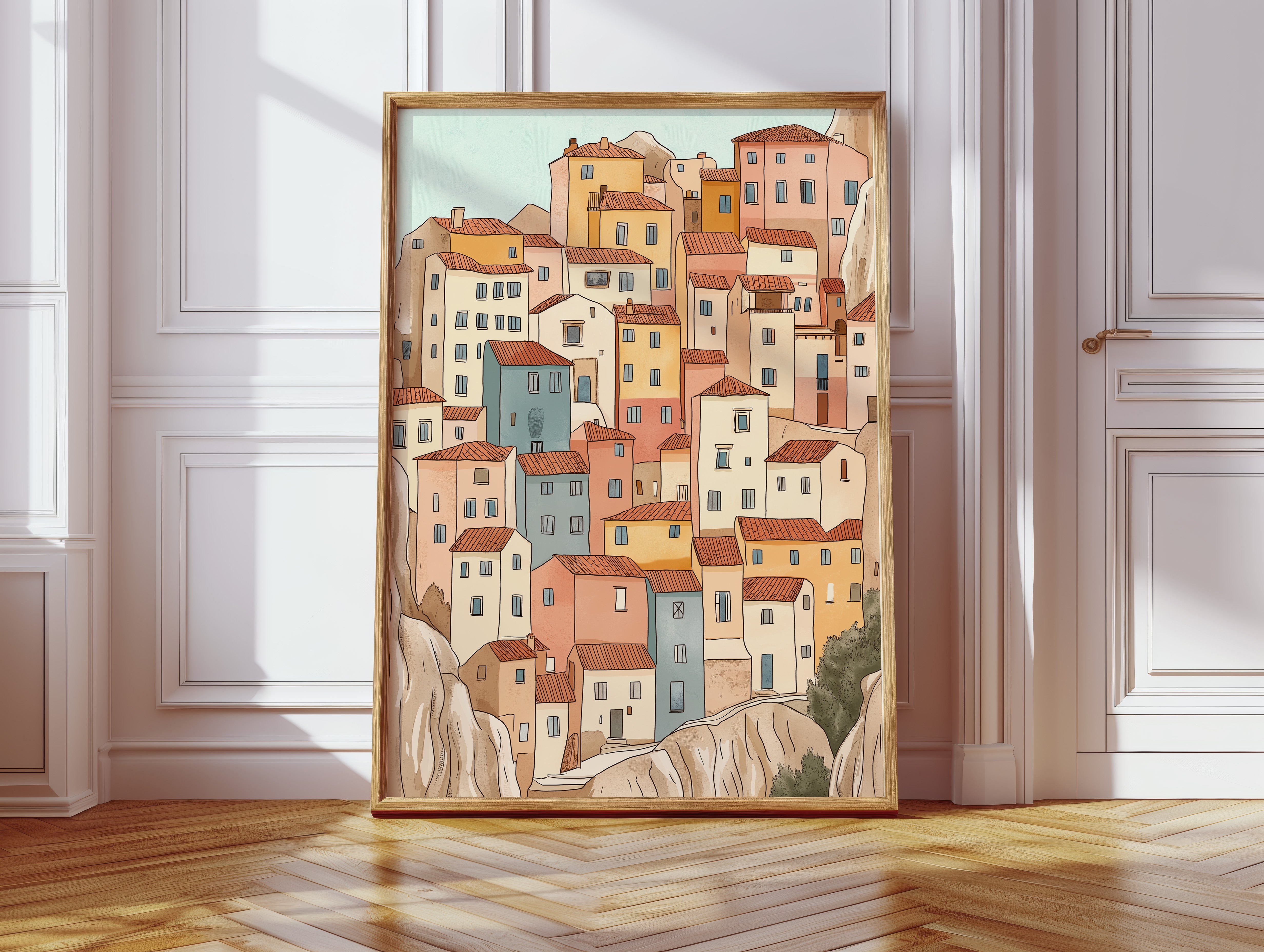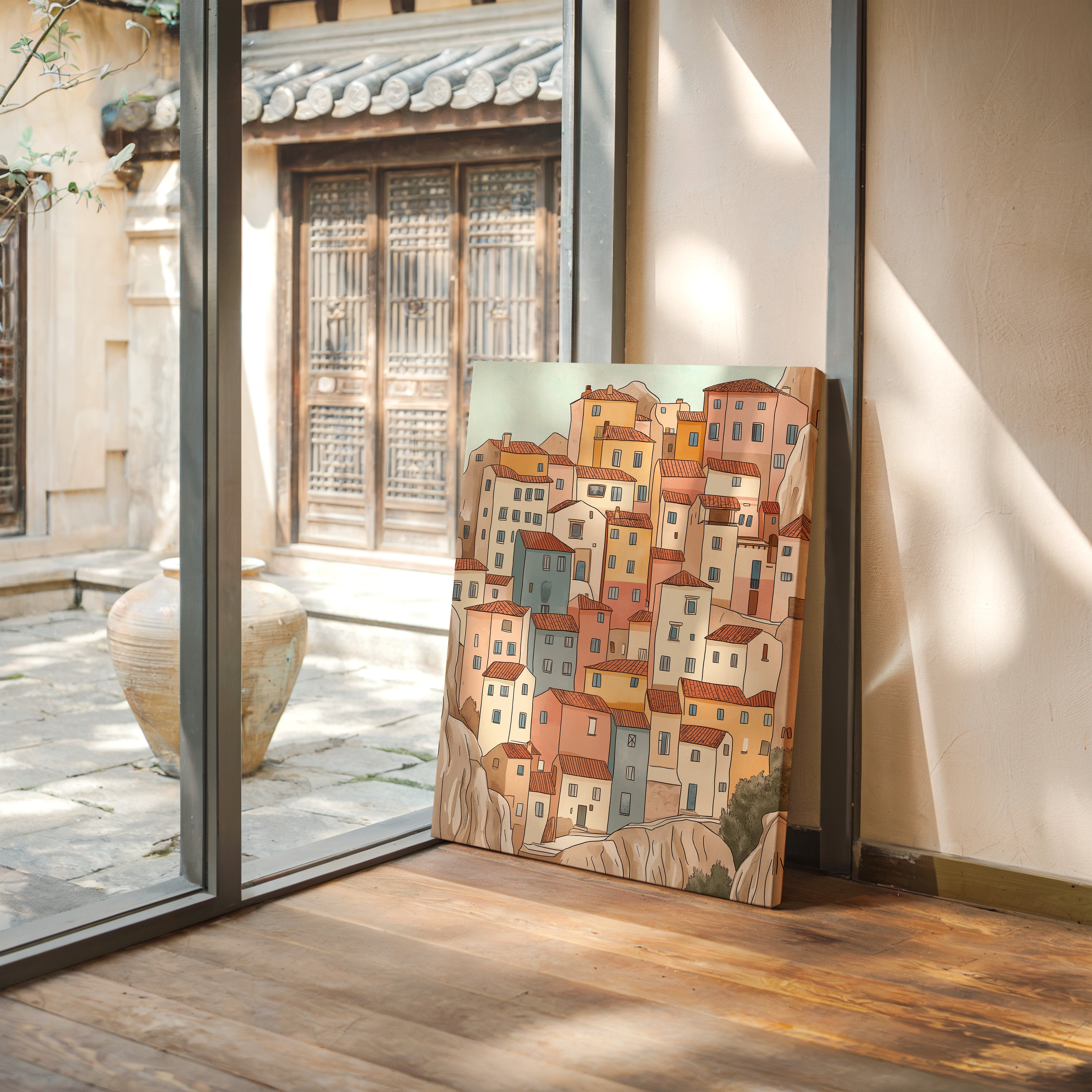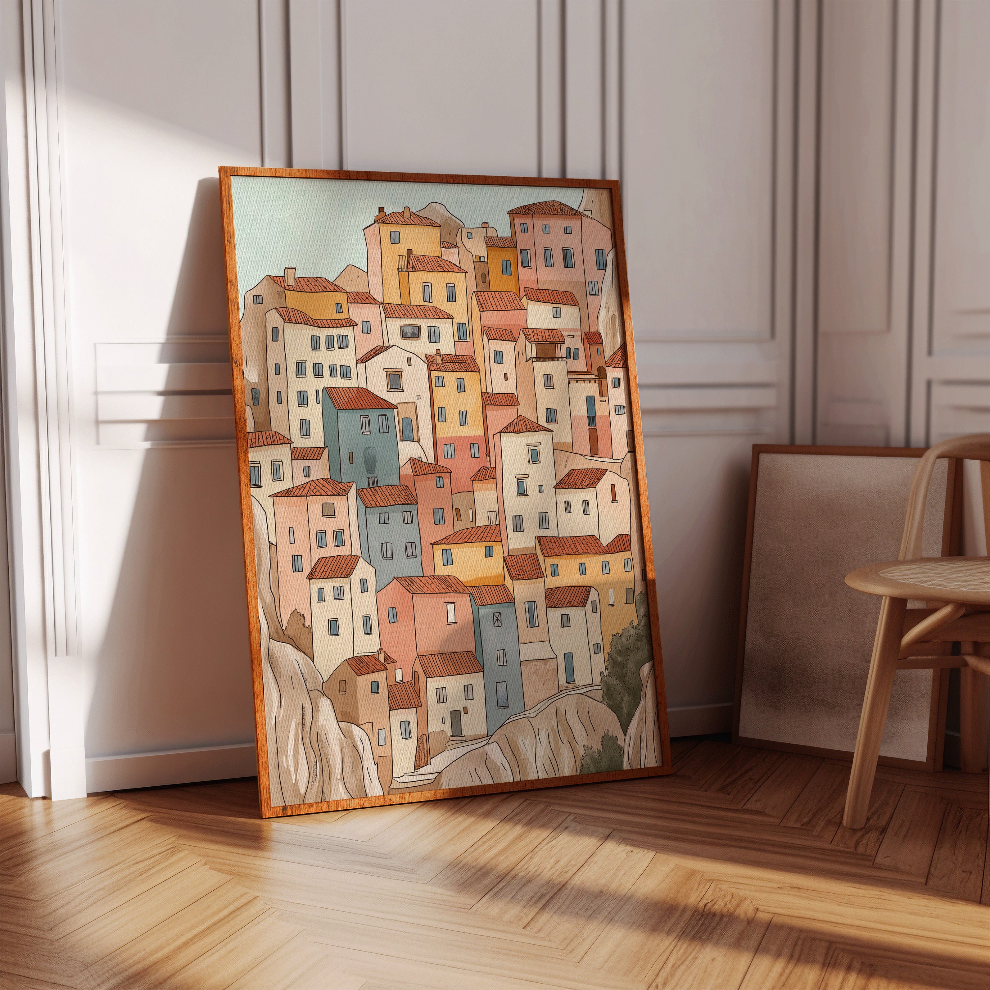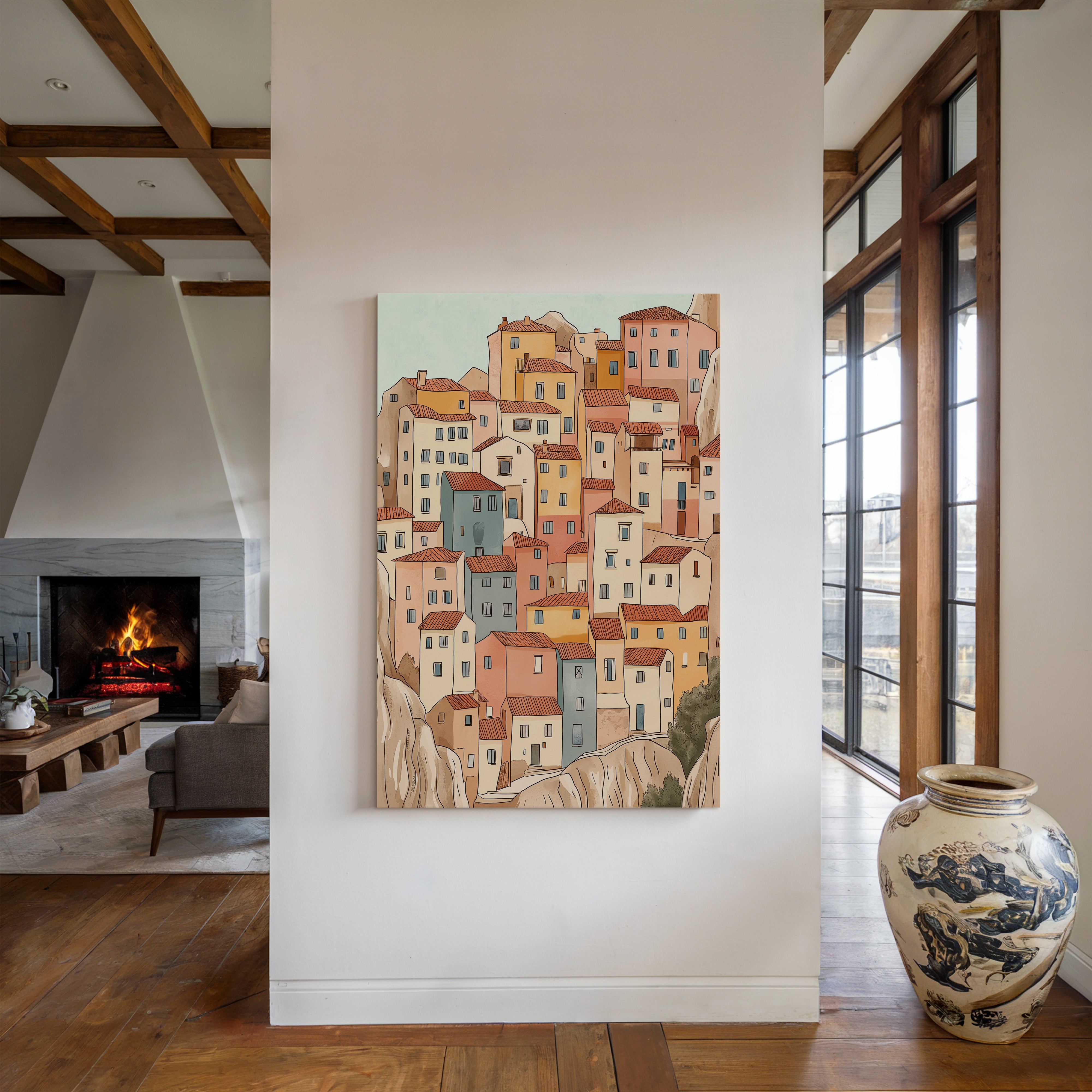 A lively hillside of pastel and sunwashed homes stacks along rugged cliffs, capturing the warmth and charm of a Mediterranean townscape. This artwork radiates joyful nostalgia and a sense of adventure.