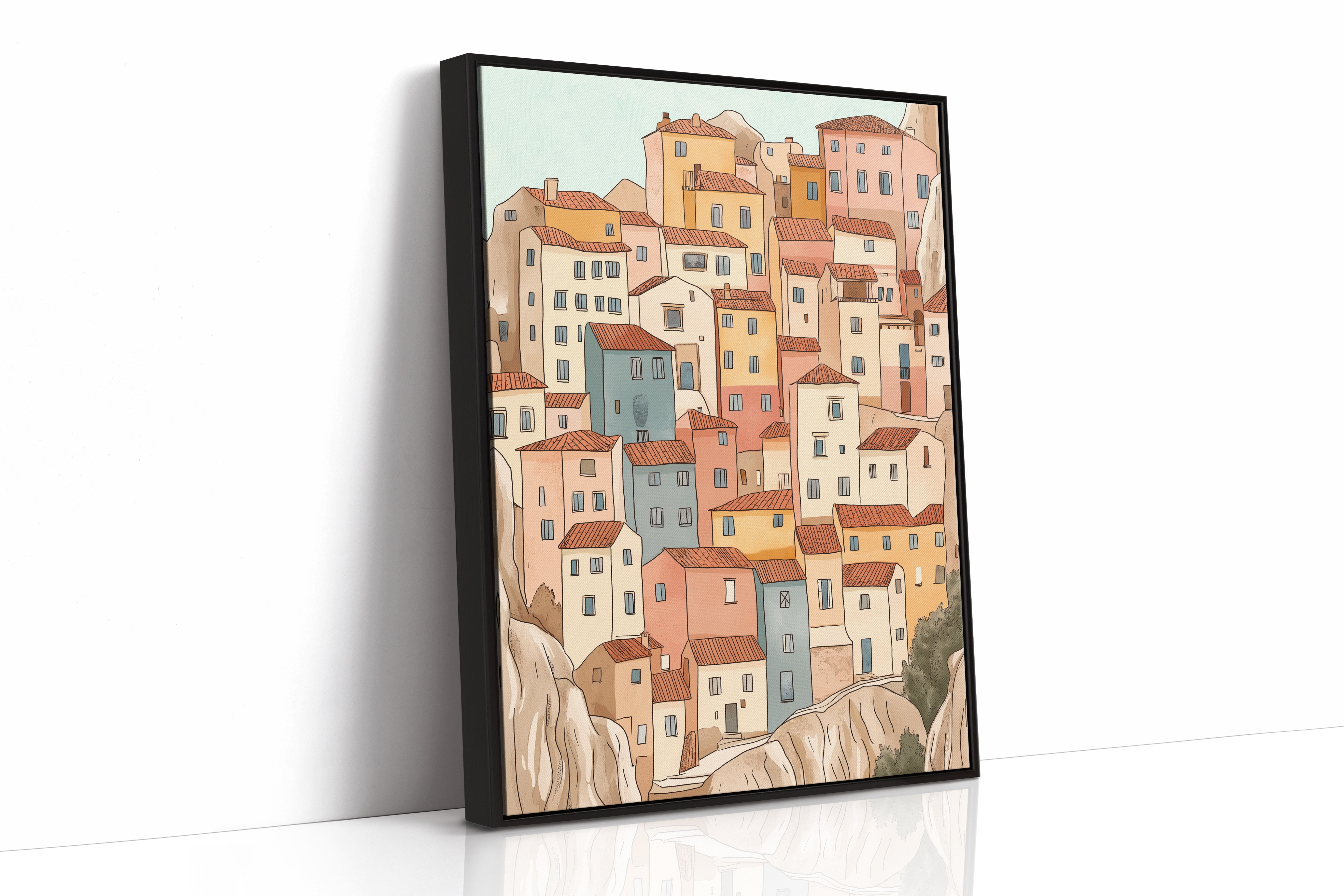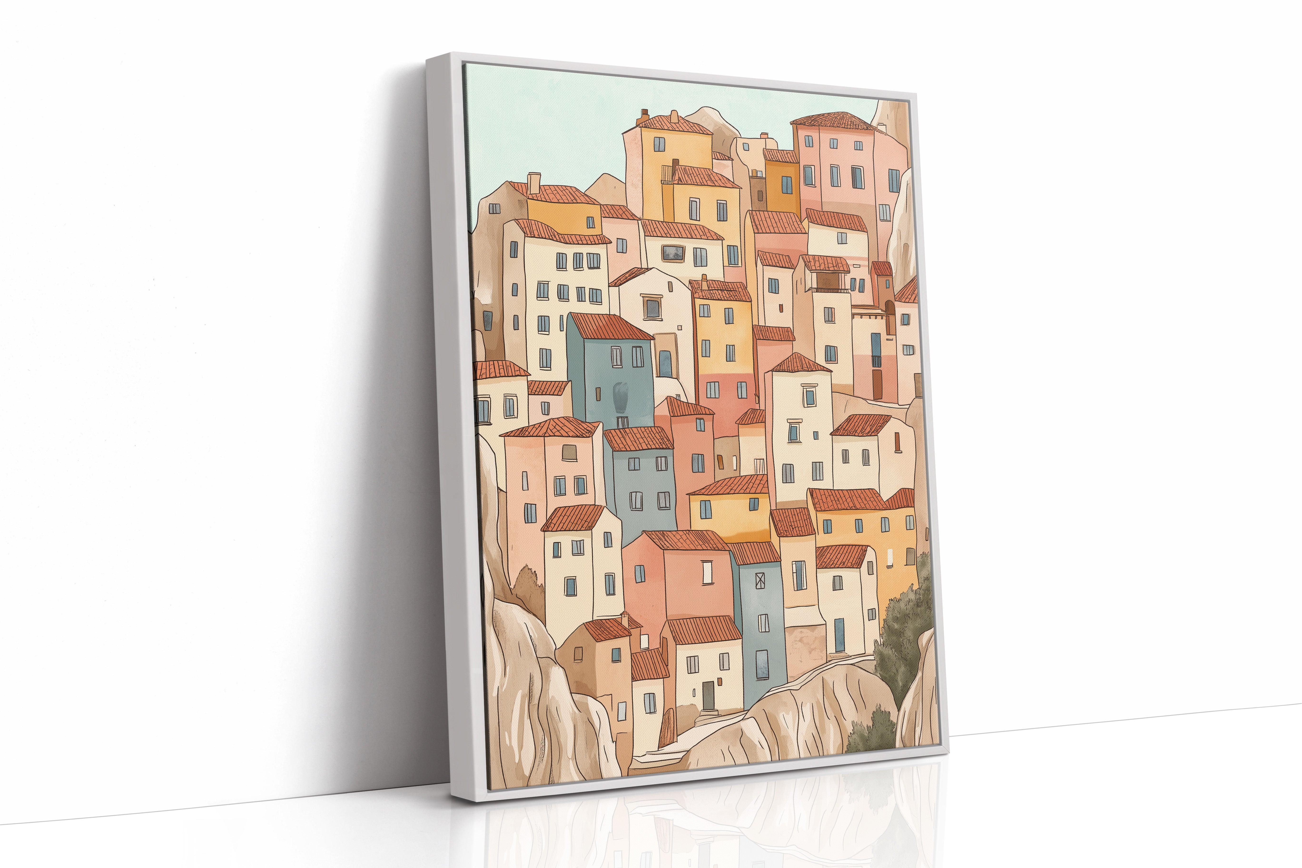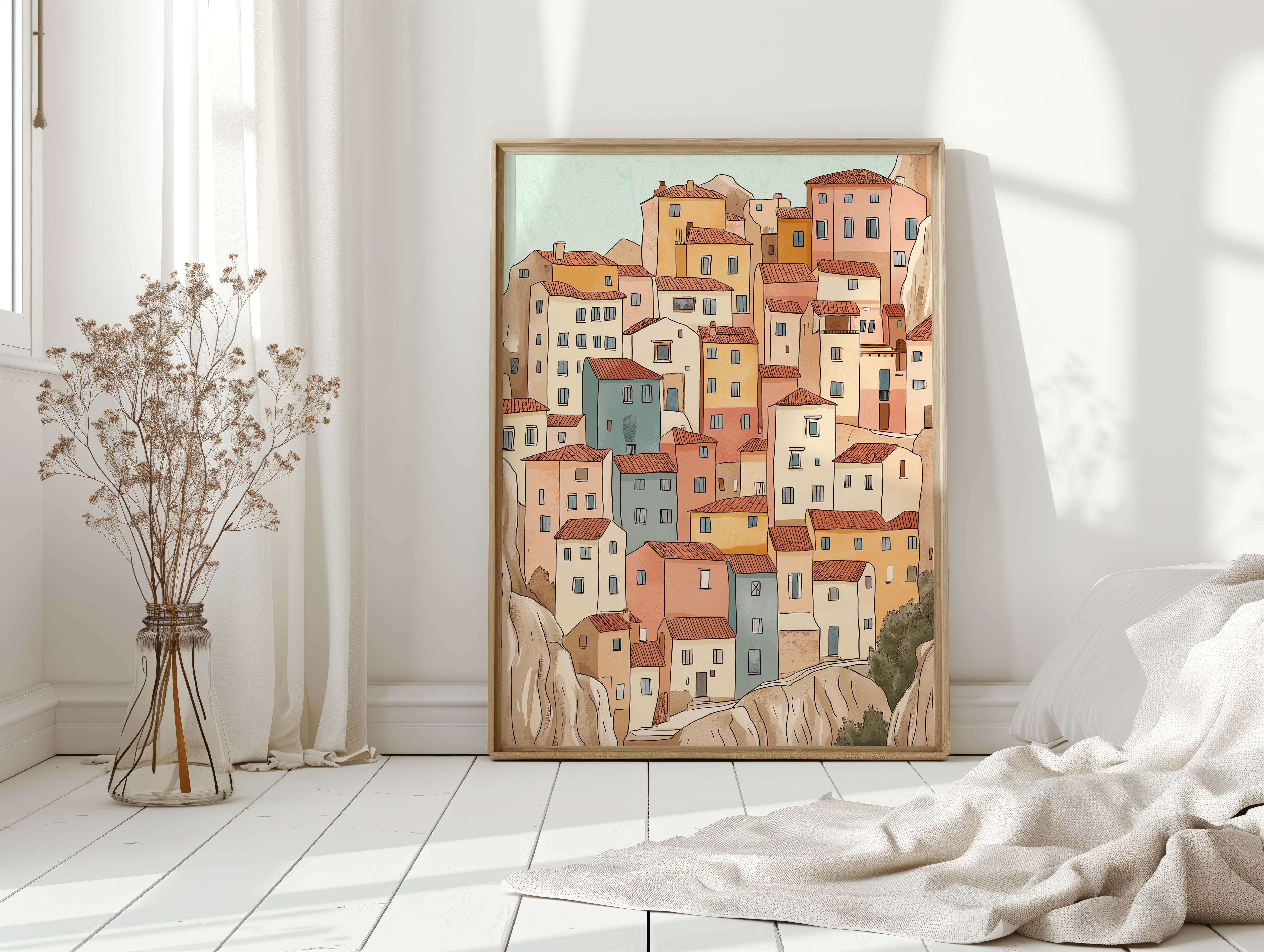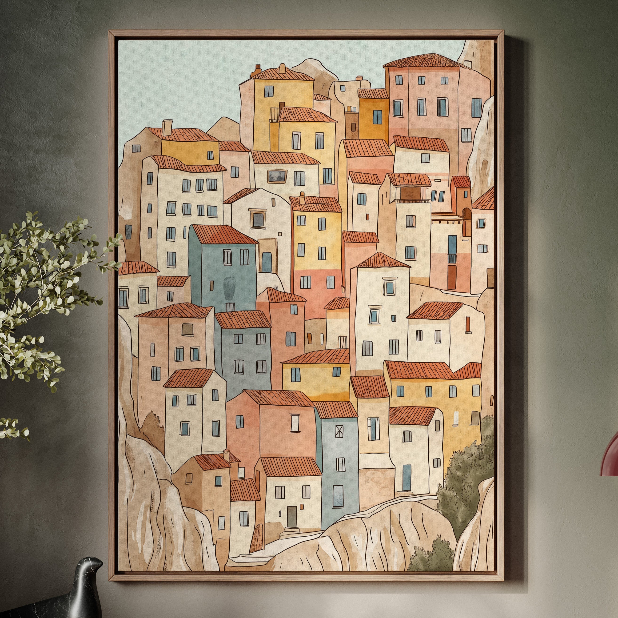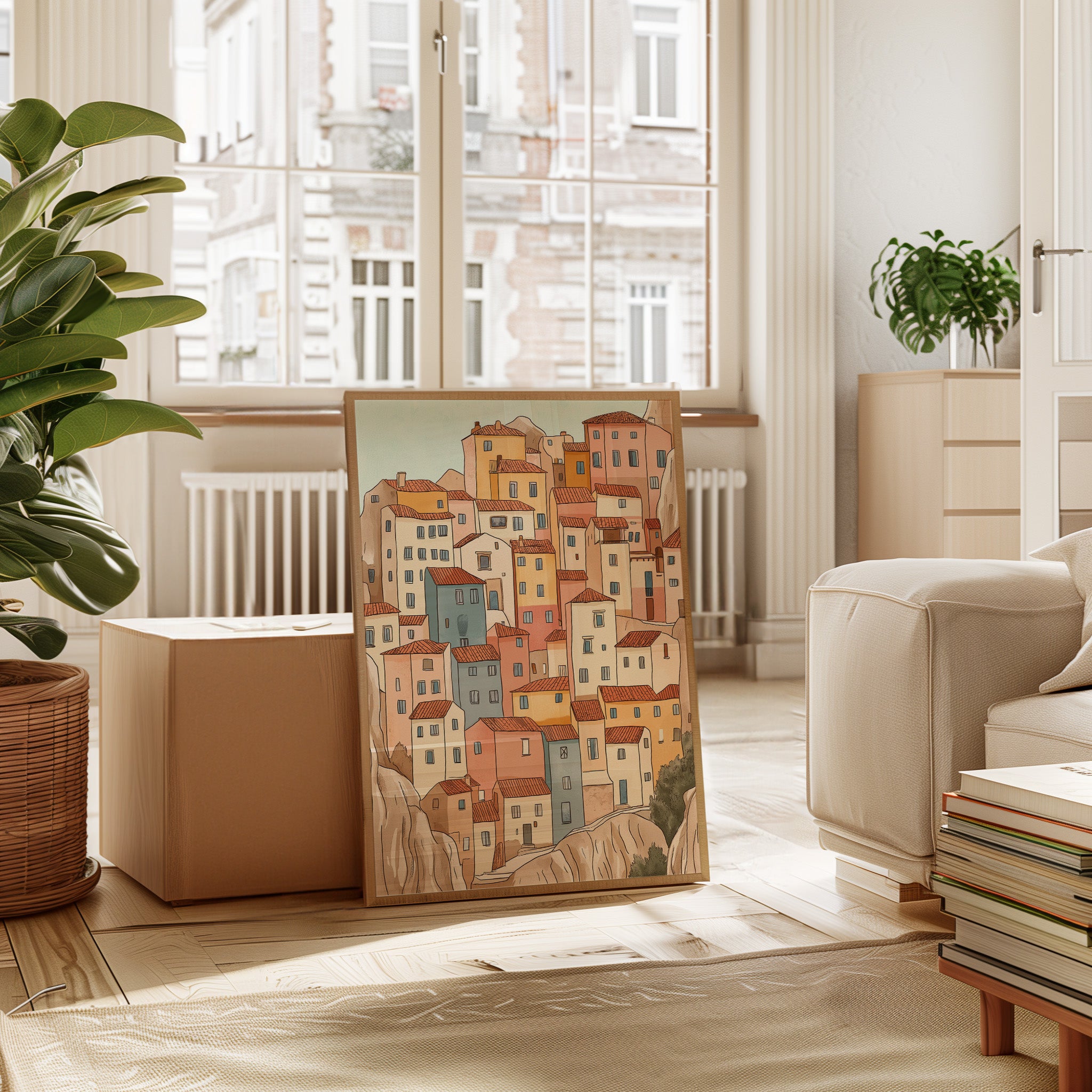 A lively hillside of pastel and sunwashed homes stacks along rugged cliffs, capturing the warmth and charm of a Mediterranean townscape. This artwork radiates joyful nostalgia and a sense of adventure.