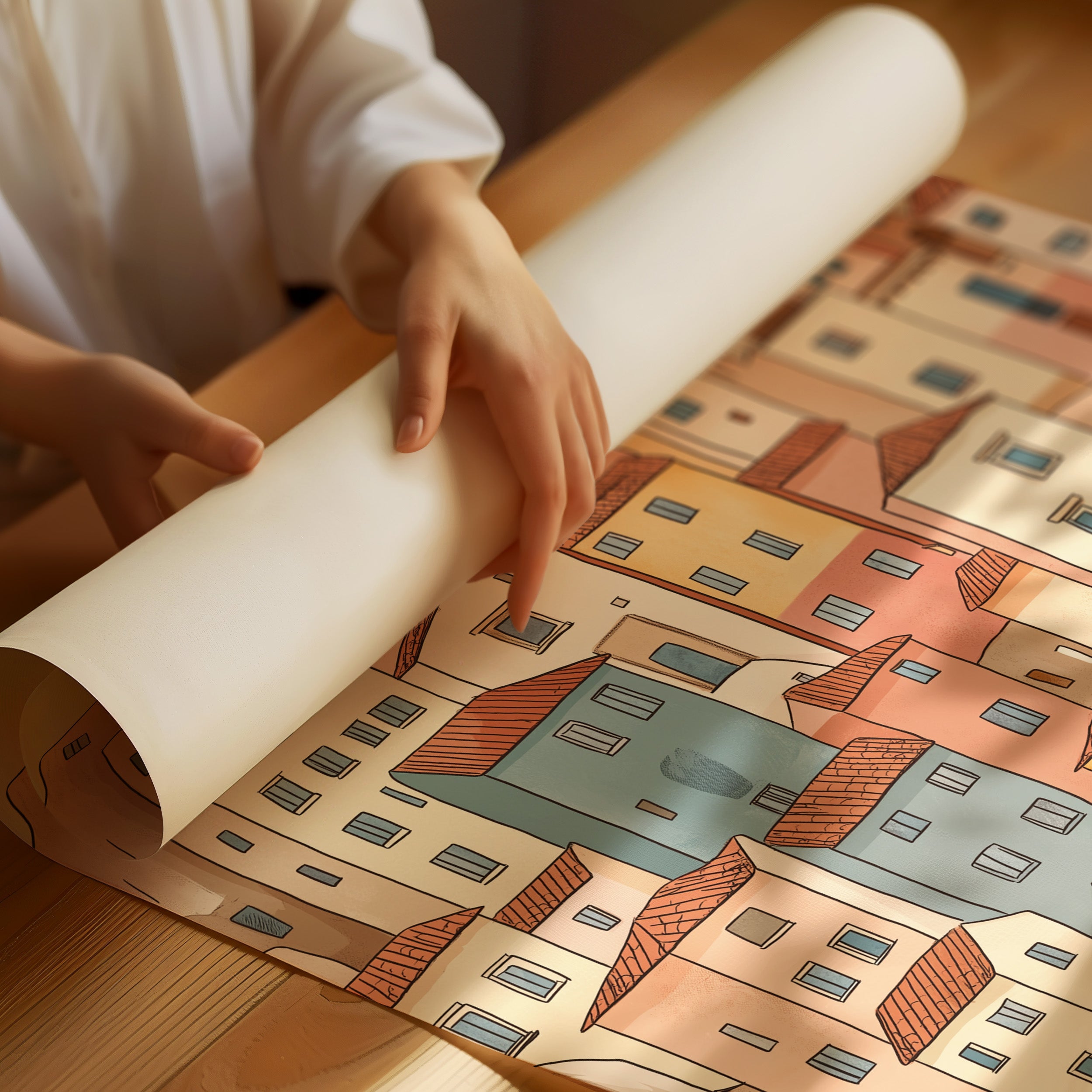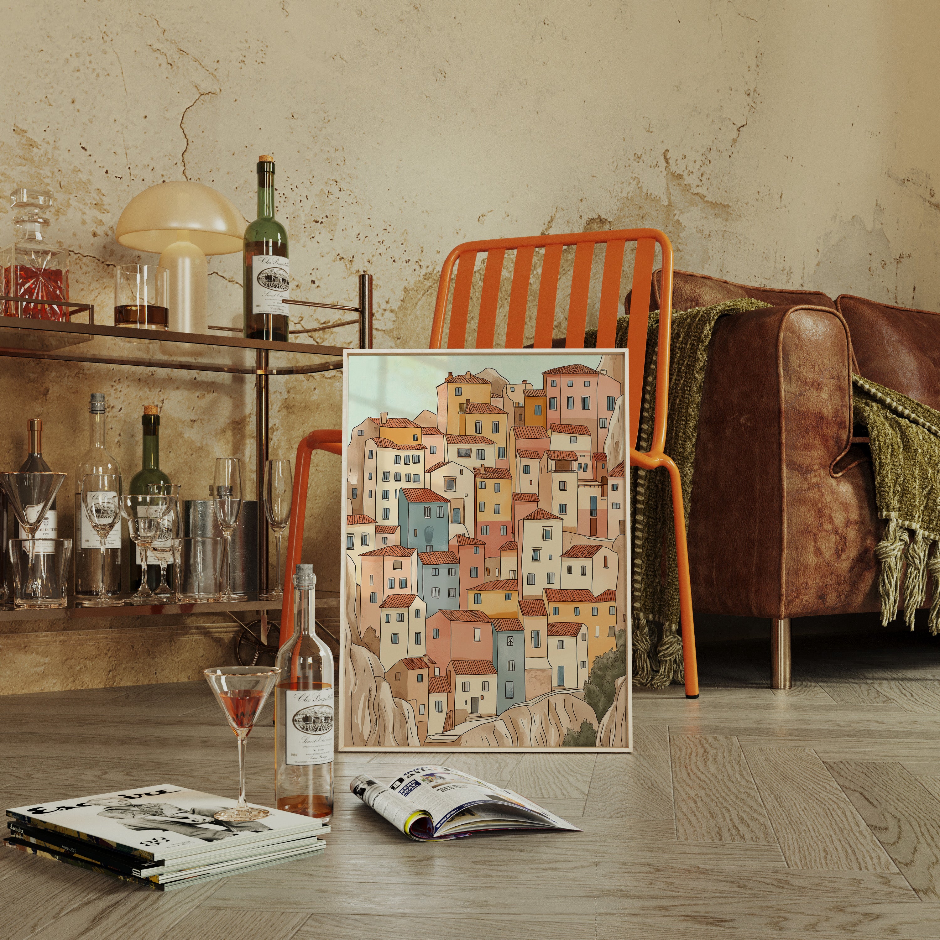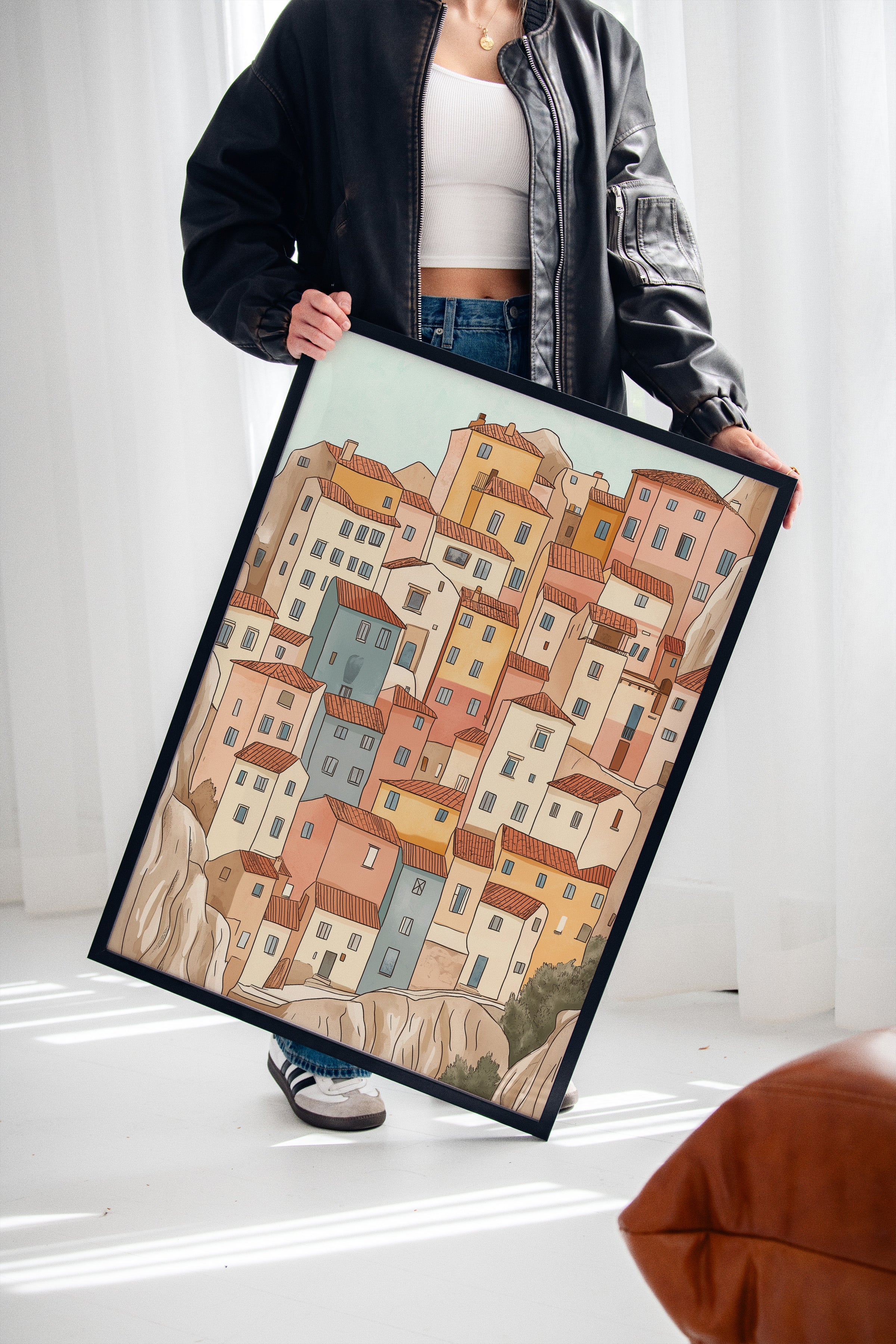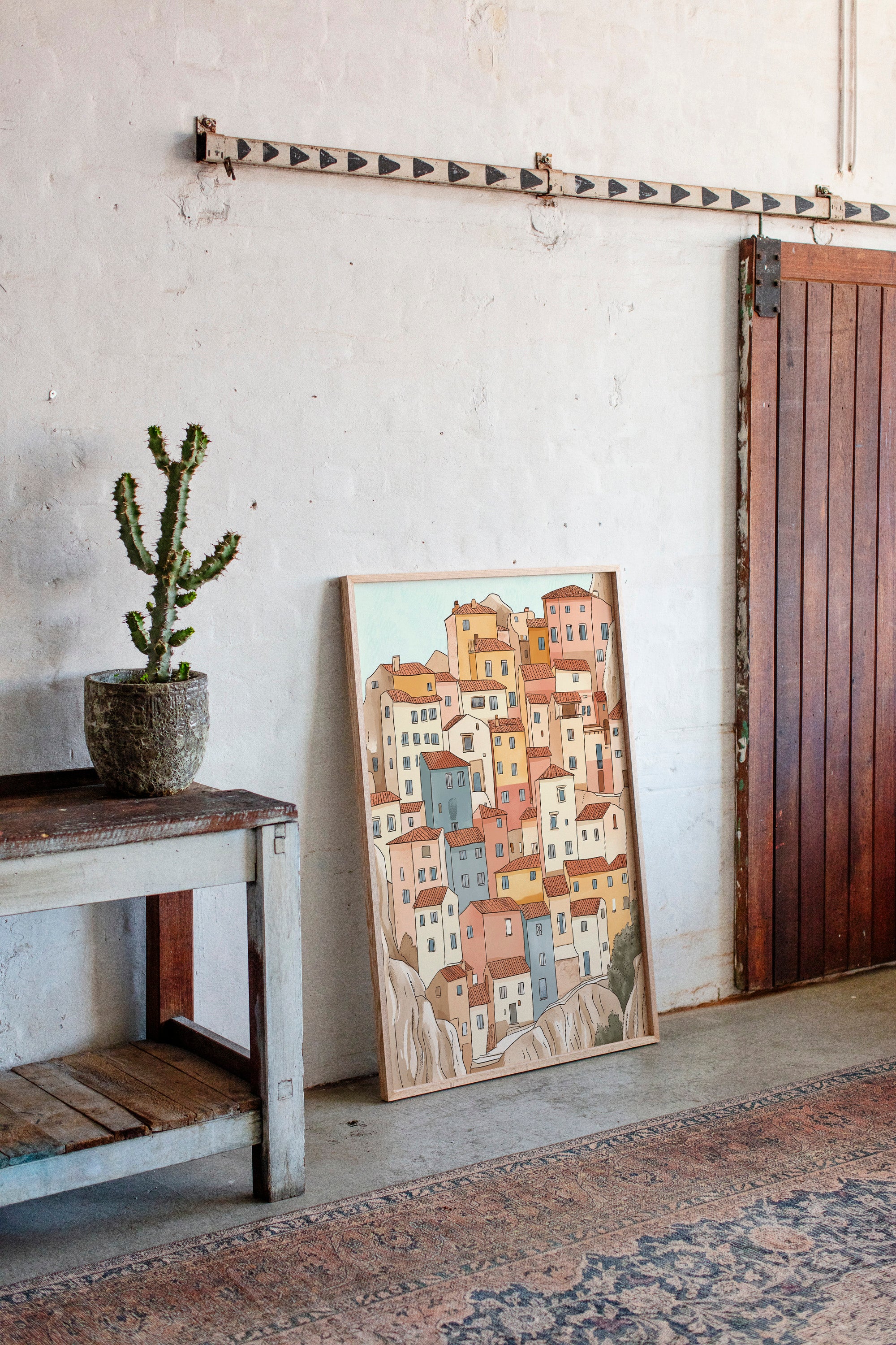 A lively hillside of pastel and sunwashed homes stacks along rugged cliffs, capturing the warmth and charm of a Mediterranean townscape. This artwork radiates joyful nostalgia and a sense of adventure.