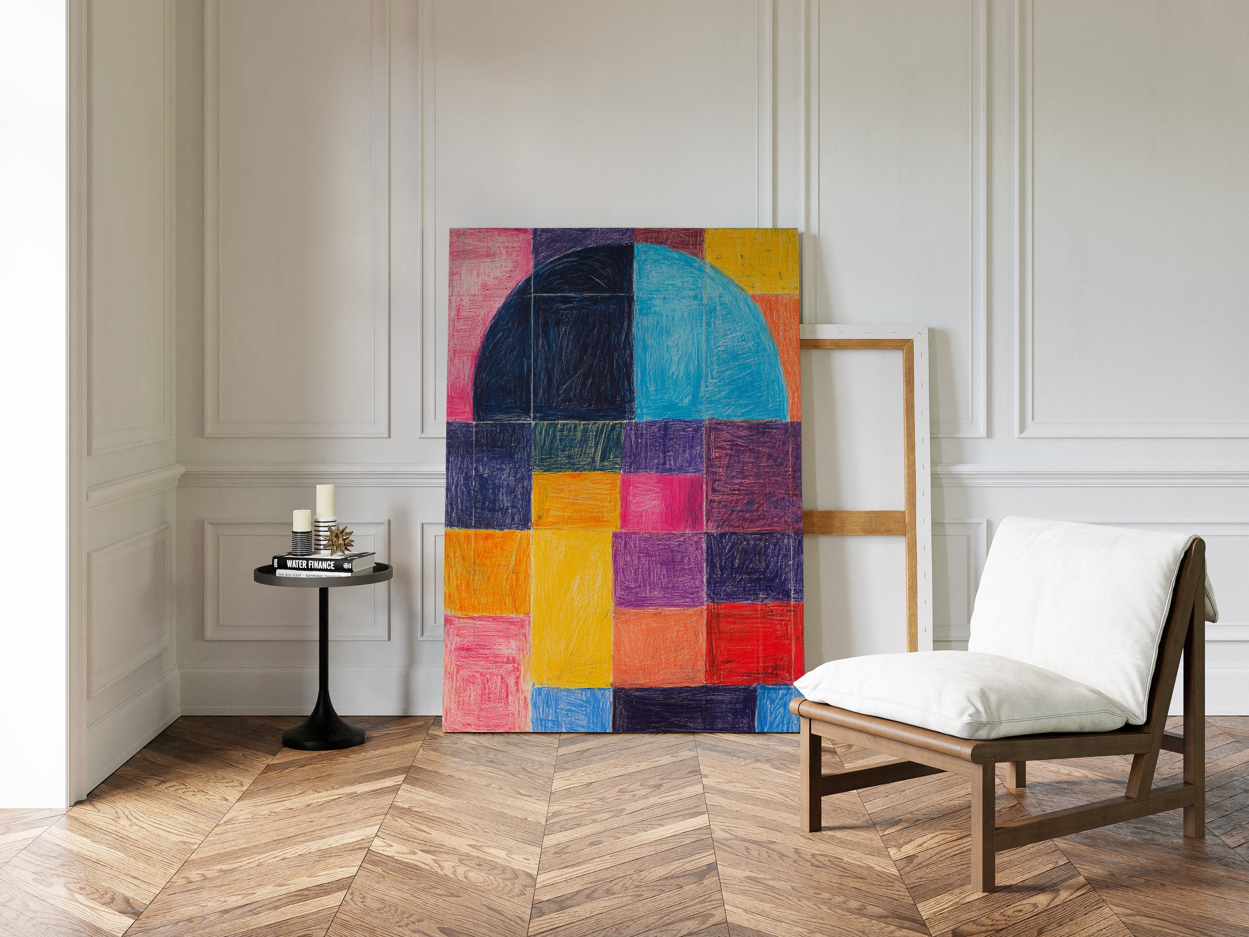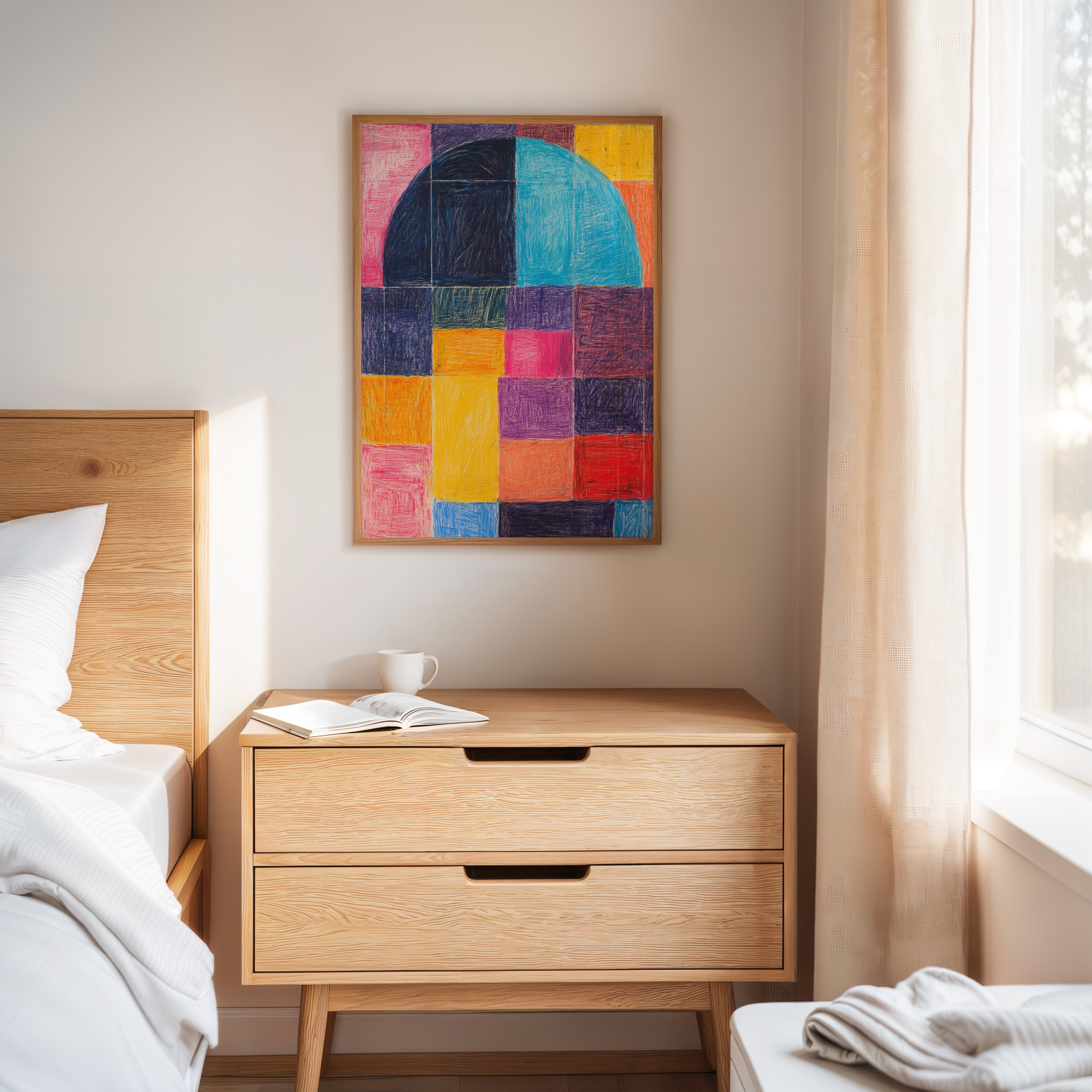Vibrant squares of color pulse with urban energy, each block a window into different moods and moments. Bold strokes of pink, yellow, and turquoise create a rhythmic patchwork against deep navy anchors, while textured brushwork adds a raw, emotional quality to each geometric space. The composition speaks of city lights at dusk, when buildings become a mosaic of illuminated stories. Perfect for modern spaces seeking a bold statement piece, this contemporary abstract brings dynamic energy to minimalist interiors or adds sophisticated color to neutral rooms.