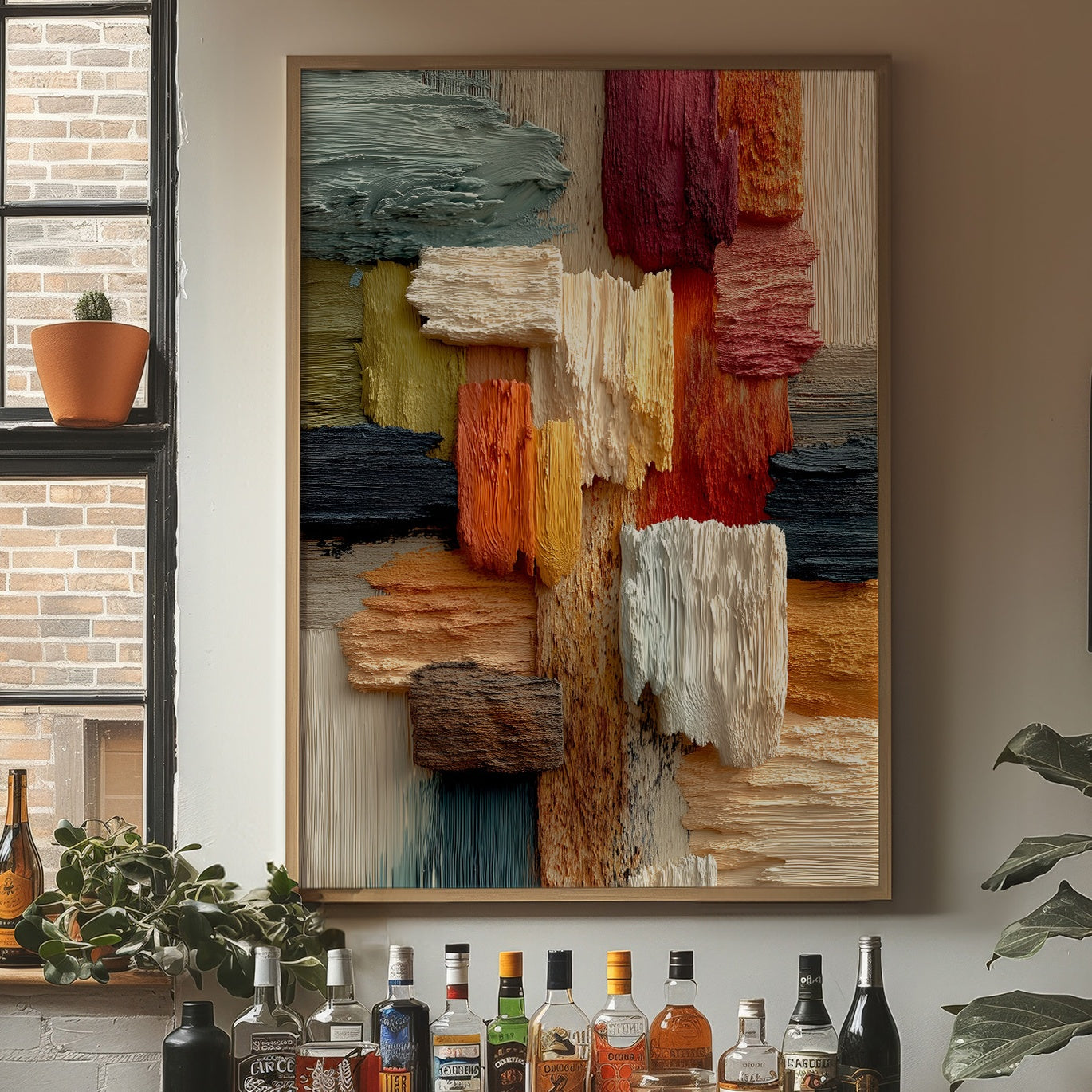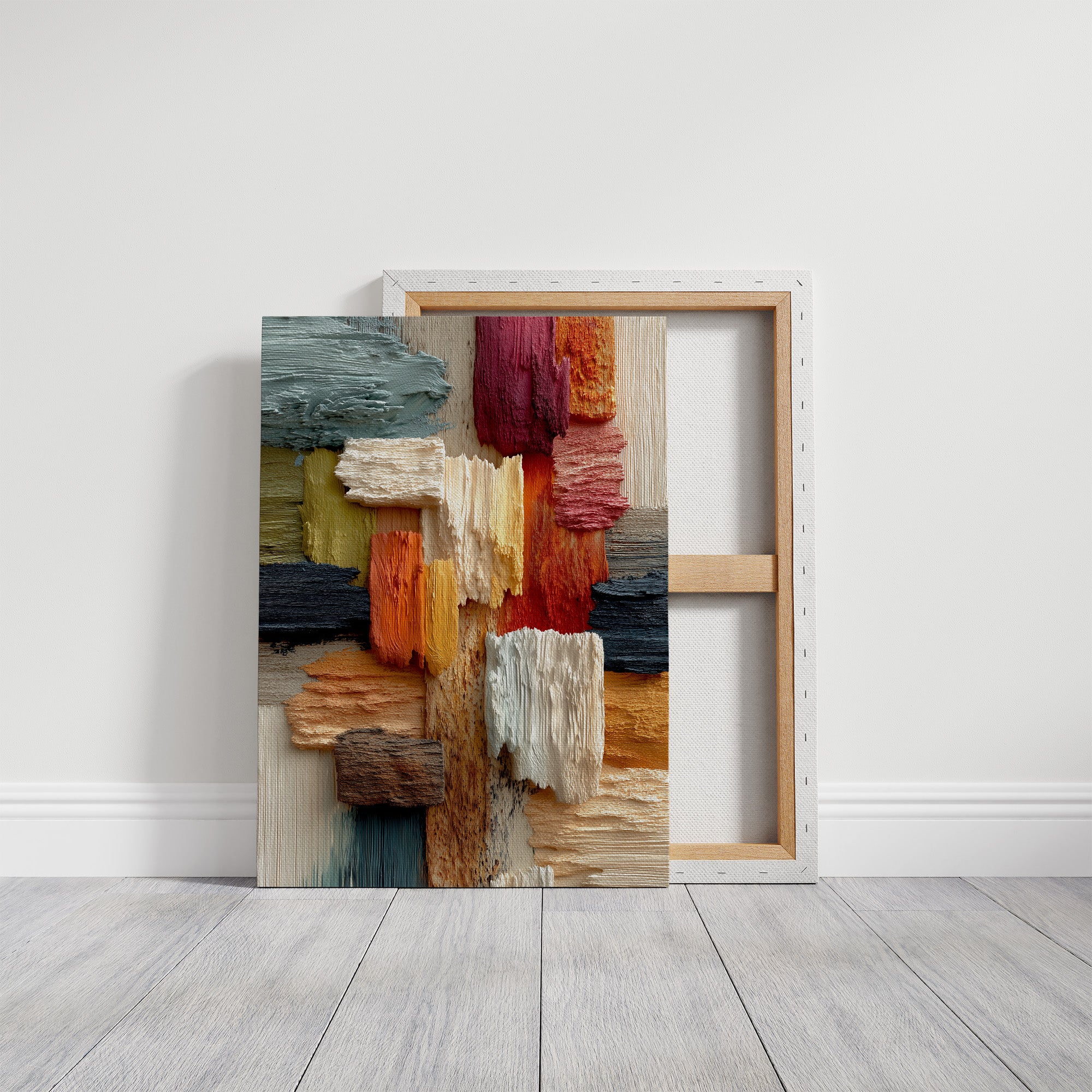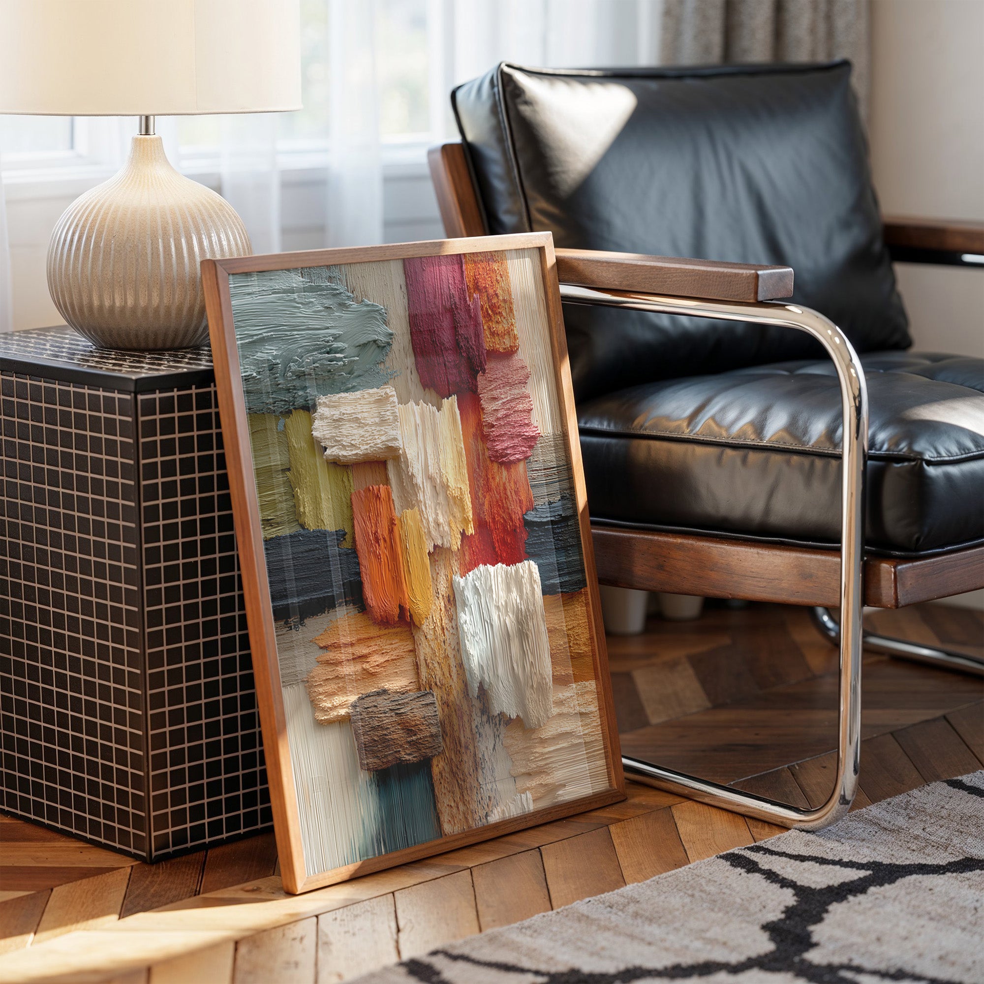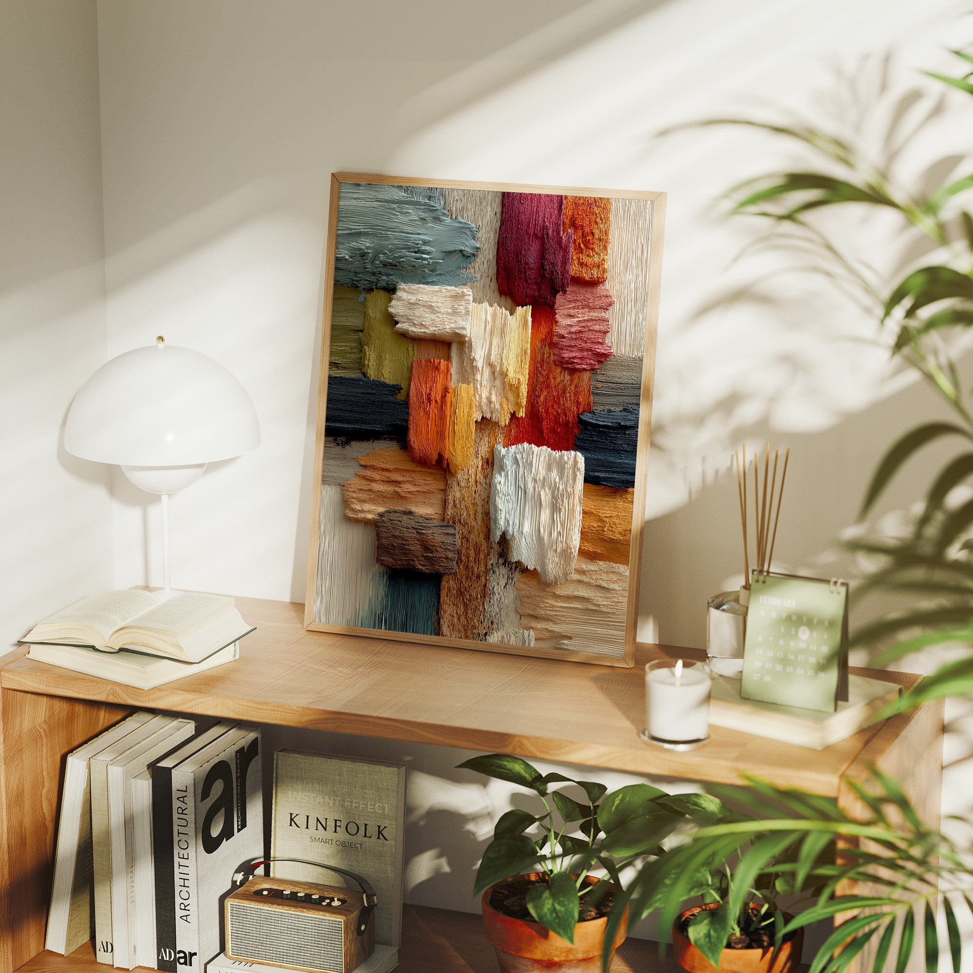 Textured brushstrokes catch the gentle morning sun, creating a symphony of earth tones and bold accents. Rich terracotta mingles with sage green and cream, while touches of burgundy and navy add depth to this contemporary composition. The painting's thick impasto technique creates a tactile landscape of color and movement, each stroke telling its own story of artistic expression. This piece would bring sophisticated warmth to a modern living room or home office, especially when paired with clean-lined furniture and natural materials.