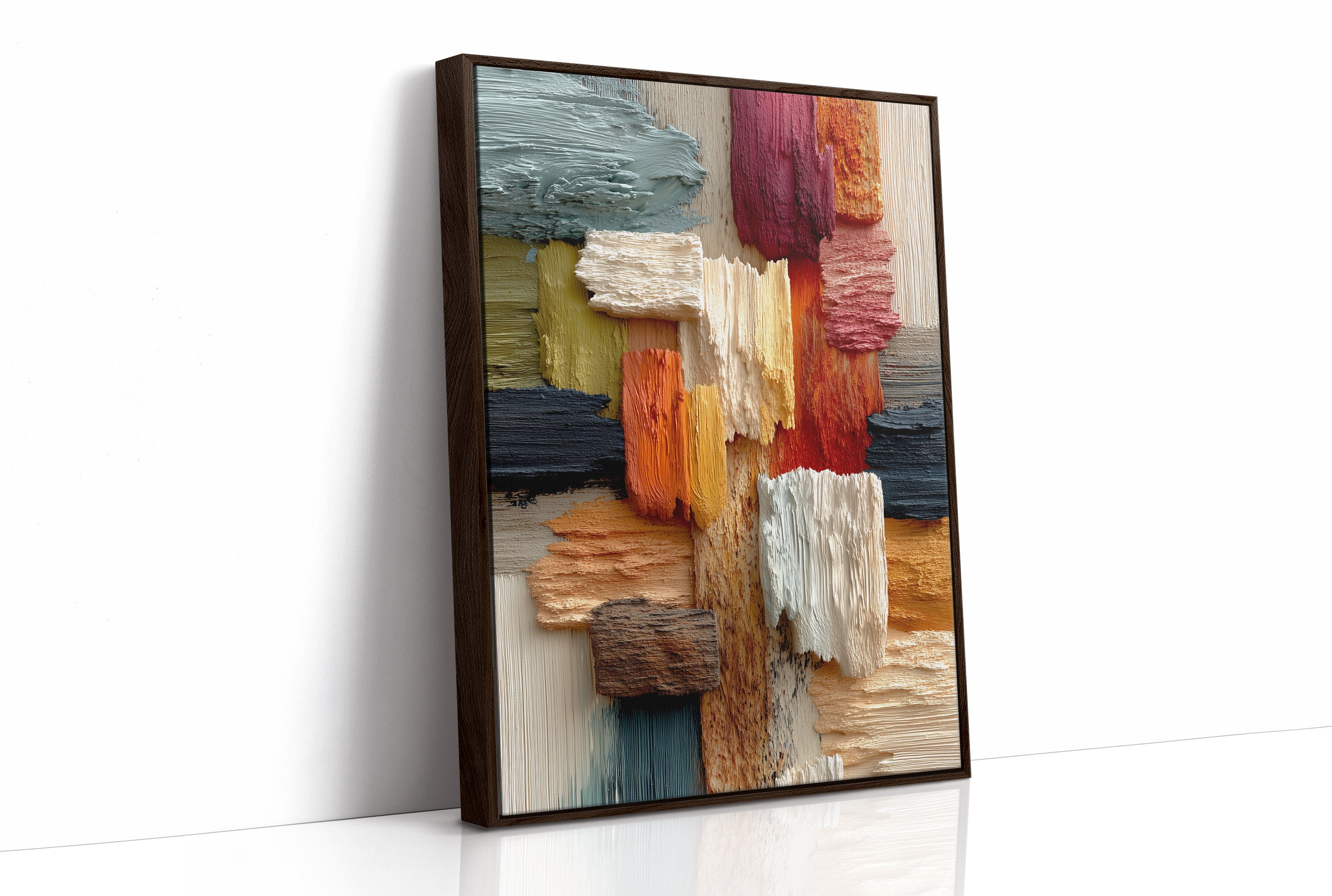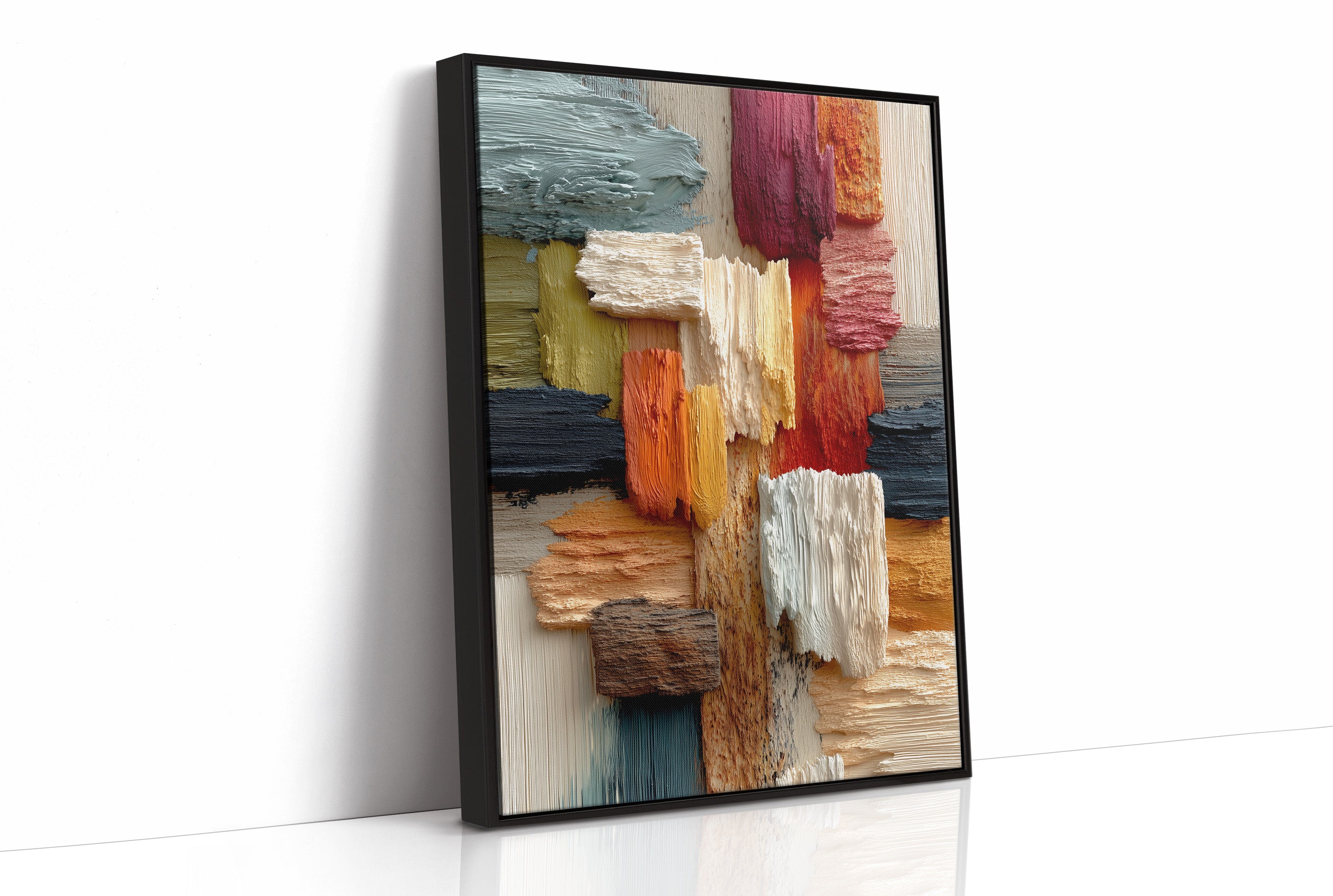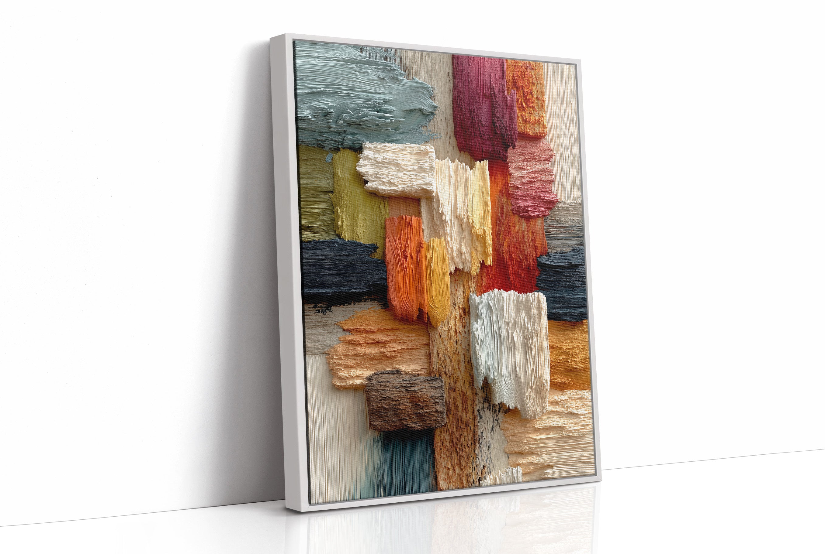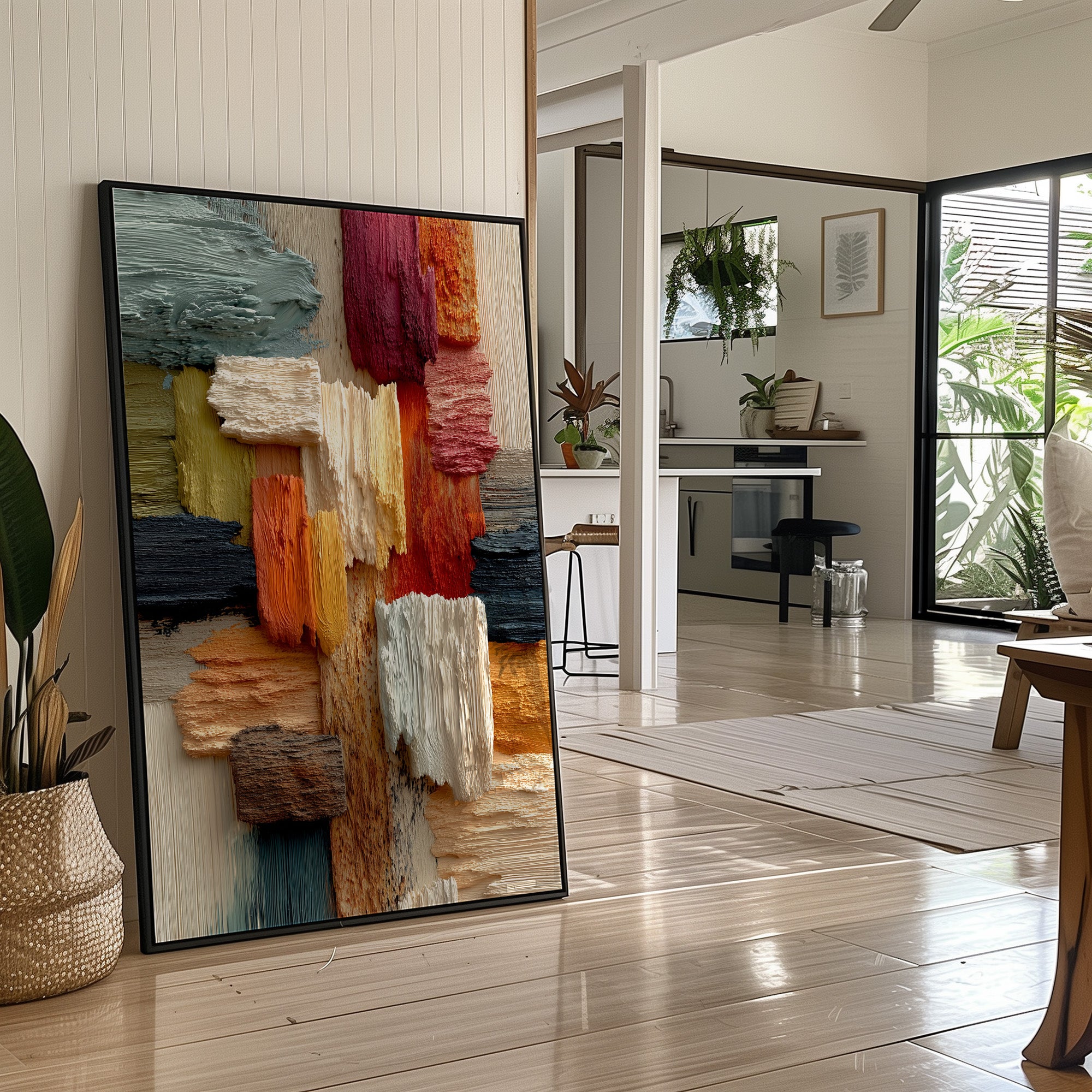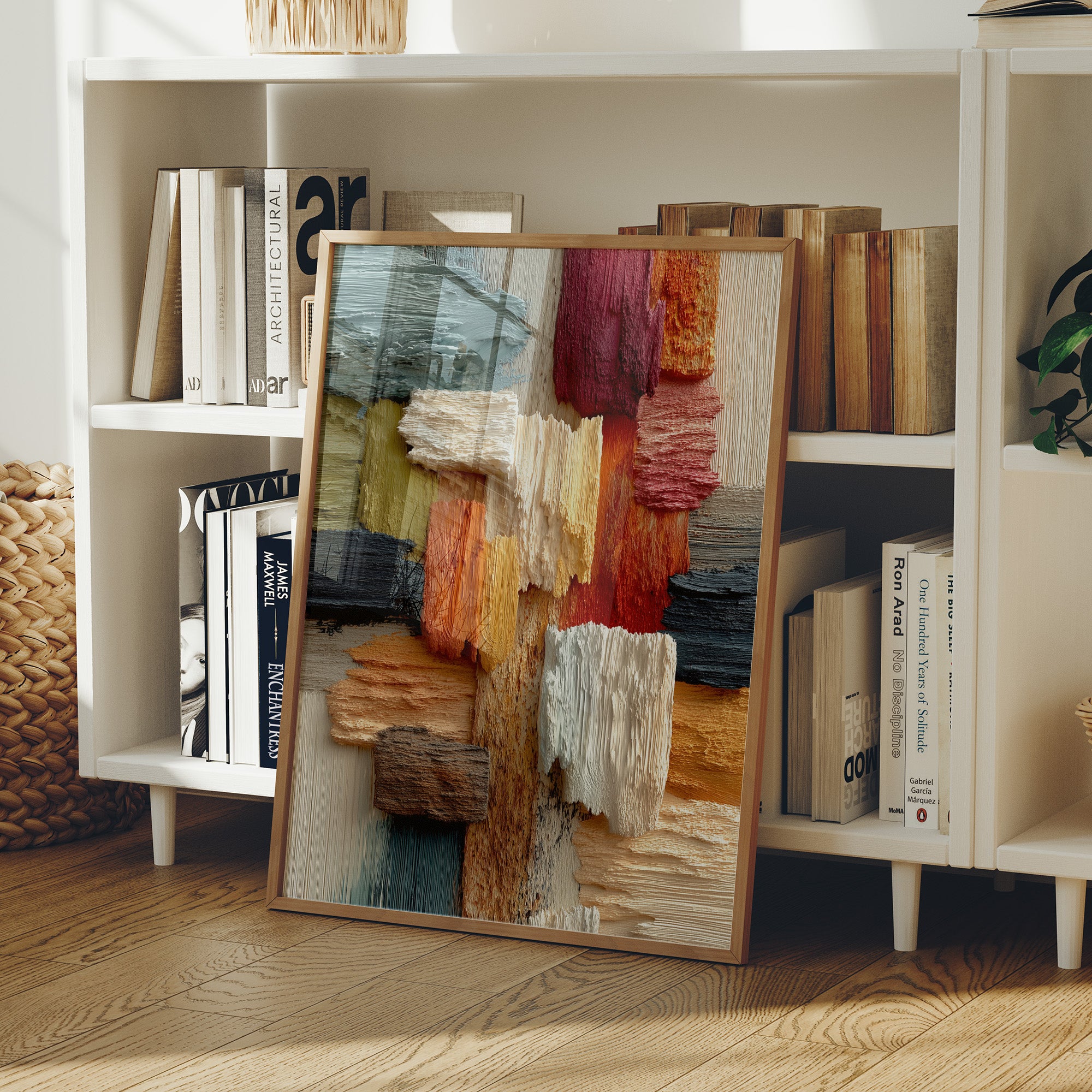 Textured brushstrokes catch the gentle morning sun, creating a symphony of earth tones and bold accents. Rich terracotta mingles with sage green and cream, while touches of burgundy and navy add depth to this contemporary composition. The painting's thick impasto technique creates a tactile landscape of color and movement, each stroke telling its own story of artistic expression. This piece would bring sophisticated warmth to a modern living room or home office, especially when paired with clean-lined furniture and natural materials.