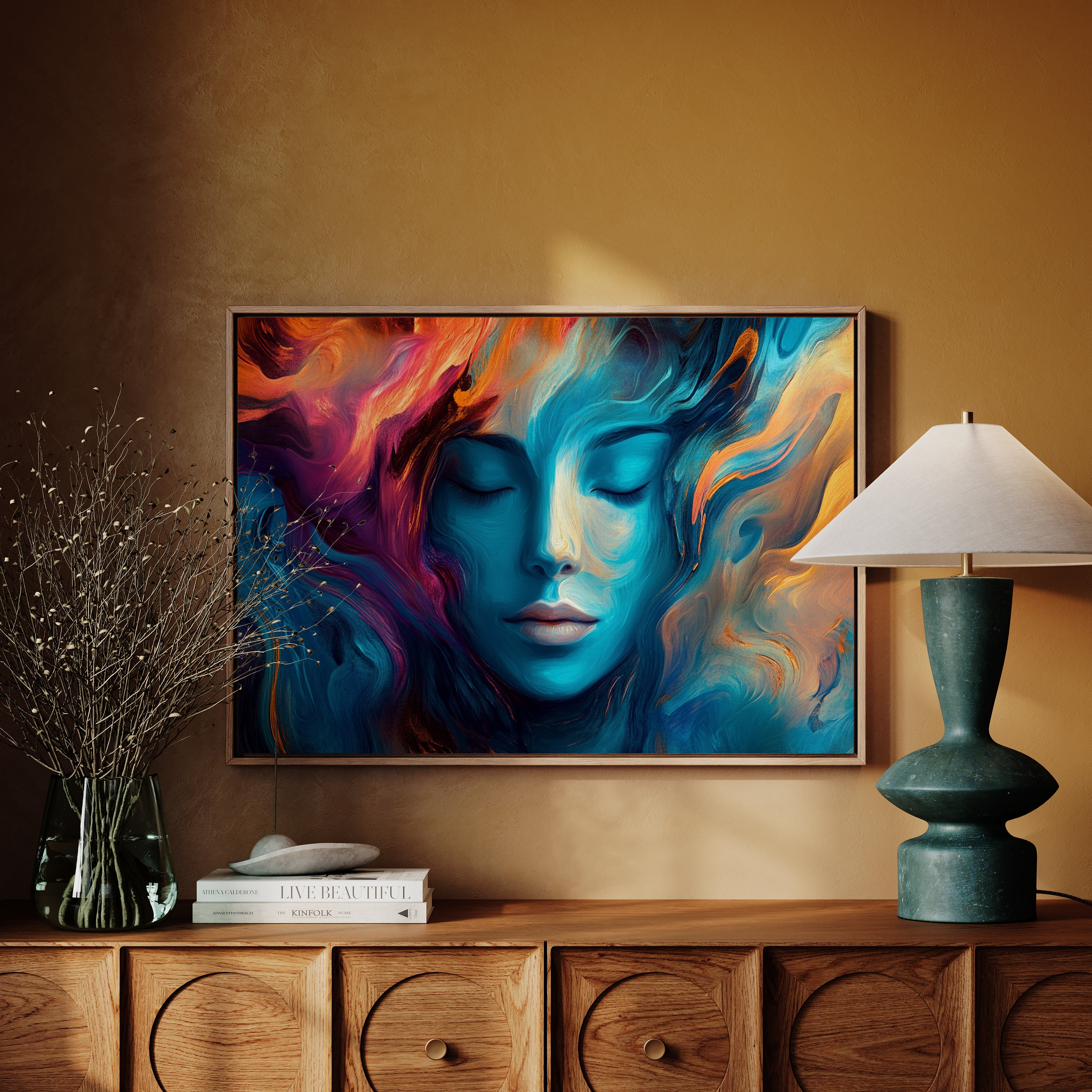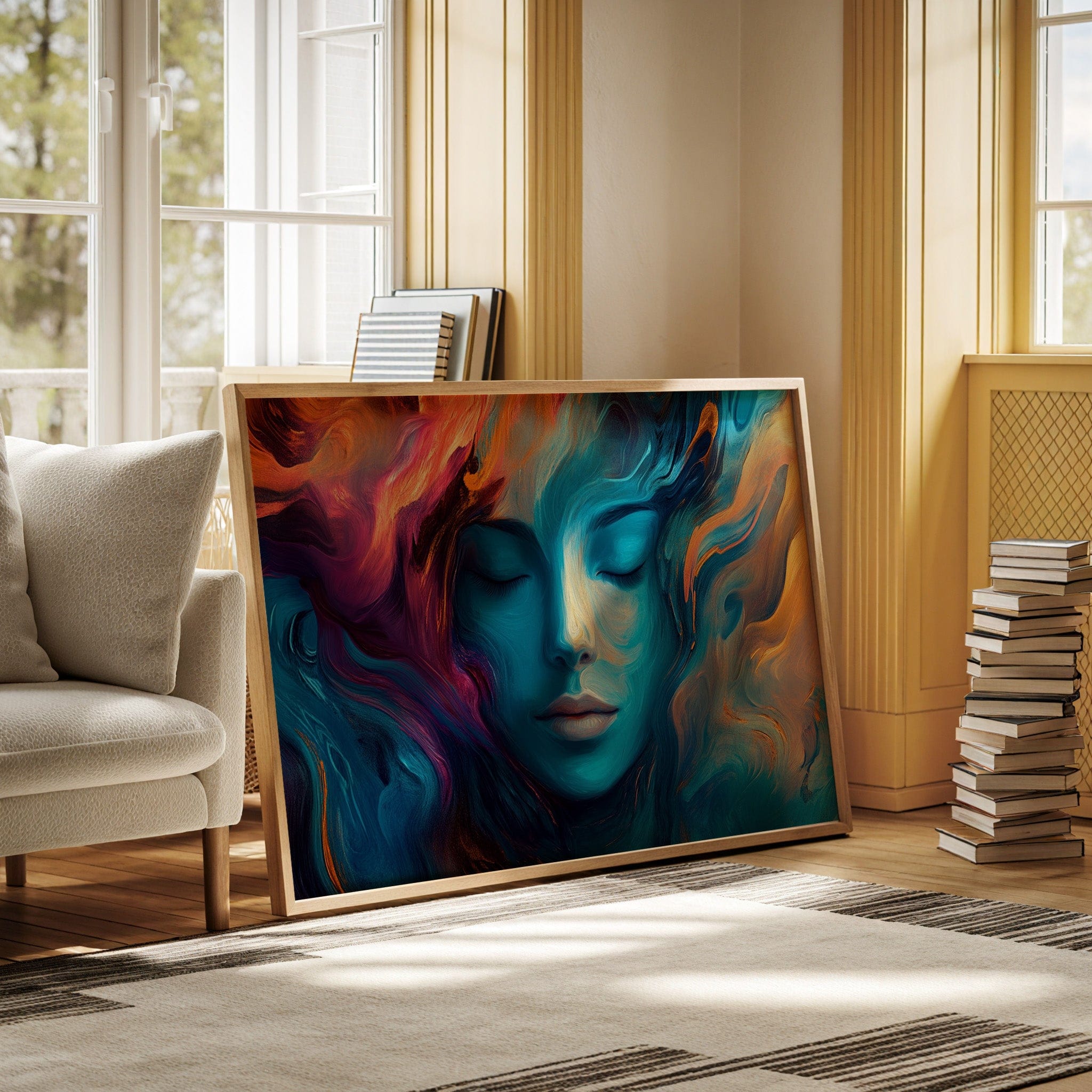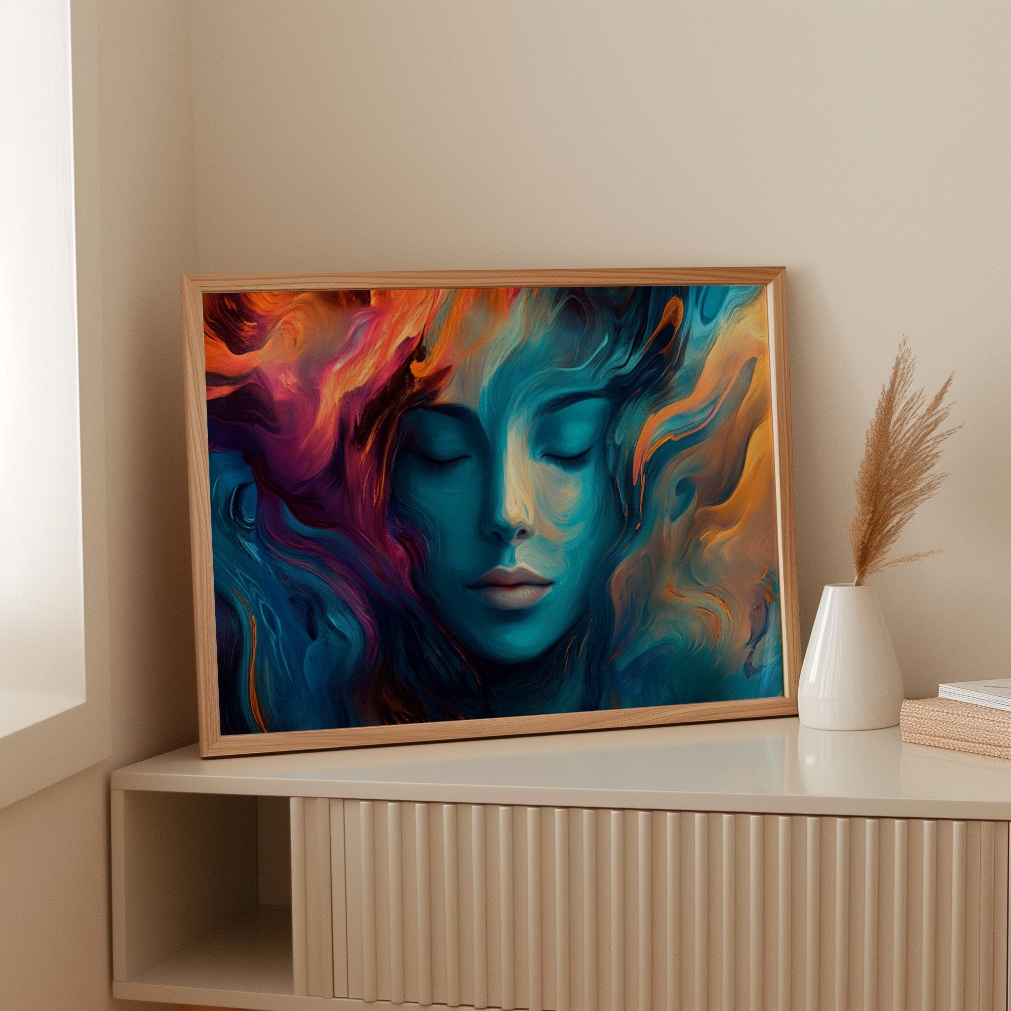 Swirling hues of turquoise and coral paint an ethereal portrait of tranquility, where reality melts into imagination. Deep blues cascade like ocean waves around serene features, while vibrant orange and purple flames dance through the composition like aurora borealis. The fluid brushstrokes create an otherworldly atmosphere where peace and passion coexist in perfect harmony. This piece would transform a meditation room or bedroom into a sanctuary of calm, while making an equally powerful statement in a modern living space.