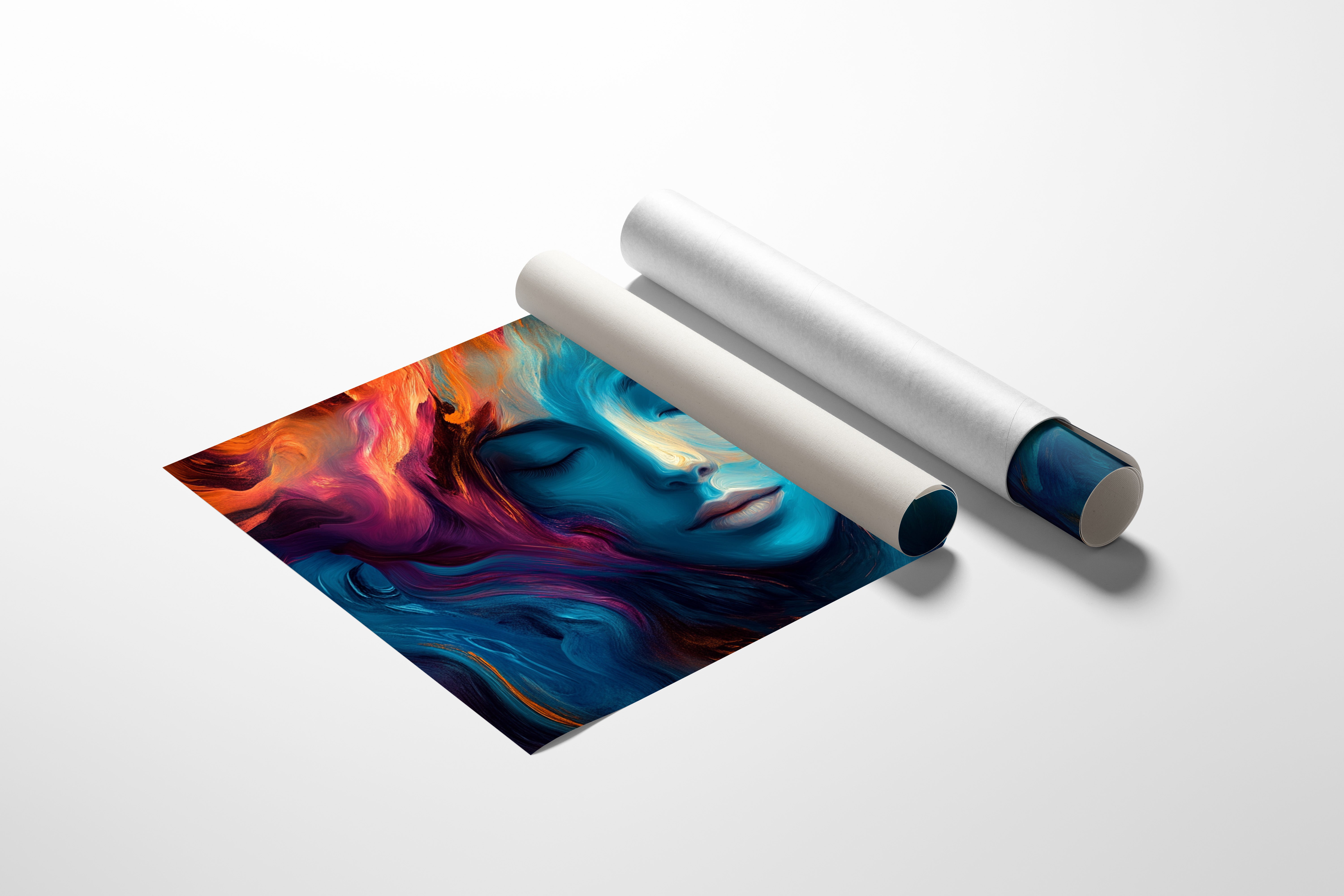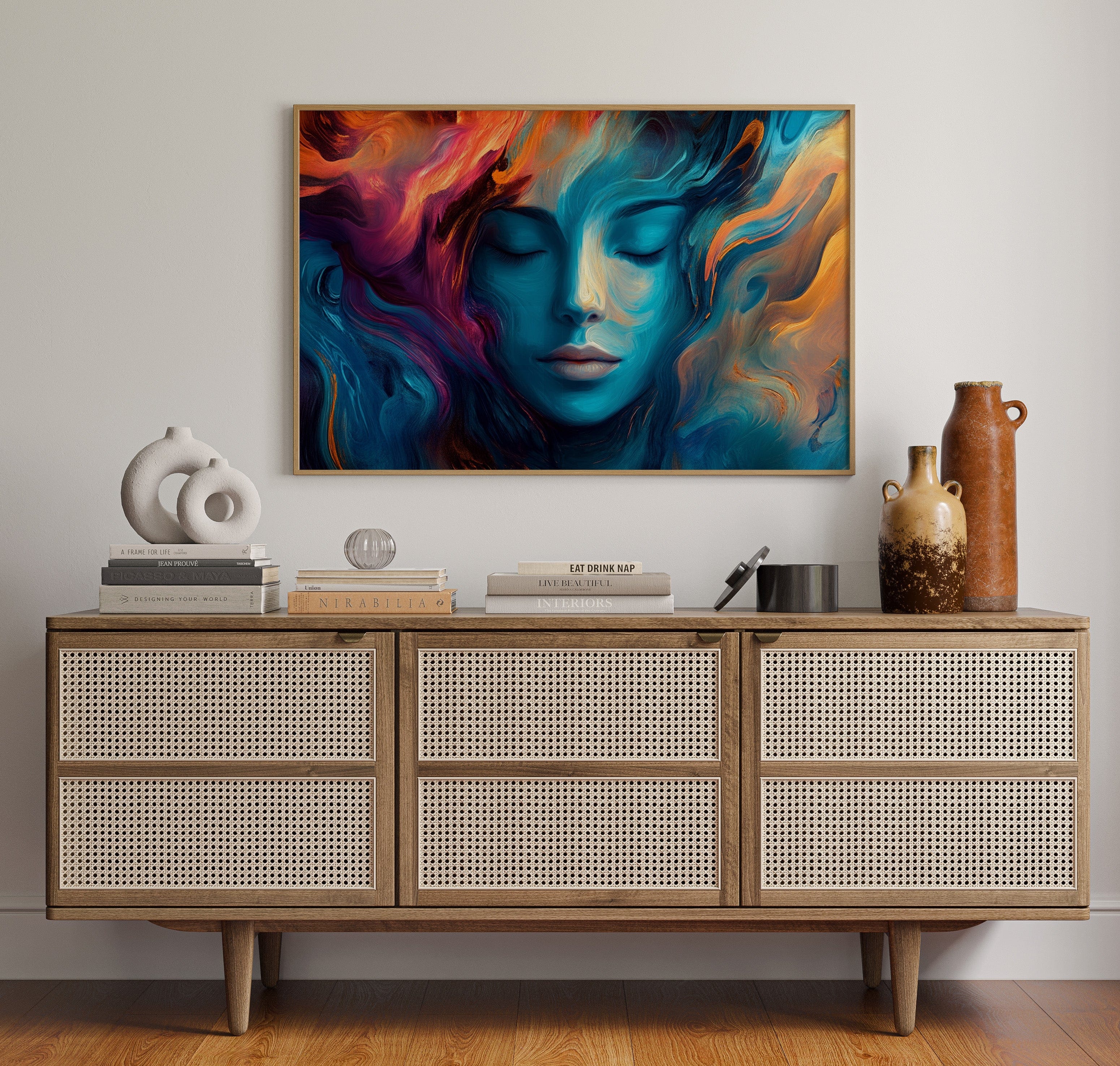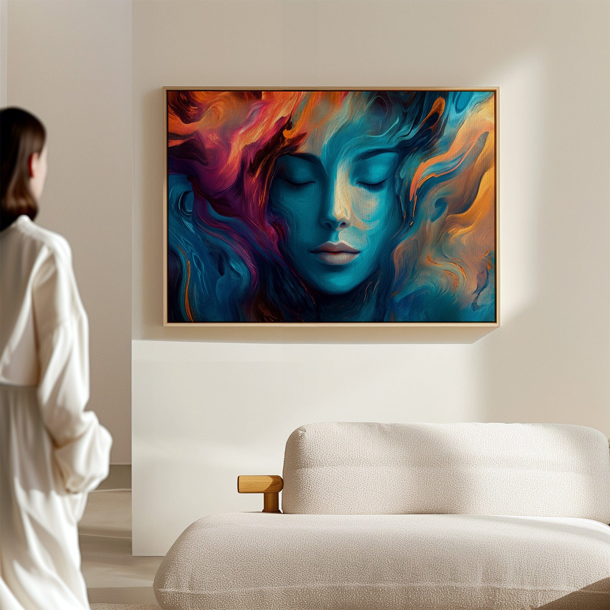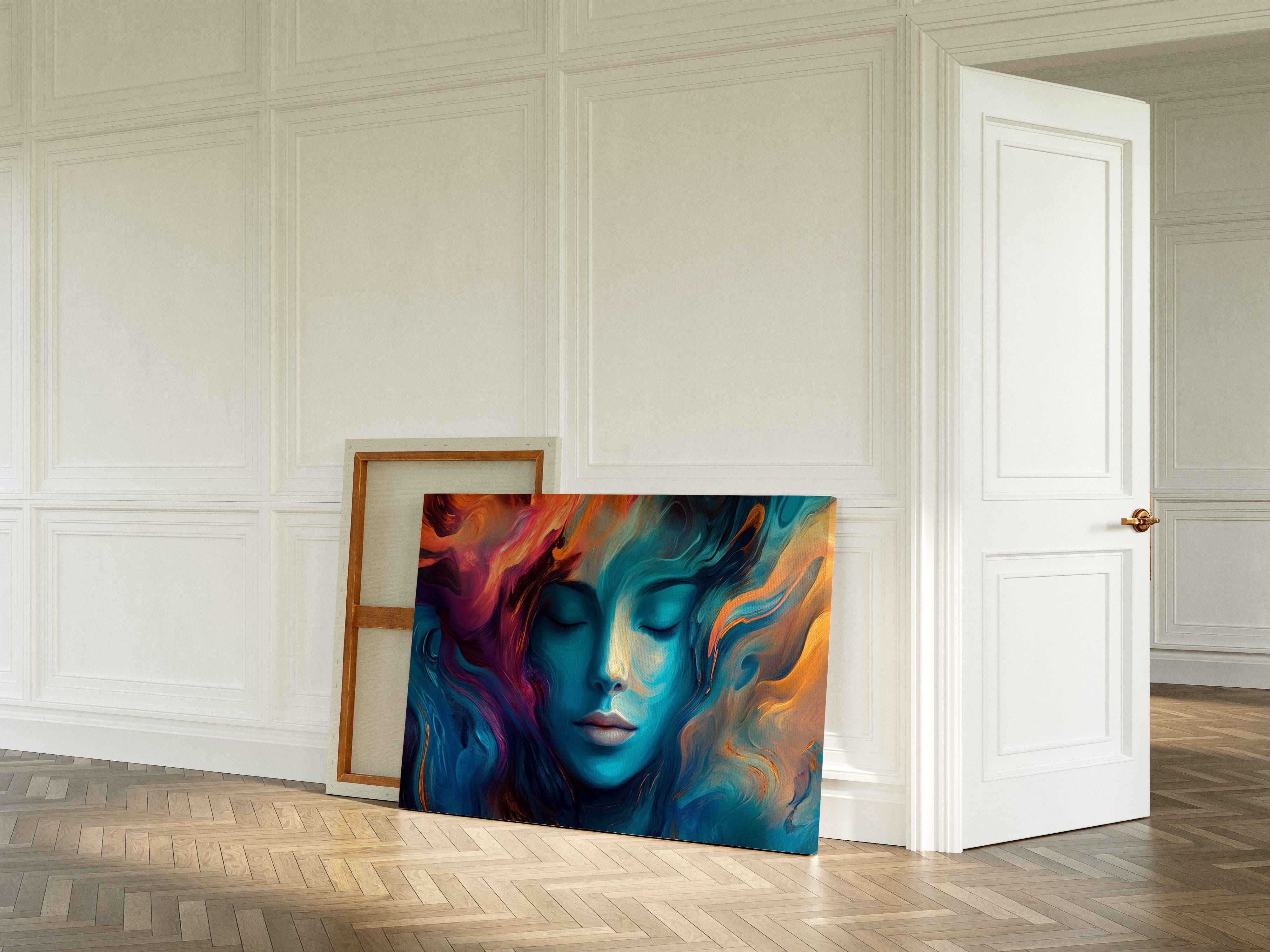 Swirling hues of turquoise and coral paint an ethereal portrait of tranquility, where reality melts into imagination. Deep blues cascade like ocean waves around serene features, while vibrant orange and purple flames dance through the composition like aurora borealis. The fluid brushstrokes create an otherworldly atmosphere where peace and passion coexist in perfect harmony. This piece would transform a meditation room or bedroom into a sanctuary of calm, while making an equally powerful statement in a modern living space.