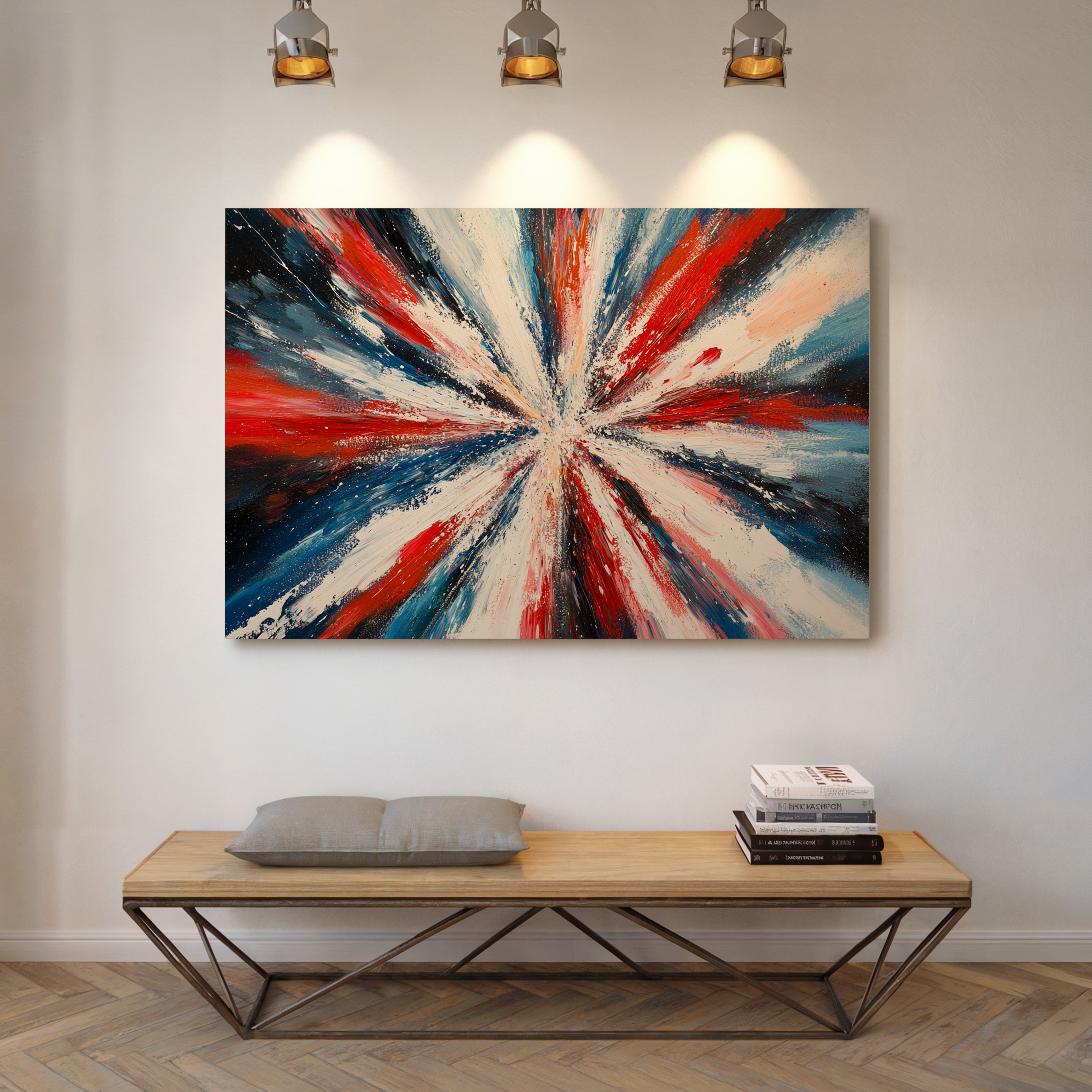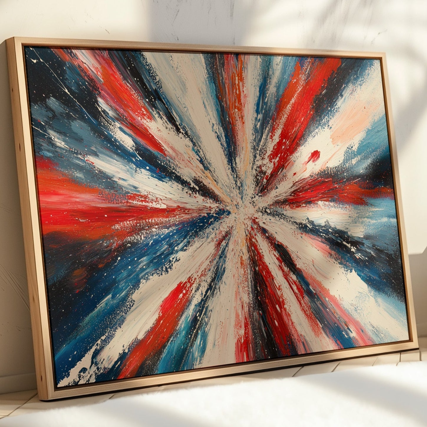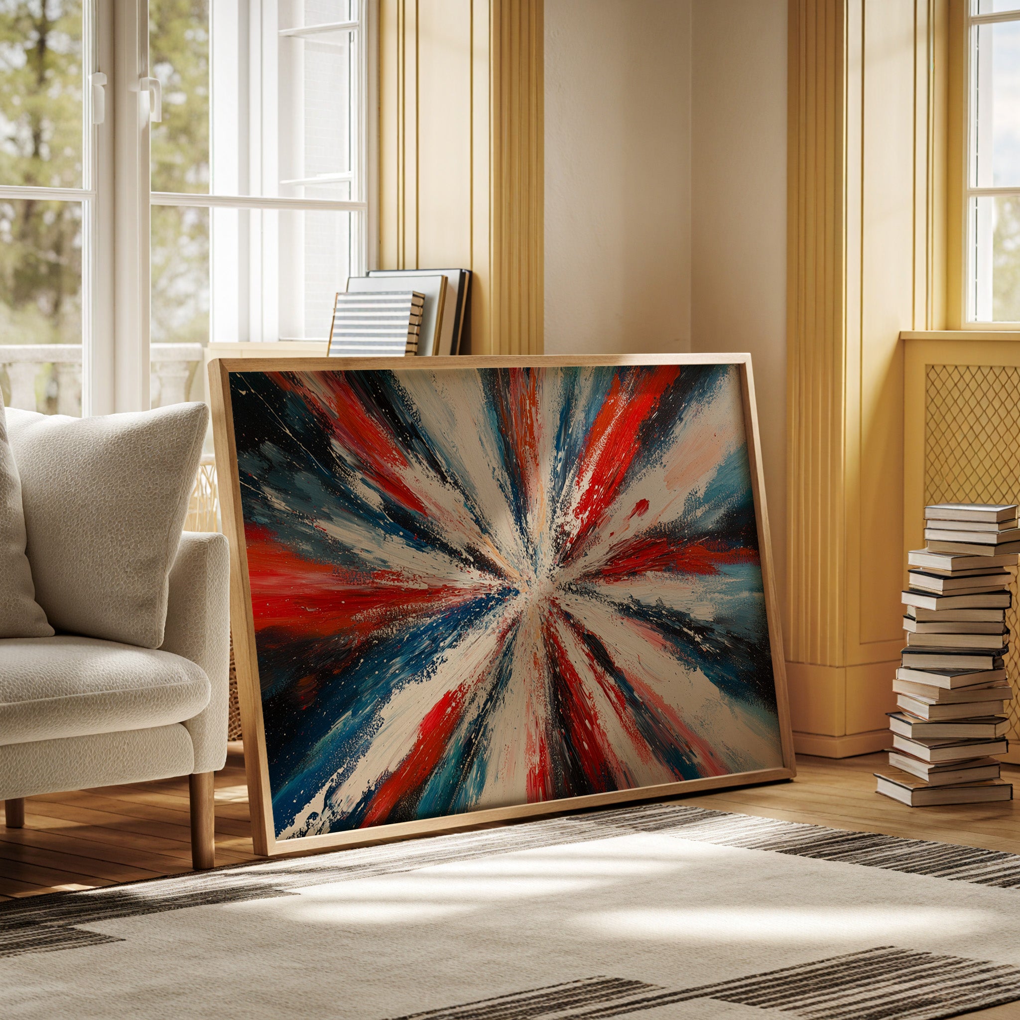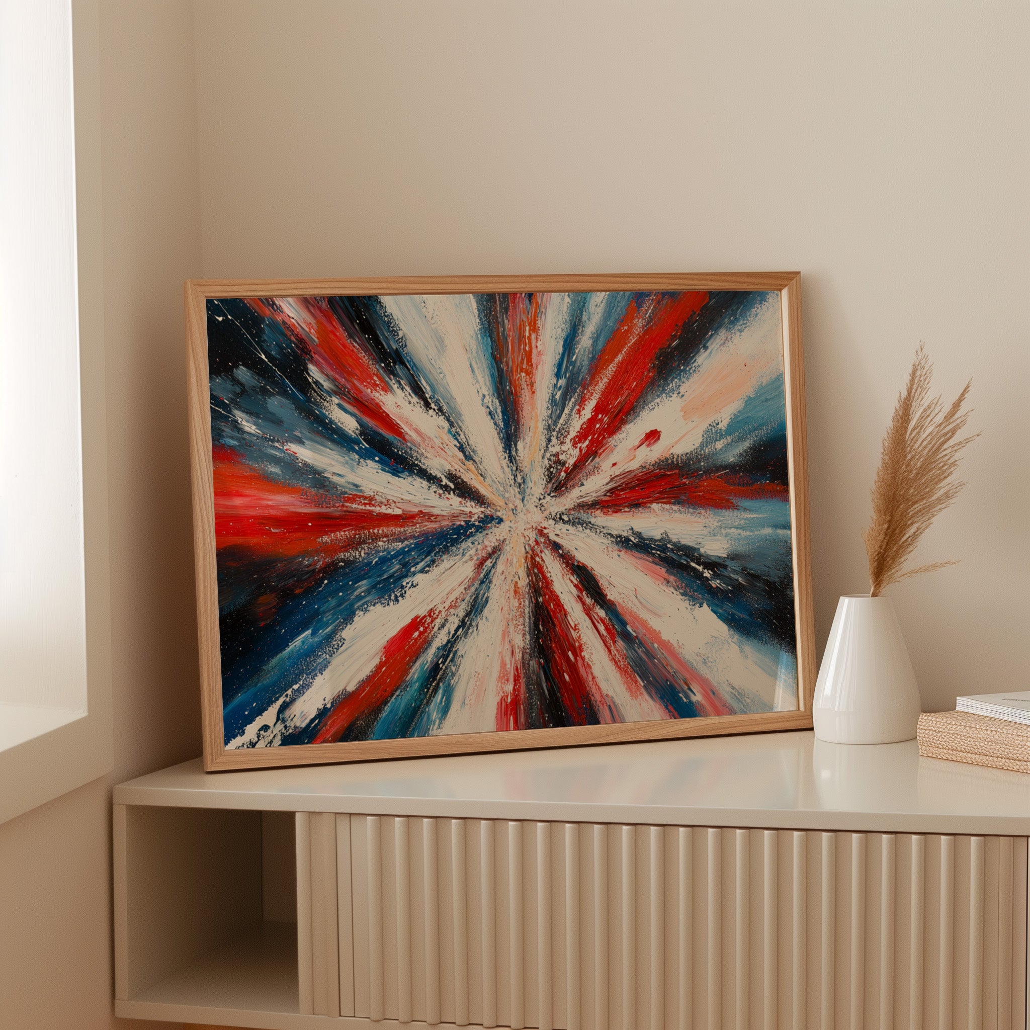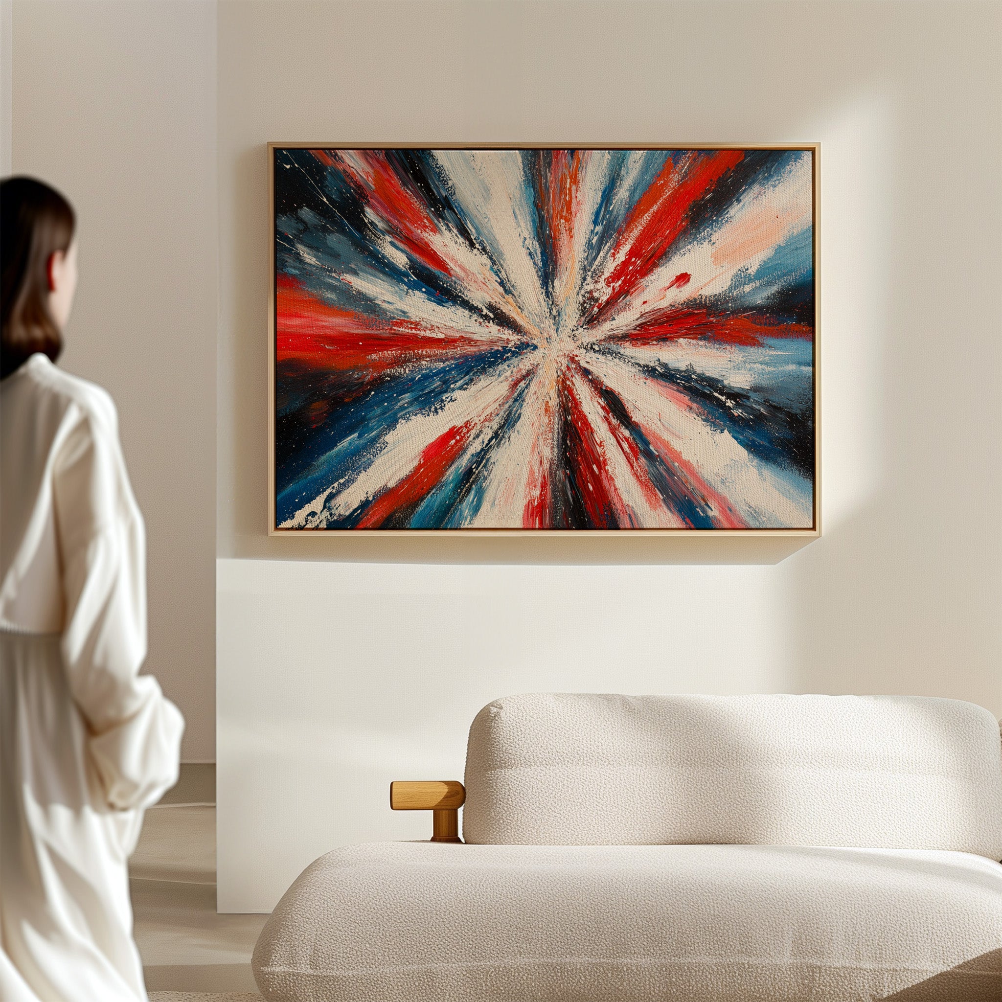A spectacular burst of energy radiates from a central point, like a cosmic explosion frozen in time. Bold strokes of crimson red and deep navy blue streak outward against pristine white, creating a dynamic sense of movement and raw power. The textured brushwork captures the essence of an unstoppable force, with paint splatters and bold gestures suggesting both chaos and perfect harmony. This piece would command attention in a modern living space or add dramatic energy to a minimalist office, where its explosive vitality can serve as a focal point for contemplation and conversation.